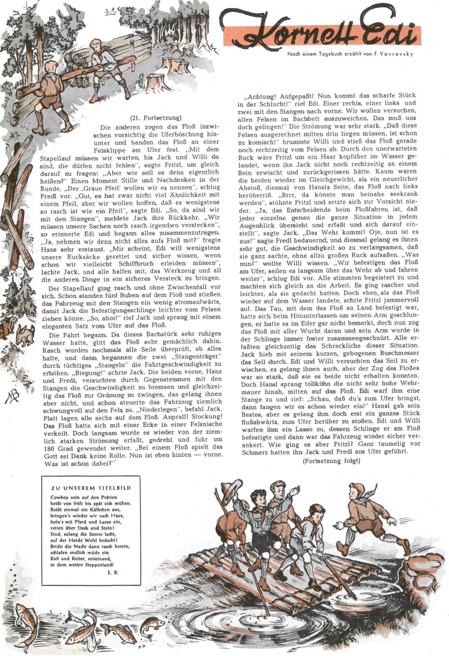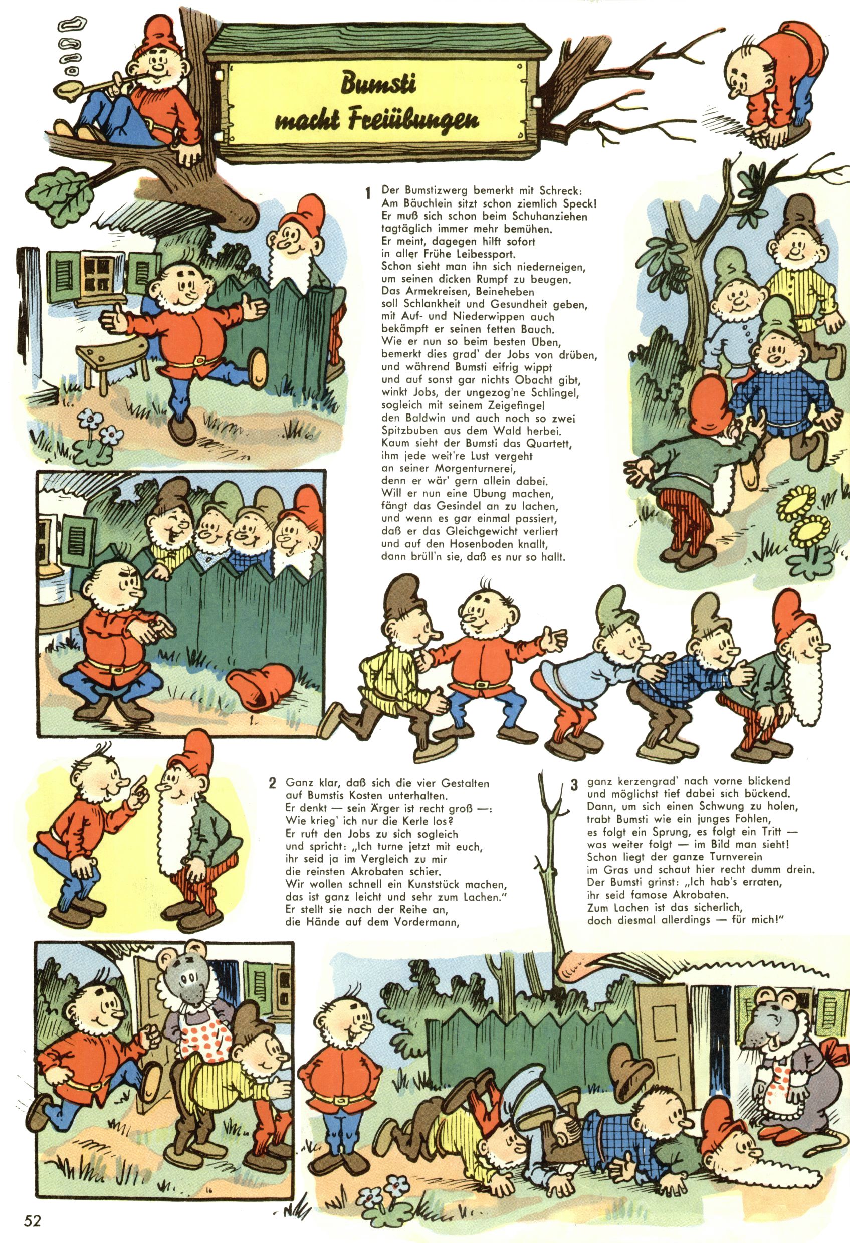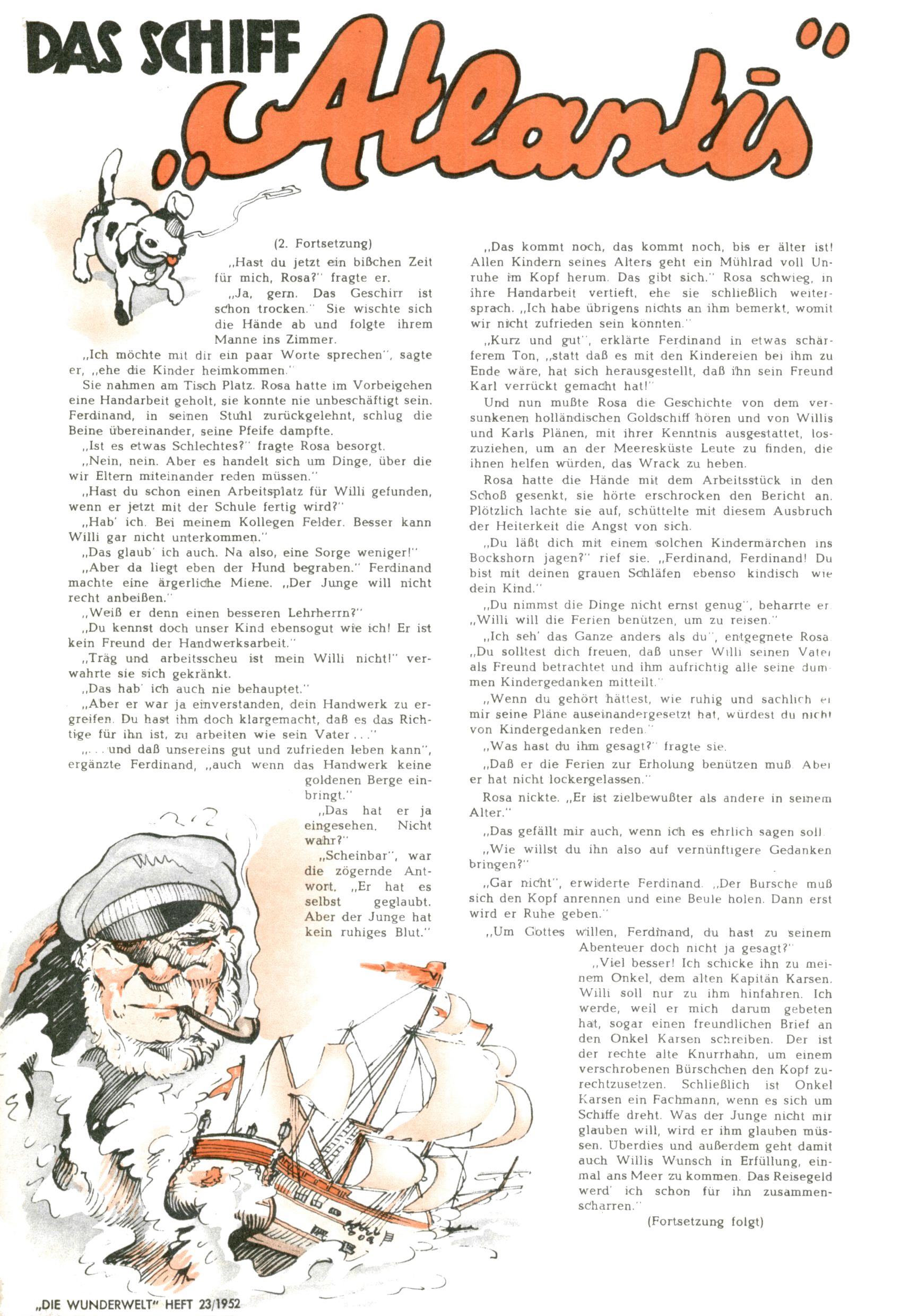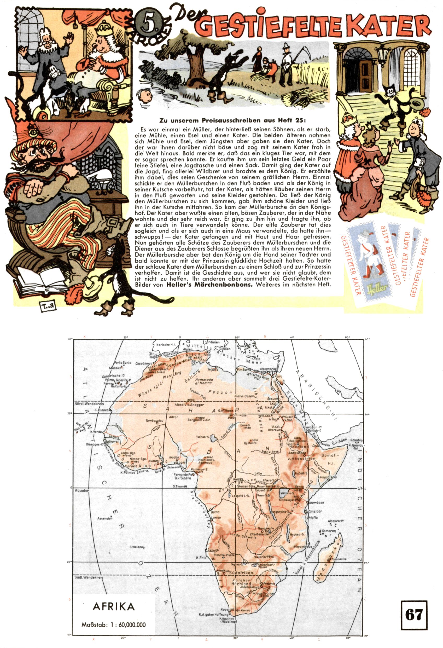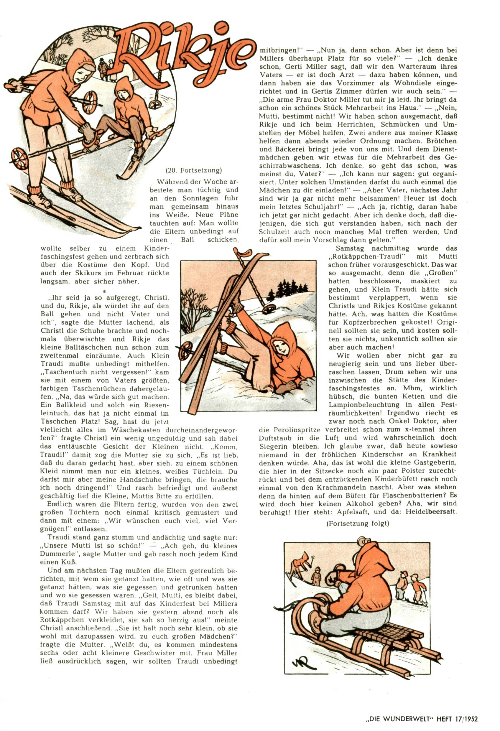 1952 – Der Erfolg hält an Wem Erfolg zuteil wird, der hat wenig Anlass, sein Konzept zu ändern. Und das war in gewisser Weise auch gut so bei allen inhaltlichen Schwächen der Beiträge in der Wunderwelt 1952. Der Erfolg der Zeitung wurde in erster Linie von der grafischen Umsetzung getragen; die lieblichen Bilder einer heilen Märchenwelt ließen über die oft flauen, pädagogisch teilweise sogar fragwürdigen Texte hinwegsehen. Elfriede Vavrovsky schrieb fast alle Texte und Rosl Warzilek zeichnete immer mehr Titelbilder und Mittelmärchen. ABC Peter Paul Prinz hatte Ende 1951 Meister Hokus als komischen Widerpart vom Zauberlehrling Willibald entdeckt und perfektionierte diesen Dualismus nun immer mehr. Meister Hokus avancierte zur regelmäßigen Lachnummer. Dafür überließ ABC vorübergehend Teja Aicher die Gestaltung der technischen Seite, dessen Zwerg Bumsti ebenfalls bereits untrennbar mit der Wunderwelt verbunden schien und längst zum Markenzeichen aufgestiegen war. Seine ko(s)mischen Superhelden Piff und Paff hatten jedoch allmählich genug von den Menschen und kehrten der Erde den Rücken zu. Für den Einsatz im Schulunterricht wurden weiterhin von Elfriede Vavrovsky erstellte politische und geografische Daten und Karten gedruckt, was gerne angenommen wurde, denn teure Atlanten gab es 1952 noch wenige, als viele politische Grenzen gar nicht endgültig geklärt schienen. |