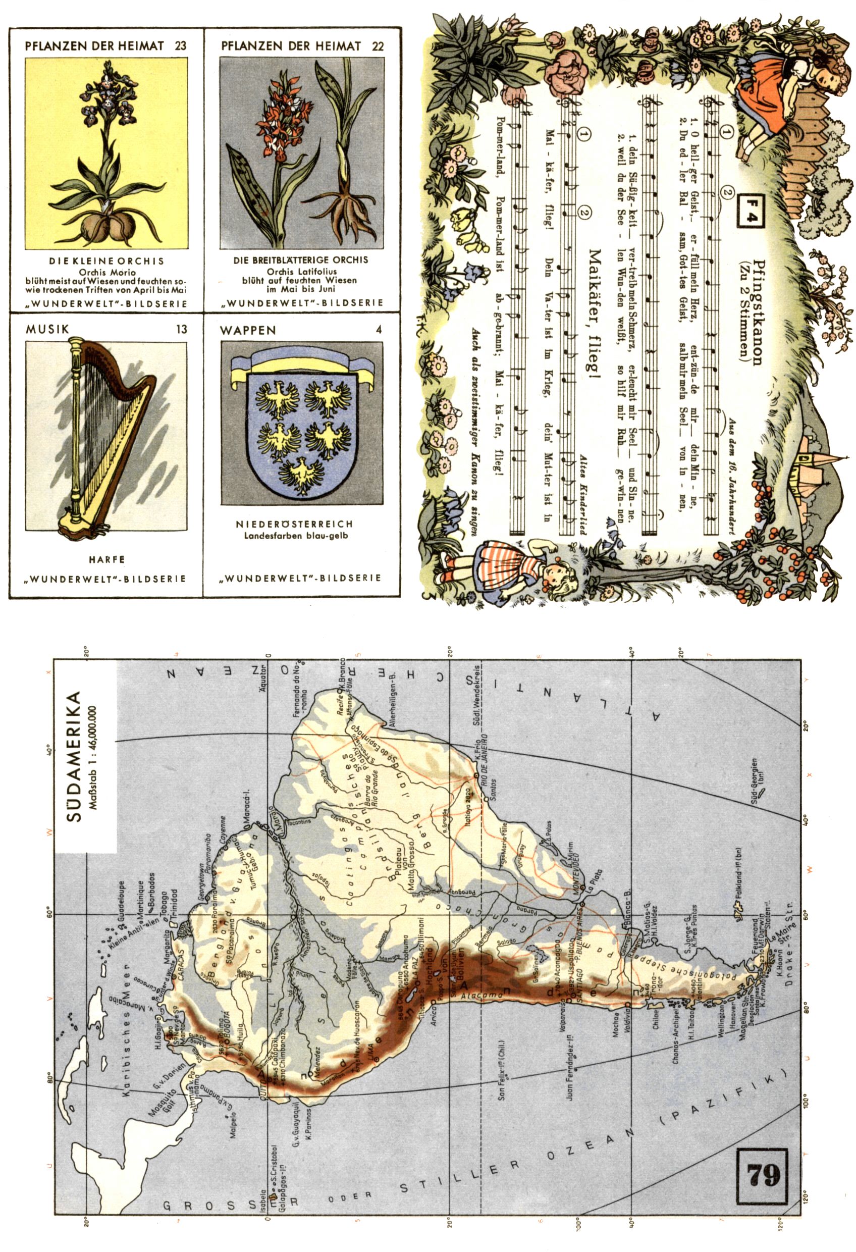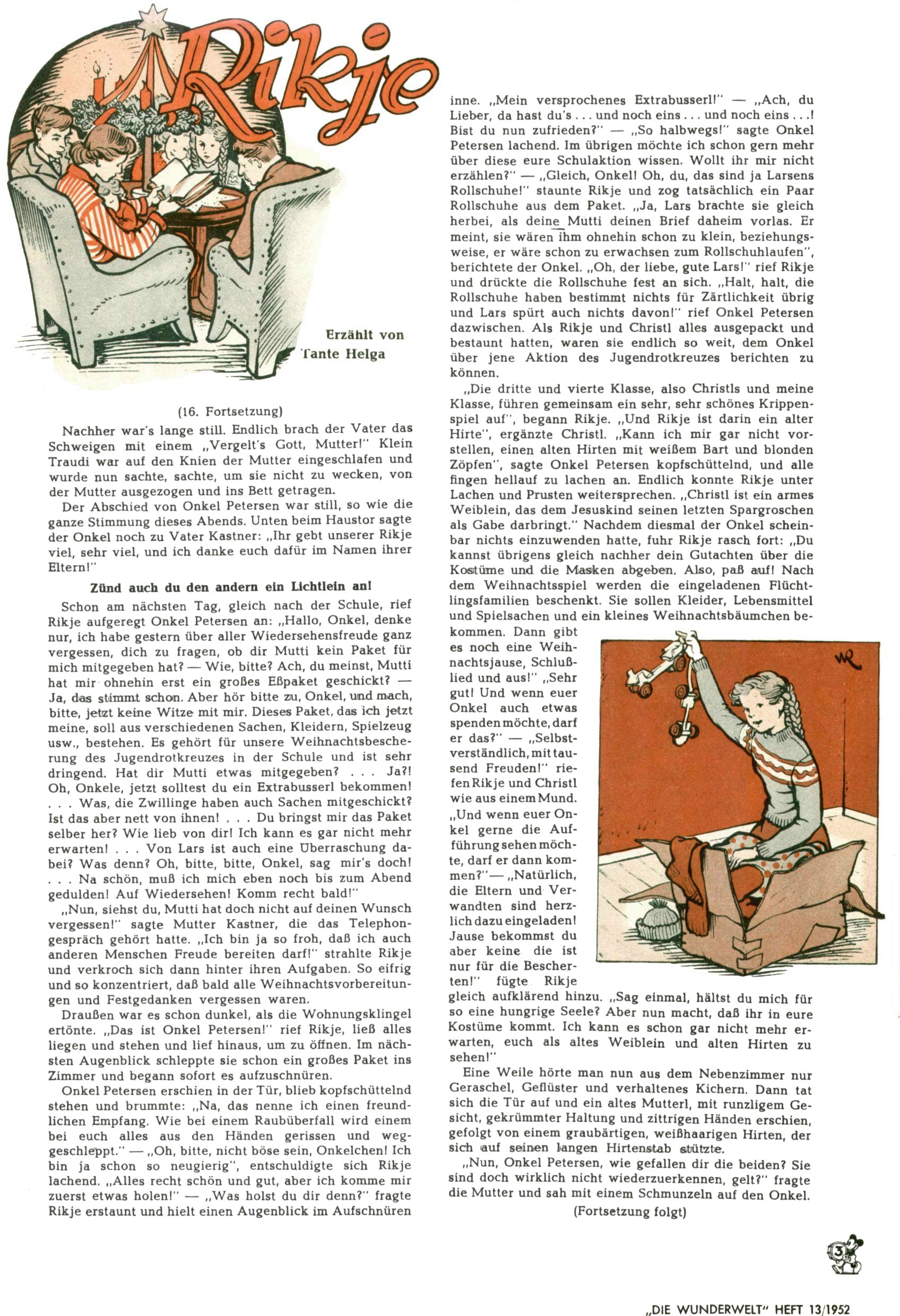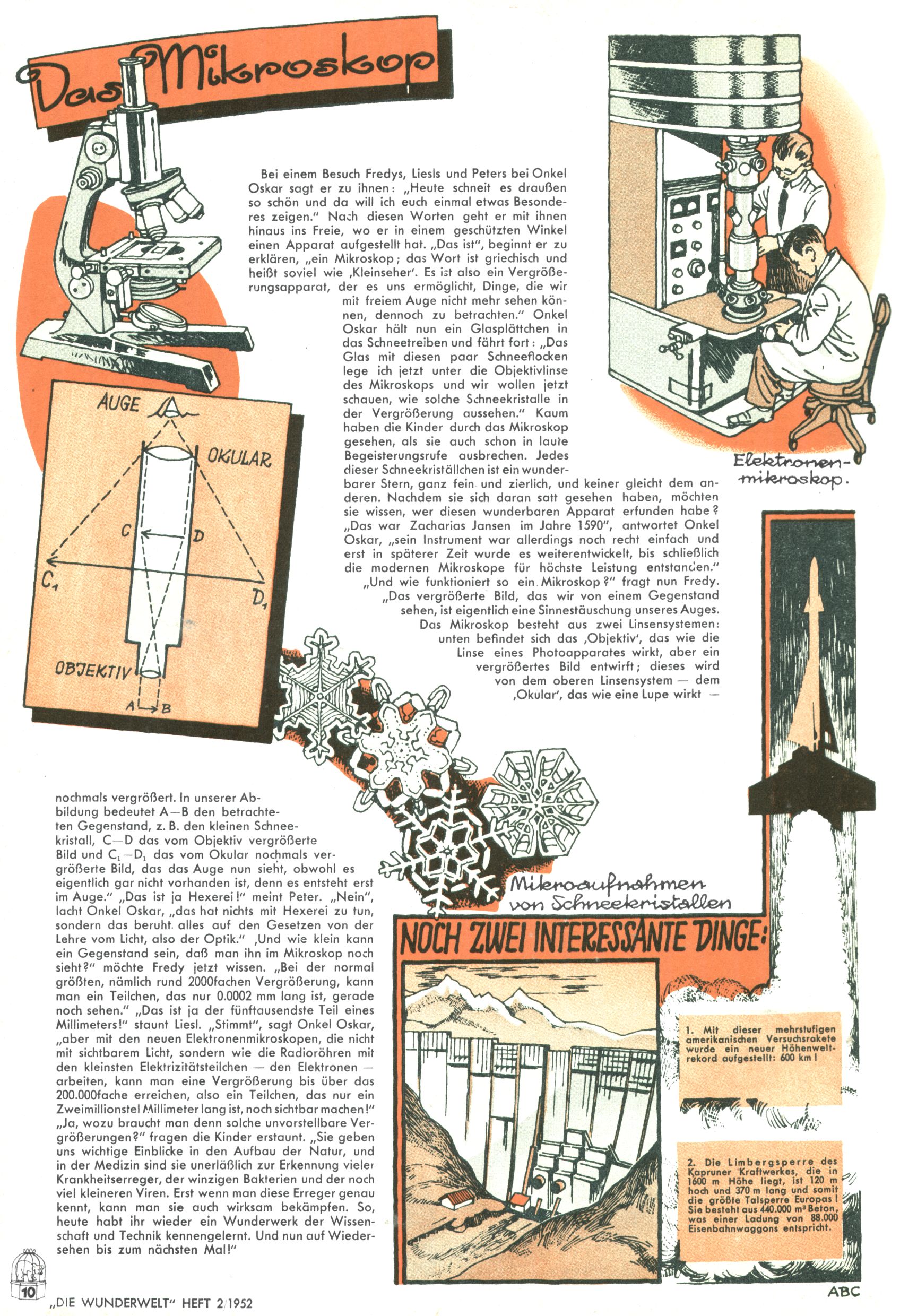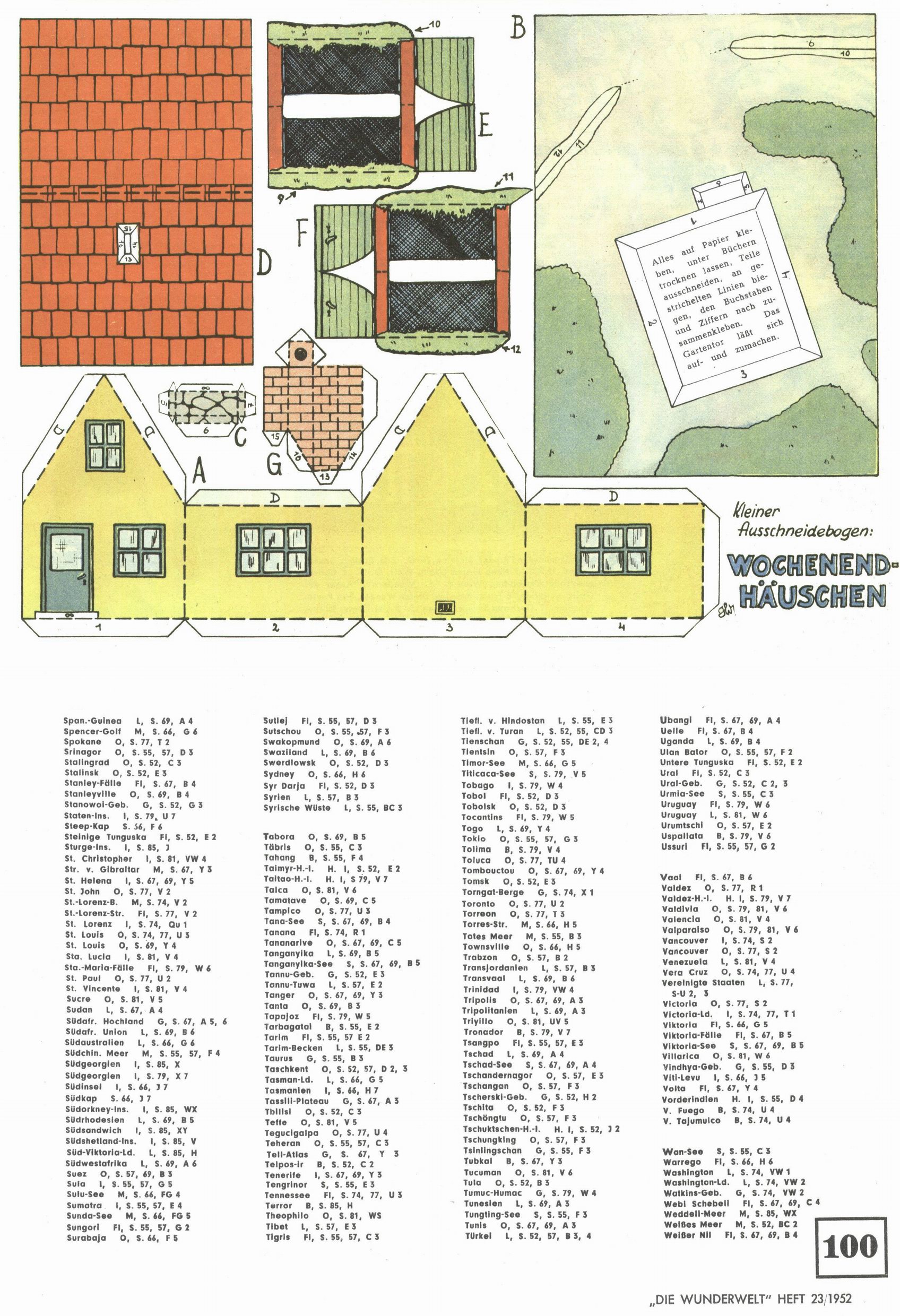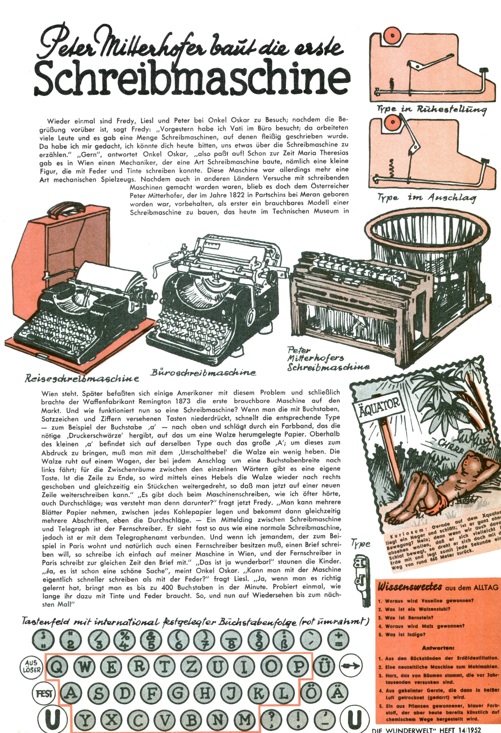1952 – Der Erfolg hält an Wem Erfolg zuteil wird, der hat wenig Anlass, sein Konzept zu ändern. Und das war in gewisser Weise auch gut so bei allen inhaltlichen Schwächen der Beiträge in der Wunderwelt 1952. Der Erfolg der Zeitung wurde in erster Linie von der grafischen Umsetzung getragen; die lieblichen Bilder einer heilen Märchenwelt ließen über die oft flauen, pädagogisch teilweise sogar fragwürdigen Texte hinwegsehen. Elfriede Vavrovsky schrieb fast alle Texte und Rosl Warzilek zeichnete immer mehr Titelbilder und Mittelmärchen. ABC Peter Paul Prinz hatte Ende 1951 Meister Hokus als komischen Widerpart vom Zauberlehrling Willibald entdeckt und perfektionierte diesen Dualismus nun immer mehr. Meister Hokus avancierte zur regelmäßigen Lachnummer. Dafür überließ ABC vorübergehend Teja Aicher die Gestaltung der technischen Seite, dessen Zwerg Bumsti ebenfalls bereits untrennbar mit der Wunderwelt verbunden schien und längst zum Markenzeichen aufgestiegen war. Seine ko(s)mischen Superhelden Piff und Paff hatten jedoch allmählich genug von den Menschen und kehrten der Erde den Rücken zu. Für den Einsatz im Schulunterricht wurden weiterhin von Elfriede Vavrovsky erstellte politische und geografische Daten und Karten gedruckt, was gerne angenommen wurde, denn teure Atlanten gab es 1952 noch wenige, als viele politische Grenzen gar nicht endgültig geklärt schienen. |