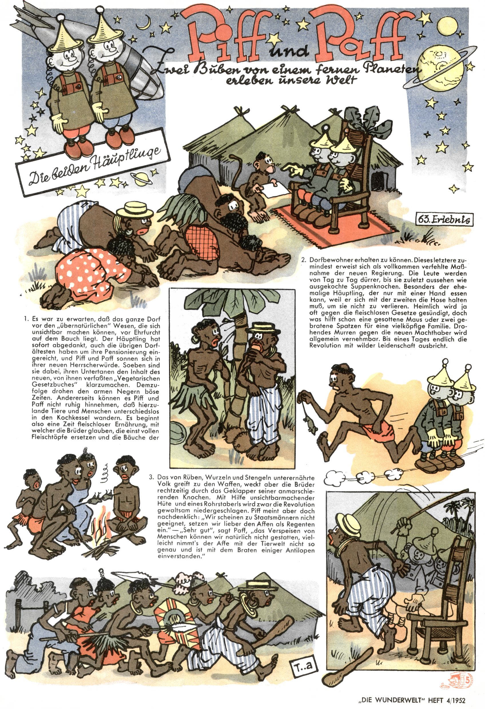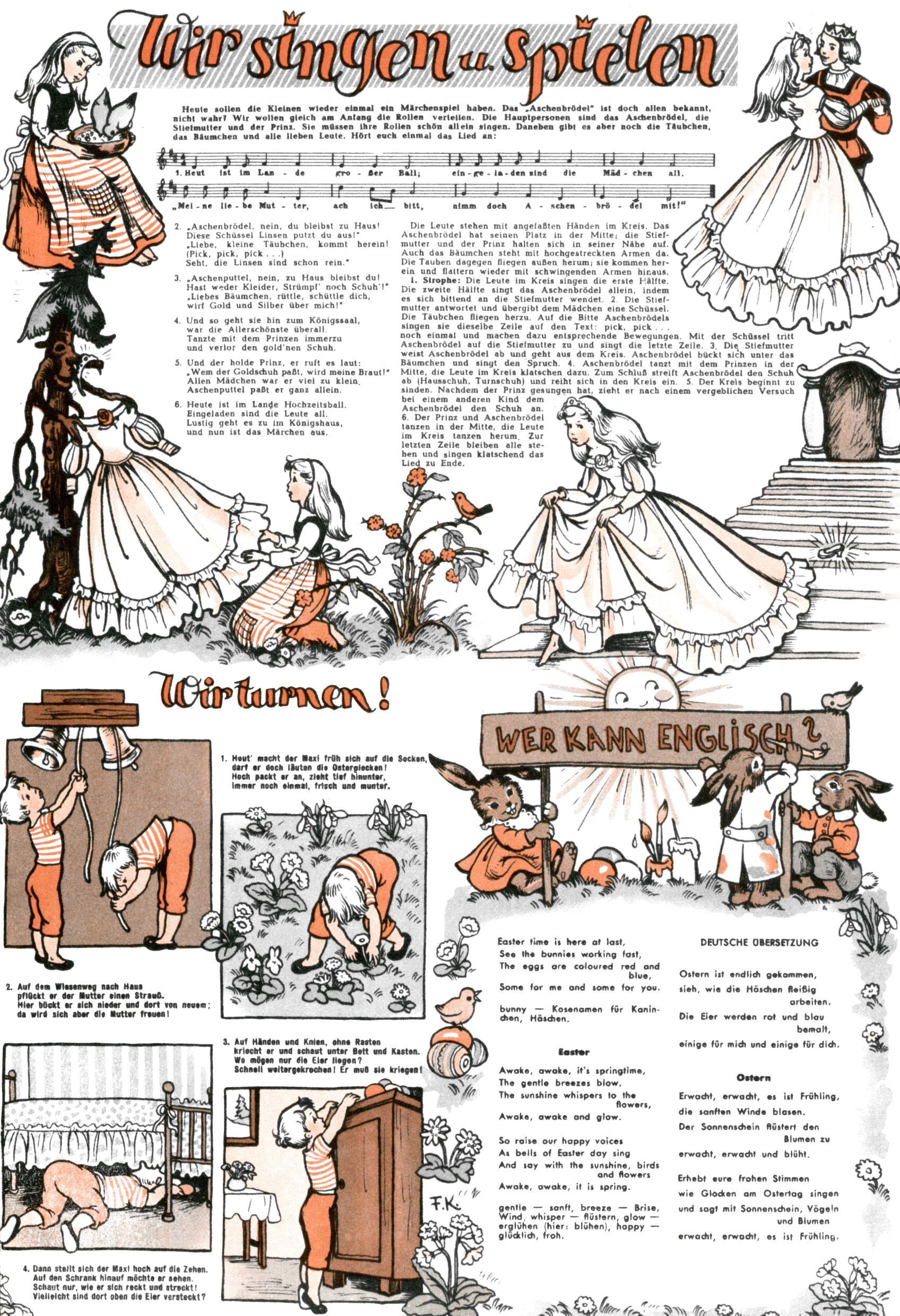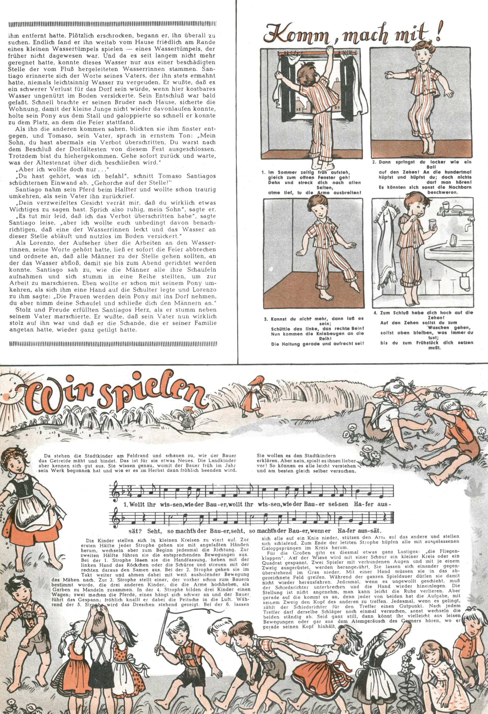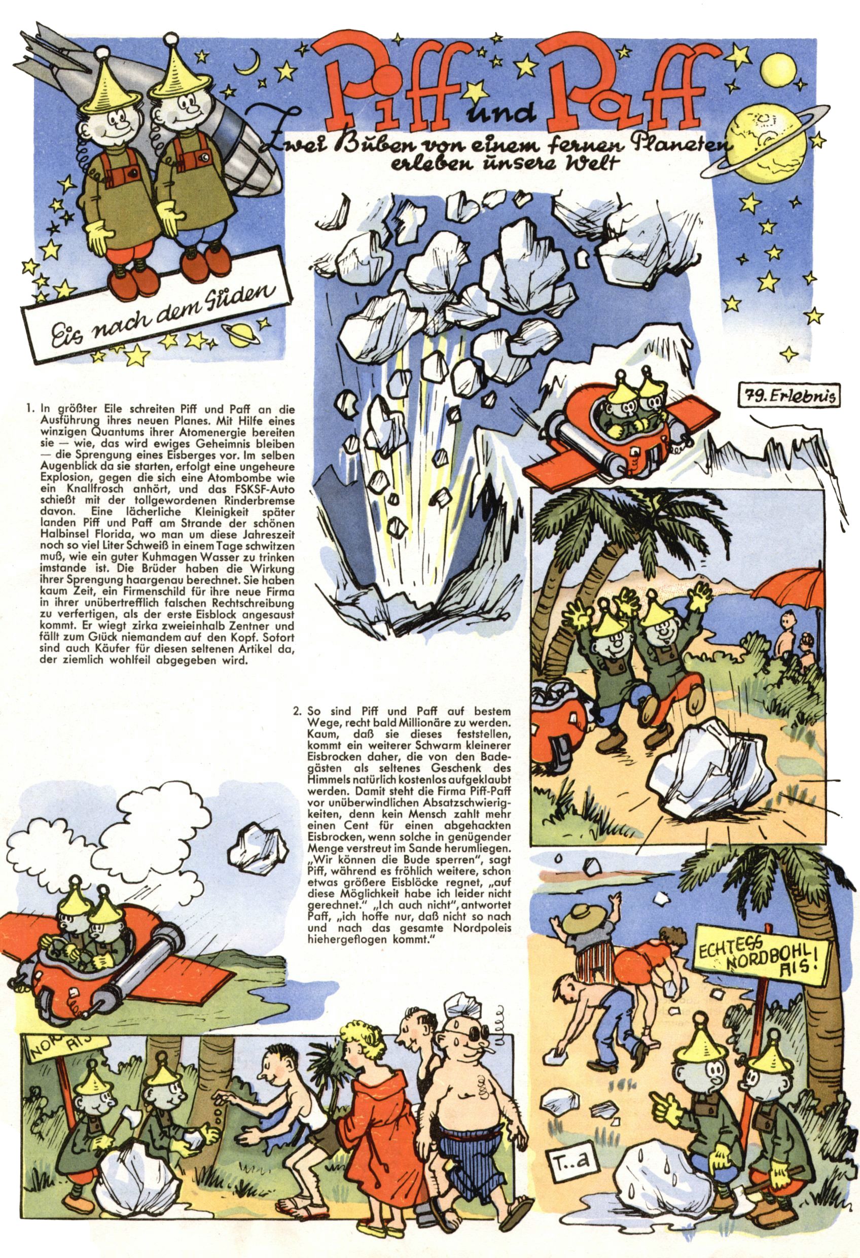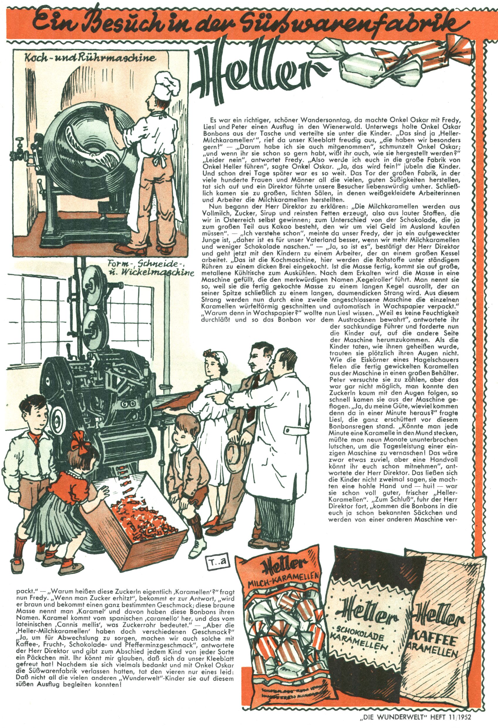 1952 – Der Erfolg hält an Wem Erfolg zuteil wird, der hat wenig Anlass, sein Konzept zu ändern. Und das war in gewisser Weise auch gut so bei allen inhaltlichen Schwächen der Beiträge in der Wunderwelt 1952. Der Erfolg der Zeitung wurde in erster Linie von der grafischen Umsetzung getragen; die lieblichen Bilder einer heilen Märchenwelt ließen über die oft flauen, pädagogisch teilweise sogar fragwürdigen Texte hinwegsehen. Elfriede Vavrovsky schrieb fast alle Texte und Rosl Warzilek zeichnete immer mehr Titelbilder und Mittelmärchen. ABC Peter Paul Prinz hatte Ende 1951 Meister Hokus als komischen Widerpart vom Zauberlehrling Willibald entdeckt und perfektionierte diesen Dualismus nun immer mehr. Meister Hokus avancierte zur regelmäßigen Lachnummer. Dafür überließ ABC vorübergehend Teja Aicher die Gestaltung der technischen Seite, dessen Zwerg Bumsti ebenfalls bereits untrennbar mit der Wunderwelt verbunden schien und längst zum Markenzeichen aufgestiegen war. Seine ko(s)mischen Superhelden Piff und Paff hatten jedoch allmählich genug von den Menschen und kehrten der Erde den Rücken zu. Für den Einsatz im Schulunterricht wurden weiterhin von Elfriede Vavrovsky erstellte politische und geografische Daten und Karten gedruckt, was gerne angenommen wurde, denn teure Atlanten gab es 1952 noch wenige, als viele politische Grenzen gar nicht endgültig geklärt schienen. |