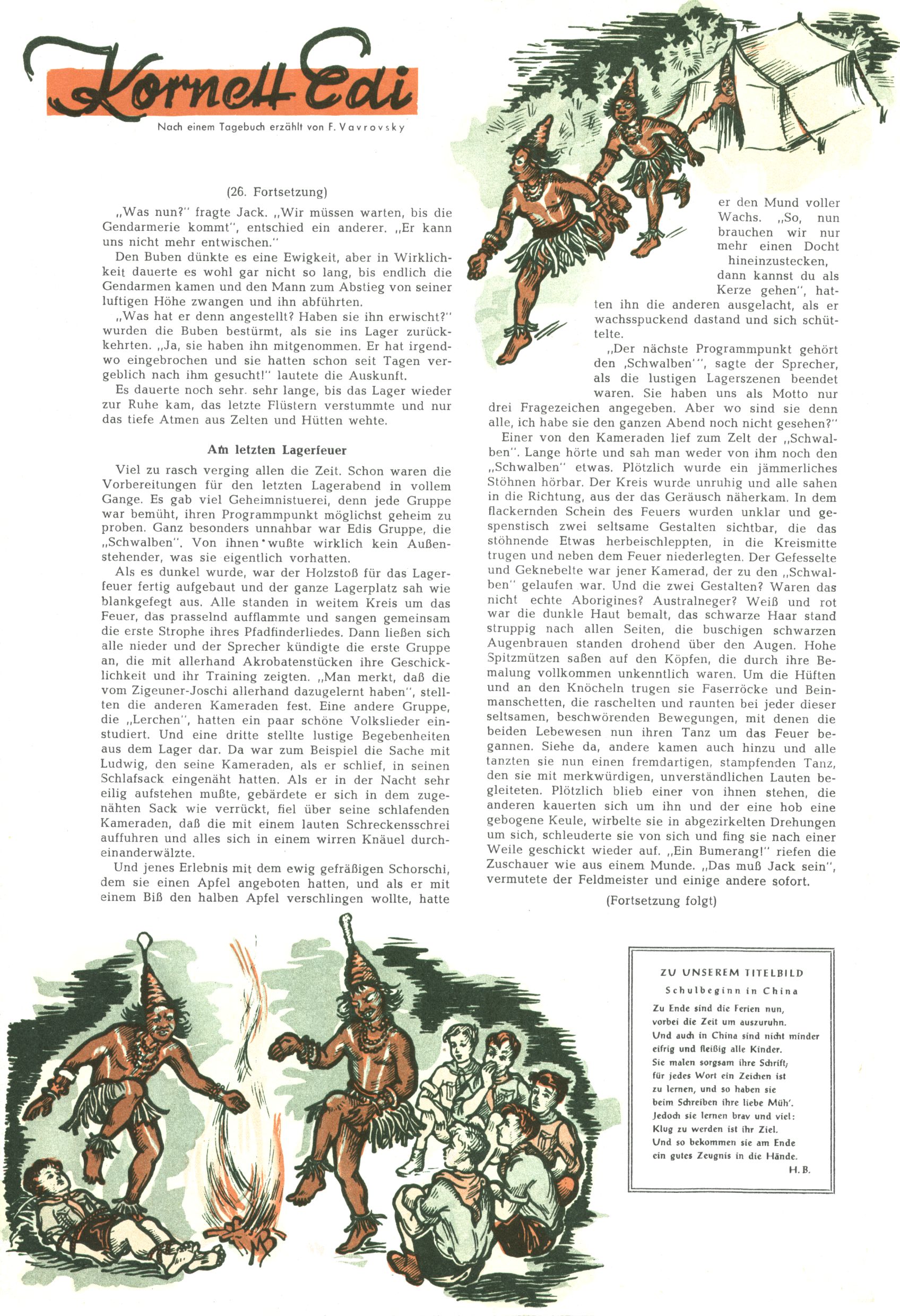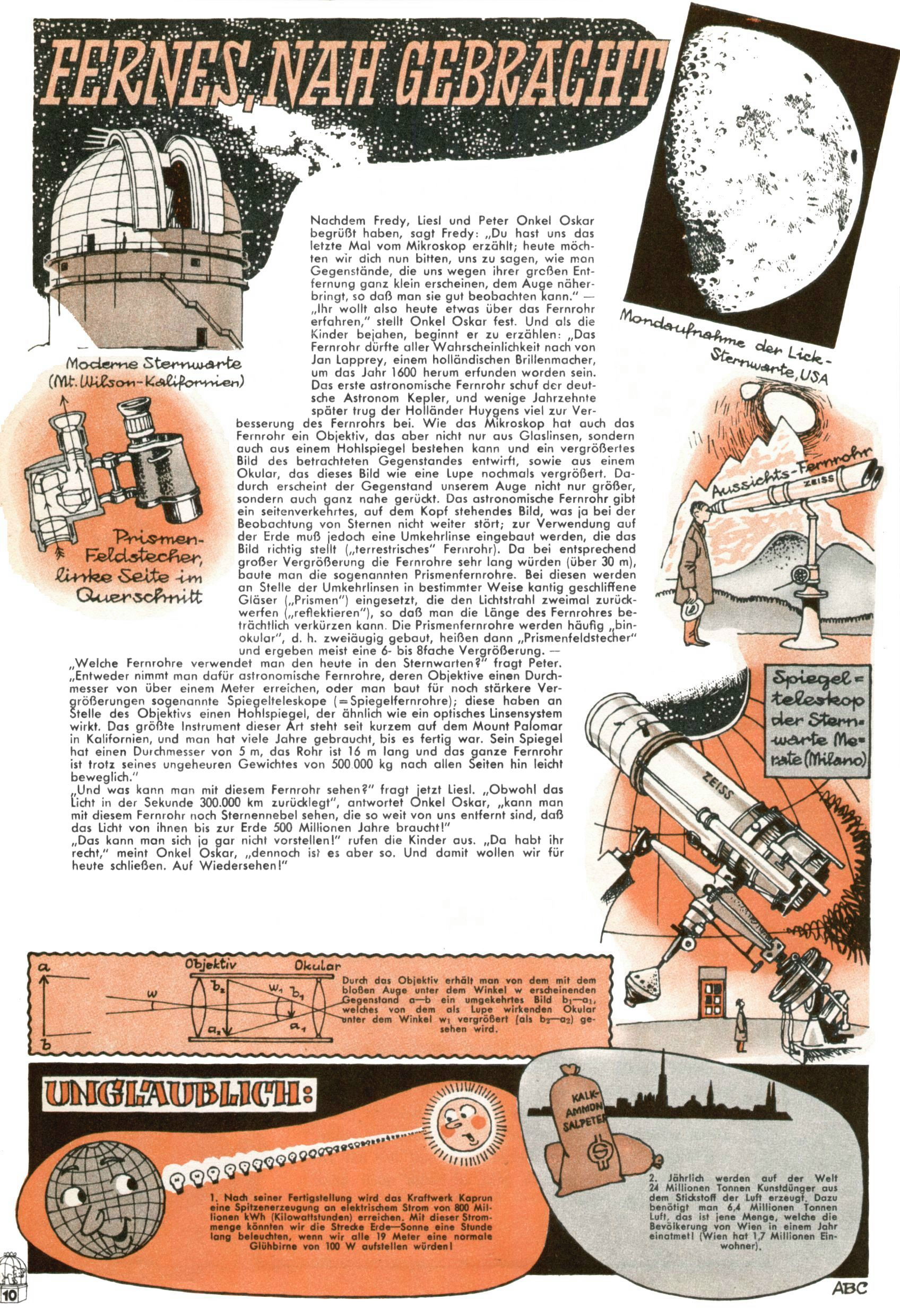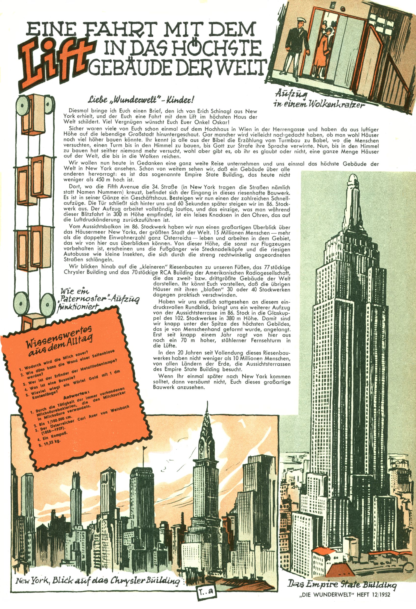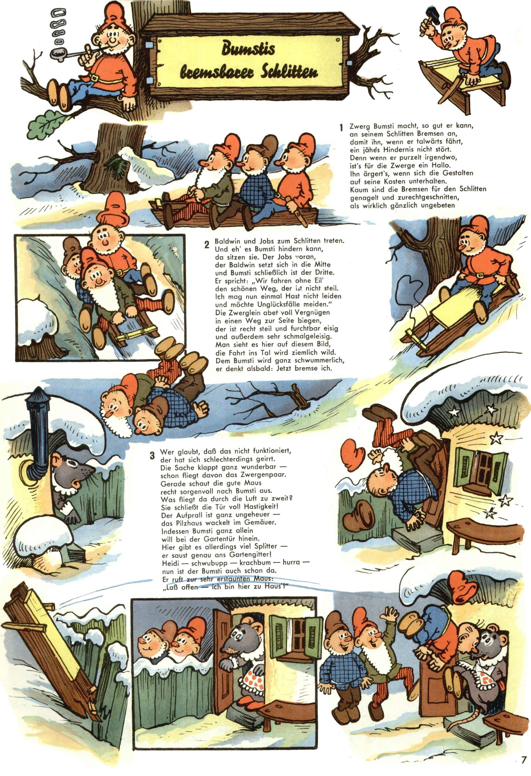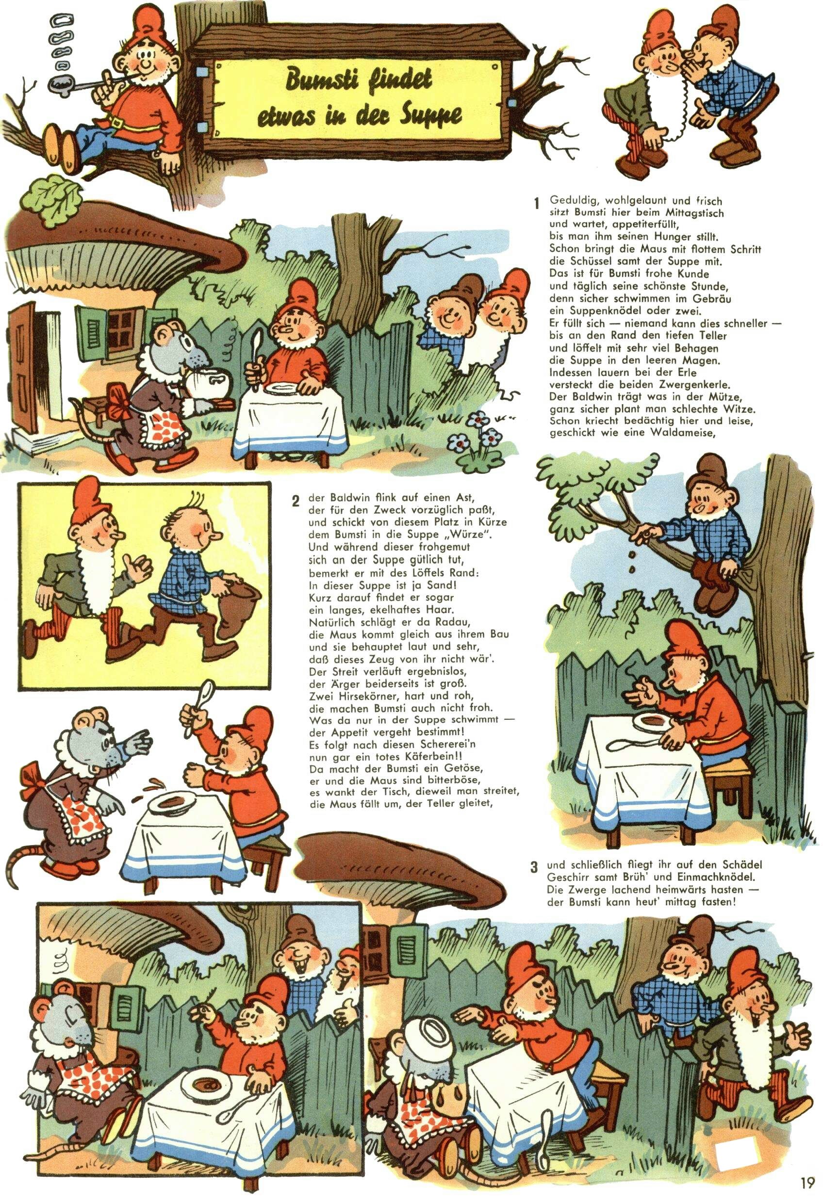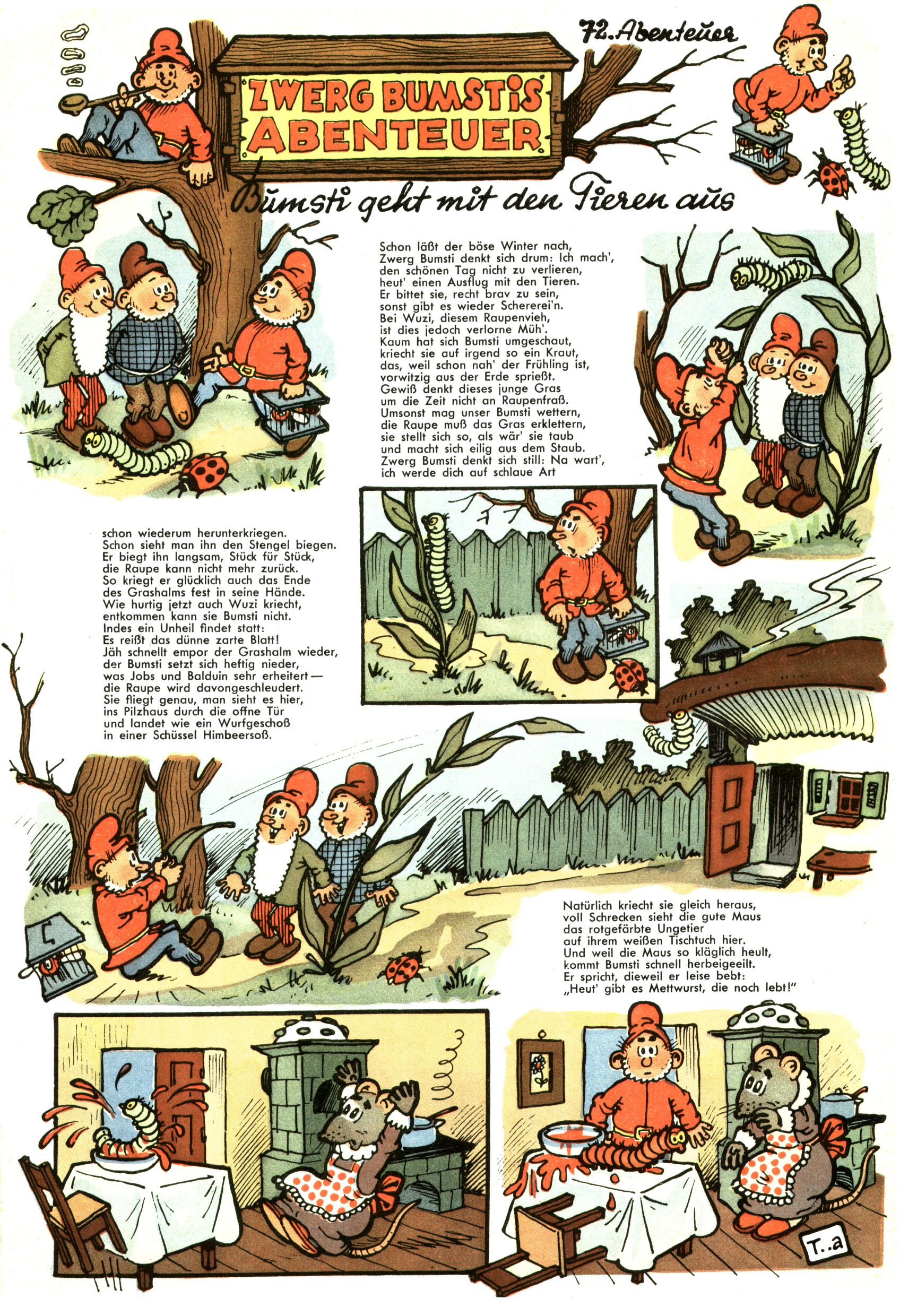 1952 – Der Erfolg hält an Wem Erfolg zuteil wird, der hat wenig Anlass, sein Konzept zu ändern. Und das war in gewisser Weise auch gut so bei allen inhaltlichen Schwächen der Beiträge in der Wunderwelt 1952. Der Erfolg der Zeitung wurde in erster Linie von der grafischen Umsetzung getragen; die lieblichen Bilder einer heilen Märchenwelt ließen über die oft flauen, pädagogisch teilweise sogar fragwürdigen Texte hinwegsehen. Elfriede Vavrovsky schrieb fast alle Texte und Rosl Warzilek zeichnete immer mehr Titelbilder und Mittelmärchen. ABC Peter Paul Prinz hatte Ende 1951 Meister Hokus als komischen Widerpart vom Zauberlehrling Willibald entdeckt und perfektionierte diesen Dualismus nun immer mehr. Meister Hokus avancierte zur regelmäßigen Lachnummer. Dafür überließ ABC vorübergehend Teja Aicher die Gestaltung der technischen Seite, dessen Zwerg Bumsti ebenfalls bereits untrennbar mit der Wunderwelt verbunden schien und längst zum Markenzeichen aufgestiegen war. Seine ko(s)mischen Superhelden Piff und Paff hatten jedoch allmählich genug von den Menschen und kehrten der Erde den Rücken zu. Für den Einsatz im Schulunterricht wurden weiterhin von Elfriede Vavrovsky erstellte politische und geografische Daten und Karten gedruckt, was gerne angenommen wurde, denn teure Atlanten gab es 1952 noch wenige, als viele politische Grenzen gar nicht endgültig geklärt schienen. |