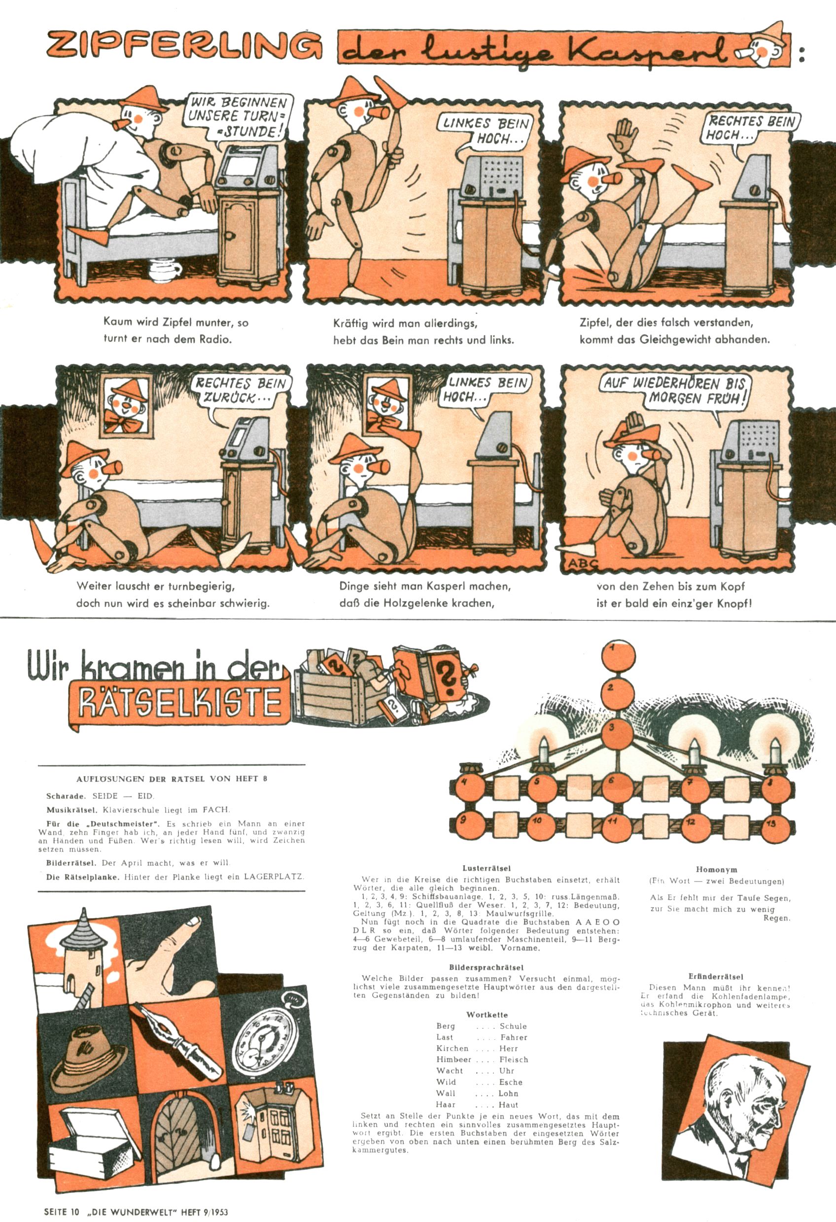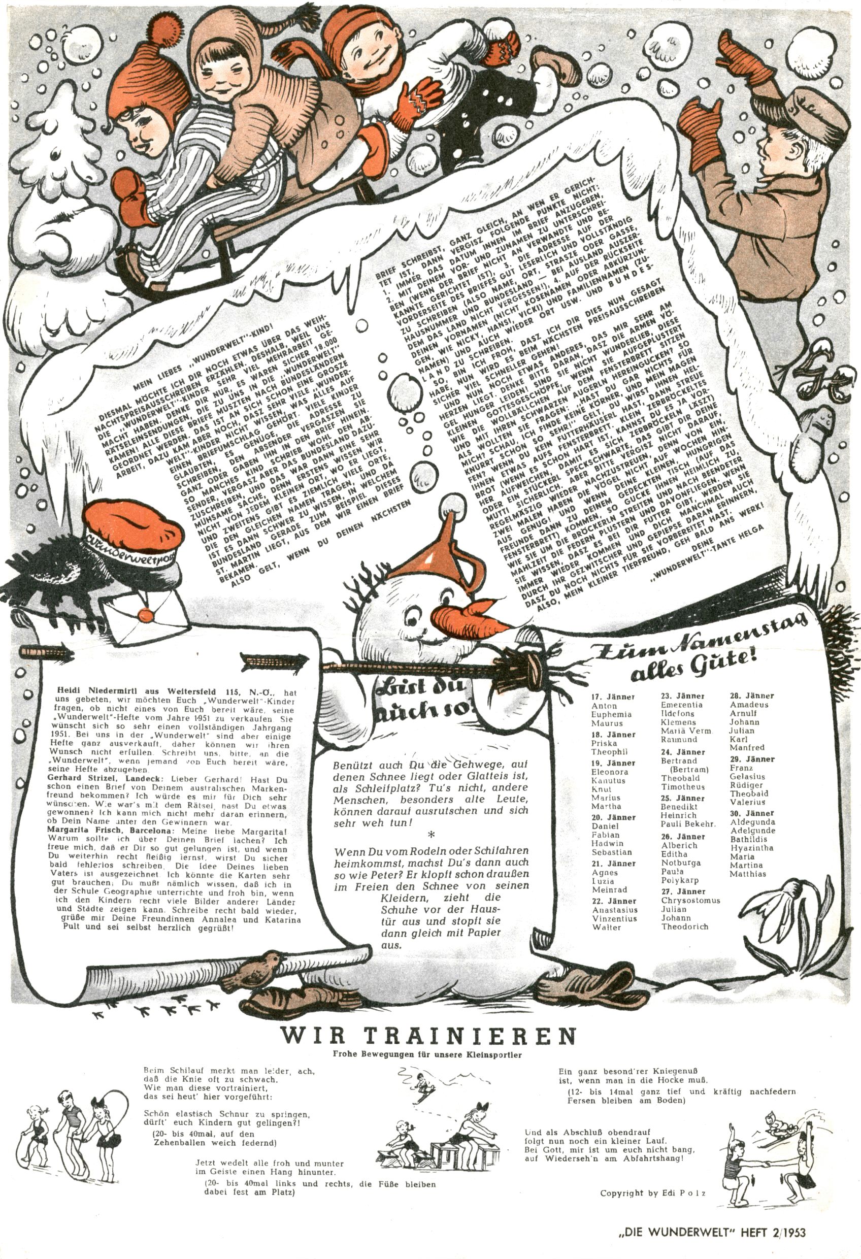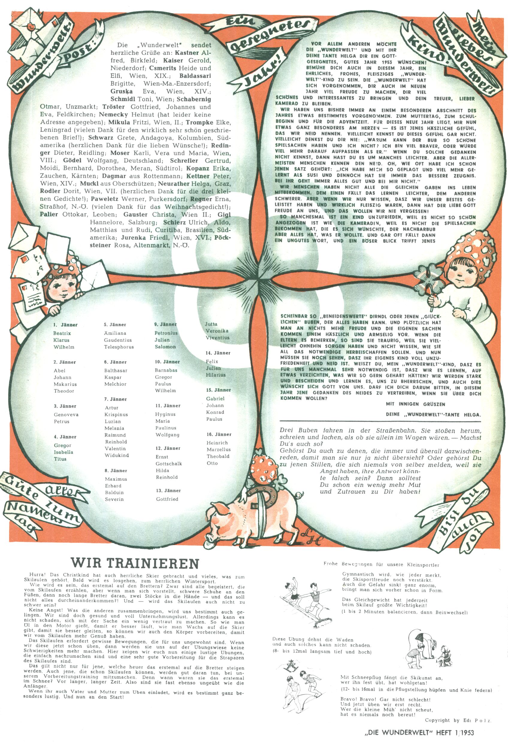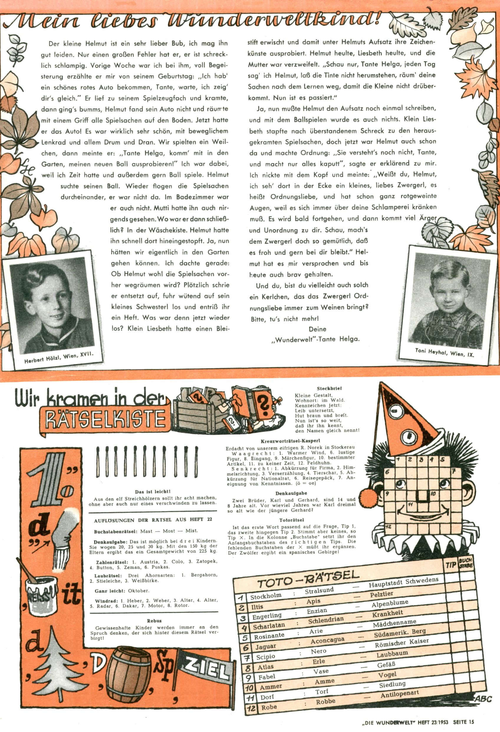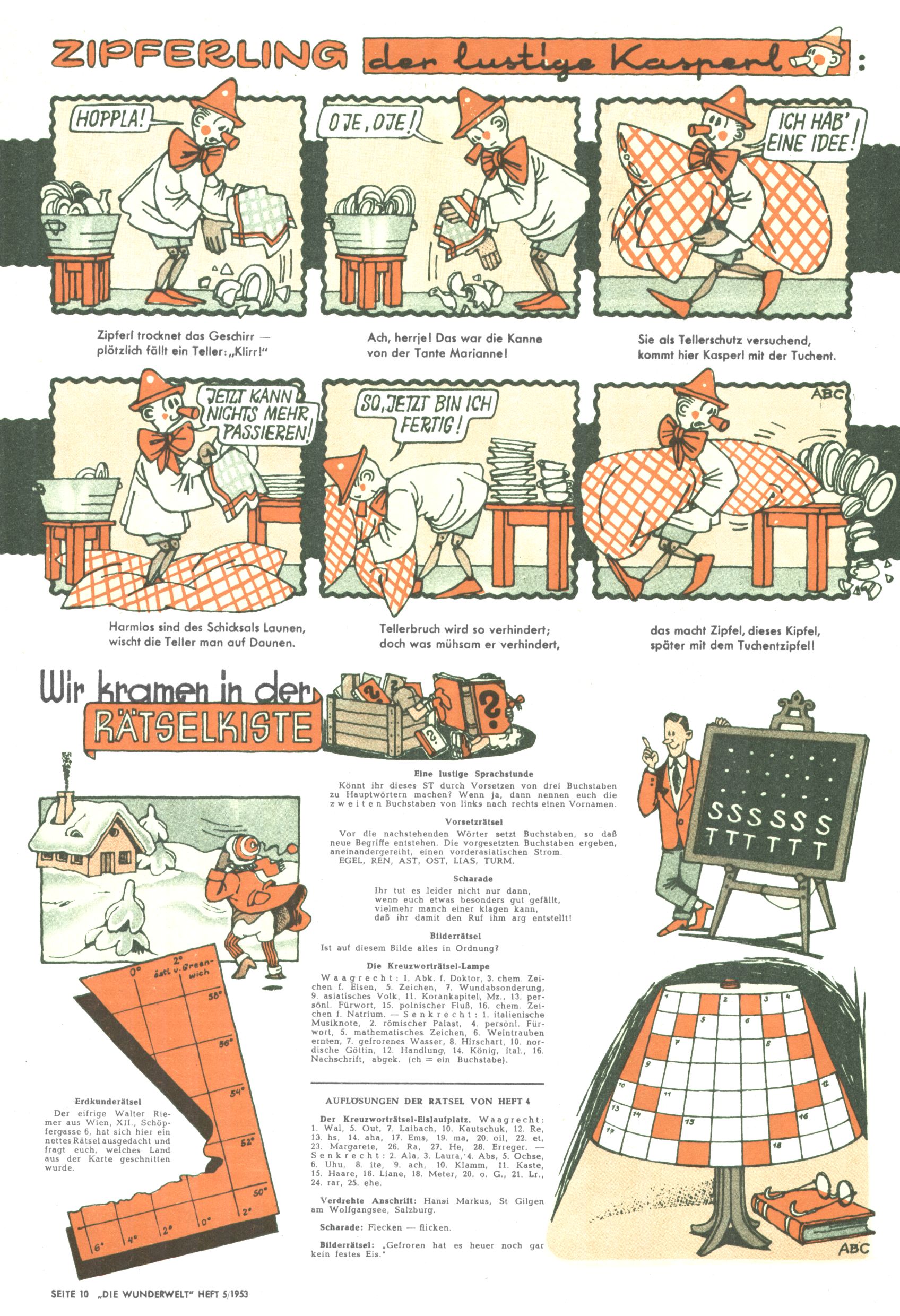 1953 – Alles beim Alten Wie lange darf man sich auf einem Erfolgskonzept ausruhen? Auch 1953 gab es keine offensichtlichen Änderungen am Layout der Zeitung. Zwar wurde Elfriede Vavrovsky teilweise durch andere Autoren abgelöst und erstmals kam Friedrich Bauer zum Zug, der bisher nur als Rätselonkel in Erscheinung getreten war. Allerdings ist anzunehmen, dass eine ganze Reihe unsignierter Erzählungen früherer Hefte ebenfalls der Feder von fb entstammen. ABC Peter Paul Prinz übernahm neuerlich die Illustration der technischen Seiten. Sein Willibald erschien ab sofort in 3 Spalten anstelle von 4 Zeilen, was ihm wesentlich mehr Gestaltungsfreiheit bot. Teja Aicher erfand die Clowns Benjamin und Kasimir nachdem ABC mit seiner Miniserie Zipferling, der lustige Kasperl bereits ein halbes Jahr zuvor durchaus mit Lachern punkten hatte können. Benjamin und Kasimir erschienen 1953 in jedem 2. Heft; nach dem Abdanken von Piff und Paff dann in jeder Ausgabe. Vom Aufbau her ähnelte die Serie dem Erfolgscartoon Willibald, der Zauberlehrling, ohne jedoch (aufgrund ihrer allzu "beschränkten" Möglichkeiten) an den Erfolg des Zauberlehrlings anknüpfen zu können. Nach dem Abschluss der Atlas-Daten und Karten erfand Annelies Umlauf Lamatsch weitere realitätsfremde Geschichten über die Natur und im Speziellen über Blumen. Eine medizinisch-biologische Spalte über den menschlichen Körper von Ewald Seifert war hingegen sachlicher und informativ. Ein kurzzeitiger Neuzugang bei den Grafikern war Hedwig Zumtobel. Sie wurde jedoch bald von Luzia Adelsberger abgelöst, die sich über Jahre hindurch als Zeichnerin etablierte. Friederike Nekut übernahm die Bastelseite für Mädchen. Die Kolumne Die Puppenschneiderin wurde mit Unser Hausmütterchen ergänzt, wodurch das handwerkliche Angebot für Mädchen erweitert werden konnte. Eine wesentliche Änderung am Titelblatt gab es 1953 aber doch: Endlich hatte man dem Erfolg von Zwerg Bumsti Rechnung getragen und ihn ins Logo erhoben. Er löste dort den Zwerg Bums aus dem Jahr 1948 in seiner Gondel ab, der zwar als Namenspatron für Zwerg Bumsti hergehalten hatte, mit dem es ansonsten aber keine Gemeinsamkeiten gab. |
