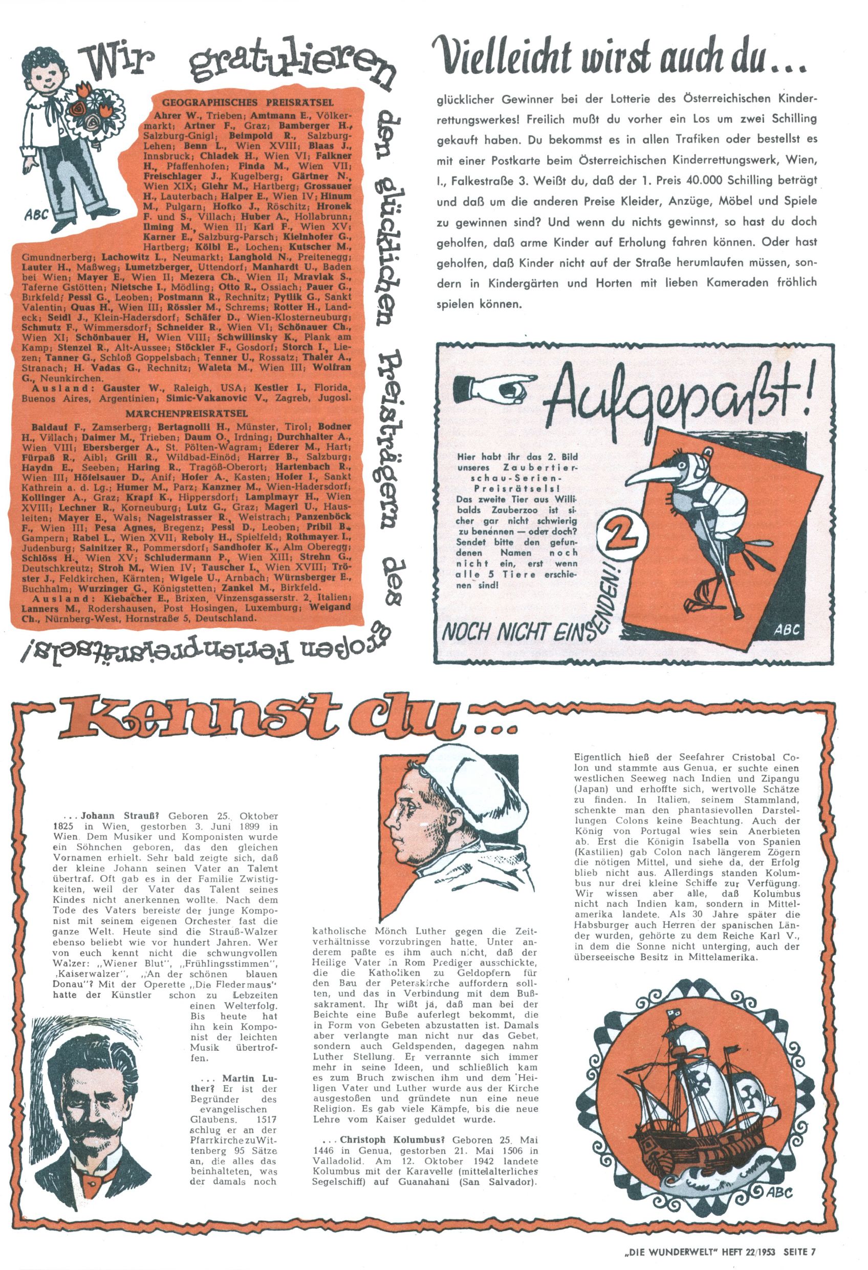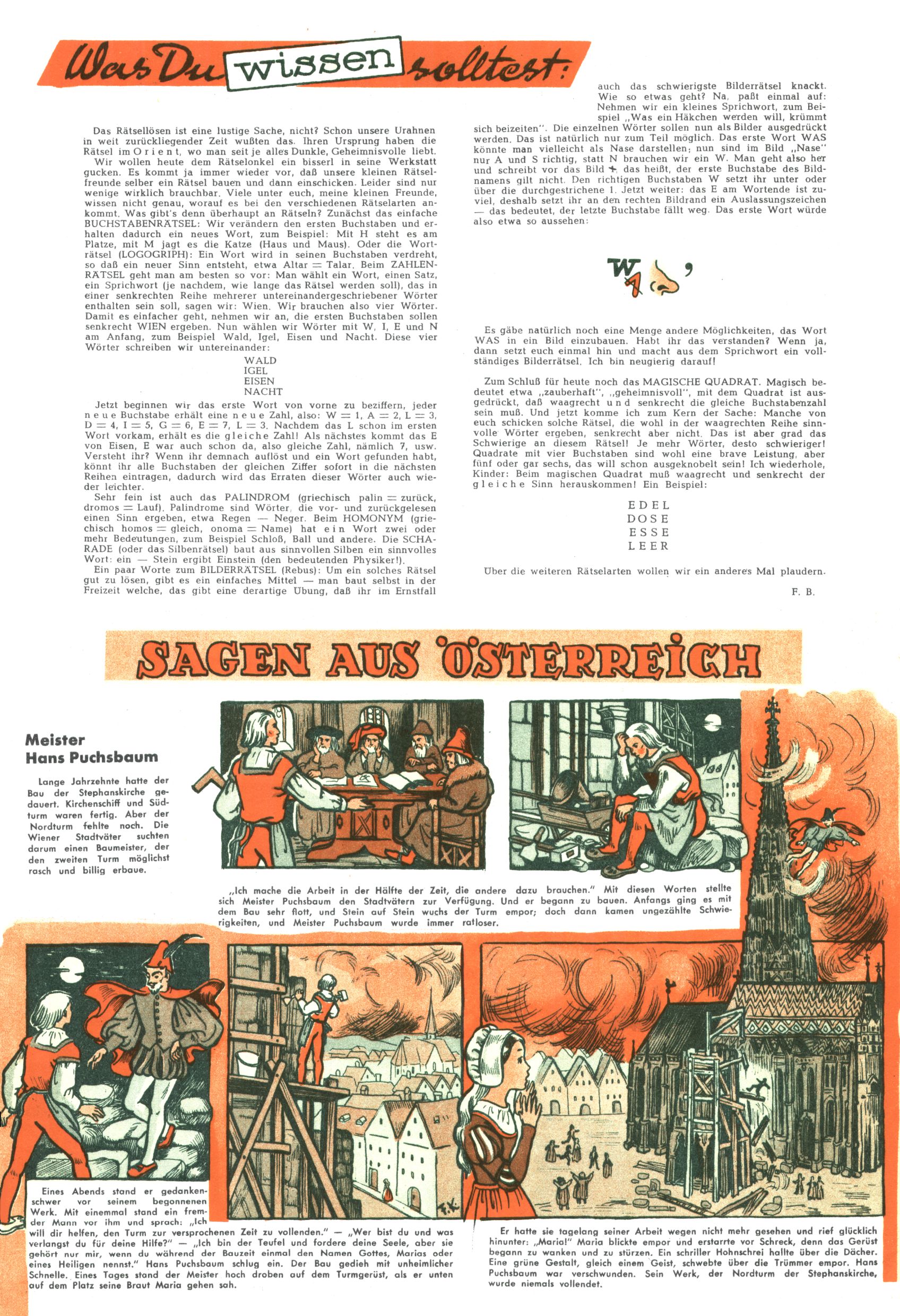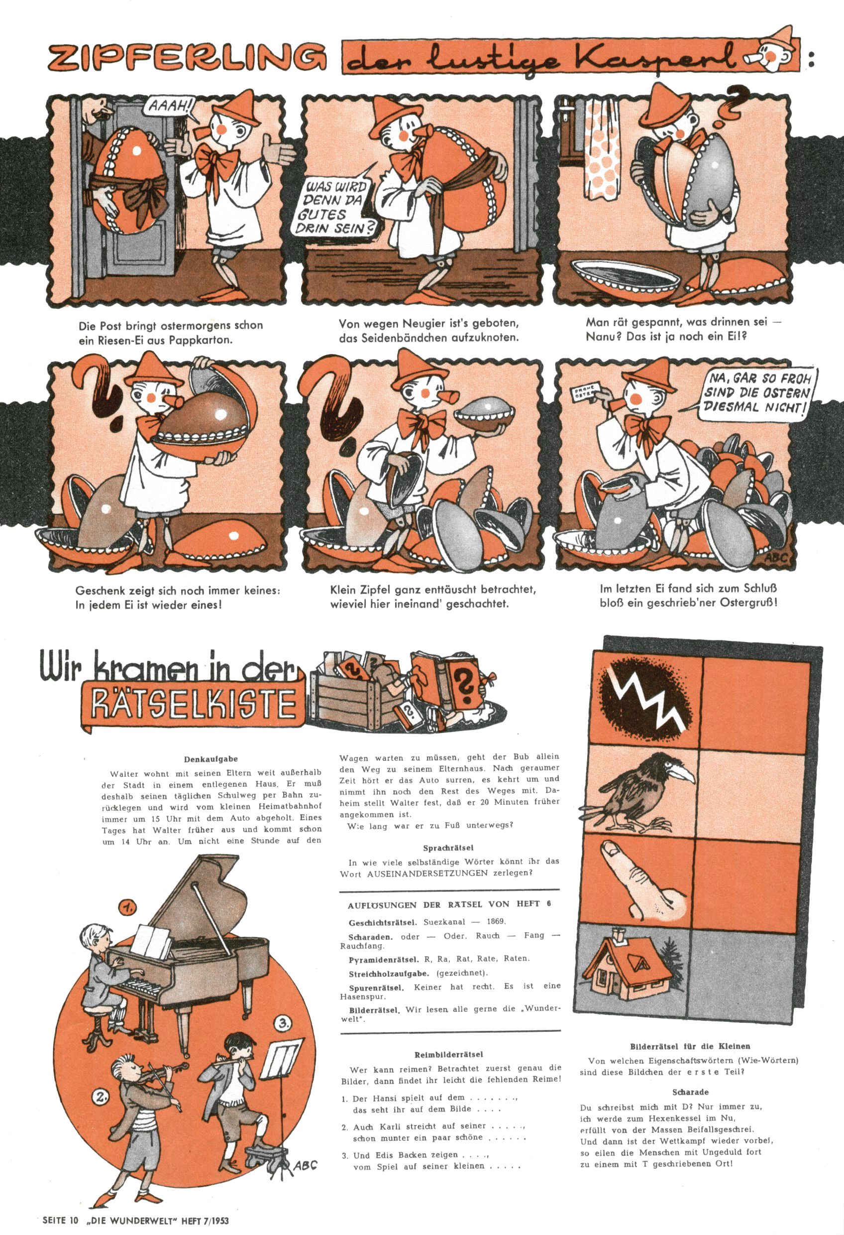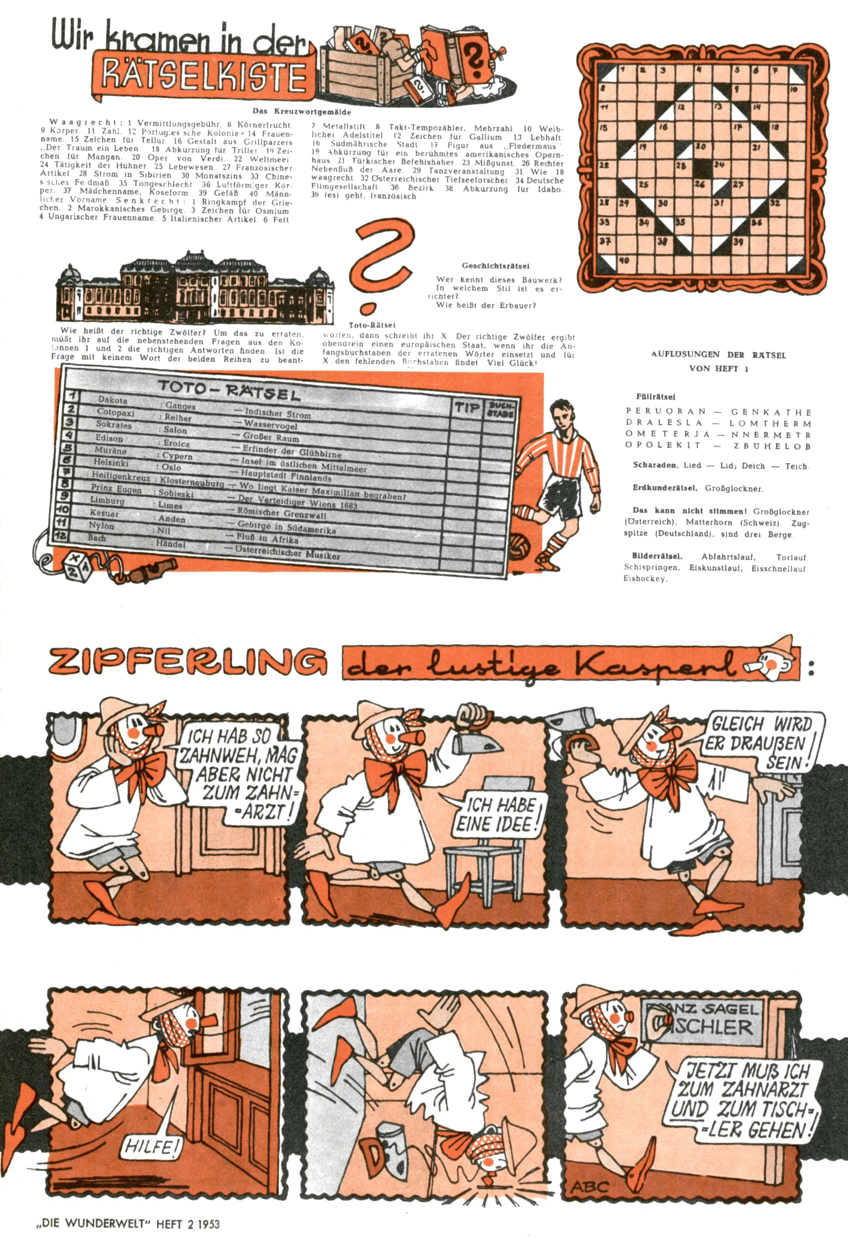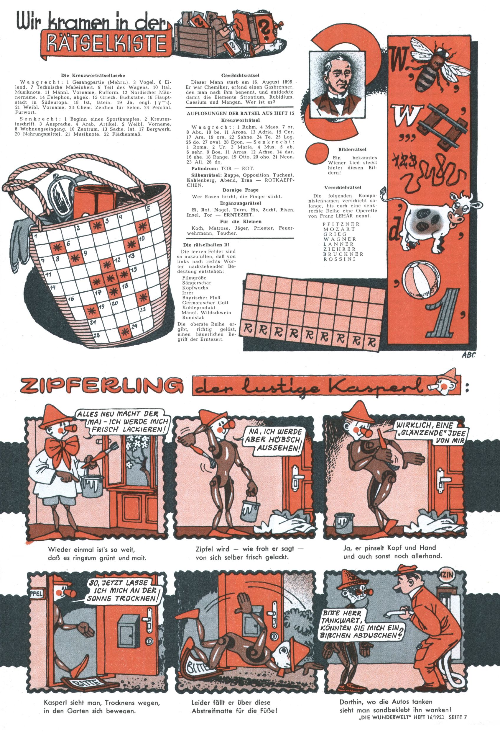 1953 – Alles beim Alten Wie lange darf man sich auf einem Erfolgskonzept ausruhen? Auch 1953 gab es keine offensichtlichen Änderungen am Layout der Zeitung. Zwar wurde Elfriede Vavrovsky teilweise durch andere Autoren abgelöst und erstmals kam Friedrich Bauer zum Zug, der bisher nur als Rätselonkel in Erscheinung getreten war. Allerdings ist anzunehmen, dass eine ganze Reihe unsignierter Erzählungen früherer Hefte ebenfalls der Feder von fb entstammen. ABC Peter Paul Prinz übernahm neuerlich die Illustration der technischen Seiten. Sein Willibald erschien ab sofort in 3 Spalten anstelle von 4 Zeilen, was ihm wesentlich mehr Gestaltungsfreiheit bot. Teja Aicher erfand die Clowns Benjamin und Kasimir nachdem ABC mit seiner Miniserie Zipferling, der lustige Kasperl bereits ein halbes Jahr zuvor durchaus mit Lachern punkten hatte können. Benjamin und Kasimir erschienen 1953 in jedem 2. Heft; nach dem Abdanken von Piff und Paff dann in jeder Ausgabe. Vom Aufbau her ähnelte die Serie dem Erfolgscartoon Willibald, der Zauberlehrling, ohne jedoch (aufgrund ihrer allzu "beschränkten" Möglichkeiten) an den Erfolg des Zauberlehrlings anknüpfen zu können. Nach dem Abschluss der Atlas-Daten und Karten erfand Annelies Umlauf Lamatsch weitere realitätsfremde Geschichten über die Natur und im Speziellen über Blumen. Eine medizinisch-biologische Spalte über den menschlichen Körper von Ewald Seifert war hingegen sachlicher und informativ. Ein kurzzeitiger Neuzugang bei den Grafikern war Hedwig Zumtobel. Sie wurde jedoch bald von Luzia Adelsberger abgelöst, die sich über Jahre hindurch als Zeichnerin etablierte. Friederike Nekut übernahm die Bastelseite für Mädchen. Die Kolumne Die Puppenschneiderin wurde mit Unser Hausmütterchen ergänzt, wodurch das handwerkliche Angebot für Mädchen erweitert werden konnte. Eine wesentliche Änderung am Titelblatt gab es 1953 aber doch: Endlich hatte man dem Erfolg von Zwerg Bumsti Rechnung getragen und ihn ins Logo erhoben. Er löste dort den Zwerg Bums aus dem Jahr 1948 in seiner Gondel ab, der zwar als Namenspatron für Zwerg Bumsti hergehalten hatte, mit dem es ansonsten aber keine Gemeinsamkeiten gab. |