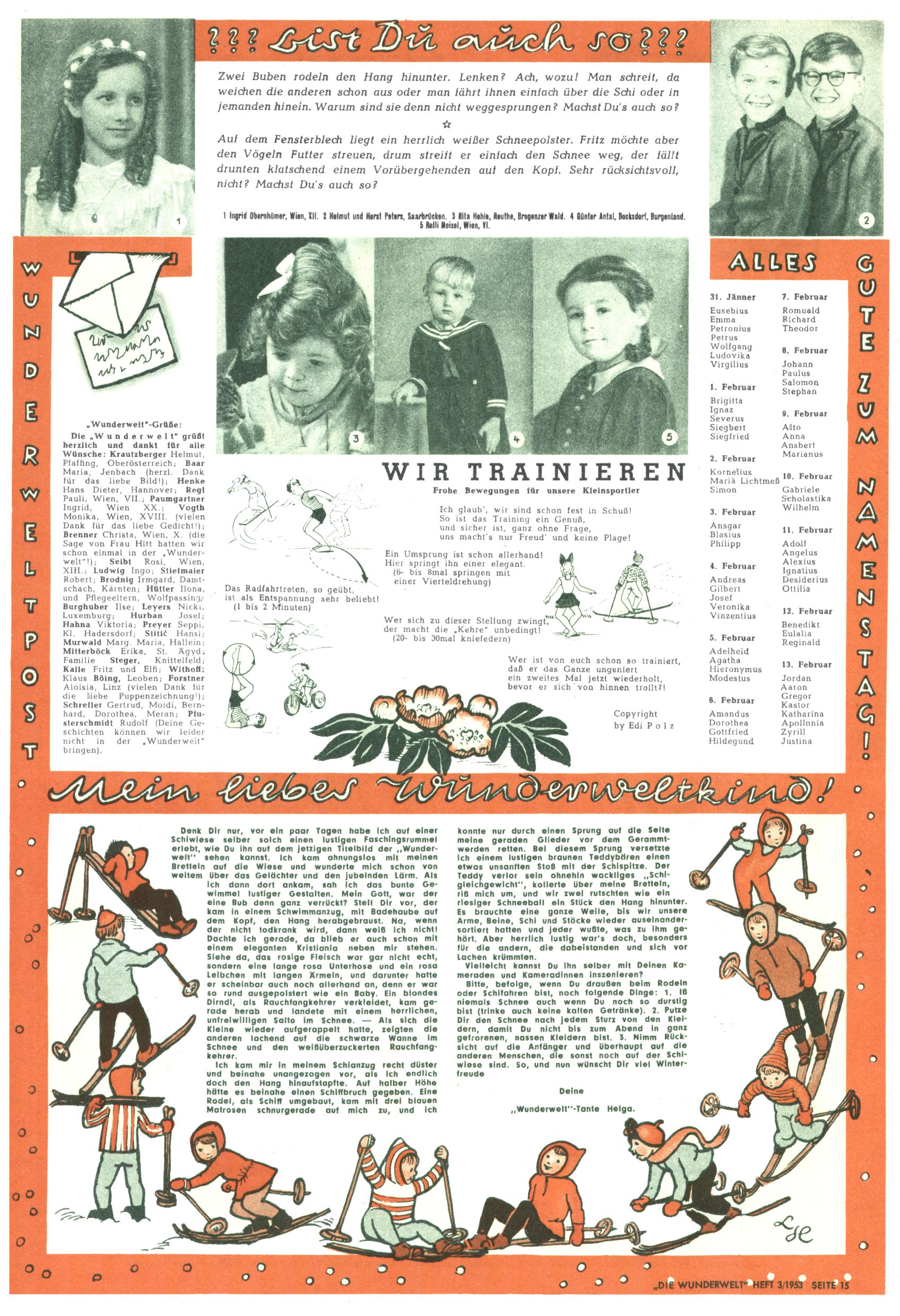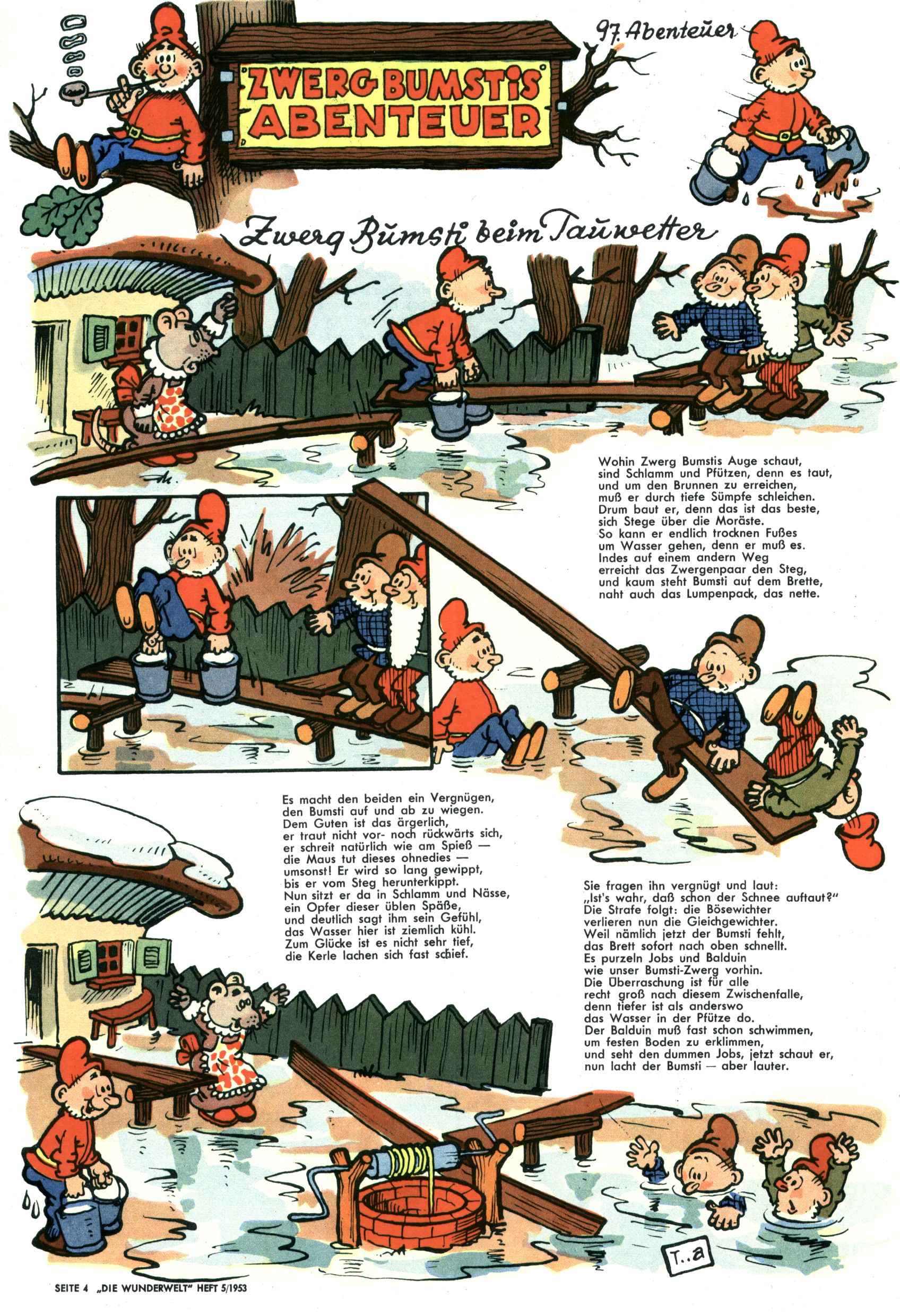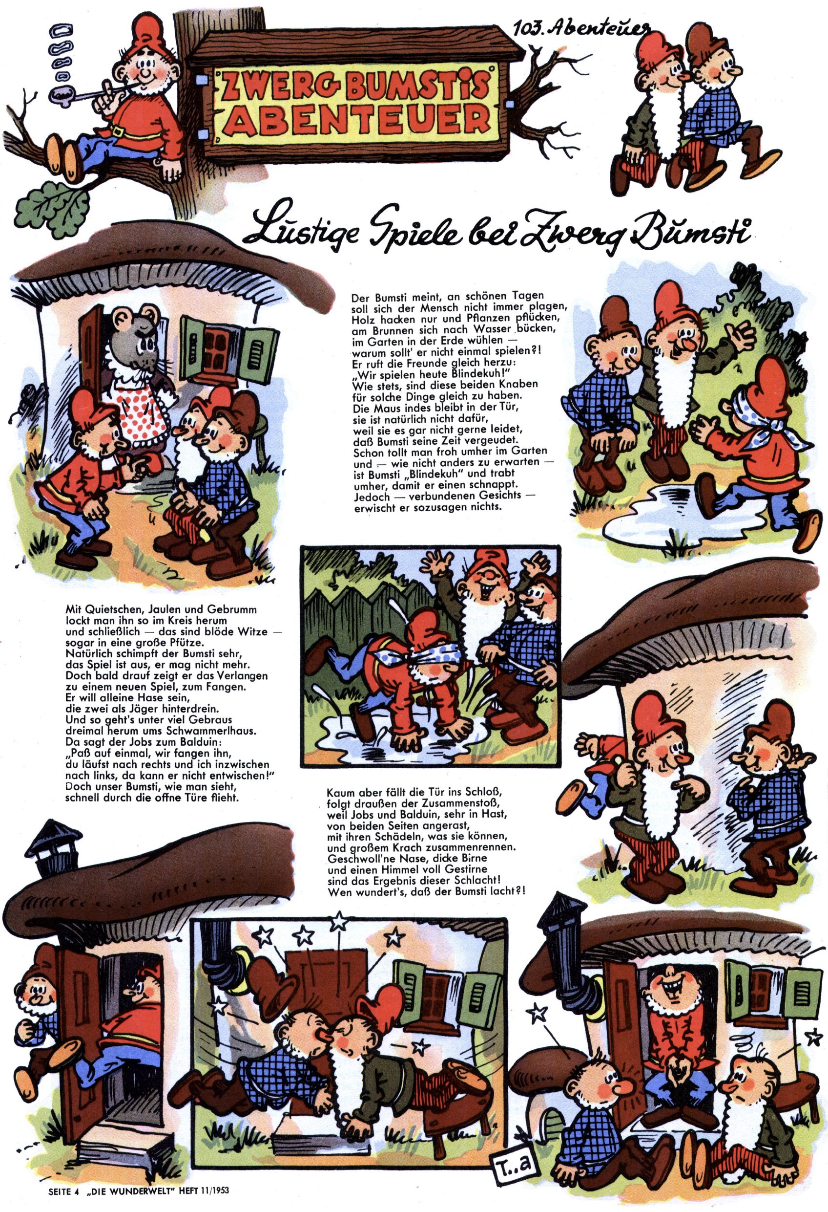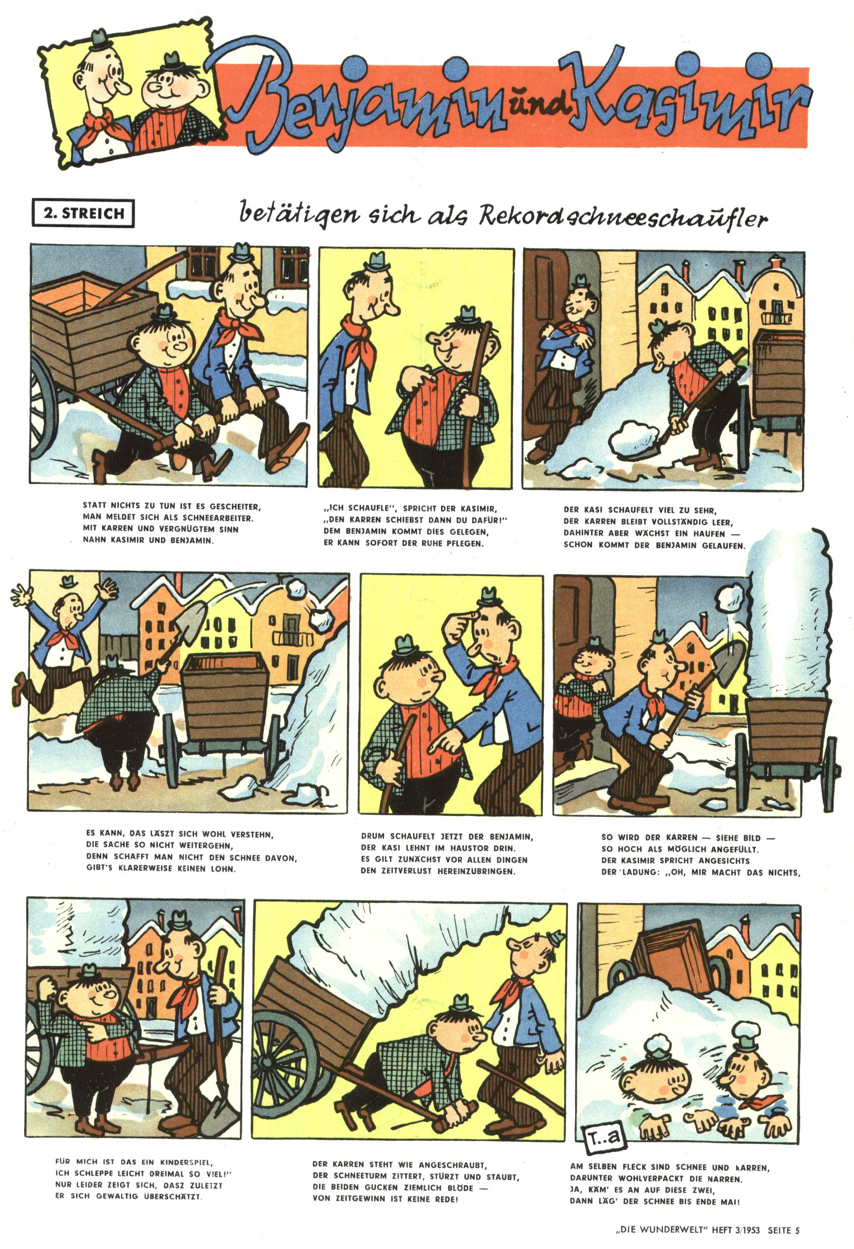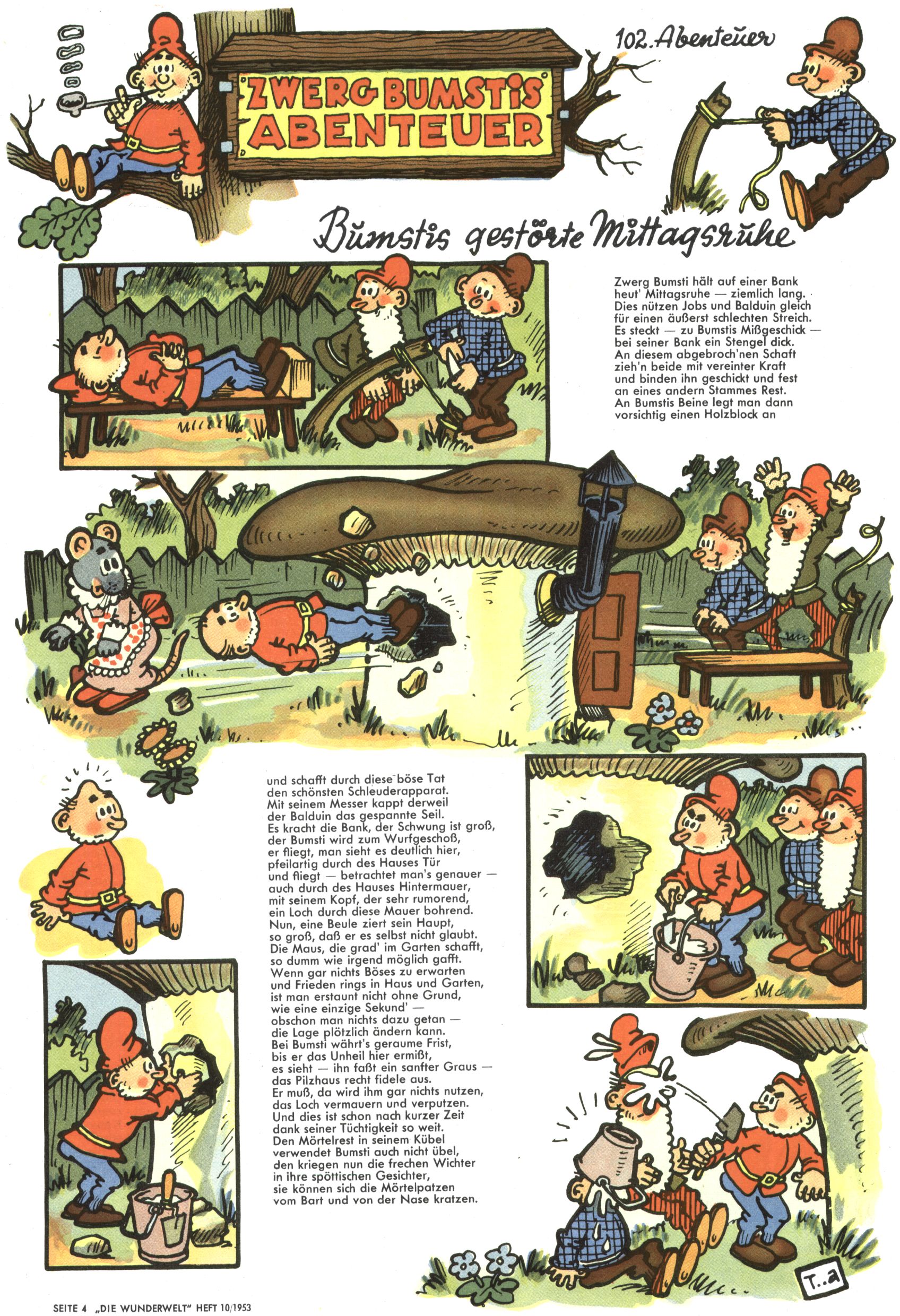 1953 – Alles beim Alten Wie lange darf man sich auf einem Erfolgskonzept ausruhen? Auch 1953 gab es keine offensichtlichen Änderungen am Layout der Zeitung. Zwar wurde Elfriede Vavrovsky teilweise durch andere Autoren abgelöst und erstmals kam Friedrich Bauer zum Zug, der bisher nur als Rätselonkel in Erscheinung getreten war. Allerdings ist anzunehmen, dass eine ganze Reihe unsignierter Erzählungen früherer Hefte ebenfalls der Feder von fb entstammen. ABC Peter Paul Prinz übernahm neuerlich die Illustration der technischen Seiten. Sein Willibald erschien ab sofort in 3 Spalten anstelle von 4 Zeilen, was ihm wesentlich mehr Gestaltungsfreiheit bot. Teja Aicher erfand die Clowns Benjamin und Kasimir nachdem ABC mit seiner Miniserie Zipferling, der lustige Kasperl bereits ein halbes Jahr zuvor durchaus mit Lachern punkten hatte können. Benjamin und Kasimir erschienen 1953 in jedem 2. Heft; nach dem Abdanken von Piff und Paff dann in jeder Ausgabe. Vom Aufbau her ähnelte die Serie dem Erfolgscartoon Willibald, der Zauberlehrling, ohne jedoch (aufgrund ihrer allzu "beschränkten" Möglichkeiten) an den Erfolg des Zauberlehrlings anknüpfen zu können. Nach dem Abschluss der Atlas-Daten und Karten erfand Annelies Umlauf Lamatsch weitere realitätsfremde Geschichten über die Natur und im Speziellen über Blumen. Eine medizinisch-biologische Spalte über den menschlichen Körper von Ewald Seifert war hingegen sachlicher und informativ. Ein kurzzeitiger Neuzugang bei den Grafikern war Hedwig Zumtobel. Sie wurde jedoch bald von Luzia Adelsberger abgelöst, die sich über Jahre hindurch als Zeichnerin etablierte. Friederike Nekut übernahm die Bastelseite für Mädchen. Die Kolumne Die Puppenschneiderin wurde mit Unser Hausmütterchen ergänzt, wodurch das handwerkliche Angebot für Mädchen erweitert werden konnte. Eine wesentliche Änderung am Titelblatt gab es 1953 aber doch: Endlich hatte man dem Erfolg von Zwerg Bumsti Rechnung getragen und ihn ins Logo erhoben. Er löste dort den Zwerg Bums aus dem Jahr 1948 in seiner Gondel ab, der zwar als Namenspatron für Zwerg Bumsti hergehalten hatte, mit dem es ansonsten aber keine Gemeinsamkeiten gab. |