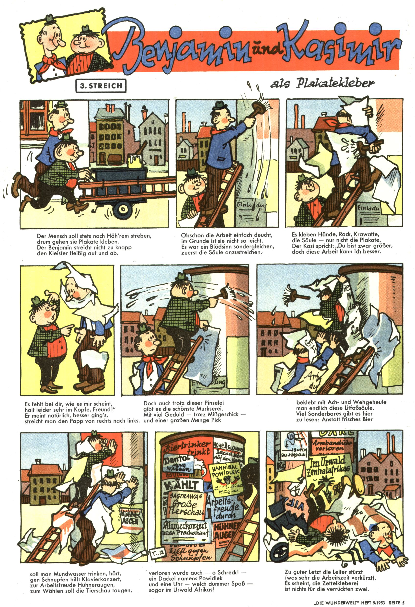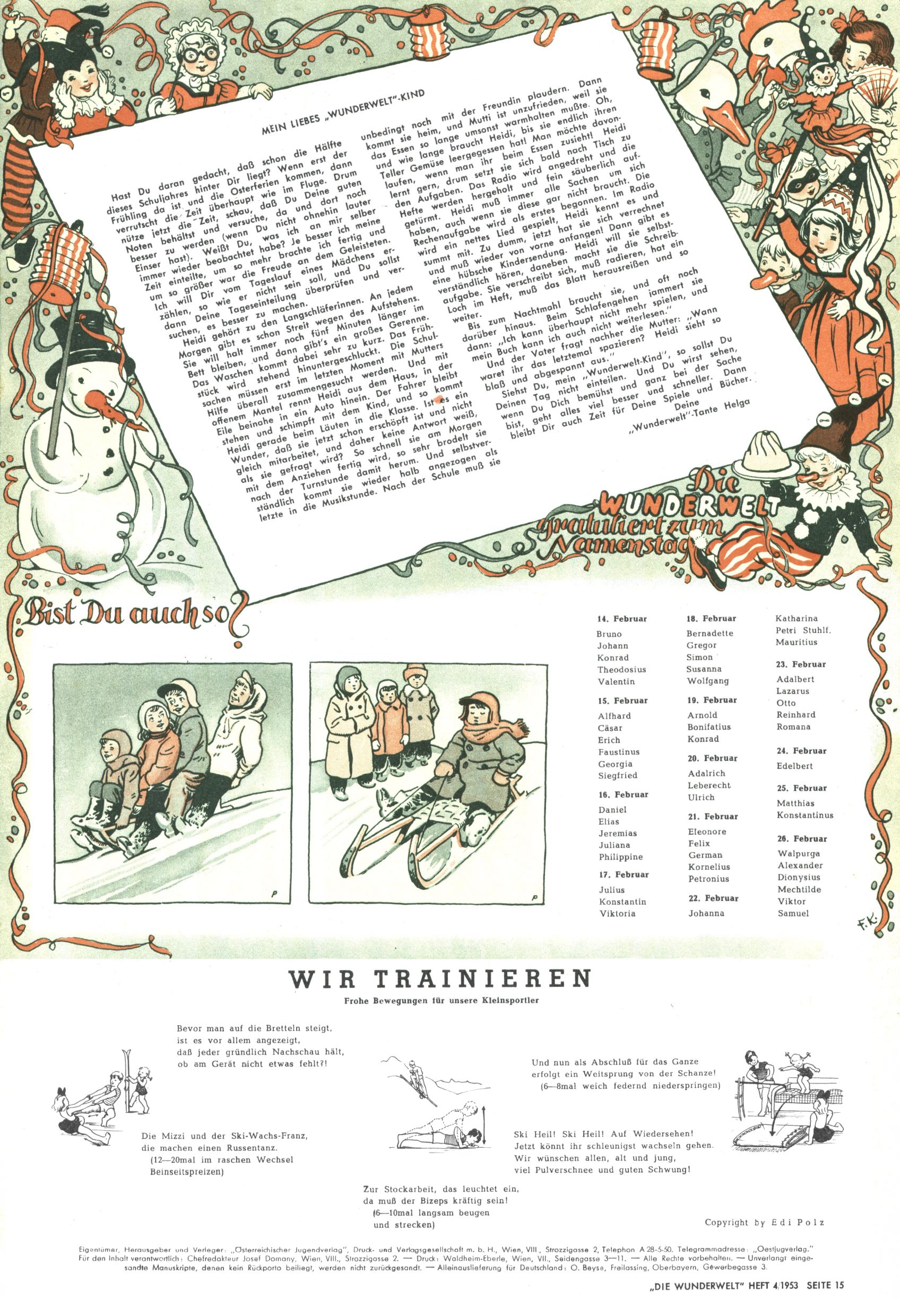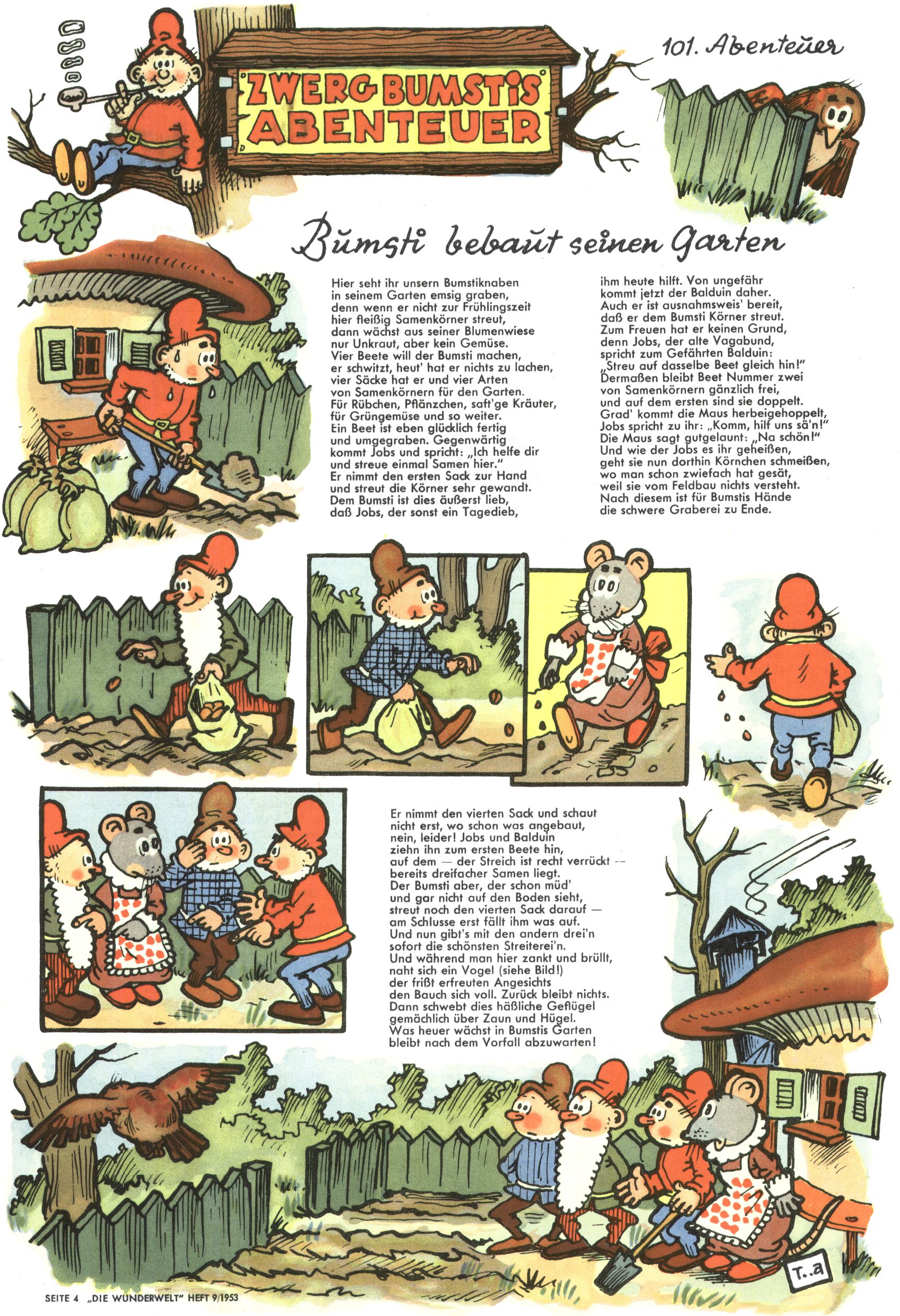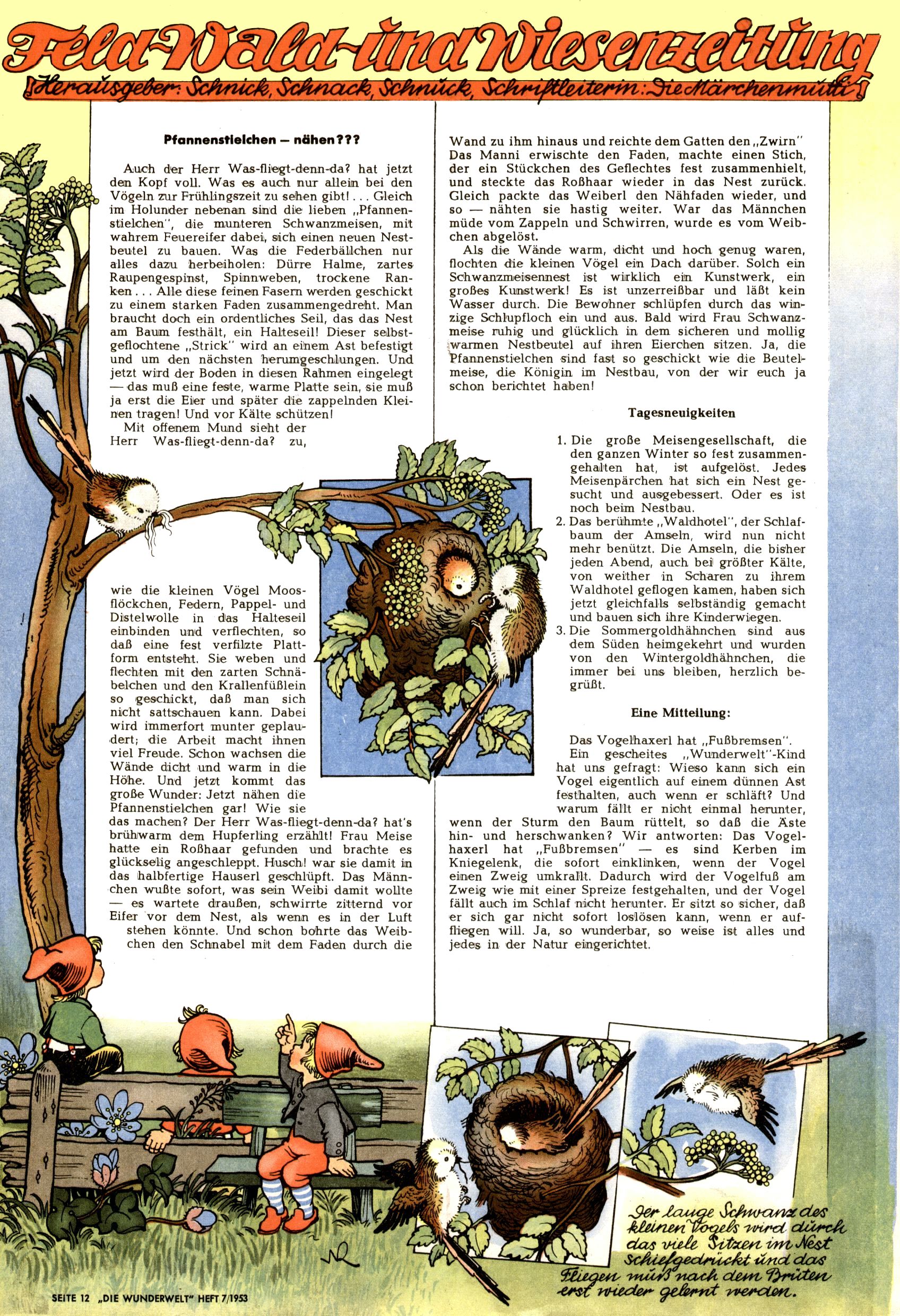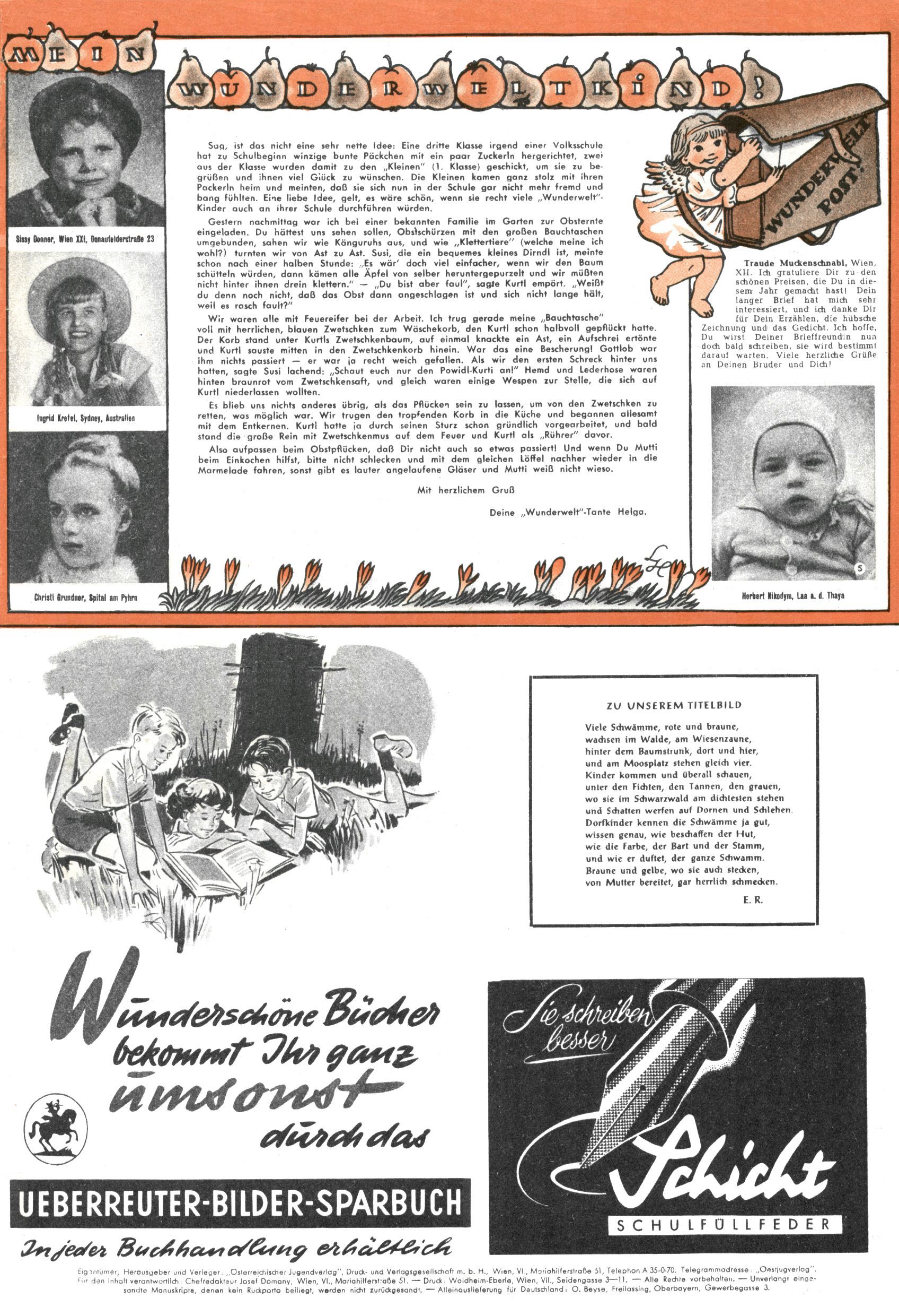 1953 – Alles beim Alten Wie lange darf man sich auf einem Erfolgskonzept ausruhen? Auch 1953 gab es keine offensichtlichen Änderungen am Layout der Zeitung. Zwar wurde Elfriede Vavrovsky teilweise durch andere Autoren abgelöst und erstmals kam Friedrich Bauer zum Zug, der bisher nur als Rätselonkel in Erscheinung getreten war. Allerdings ist anzunehmen, dass eine ganze Reihe unsignierter Erzählungen früherer Hefte ebenfalls der Feder von fb entstammen. ABC Peter Paul Prinz übernahm neuerlich die Illustration der technischen Seiten. Sein Willibald erschien ab sofort in 3 Spalten anstelle von 4 Zeilen, was ihm wesentlich mehr Gestaltungsfreiheit bot. Teja Aicher erfand die Clowns Benjamin und Kasimir nachdem ABC mit seiner Miniserie Zipferling, der lustige Kasperl bereits ein halbes Jahr zuvor durchaus mit Lachern punkten hatte können. Benjamin und Kasimir erschienen 1953 in jedem 2. Heft; nach dem Abdanken von Piff und Paff dann in jeder Ausgabe. Vom Aufbau her ähnelte die Serie dem Erfolgscartoon Willibald, der Zauberlehrling, ohne jedoch (aufgrund ihrer allzu "beschränkten" Möglichkeiten) an den Erfolg des Zauberlehrlings anknüpfen zu können. Nach dem Abschluss der Atlas-Daten und Karten erfand Annelies Umlauf Lamatsch weitere realitätsfremde Geschichten über die Natur und im Speziellen über Blumen. Eine medizinisch-biologische Spalte über den menschlichen Körper von Ewald Seifert war hingegen sachlicher und informativ. Ein kurzzeitiger Neuzugang bei den Grafikern war Hedwig Zumtobel. Sie wurde jedoch bald von Luzia Adelsberger abgelöst, die sich über Jahre hindurch als Zeichnerin etablierte. Friederike Nekut übernahm die Bastelseite für Mädchen. Die Kolumne Die Puppenschneiderin wurde mit Unser Hausmütterchen ergänzt, wodurch das handwerkliche Angebot für Mädchen erweitert werden konnte. Eine wesentliche Änderung am Titelblatt gab es 1953 aber doch: Endlich hatte man dem Erfolg von Zwerg Bumsti Rechnung getragen und ihn ins Logo erhoben. Er löste dort den Zwerg Bums aus dem Jahr 1948 in seiner Gondel ab, der zwar als Namenspatron für Zwerg Bumsti hergehalten hatte, mit dem es ansonsten aber keine Gemeinsamkeiten gab. |