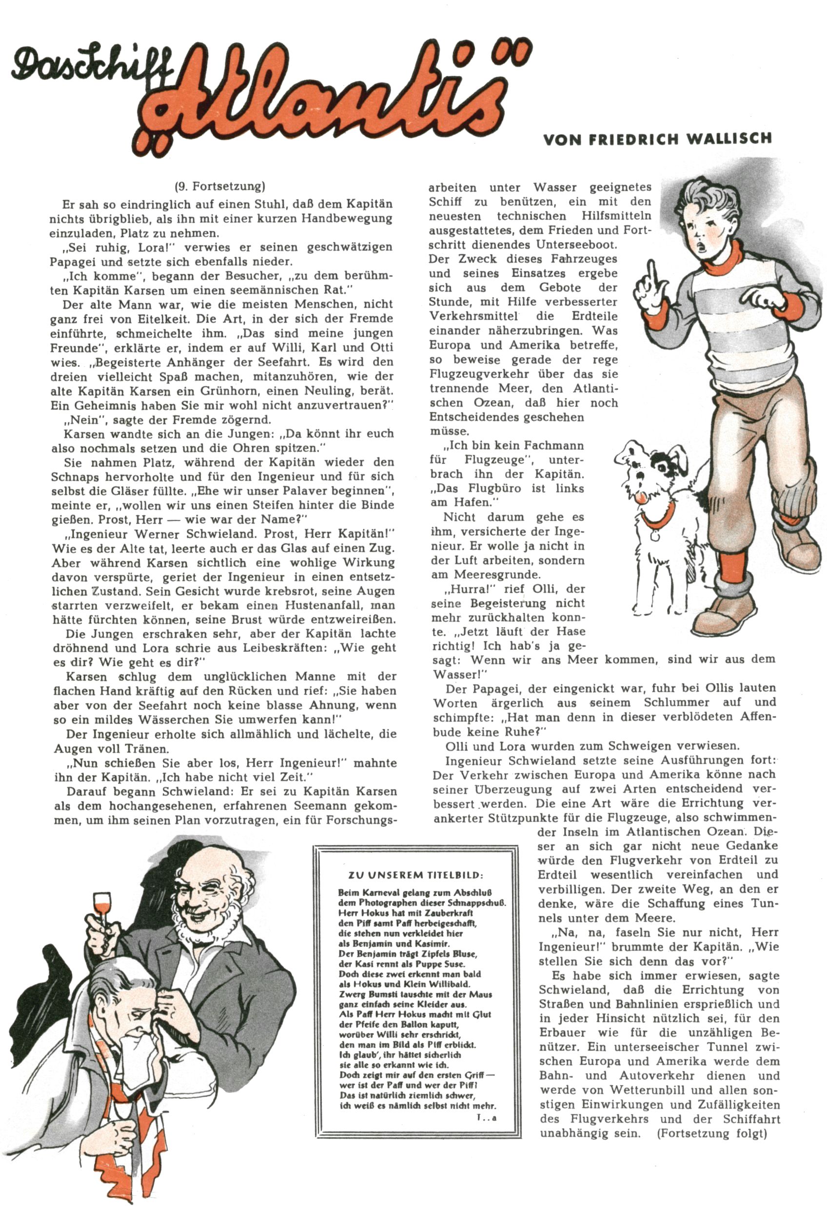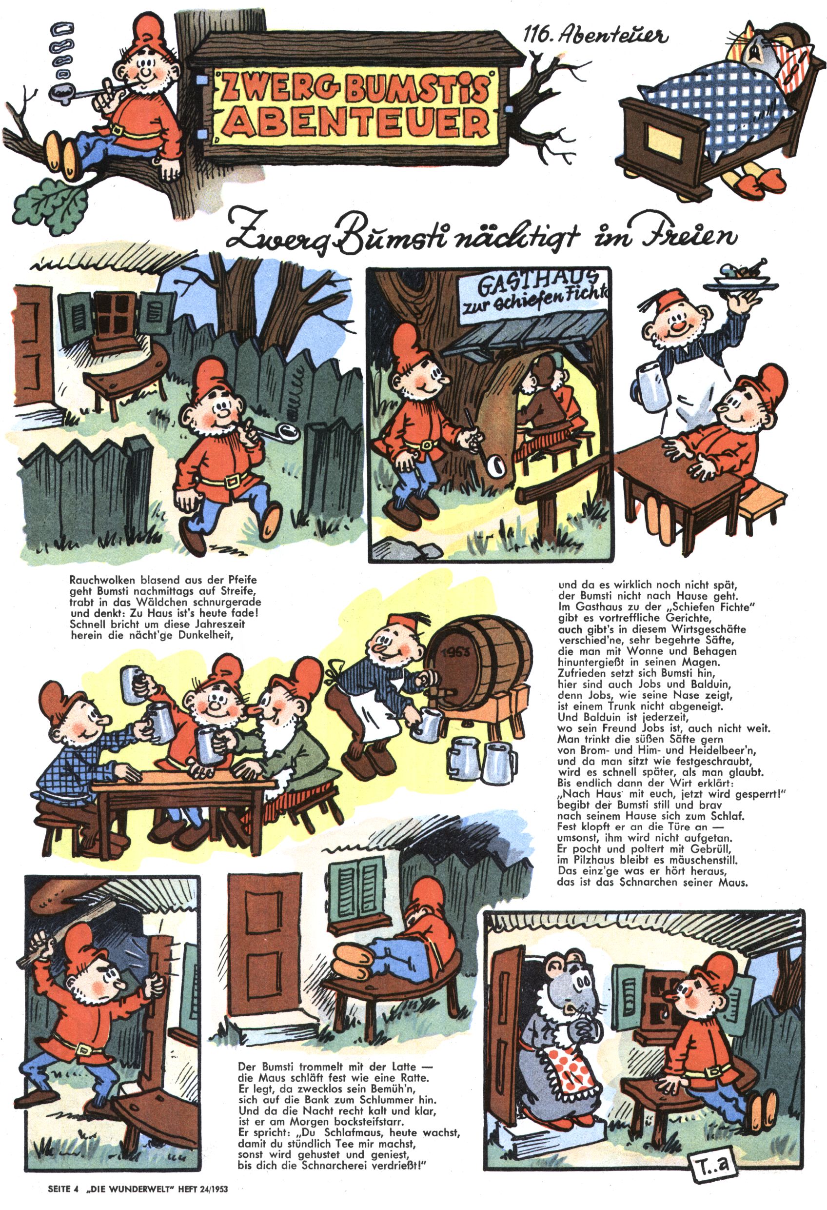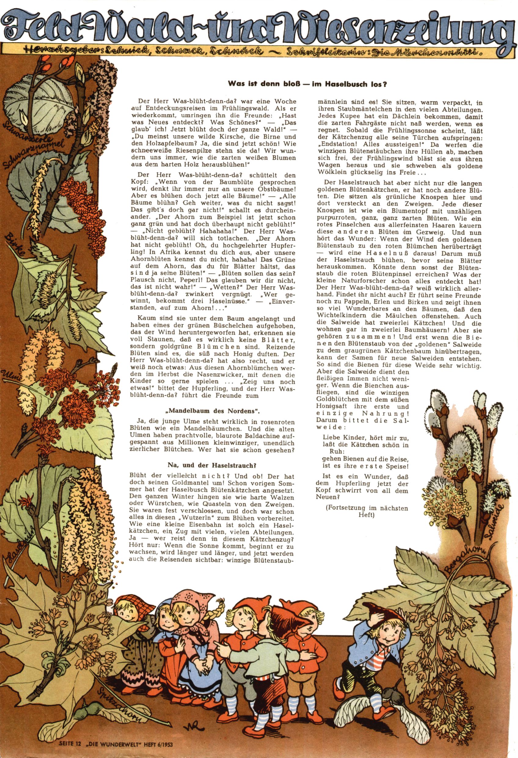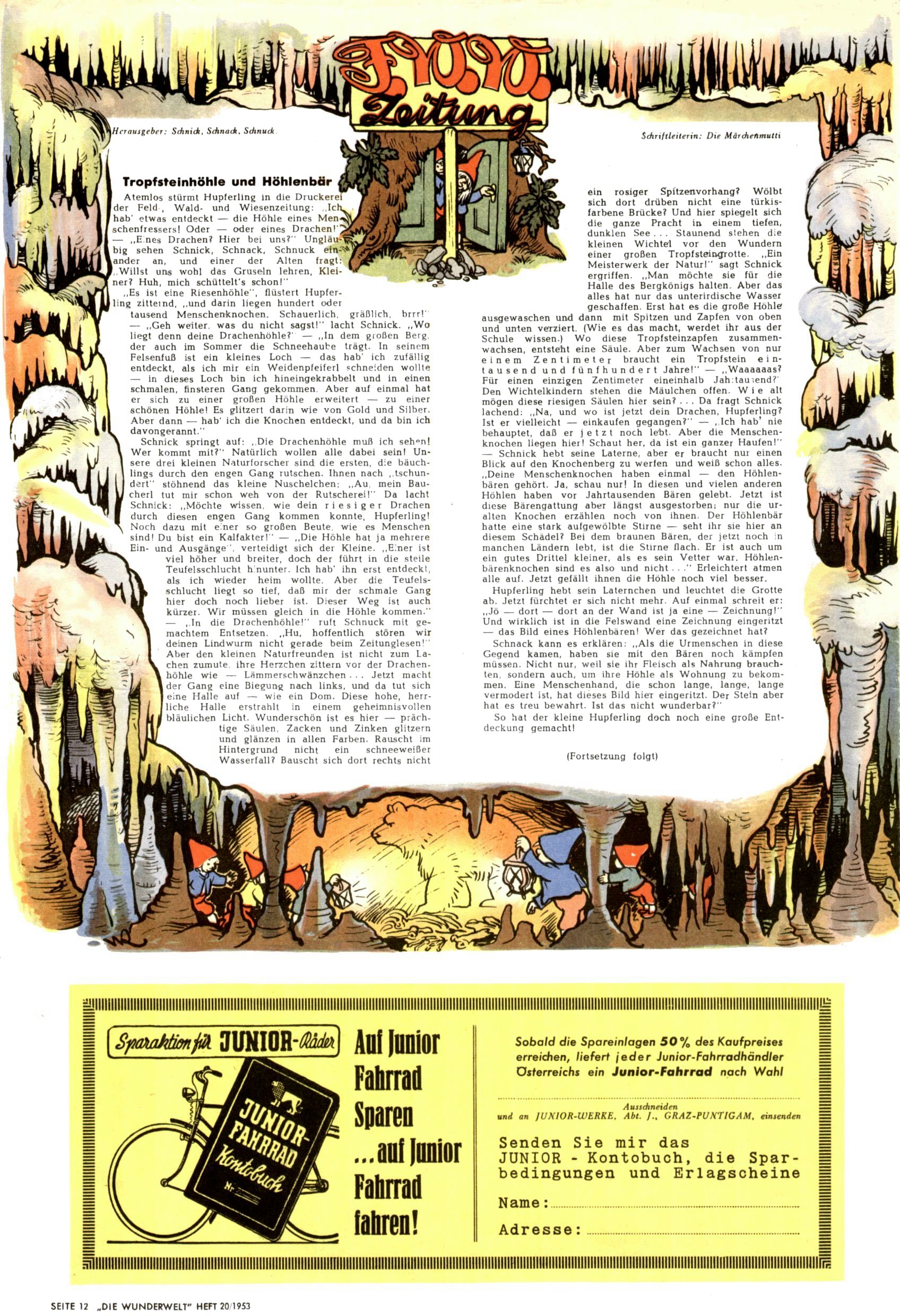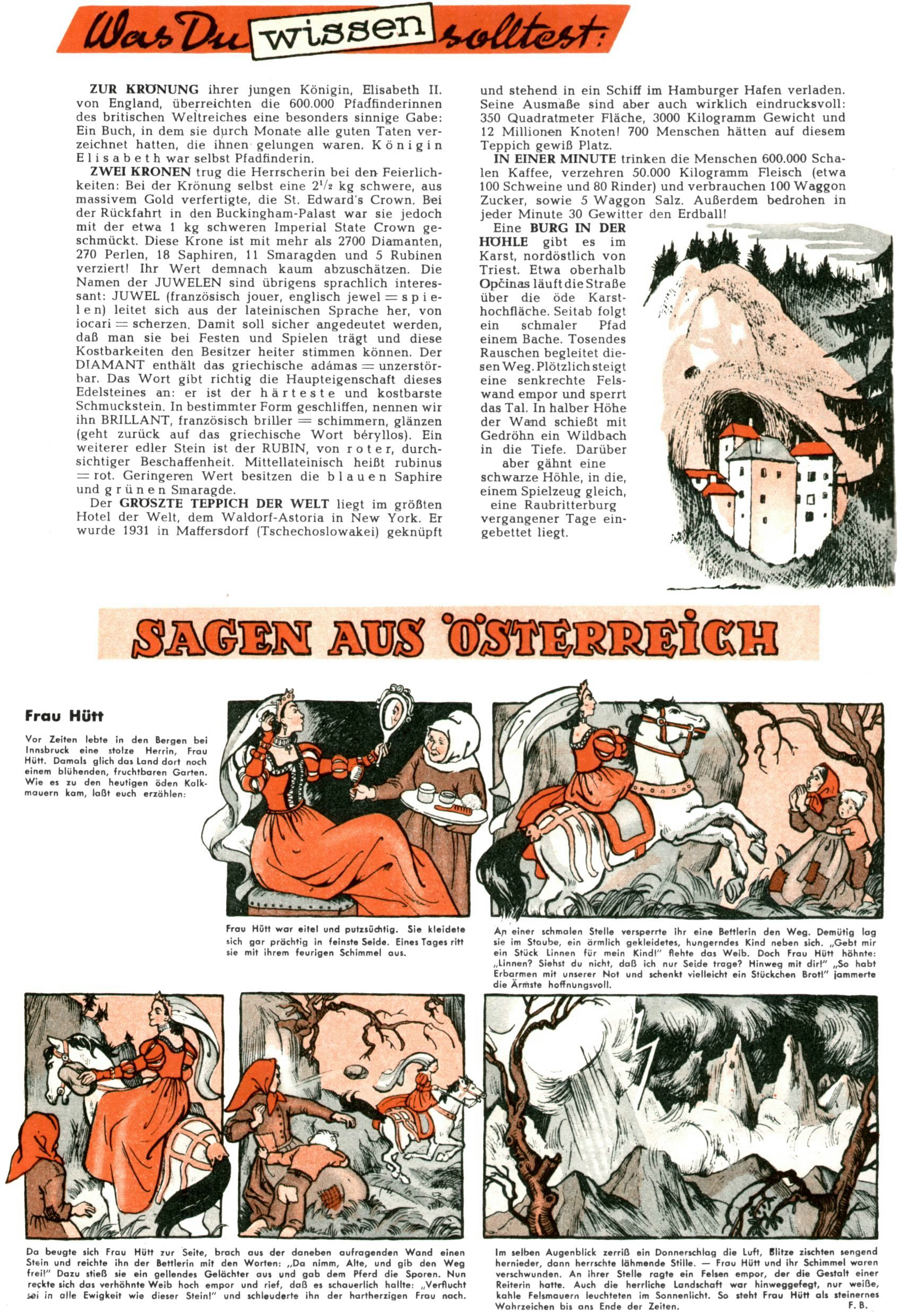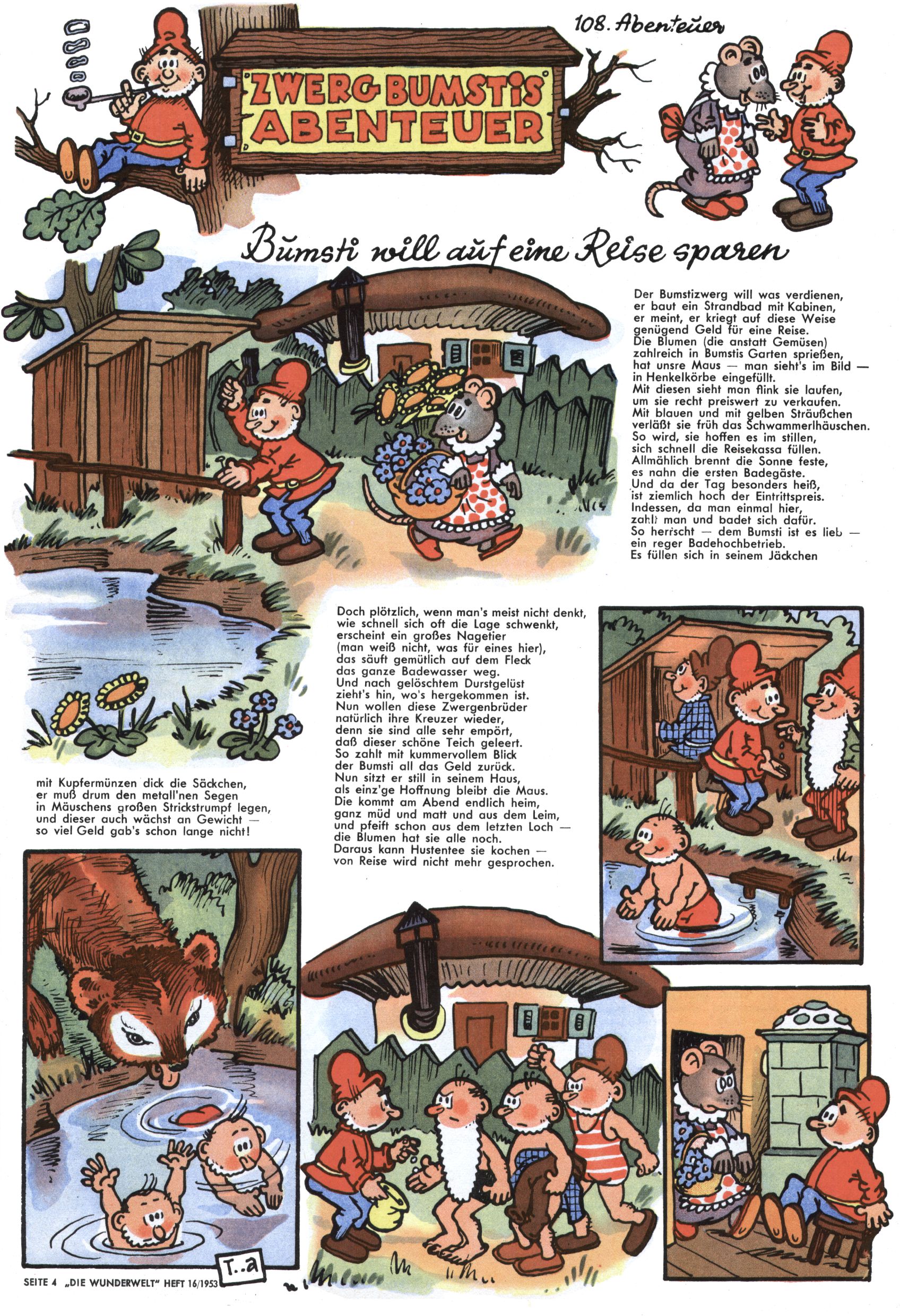 1953 – Alles beim Alten Wie lange darf man sich auf einem Erfolgskonzept ausruhen? Auch 1953 gab es keine offensichtlichen Änderungen am Layout der Zeitung. Zwar wurde Elfriede Vavrovsky teilweise durch andere Autoren abgelöst und erstmals kam Friedrich Bauer zum Zug, der bisher nur als Rätselonkel in Erscheinung getreten war. Allerdings ist anzunehmen, dass eine ganze Reihe unsignierter Erzählungen früherer Hefte ebenfalls der Feder von fb entstammen. ABC Peter Paul Prinz übernahm neuerlich die Illustration der technischen Seiten. Sein Willibald erschien ab sofort in 3 Spalten anstelle von 4 Zeilen, was ihm wesentlich mehr Gestaltungsfreiheit bot. Teja Aicher erfand die Clowns Benjamin und Kasimir nachdem ABC mit seiner Miniserie Zipferling, der lustige Kasperl bereits ein halbes Jahr zuvor durchaus mit Lachern punkten hatte können. Benjamin und Kasimir erschienen 1953 in jedem 2. Heft; nach dem Abdanken von Piff und Paff dann in jeder Ausgabe. Vom Aufbau her ähnelte die Serie dem Erfolgscartoon Willibald, der Zauberlehrling, ohne jedoch (aufgrund ihrer allzu "beschränkten" Möglichkeiten) an den Erfolg des Zauberlehrlings anknüpfen zu können. Nach dem Abschluss der Atlas-Daten und Karten erfand Annelies Umlauf Lamatsch weitere realitätsfremde Geschichten über die Natur und im Speziellen über Blumen. Eine medizinisch-biologische Spalte über den menschlichen Körper von Ewald Seifert war hingegen sachlicher und informativ. Ein kurzzeitiger Neuzugang bei den Grafikern war Hedwig Zumtobel. Sie wurde jedoch bald von Luzia Adelsberger abgelöst, die sich über Jahre hindurch als Zeichnerin etablierte. Friederike Nekut übernahm die Bastelseite für Mädchen. Die Kolumne Die Puppenschneiderin wurde mit Unser Hausmütterchen ergänzt, wodurch das handwerkliche Angebot für Mädchen erweitert werden konnte. Eine wesentliche Änderung am Titelblatt gab es 1953 aber doch: Endlich hatte man dem Erfolg von Zwerg Bumsti Rechnung getragen und ihn ins Logo erhoben. Er löste dort den Zwerg Bums aus dem Jahr 1948 in seiner Gondel ab, der zwar als Namenspatron für Zwerg Bumsti hergehalten hatte, mit dem es ansonsten aber keine Gemeinsamkeiten gab. |