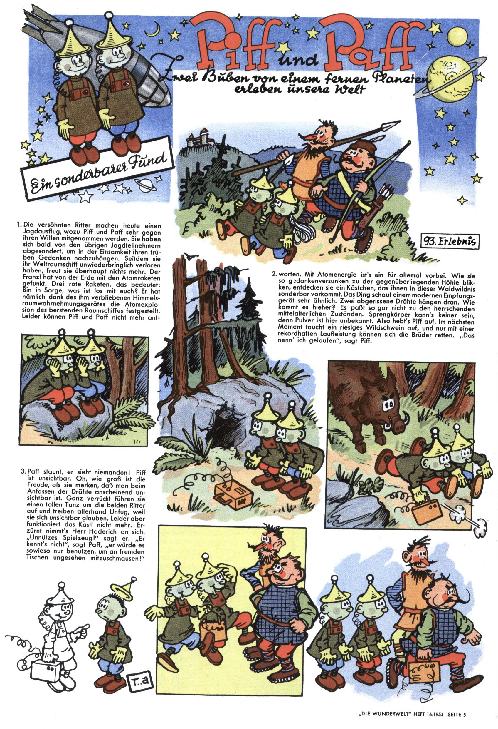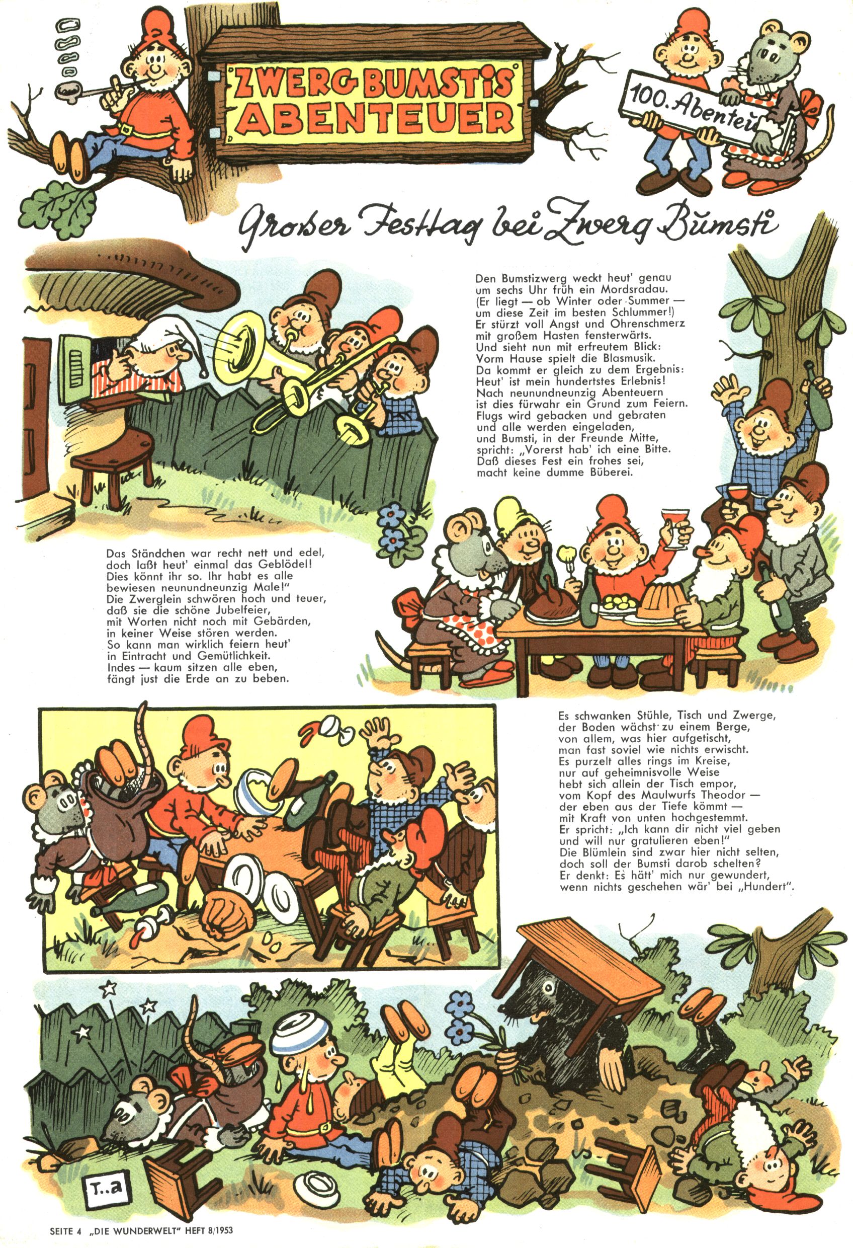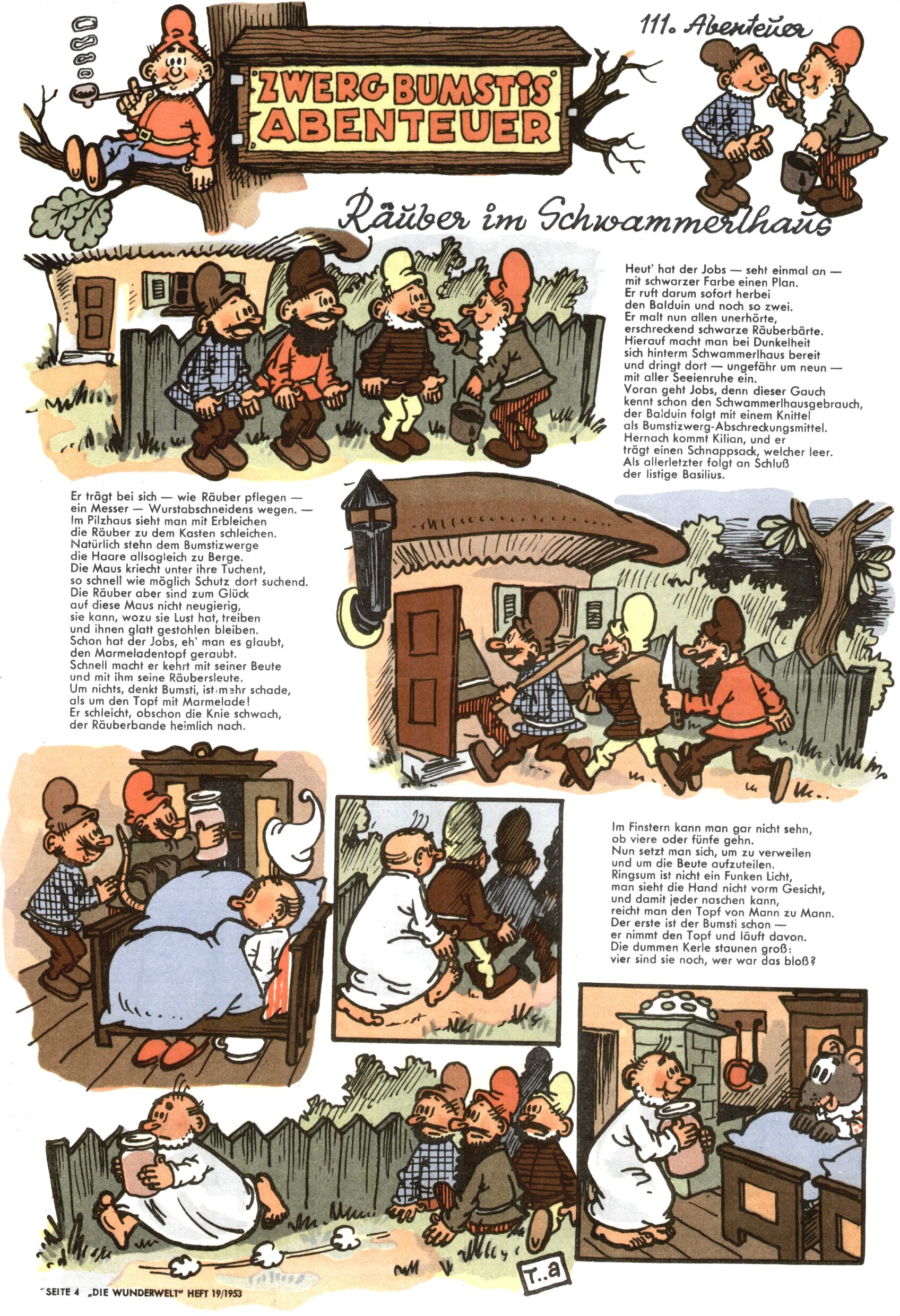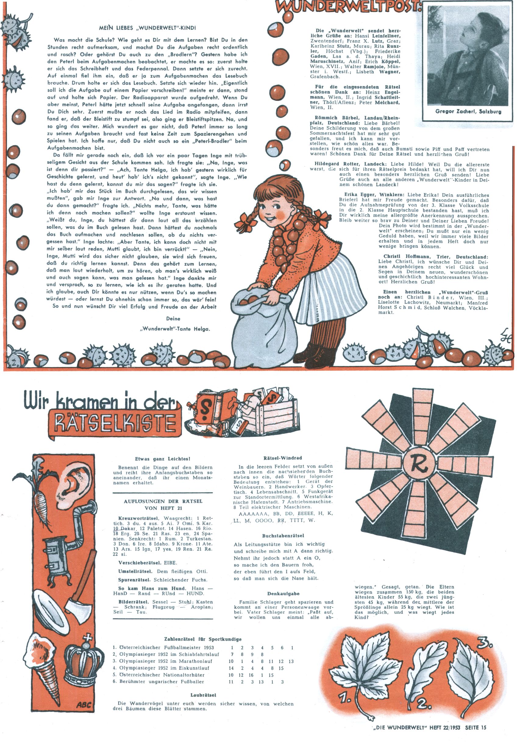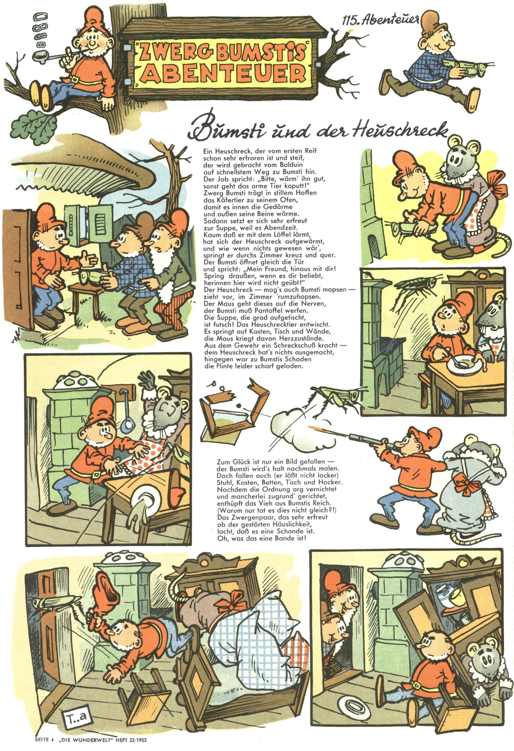 1953 – Alles beim Alten Wie lange darf man sich auf einem Erfolgskonzept ausruhen? Auch 1953 gab es keine offensichtlichen Änderungen am Layout der Zeitung. Zwar wurde Elfriede Vavrovsky teilweise durch andere Autoren abgelöst und erstmals kam Friedrich Bauer zum Zug, der bisher nur als Rätselonkel in Erscheinung getreten war. Allerdings ist anzunehmen, dass eine ganze Reihe unsignierter Erzählungen früherer Hefte ebenfalls der Feder von fb entstammen. ABC Peter Paul Prinz übernahm neuerlich die Illustration der technischen Seiten. Sein Willibald erschien ab sofort in 3 Spalten anstelle von 4 Zeilen, was ihm wesentlich mehr Gestaltungsfreiheit bot. Teja Aicher erfand die Clowns Benjamin und Kasimir nachdem ABC mit seiner Miniserie Zipferling, der lustige Kasperl bereits ein halbes Jahr zuvor durchaus mit Lachern punkten hatte können. Benjamin und Kasimir erschienen 1953 in jedem 2. Heft; nach dem Abdanken von Piff und Paff dann in jeder Ausgabe. Vom Aufbau her ähnelte die Serie dem Erfolgscartoon Willibald, der Zauberlehrling, ohne jedoch (aufgrund ihrer allzu "beschränkten" Möglichkeiten) an den Erfolg des Zauberlehrlings anknüpfen zu können. Nach dem Abschluss der Atlas-Daten und Karten erfand Annelies Umlauf Lamatsch weitere realitätsfremde Geschichten über die Natur und im Speziellen über Blumen. Eine medizinisch-biologische Spalte über den menschlichen Körper von Ewald Seifert war hingegen sachlicher und informativ. Ein kurzzeitiger Neuzugang bei den Grafikern war Hedwig Zumtobel. Sie wurde jedoch bald von Luzia Adelsberger abgelöst, die sich über Jahre hindurch als Zeichnerin etablierte. Friederike Nekut übernahm die Bastelseite für Mädchen. Die Kolumne Die Puppenschneiderin wurde mit Unser Hausmütterchen ergänzt, wodurch das handwerkliche Angebot für Mädchen erweitert werden konnte. Eine wesentliche Änderung am Titelblatt gab es 1953 aber doch: Endlich hatte man dem Erfolg von Zwerg Bumsti Rechnung getragen und ihn ins Logo erhoben. Er löste dort den Zwerg Bums aus dem Jahr 1948 in seiner Gondel ab, der zwar als Namenspatron für Zwerg Bumsti hergehalten hatte, mit dem es ansonsten aber keine Gemeinsamkeiten gab. |