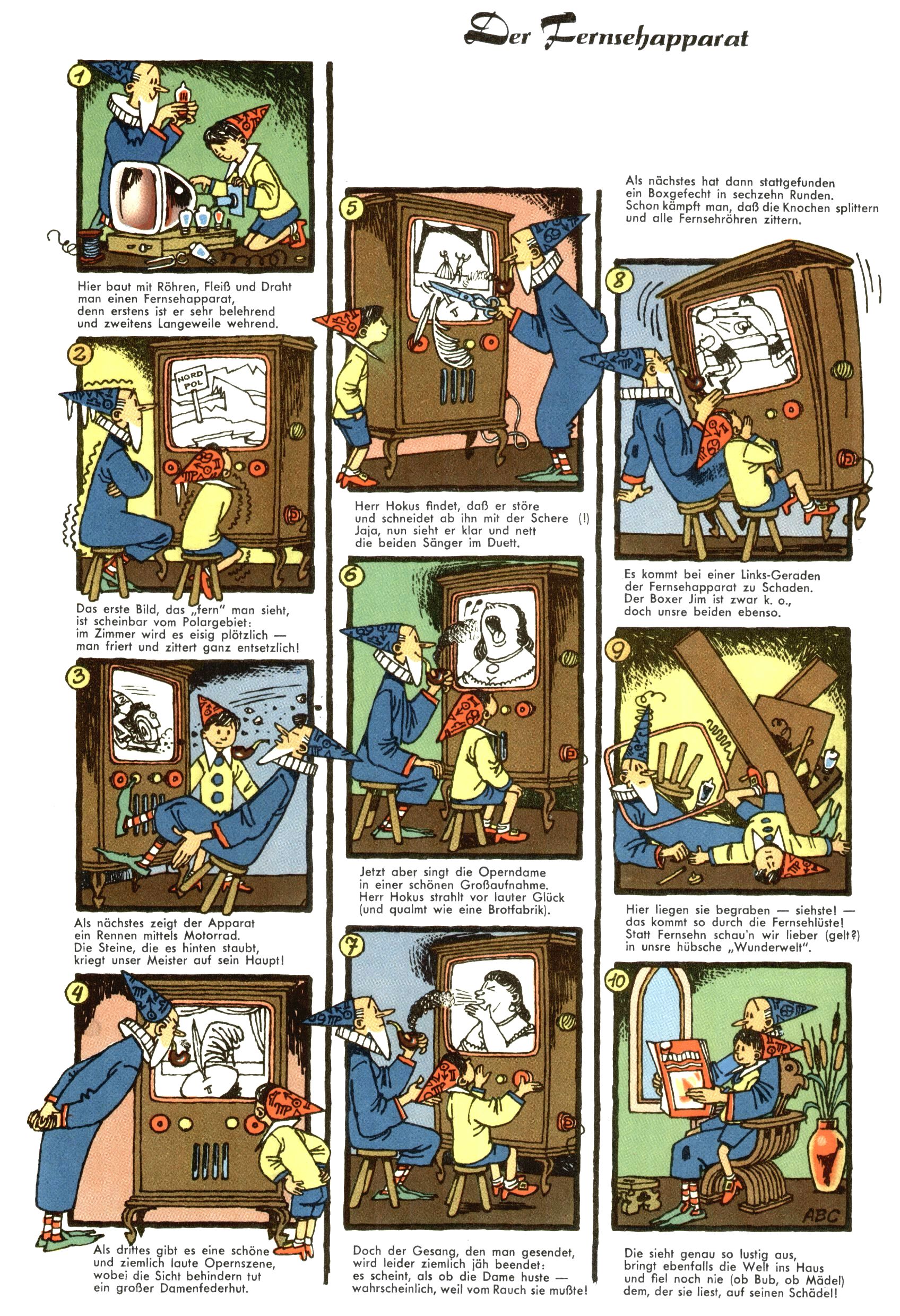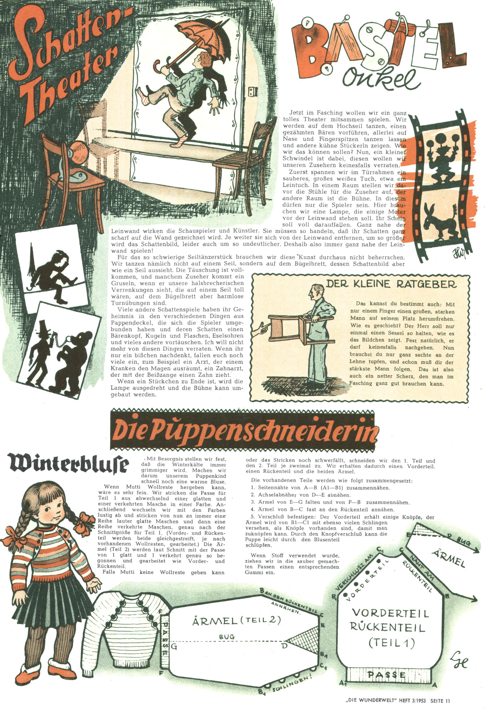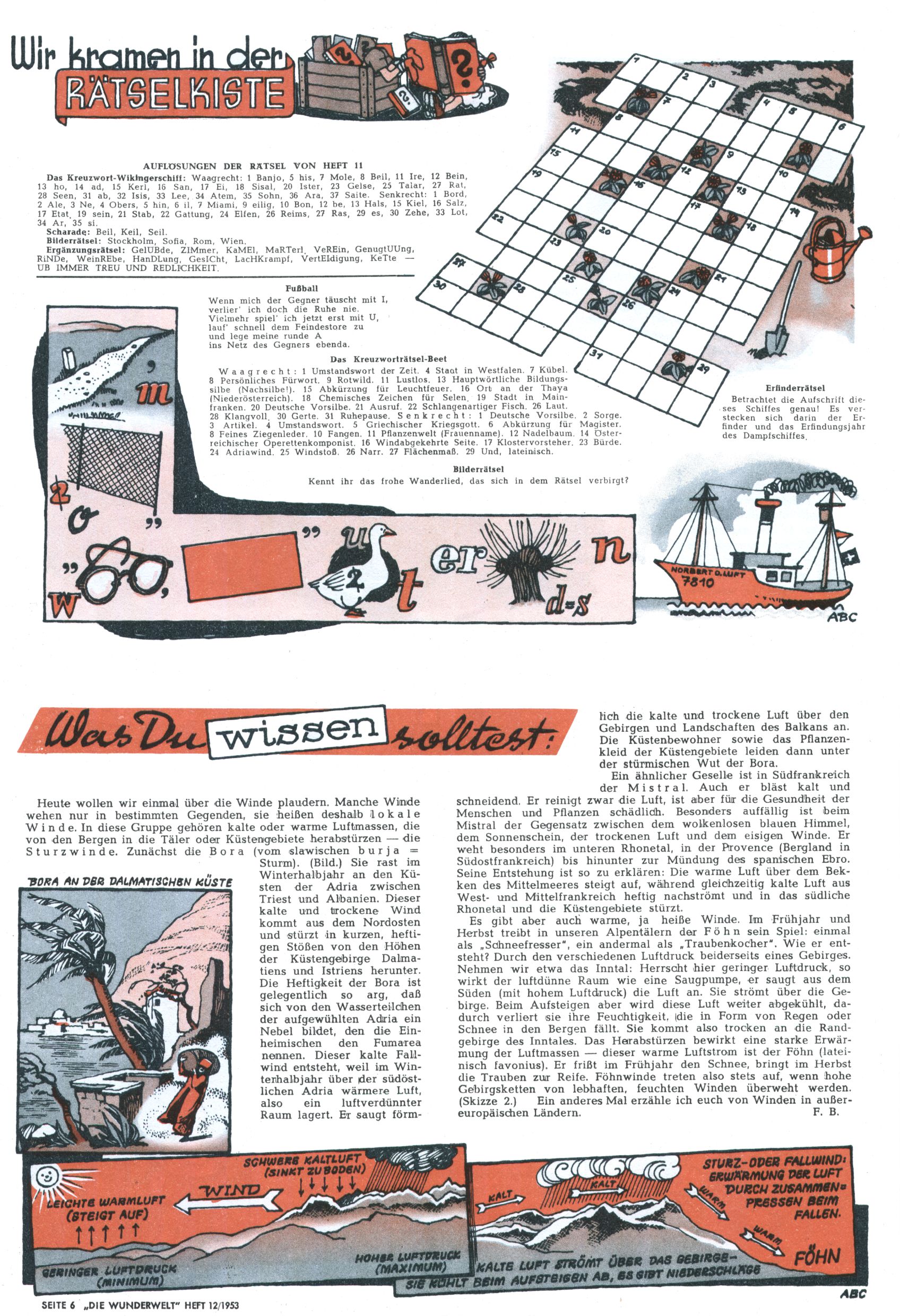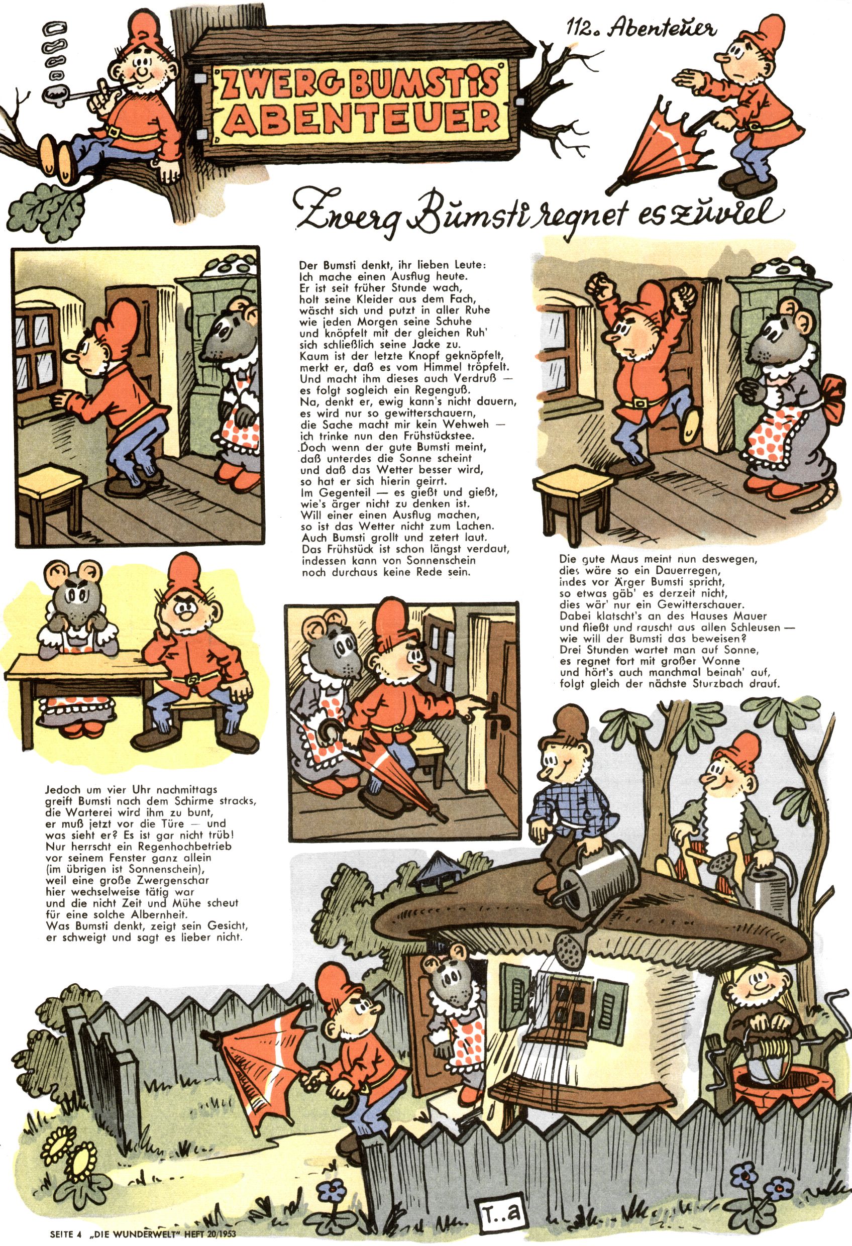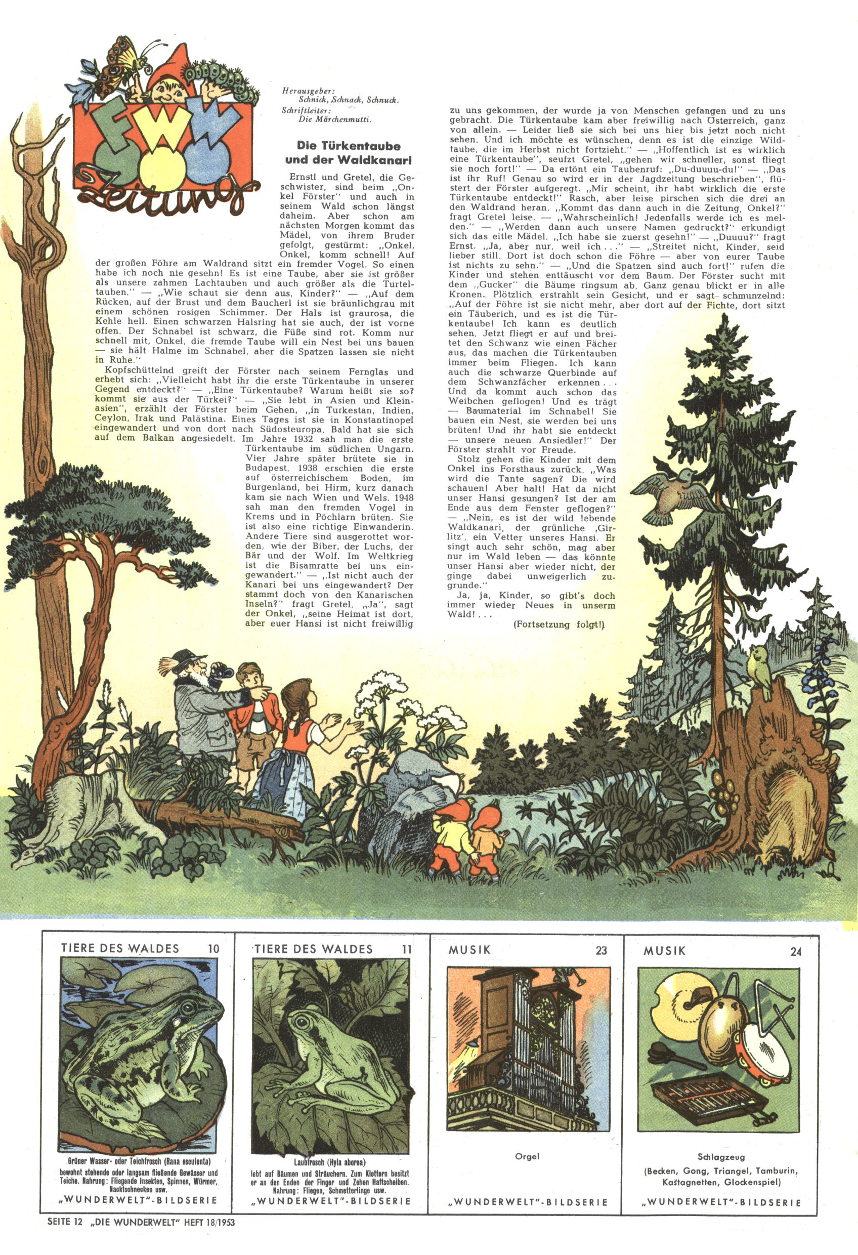 1953 – Alles beim Alten Wie lange darf man sich auf einem Erfolgskonzept ausruhen? Auch 1953 gab es keine offensichtlichen Änderungen am Layout der Zeitung. Zwar wurde Elfriede Vavrovsky teilweise durch andere Autoren abgelöst und erstmals kam Friedrich Bauer zum Zug, der bisher nur als Rätselonkel in Erscheinung getreten war. Allerdings ist anzunehmen, dass eine ganze Reihe unsignierter Erzählungen früherer Hefte ebenfalls der Feder von fb entstammen. ABC Peter Paul Prinz übernahm neuerlich die Illustration der technischen Seiten. Sein Willibald erschien ab sofort in 3 Spalten anstelle von 4 Zeilen, was ihm wesentlich mehr Gestaltungsfreiheit bot. Teja Aicher erfand die Clowns Benjamin und Kasimir nachdem ABC mit seiner Miniserie Zipferling, der lustige Kasperl bereits ein halbes Jahr zuvor durchaus mit Lachern punkten hatte können. Benjamin und Kasimir erschienen 1953 in jedem 2. Heft; nach dem Abdanken von Piff und Paff dann in jeder Ausgabe. Vom Aufbau her ähnelte die Serie dem Erfolgscartoon Willibald, der Zauberlehrling, ohne jedoch (aufgrund ihrer allzu "beschränkten" Möglichkeiten) an den Erfolg des Zauberlehrlings anknüpfen zu können. Nach dem Abschluss der Atlas-Daten und Karten erfand Annelies Umlauf Lamatsch weitere realitätsfremde Geschichten über die Natur und im Speziellen über Blumen. Eine medizinisch-biologische Spalte über den menschlichen Körper von Ewald Seifert war hingegen sachlicher und informativ. Ein kurzzeitiger Neuzugang bei den Grafikern war Hedwig Zumtobel. Sie wurde jedoch bald von Luzia Adelsberger abgelöst, die sich über Jahre hindurch als Zeichnerin etablierte. Friederike Nekut übernahm die Bastelseite für Mädchen. Die Kolumne Die Puppenschneiderin wurde mit Unser Hausmütterchen ergänzt, wodurch das handwerkliche Angebot für Mädchen erweitert werden konnte. Eine wesentliche Änderung am Titelblatt gab es 1953 aber doch: Endlich hatte man dem Erfolg von Zwerg Bumsti Rechnung getragen und ihn ins Logo erhoben. Er löste dort den Zwerg Bums aus dem Jahr 1948 in seiner Gondel ab, der zwar als Namenspatron für Zwerg Bumsti hergehalten hatte, mit dem es ansonsten aber keine Gemeinsamkeiten gab. |