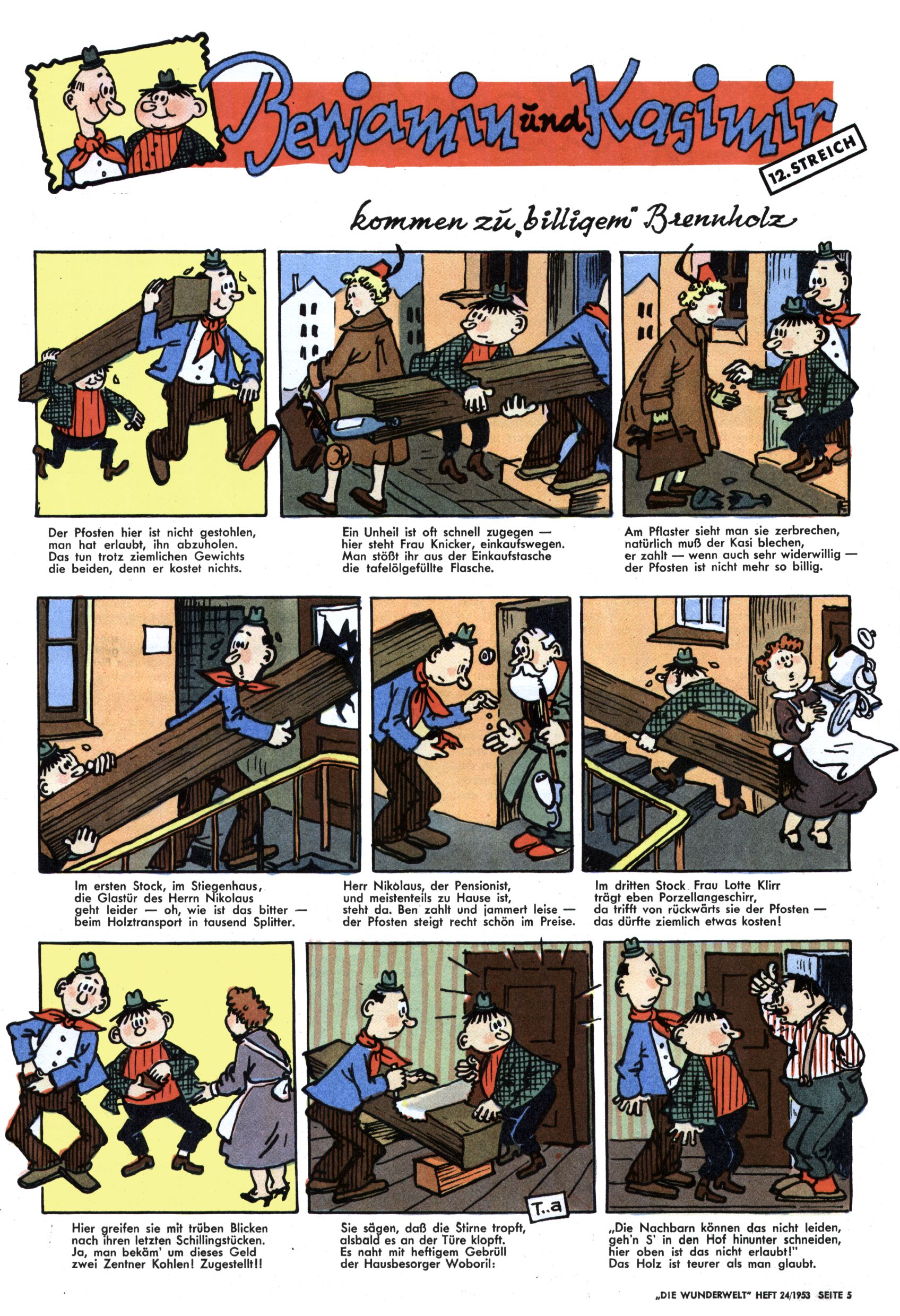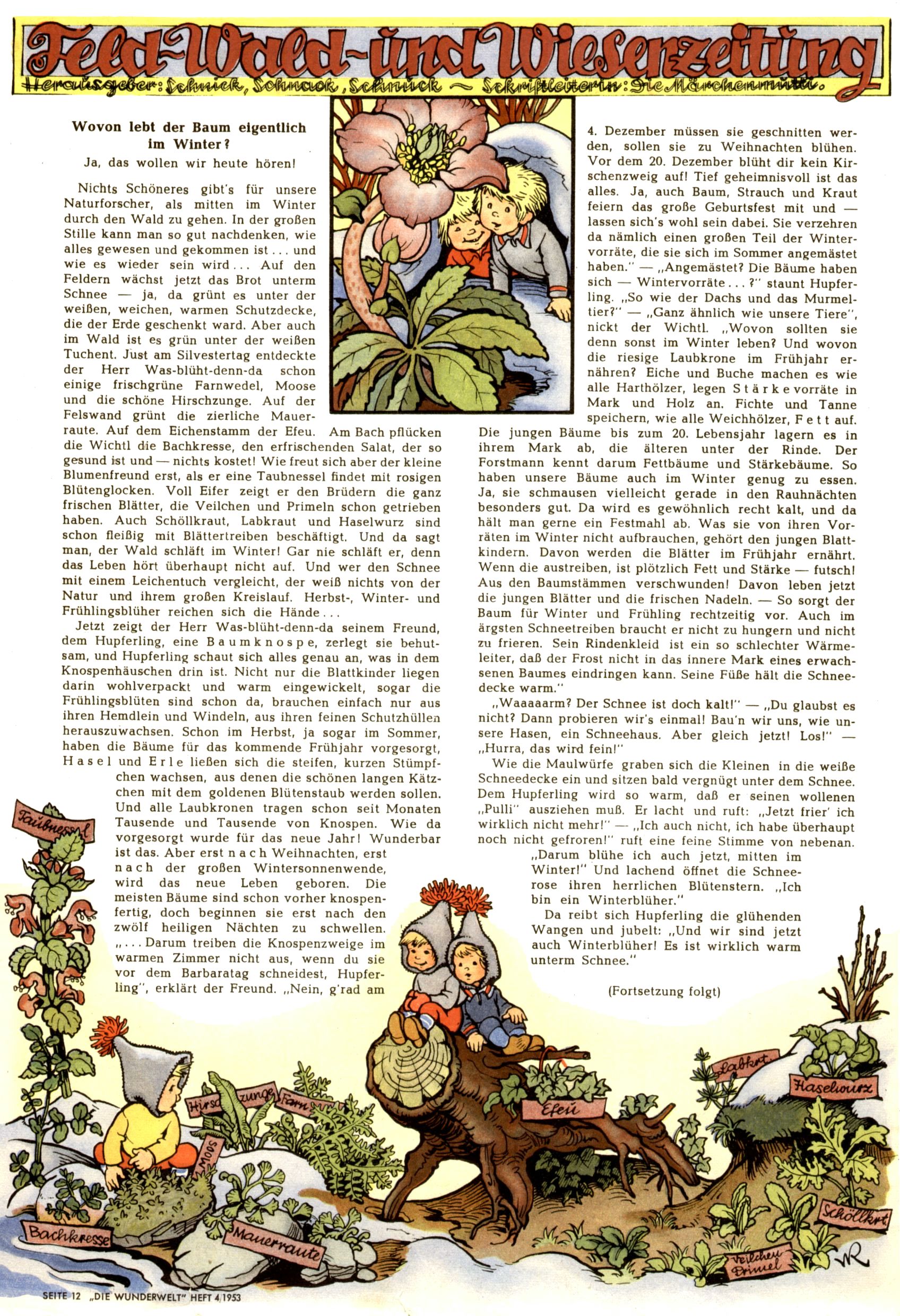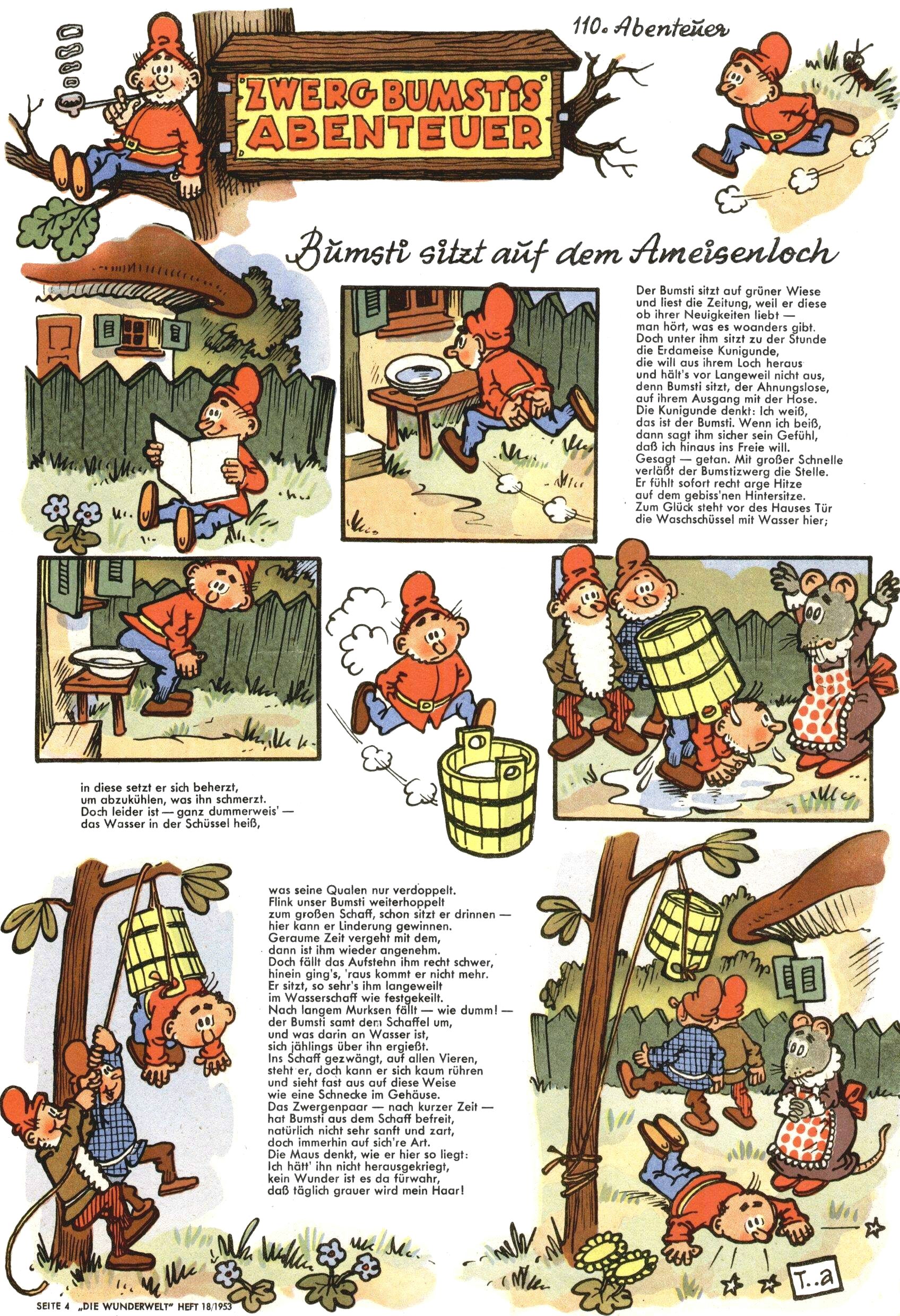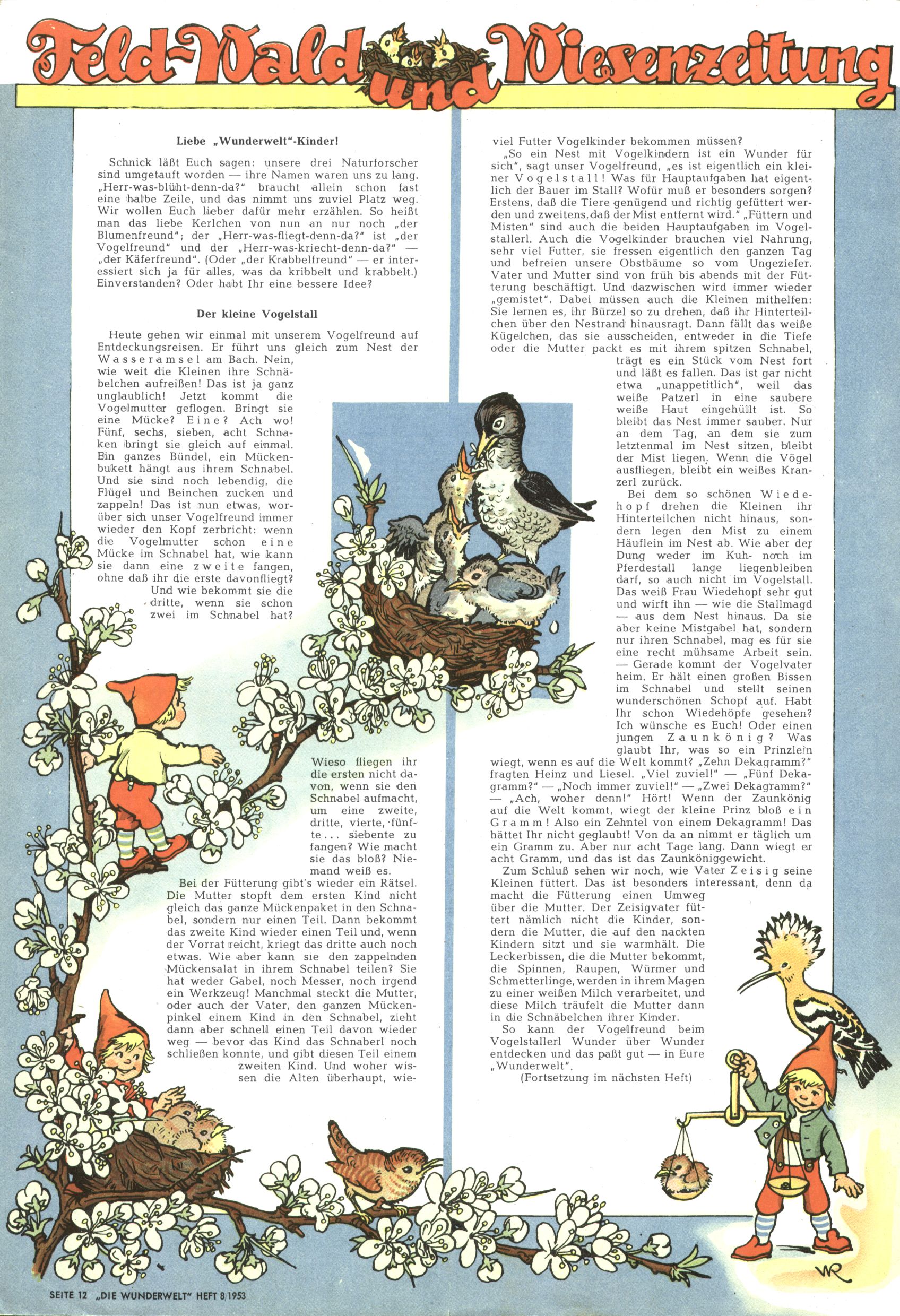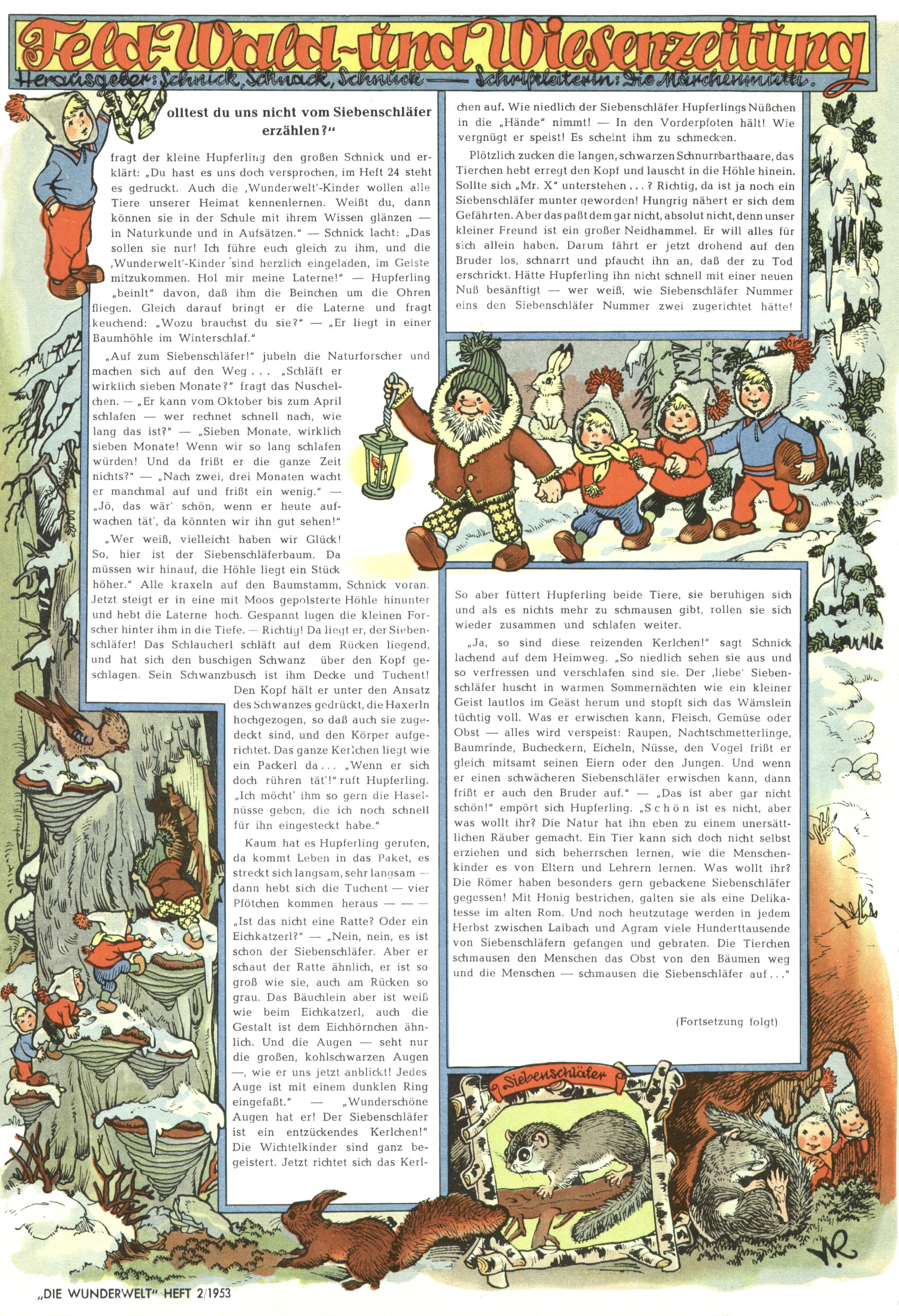 1953 – Alles beim Alten Wie lange darf man sich auf einem Erfolgskonzept ausruhen? Auch 1953 gab es keine offensichtlichen Änderungen am Layout der Zeitung. Zwar wurde Elfriede Vavrovsky teilweise durch andere Autoren abgelöst und erstmals kam Friedrich Bauer zum Zug, der bisher nur als Rätselonkel in Erscheinung getreten war. Allerdings ist anzunehmen, dass eine ganze Reihe unsignierter Erzählungen früherer Hefte ebenfalls der Feder von fb entstammen. ABC Peter Paul Prinz übernahm neuerlich die Illustration der technischen Seiten. Sein Willibald erschien ab sofort in 3 Spalten anstelle von 4 Zeilen, was ihm wesentlich mehr Gestaltungsfreiheit bot. Teja Aicher erfand die Clowns Benjamin und Kasimir nachdem ABC mit seiner Miniserie Zipferling, der lustige Kasperl bereits ein halbes Jahr zuvor durchaus mit Lachern punkten hatte können. Benjamin und Kasimir erschienen 1953 in jedem 2. Heft; nach dem Abdanken von Piff und Paff dann in jeder Ausgabe. Vom Aufbau her ähnelte die Serie dem Erfolgscartoon Willibald, der Zauberlehrling, ohne jedoch (aufgrund ihrer allzu "beschränkten" Möglichkeiten) an den Erfolg des Zauberlehrlings anknüpfen zu können. Nach dem Abschluss der Atlas-Daten und Karten erfand Annelies Umlauf Lamatsch weitere realitätsfremde Geschichten über die Natur und im Speziellen über Blumen. Eine medizinisch-biologische Spalte über den menschlichen Körper von Ewald Seifert war hingegen sachlicher und informativ. Ein kurzzeitiger Neuzugang bei den Grafikern war Hedwig Zumtobel. Sie wurde jedoch bald von Luzia Adelsberger abgelöst, die sich über Jahre hindurch als Zeichnerin etablierte. Friederike Nekut übernahm die Bastelseite für Mädchen. Die Kolumne Die Puppenschneiderin wurde mit Unser Hausmütterchen ergänzt, wodurch das handwerkliche Angebot für Mädchen erweitert werden konnte. Eine wesentliche Änderung am Titelblatt gab es 1953 aber doch: Endlich hatte man dem Erfolg von Zwerg Bumsti Rechnung getragen und ihn ins Logo erhoben. Er löste dort den Zwerg Bums aus dem Jahr 1948 in seiner Gondel ab, der zwar als Namenspatron für Zwerg Bumsti hergehalten hatte, mit dem es ansonsten aber keine Gemeinsamkeiten gab. |