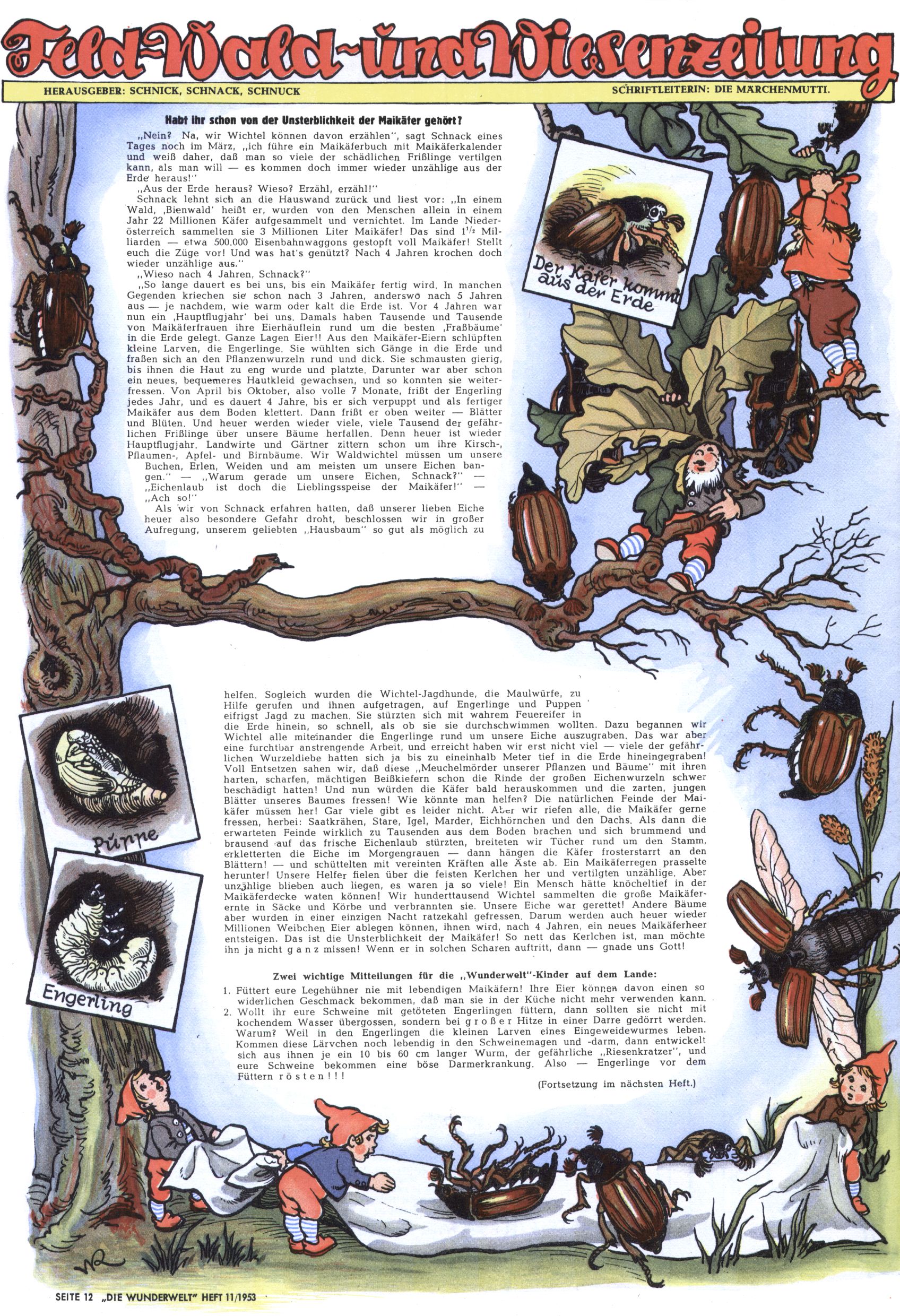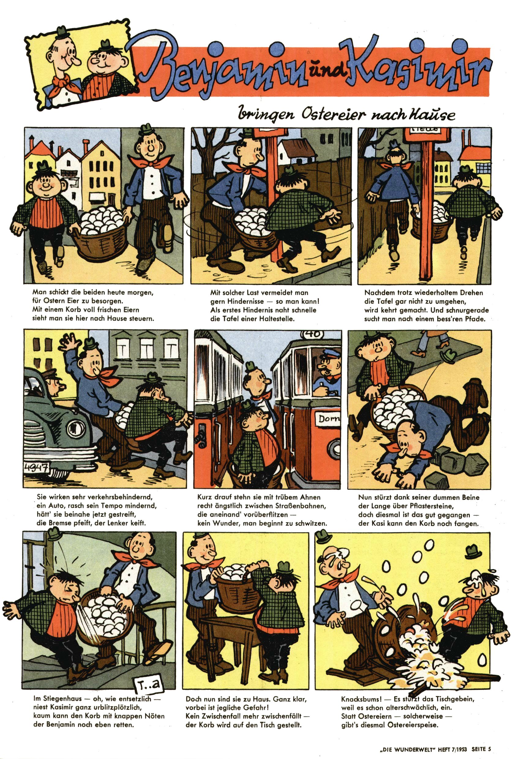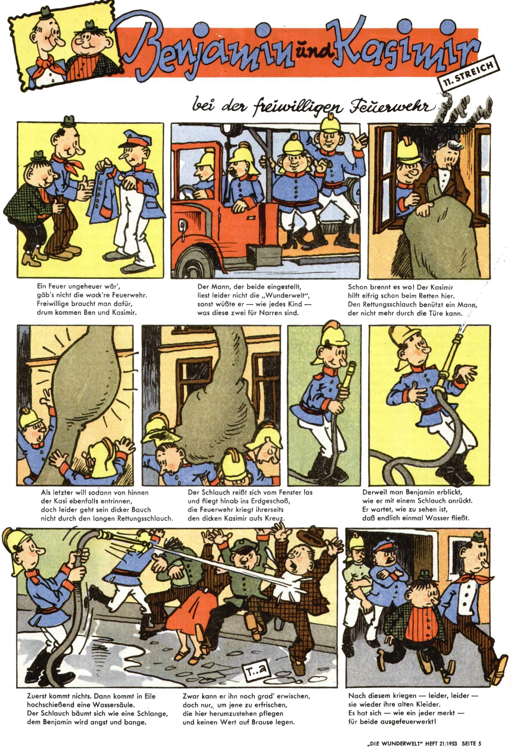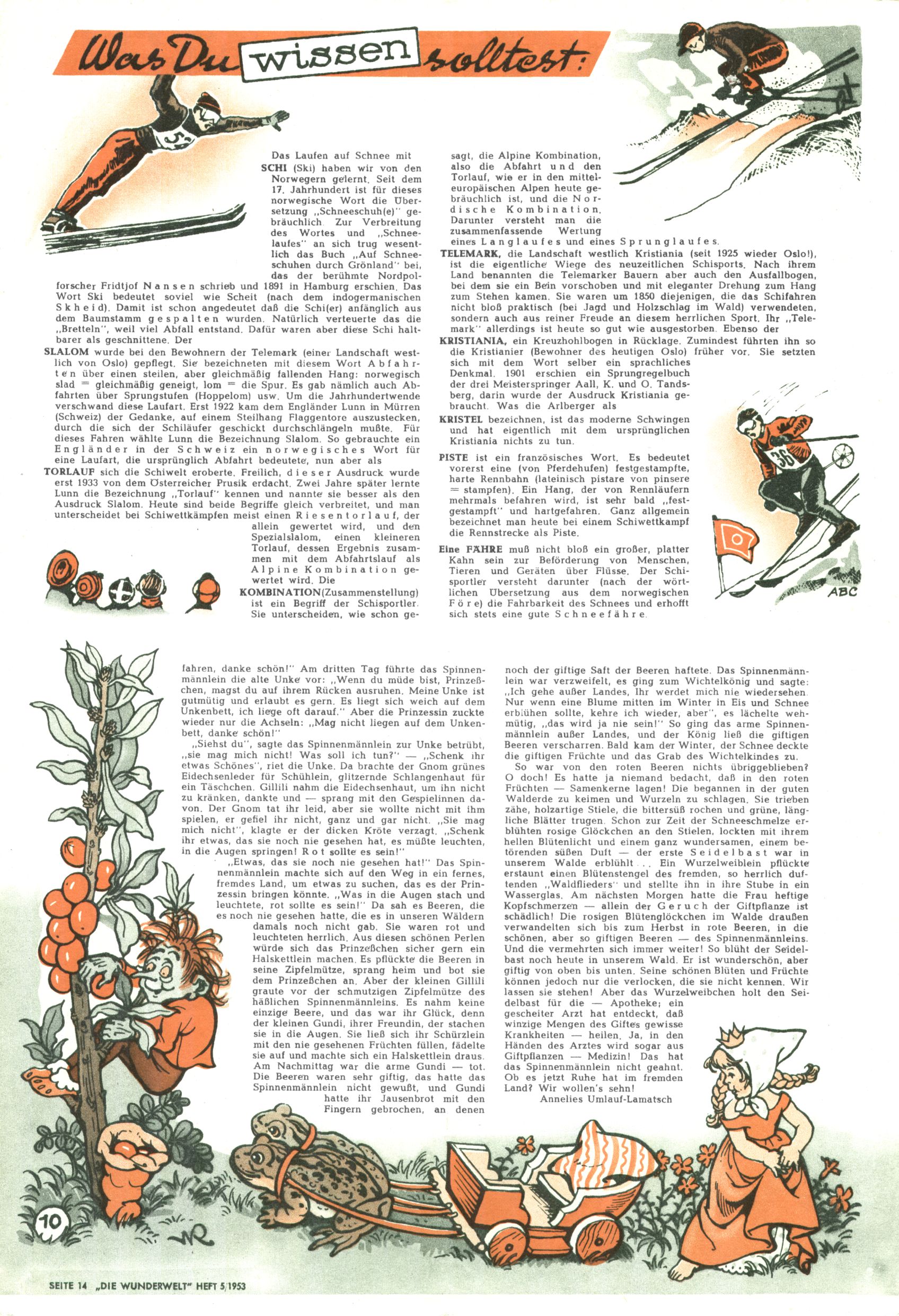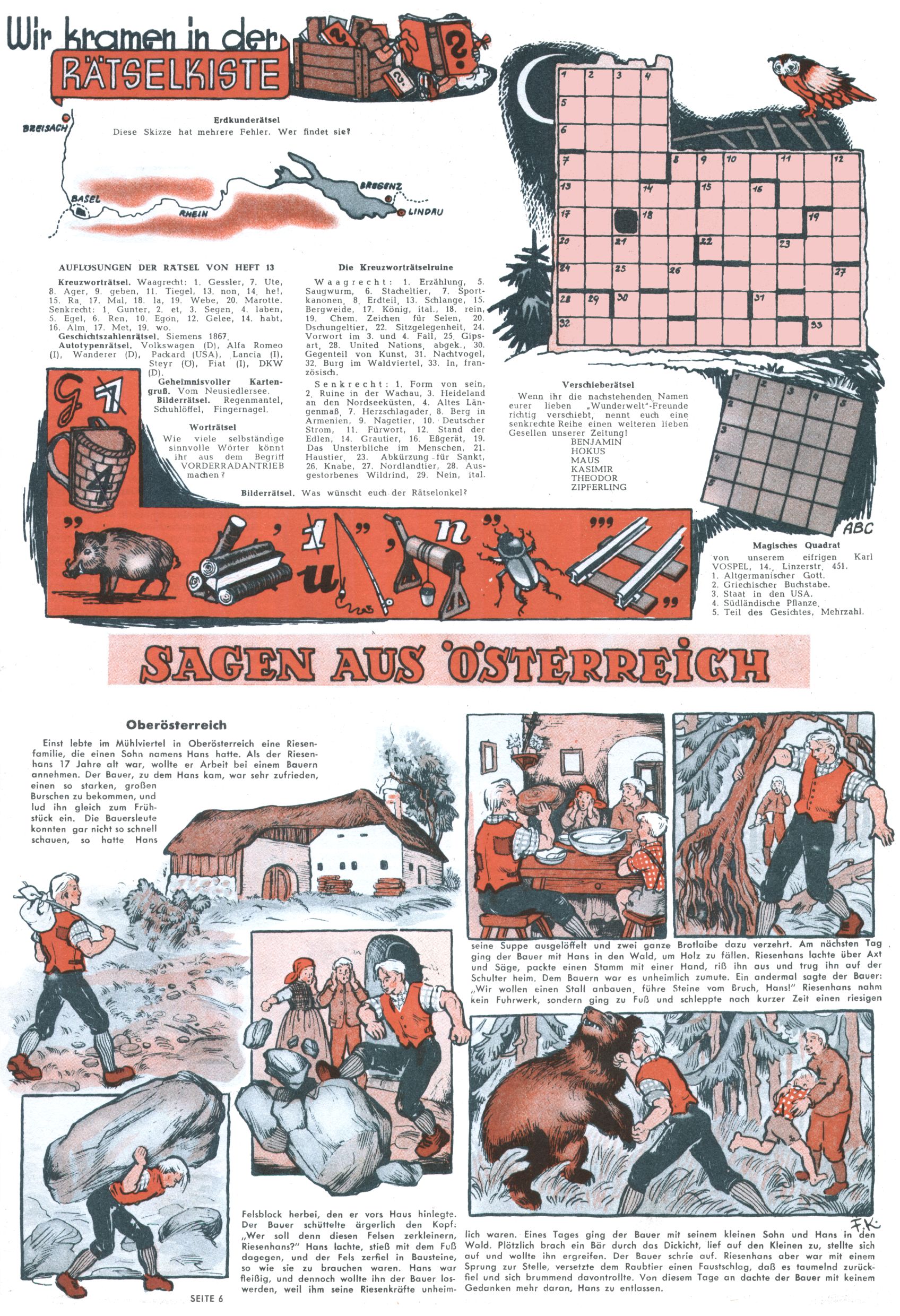 1953 – Alles beim Alten Wie lange darf man sich auf einem Erfolgskonzept ausruhen? Auch 1953 gab es keine offensichtlichen Änderungen am Layout der Zeitung. Zwar wurde Elfriede Vavrovsky teilweise durch andere Autoren abgelöst und erstmals kam Friedrich Bauer zum Zug, der bisher nur als Rätselonkel in Erscheinung getreten war. Allerdings ist anzunehmen, dass eine ganze Reihe unsignierter Erzählungen früherer Hefte ebenfalls der Feder von fb entstammen. ABC Peter Paul Prinz übernahm neuerlich die Illustration der technischen Seiten. Sein Willibald erschien ab sofort in 3 Spalten anstelle von 4 Zeilen, was ihm wesentlich mehr Gestaltungsfreiheit bot. Teja Aicher erfand die Clowns Benjamin und Kasimir nachdem ABC mit seiner Miniserie Zipferling, der lustige Kasperl bereits ein halbes Jahr zuvor durchaus mit Lachern punkten hatte können. Benjamin und Kasimir erschienen 1953 in jedem 2. Heft; nach dem Abdanken von Piff und Paff dann in jeder Ausgabe. Vom Aufbau her ähnelte die Serie dem Erfolgscartoon Willibald, der Zauberlehrling, ohne jedoch (aufgrund ihrer allzu "beschränkten" Möglichkeiten) an den Erfolg des Zauberlehrlings anknüpfen zu können. Nach dem Abschluss der Atlas-Daten und Karten erfand Annelies Umlauf Lamatsch weitere realitätsfremde Geschichten über die Natur und im Speziellen über Blumen. Eine medizinisch-biologische Spalte über den menschlichen Körper von Ewald Seifert war hingegen sachlicher und informativ. Ein kurzzeitiger Neuzugang bei den Grafikern war Hedwig Zumtobel. Sie wurde jedoch bald von Luzia Adelsberger abgelöst, die sich über Jahre hindurch als Zeichnerin etablierte. Friederike Nekut übernahm die Bastelseite für Mädchen. Die Kolumne Die Puppenschneiderin wurde mit Unser Hausmütterchen ergänzt, wodurch das handwerkliche Angebot für Mädchen erweitert werden konnte. Eine wesentliche Änderung am Titelblatt gab es 1953 aber doch: Endlich hatte man dem Erfolg von Zwerg Bumsti Rechnung getragen und ihn ins Logo erhoben. Er löste dort den Zwerg Bums aus dem Jahr 1948 in seiner Gondel ab, der zwar als Namenspatron für Zwerg Bumsti hergehalten hatte, mit dem es ansonsten aber keine Gemeinsamkeiten gab. |