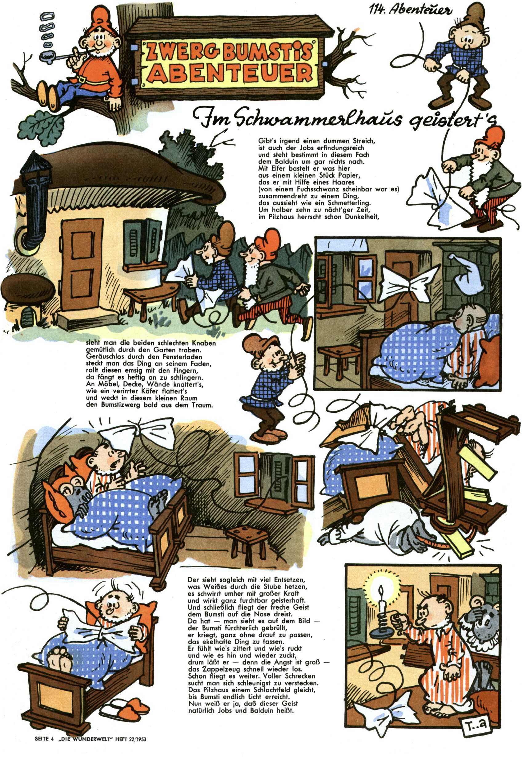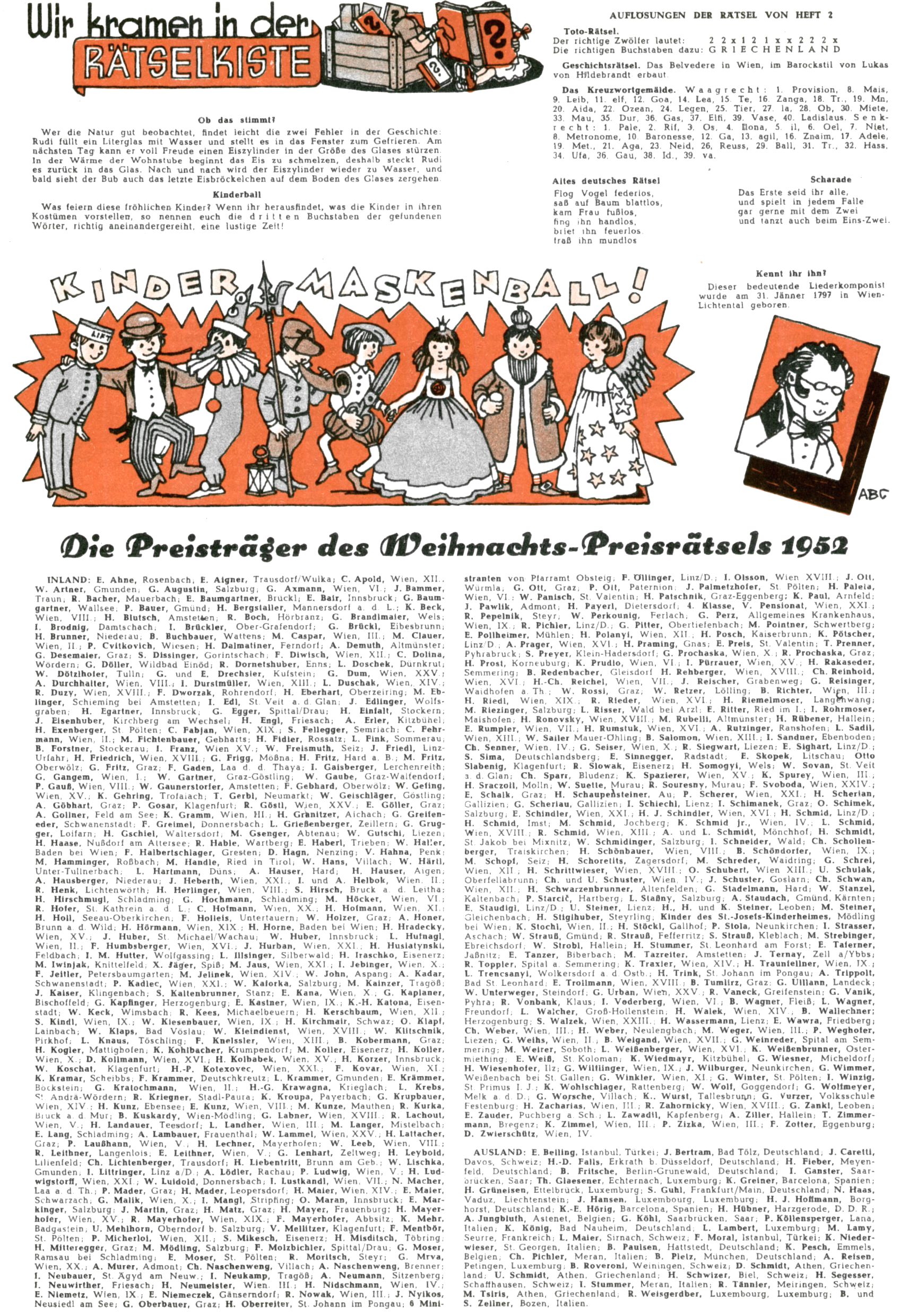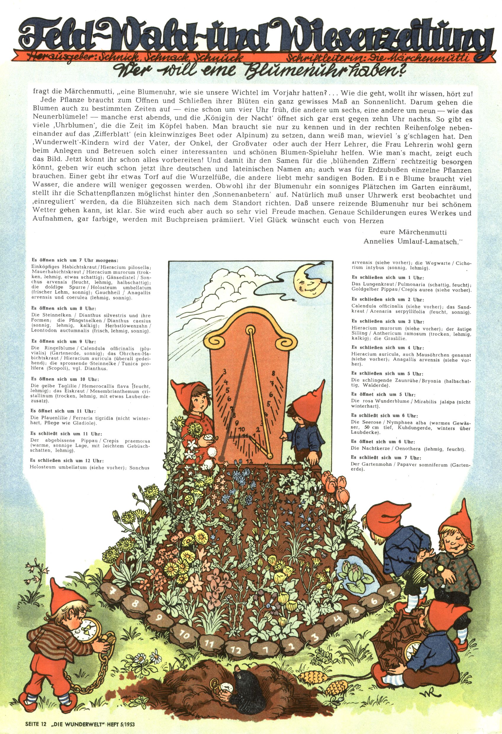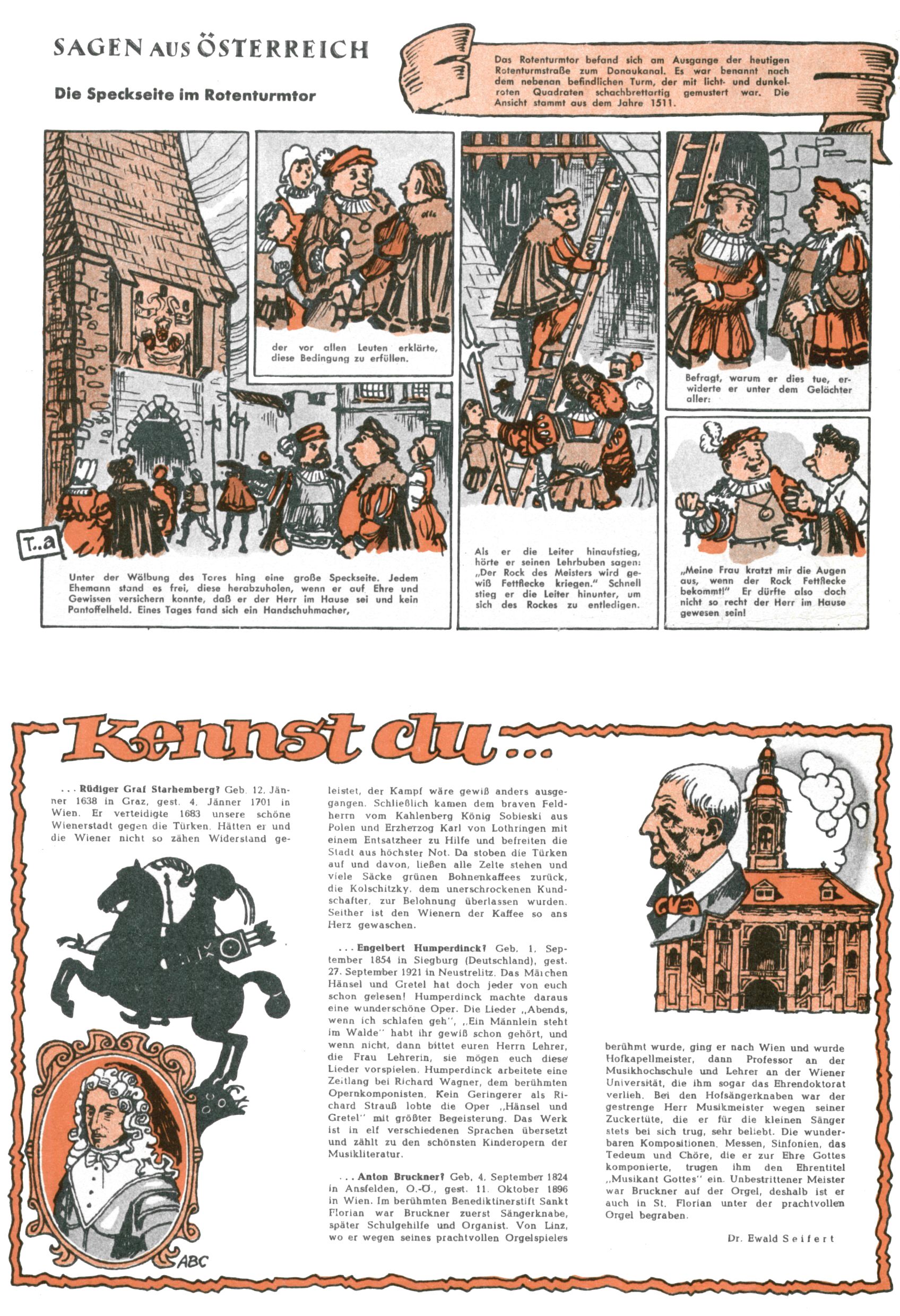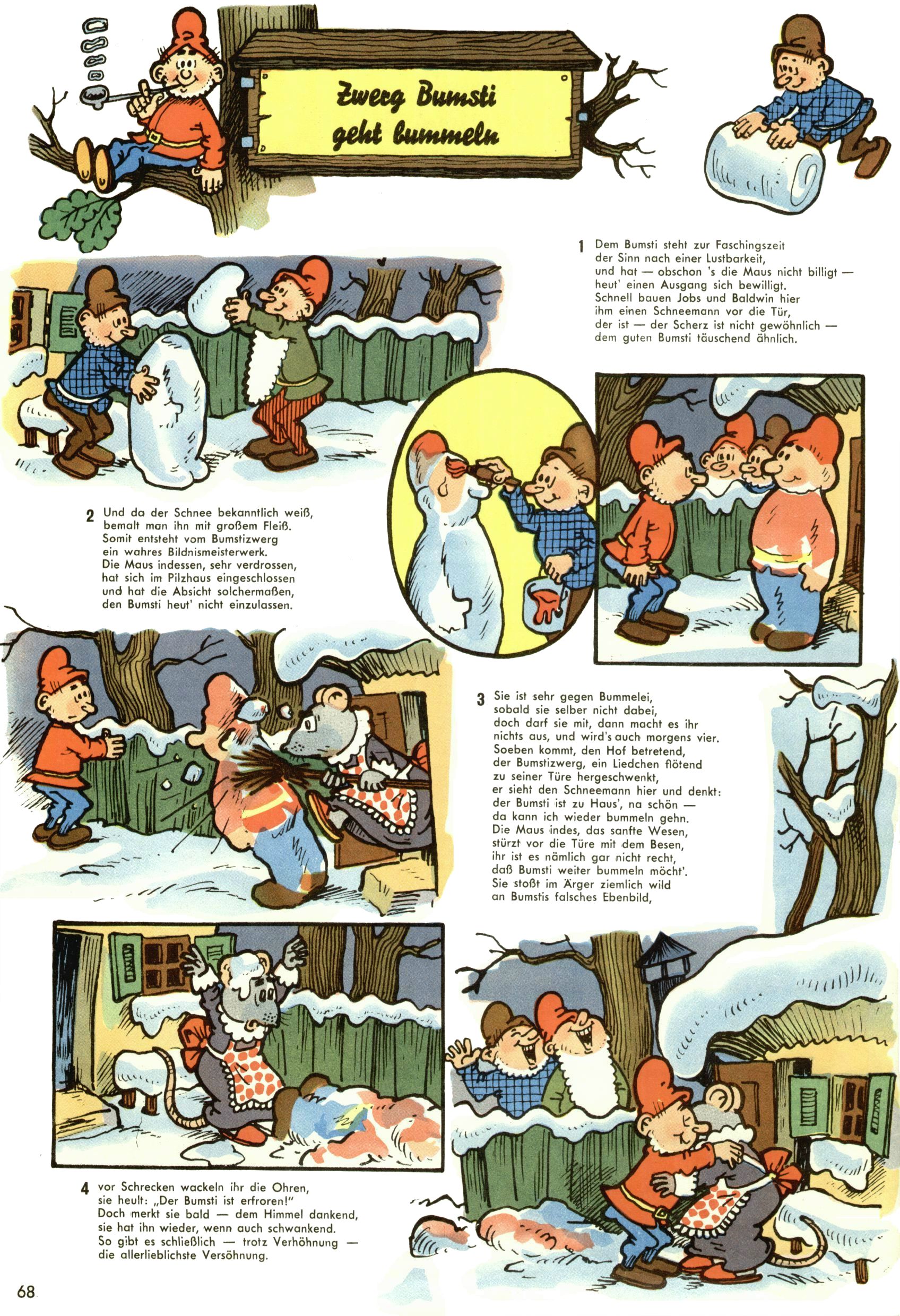 1953 – Alles beim Alten Wie lange darf man sich auf einem Erfolgskonzept ausruhen? Auch 1953 gab es keine offensichtlichen Änderungen am Layout der Zeitung. Zwar wurde Elfriede Vavrovsky teilweise durch andere Autoren abgelöst und erstmals kam Friedrich Bauer zum Zug, der bisher nur als Rätselonkel in Erscheinung getreten war. Allerdings ist anzunehmen, dass eine ganze Reihe unsignierter Erzählungen früherer Hefte ebenfalls der Feder von fb entstammen. ABC Peter Paul Prinz übernahm neuerlich die Illustration der technischen Seiten. Sein Willibald erschien ab sofort in 3 Spalten anstelle von 4 Zeilen, was ihm wesentlich mehr Gestaltungsfreiheit bot. Teja Aicher erfand die Clowns Benjamin und Kasimir nachdem ABC mit seiner Miniserie Zipferling, der lustige Kasperl bereits ein halbes Jahr zuvor durchaus mit Lachern punkten hatte können. Benjamin und Kasimir erschienen 1953 in jedem 2. Heft; nach dem Abdanken von Piff und Paff dann in jeder Ausgabe. Vom Aufbau her ähnelte die Serie dem Erfolgscartoon Willibald, der Zauberlehrling, ohne jedoch (aufgrund ihrer allzu "beschränkten" Möglichkeiten) an den Erfolg des Zauberlehrlings anknüpfen zu können. Nach dem Abschluss der Atlas-Daten und Karten erfand Annelies Umlauf Lamatsch weitere realitätsfremde Geschichten über die Natur und im Speziellen über Blumen. Eine medizinisch-biologische Spalte über den menschlichen Körper von Ewald Seifert war hingegen sachlicher und informativ. Ein kurzzeitiger Neuzugang bei den Grafikern war Hedwig Zumtobel. Sie wurde jedoch bald von Luzia Adelsberger abgelöst, die sich über Jahre hindurch als Zeichnerin etablierte. Friederike Nekut übernahm die Bastelseite für Mädchen. Die Kolumne Die Puppenschneiderin wurde mit Unser Hausmütterchen ergänzt, wodurch das handwerkliche Angebot für Mädchen erweitert werden konnte. Eine wesentliche Änderung am Titelblatt gab es 1953 aber doch: Endlich hatte man dem Erfolg von Zwerg Bumsti Rechnung getragen und ihn ins Logo erhoben. Er löste dort den Zwerg Bums aus dem Jahr 1948 in seiner Gondel ab, der zwar als Namenspatron für Zwerg Bumsti hergehalten hatte, mit dem es ansonsten aber keine Gemeinsamkeiten gab. |