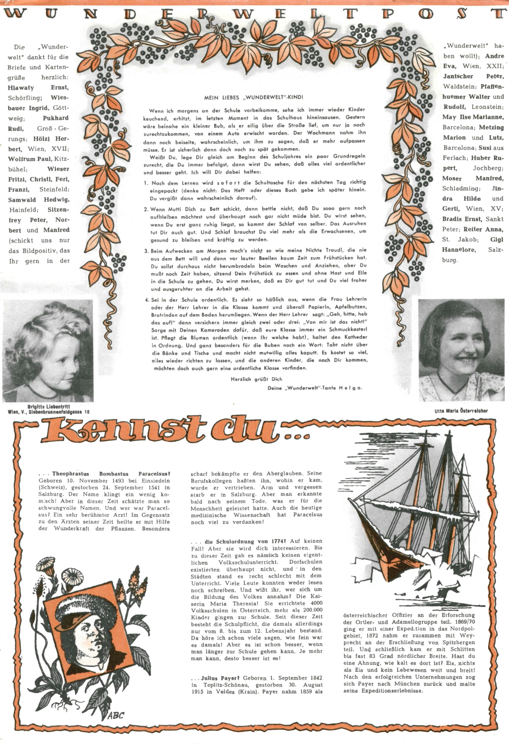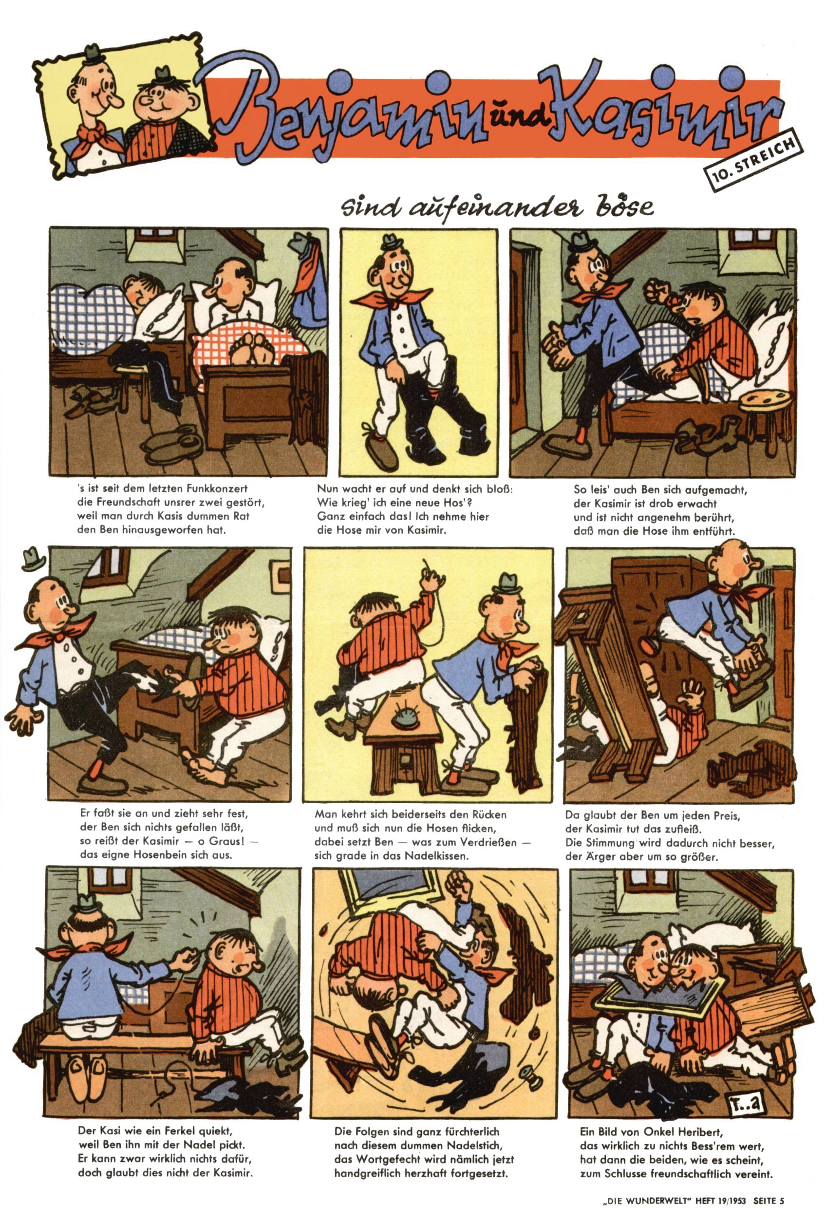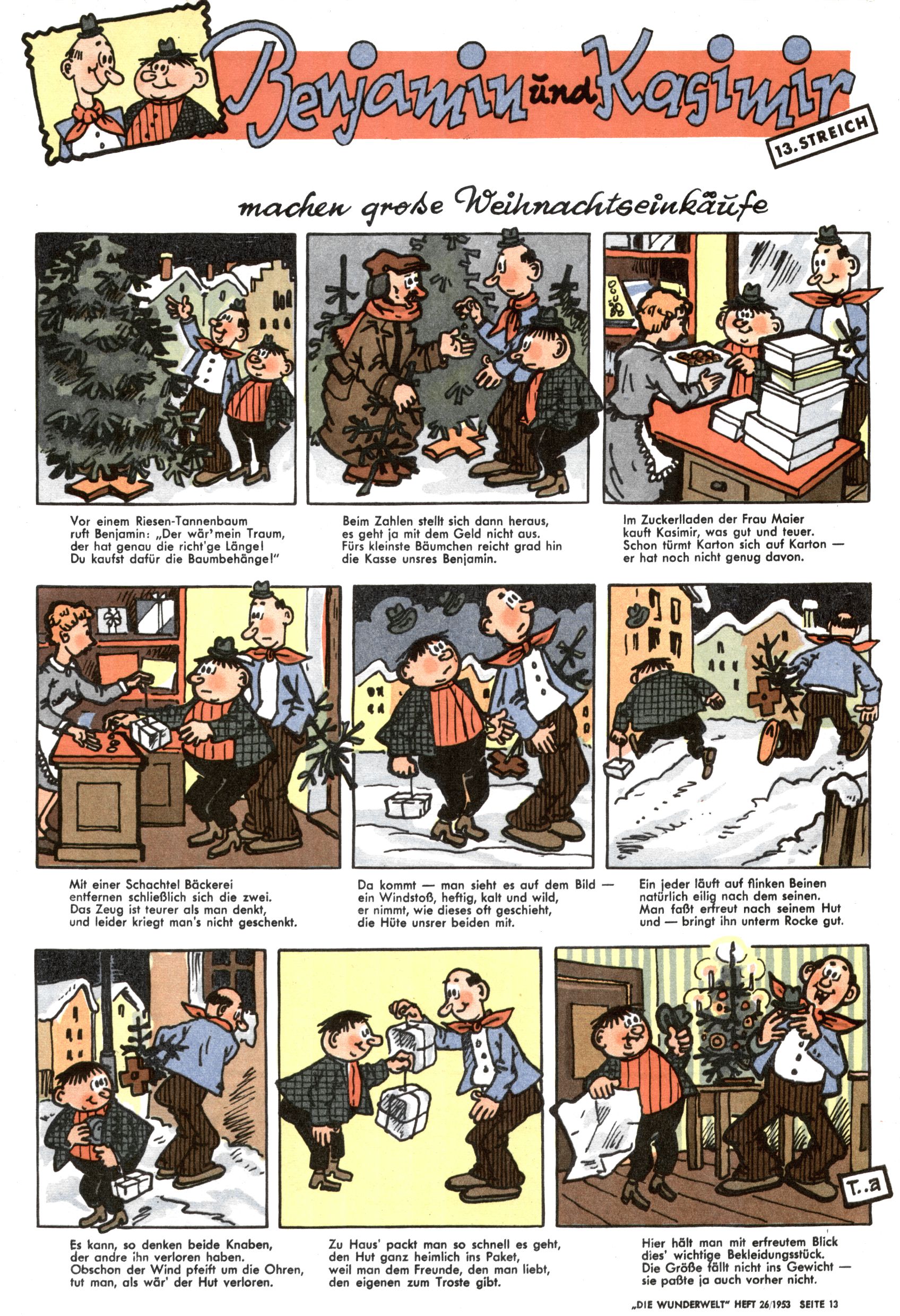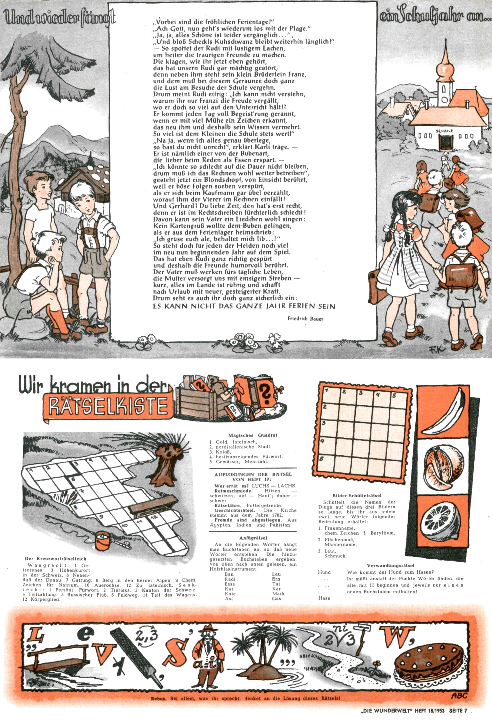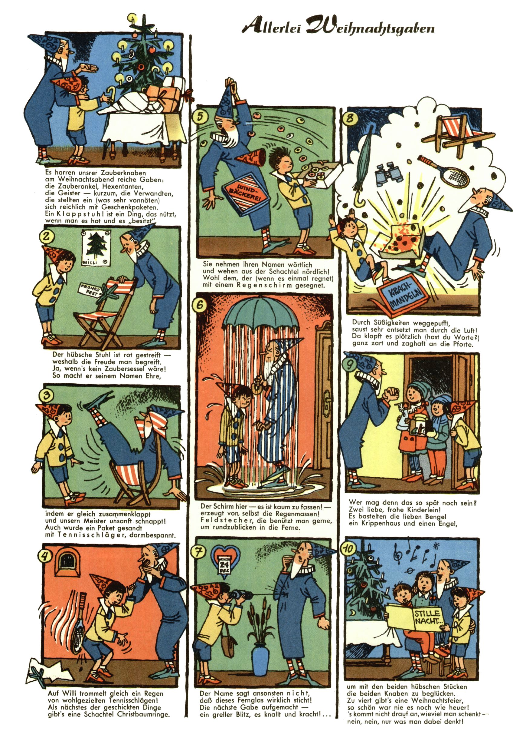 1953 – Alles beim Alten Wie lange darf man sich auf einem Erfolgskonzept ausruhen? Auch 1953 gab es keine offensichtlichen Änderungen am Layout der Zeitung. Zwar wurde Elfriede Vavrovsky teilweise durch andere Autoren abgelöst und erstmals kam Friedrich Bauer zum Zug, der bisher nur als Rätselonkel in Erscheinung getreten war. Allerdings ist anzunehmen, dass eine ganze Reihe unsignierter Erzählungen früherer Hefte ebenfalls der Feder von fb entstammen. ABC Peter Paul Prinz übernahm neuerlich die Illustration der technischen Seiten. Sein Willibald erschien ab sofort in 3 Spalten anstelle von 4 Zeilen, was ihm wesentlich mehr Gestaltungsfreiheit bot. Teja Aicher erfand die Clowns Benjamin und Kasimir nachdem ABC mit seiner Miniserie Zipferling, der lustige Kasperl bereits ein halbes Jahr zuvor durchaus mit Lachern punkten hatte können. Benjamin und Kasimir erschienen 1953 in jedem 2. Heft; nach dem Abdanken von Piff und Paff dann in jeder Ausgabe. Vom Aufbau her ähnelte die Serie dem Erfolgscartoon Willibald, der Zauberlehrling, ohne jedoch (aufgrund ihrer allzu "beschränkten" Möglichkeiten) an den Erfolg des Zauberlehrlings anknüpfen zu können. Nach dem Abschluss der Atlas-Daten und Karten erfand Annelies Umlauf Lamatsch weitere realitätsfremde Geschichten über die Natur und im Speziellen über Blumen. Eine medizinisch-biologische Spalte über den menschlichen Körper von Ewald Seifert war hingegen sachlicher und informativ. Ein kurzzeitiger Neuzugang bei den Grafikern war Hedwig Zumtobel. Sie wurde jedoch bald von Luzia Adelsberger abgelöst, die sich über Jahre hindurch als Zeichnerin etablierte. Friederike Nekut übernahm die Bastelseite für Mädchen. Die Kolumne Die Puppenschneiderin wurde mit Unser Hausmütterchen ergänzt, wodurch das handwerkliche Angebot für Mädchen erweitert werden konnte. Eine wesentliche Änderung am Titelblatt gab es 1953 aber doch: Endlich hatte man dem Erfolg von Zwerg Bumsti Rechnung getragen und ihn ins Logo erhoben. Er löste dort den Zwerg Bums aus dem Jahr 1948 in seiner Gondel ab, der zwar als Namenspatron für Zwerg Bumsti hergehalten hatte, mit dem es ansonsten aber keine Gemeinsamkeiten gab. |