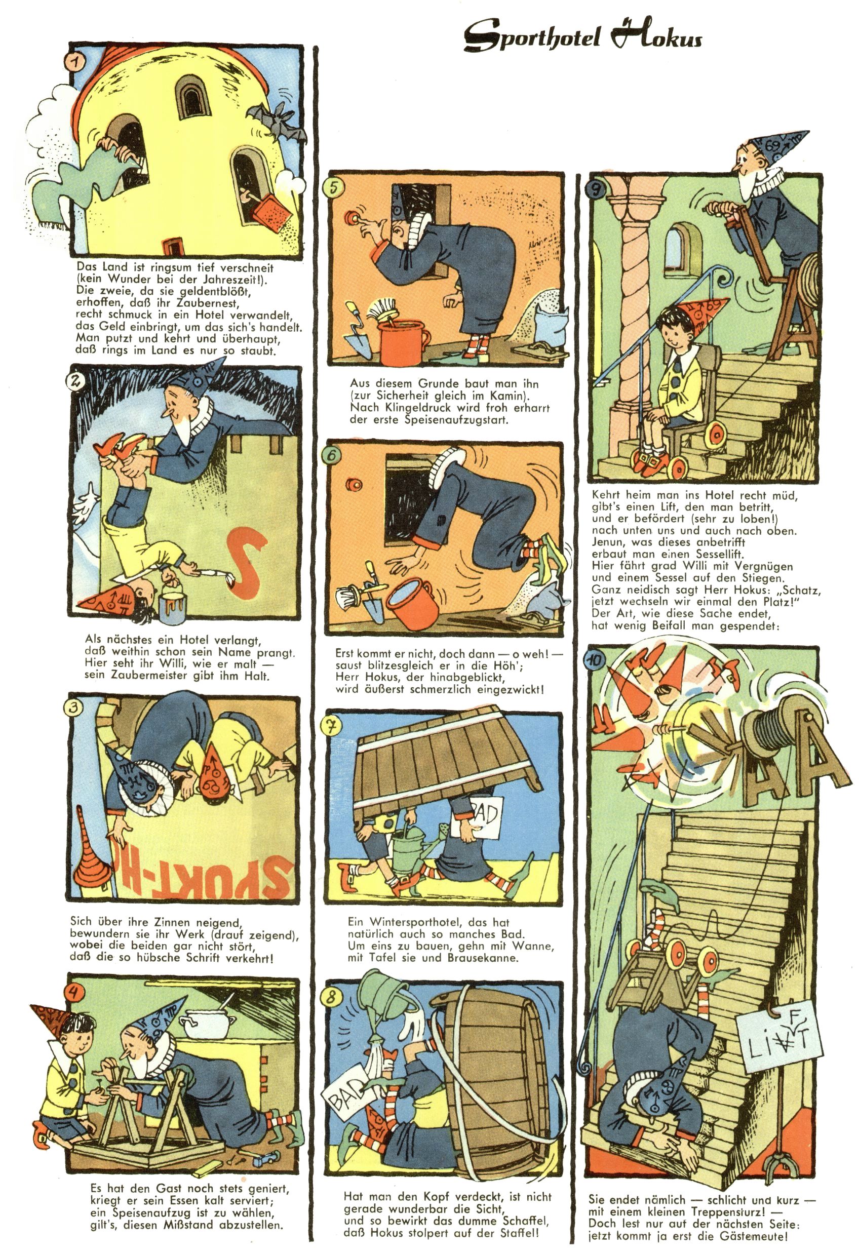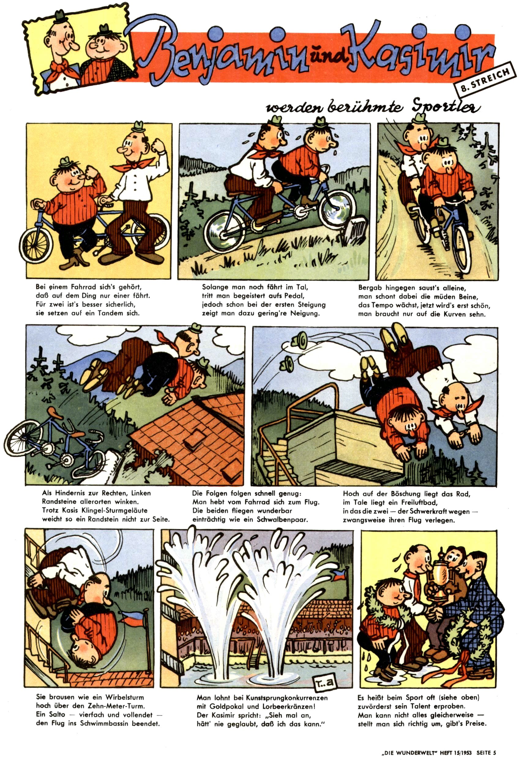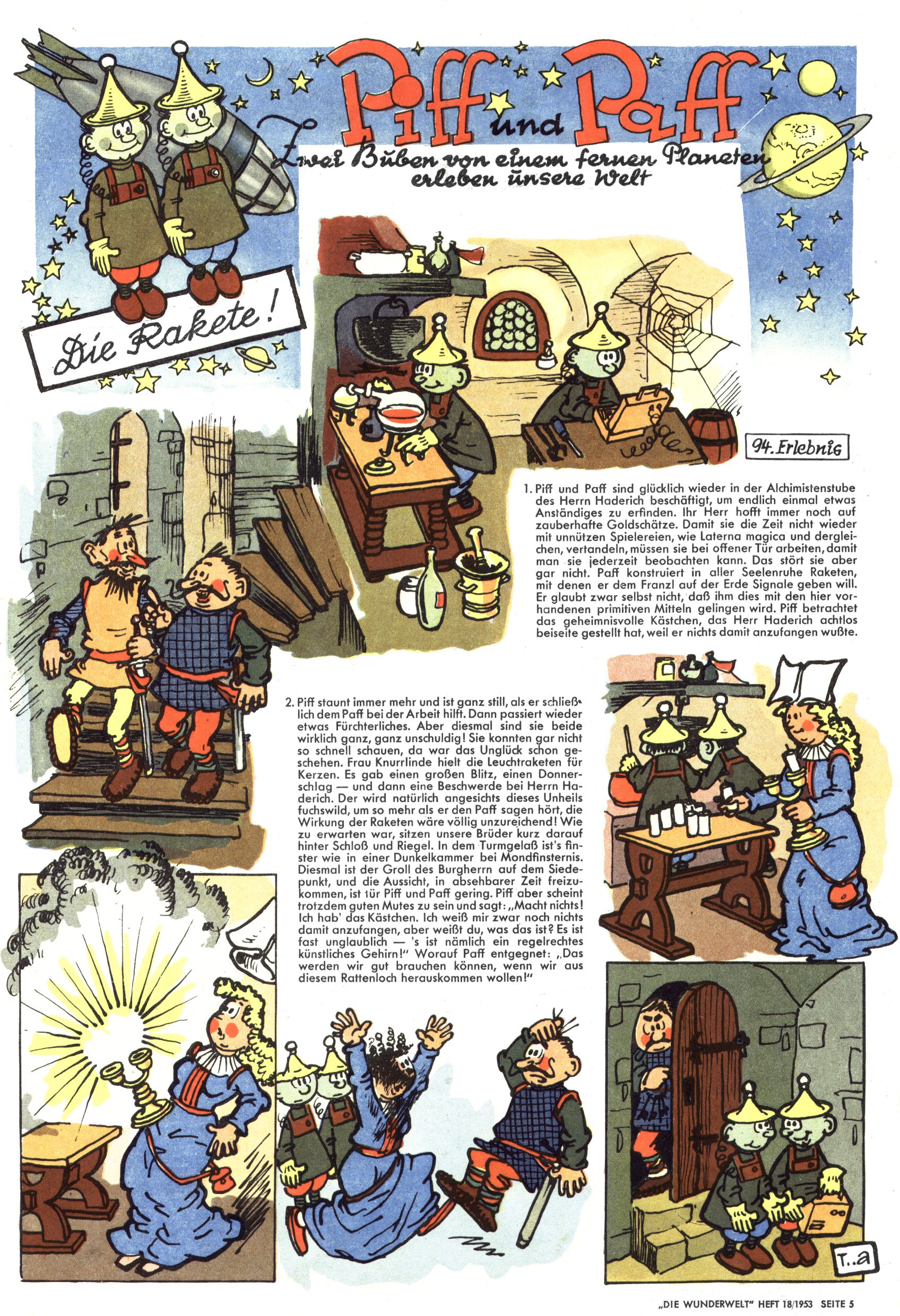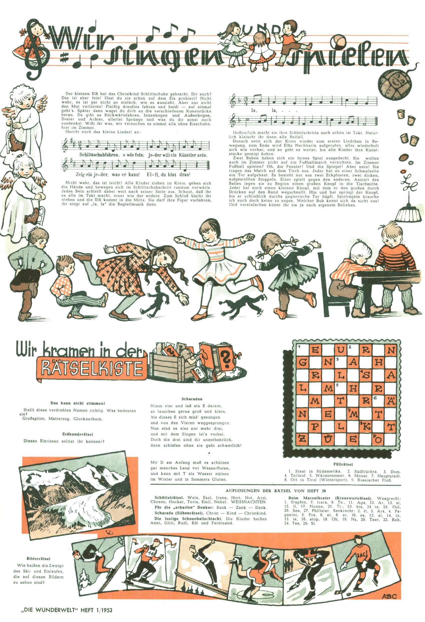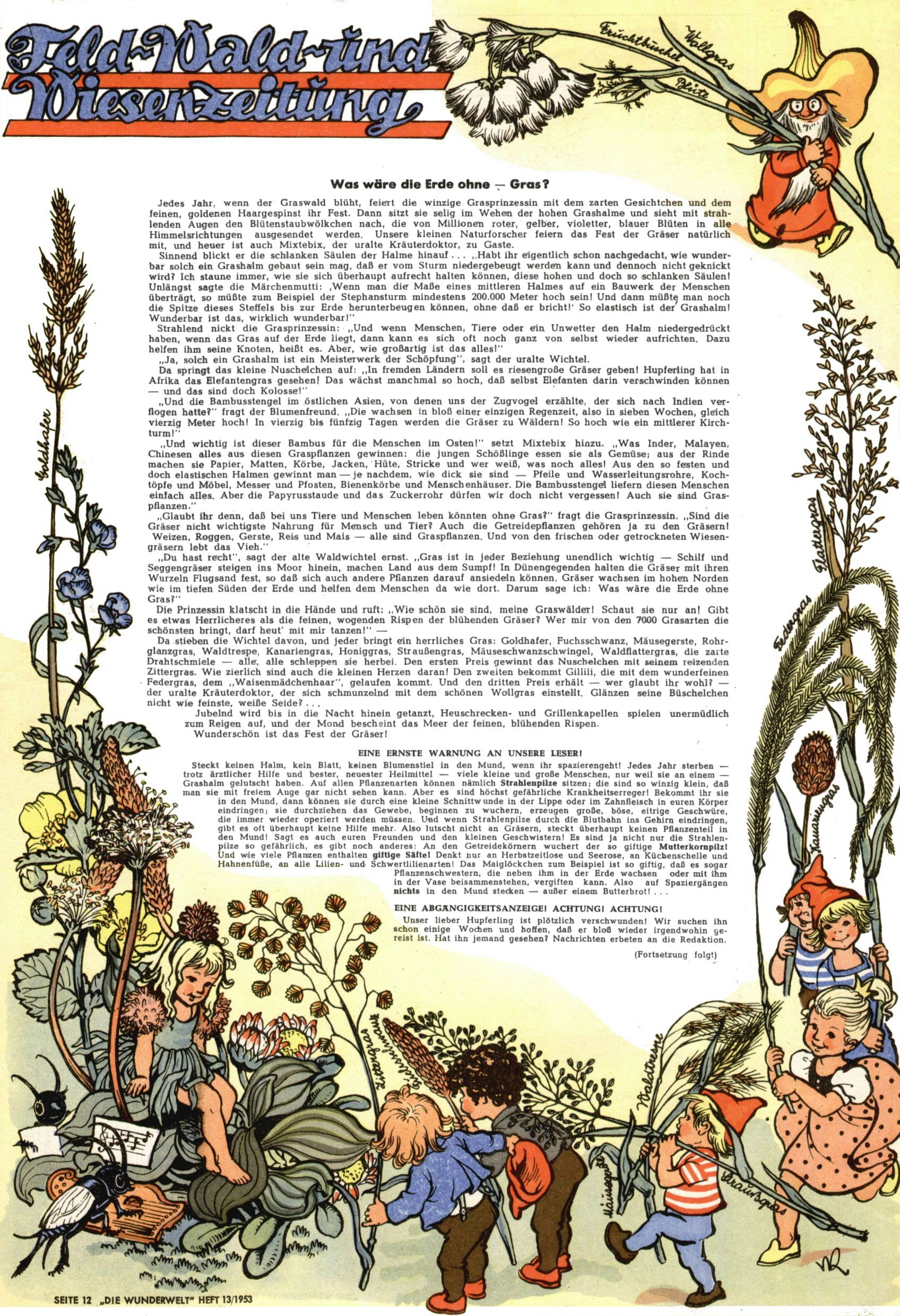 1953 – Alles beim Alten Wie lange darf man sich auf einem Erfolgskonzept ausruhen? Auch 1953 gab es keine offensichtlichen Änderungen am Layout der Zeitung. Zwar wurde Elfriede Vavrovsky teilweise durch andere Autoren abgelöst und erstmals kam Friedrich Bauer zum Zug, der bisher nur als Rätselonkel in Erscheinung getreten war. Allerdings ist anzunehmen, dass eine ganze Reihe unsignierter Erzählungen früherer Hefte ebenfalls der Feder von fb entstammen. ABC Peter Paul Prinz übernahm neuerlich die Illustration der technischen Seiten. Sein Willibald erschien ab sofort in 3 Spalten anstelle von 4 Zeilen, was ihm wesentlich mehr Gestaltungsfreiheit bot. Teja Aicher erfand die Clowns Benjamin und Kasimir nachdem ABC mit seiner Miniserie Zipferling, der lustige Kasperl bereits ein halbes Jahr zuvor durchaus mit Lachern punkten hatte können. Benjamin und Kasimir erschienen 1953 in jedem 2. Heft; nach dem Abdanken von Piff und Paff dann in jeder Ausgabe. Vom Aufbau her ähnelte die Serie dem Erfolgscartoon Willibald, der Zauberlehrling, ohne jedoch (aufgrund ihrer allzu "beschränkten" Möglichkeiten) an den Erfolg des Zauberlehrlings anknüpfen zu können. Nach dem Abschluss der Atlas-Daten und Karten erfand Annelies Umlauf Lamatsch weitere realitätsfremde Geschichten über die Natur und im Speziellen über Blumen. Eine medizinisch-biologische Spalte über den menschlichen Körper von Ewald Seifert war hingegen sachlicher und informativ. Ein kurzzeitiger Neuzugang bei den Grafikern war Hedwig Zumtobel. Sie wurde jedoch bald von Luzia Adelsberger abgelöst, die sich über Jahre hindurch als Zeichnerin etablierte. Friederike Nekut übernahm die Bastelseite für Mädchen. Die Kolumne Die Puppenschneiderin wurde mit Unser Hausmütterchen ergänzt, wodurch das handwerkliche Angebot für Mädchen erweitert werden konnte. Eine wesentliche Änderung am Titelblatt gab es 1953 aber doch: Endlich hatte man dem Erfolg von Zwerg Bumsti Rechnung getragen und ihn ins Logo erhoben. Er löste dort den Zwerg Bums aus dem Jahr 1948 in seiner Gondel ab, der zwar als Namenspatron für Zwerg Bumsti hergehalten hatte, mit dem es ansonsten aber keine Gemeinsamkeiten gab. |