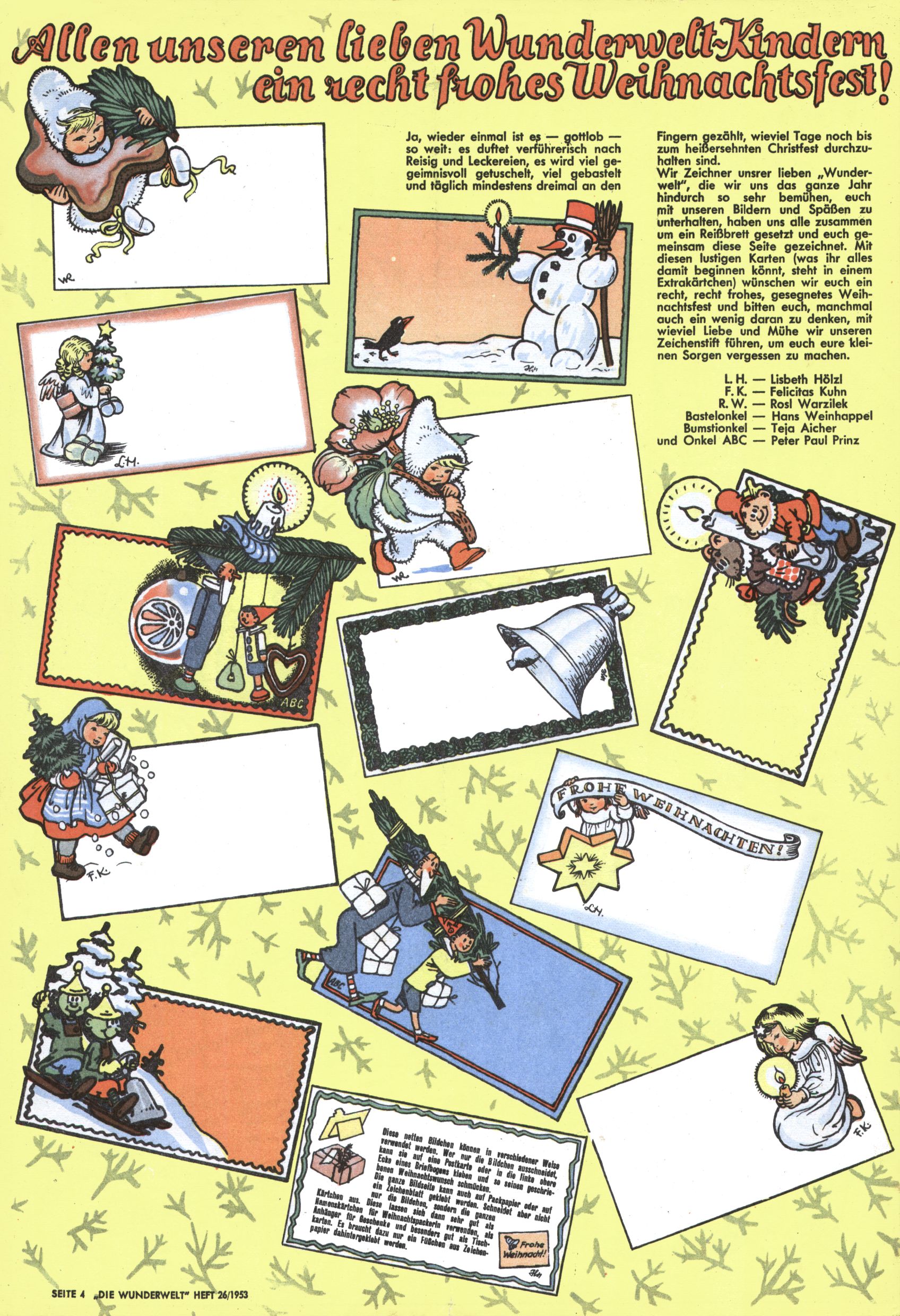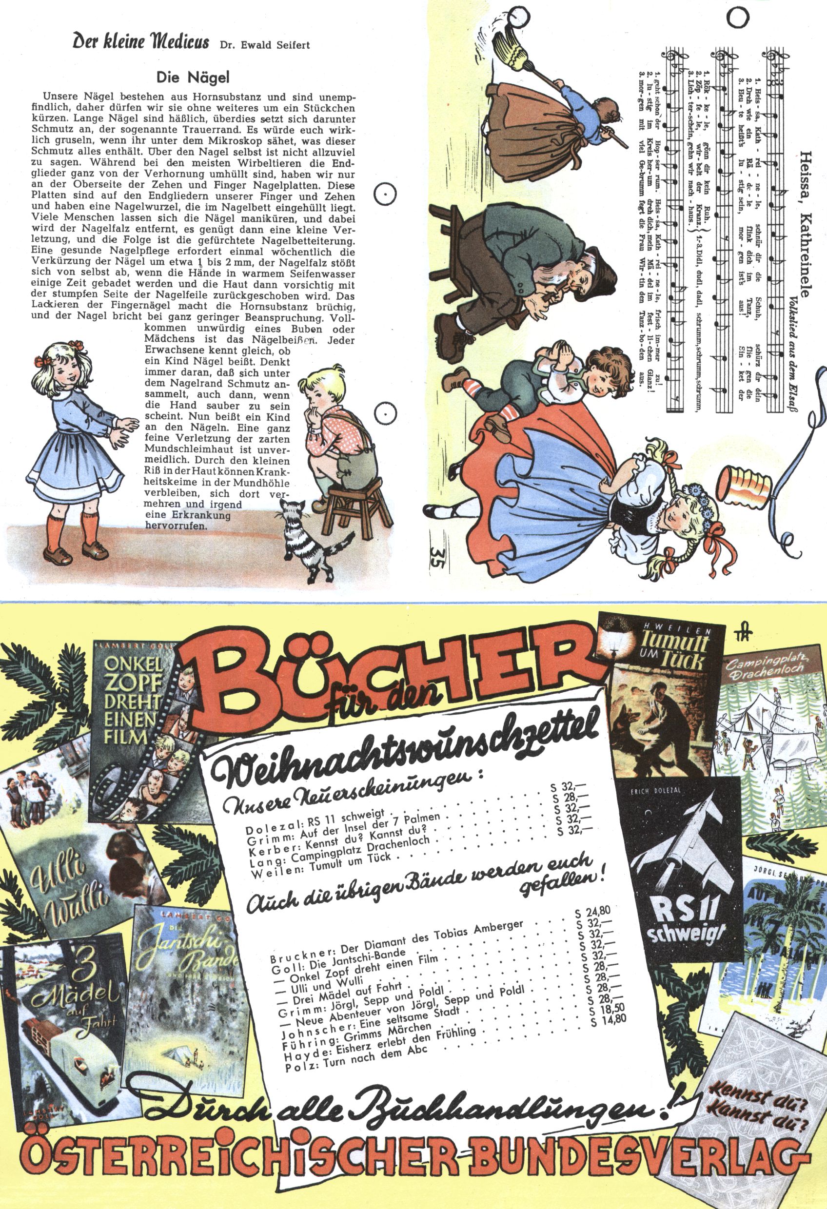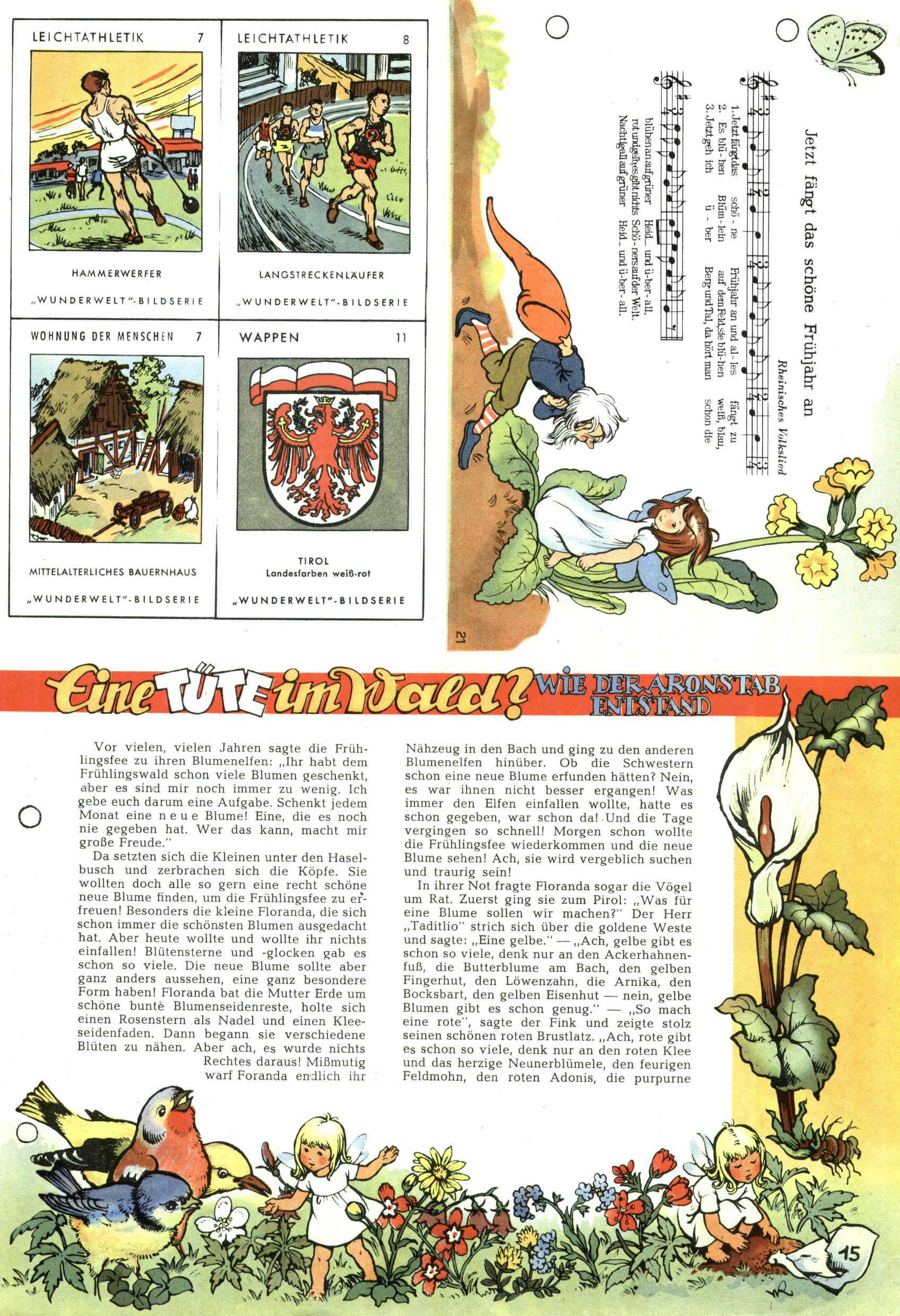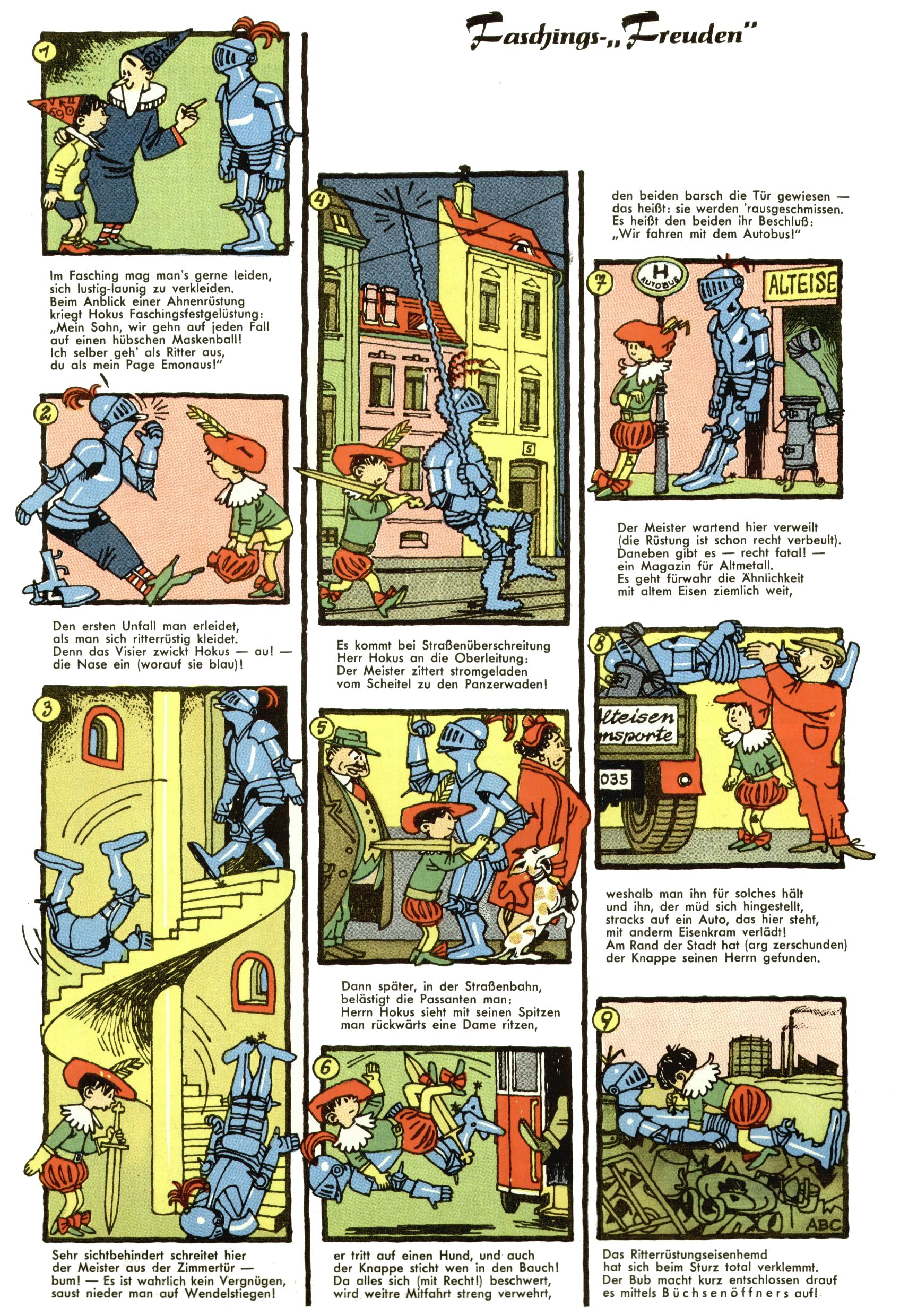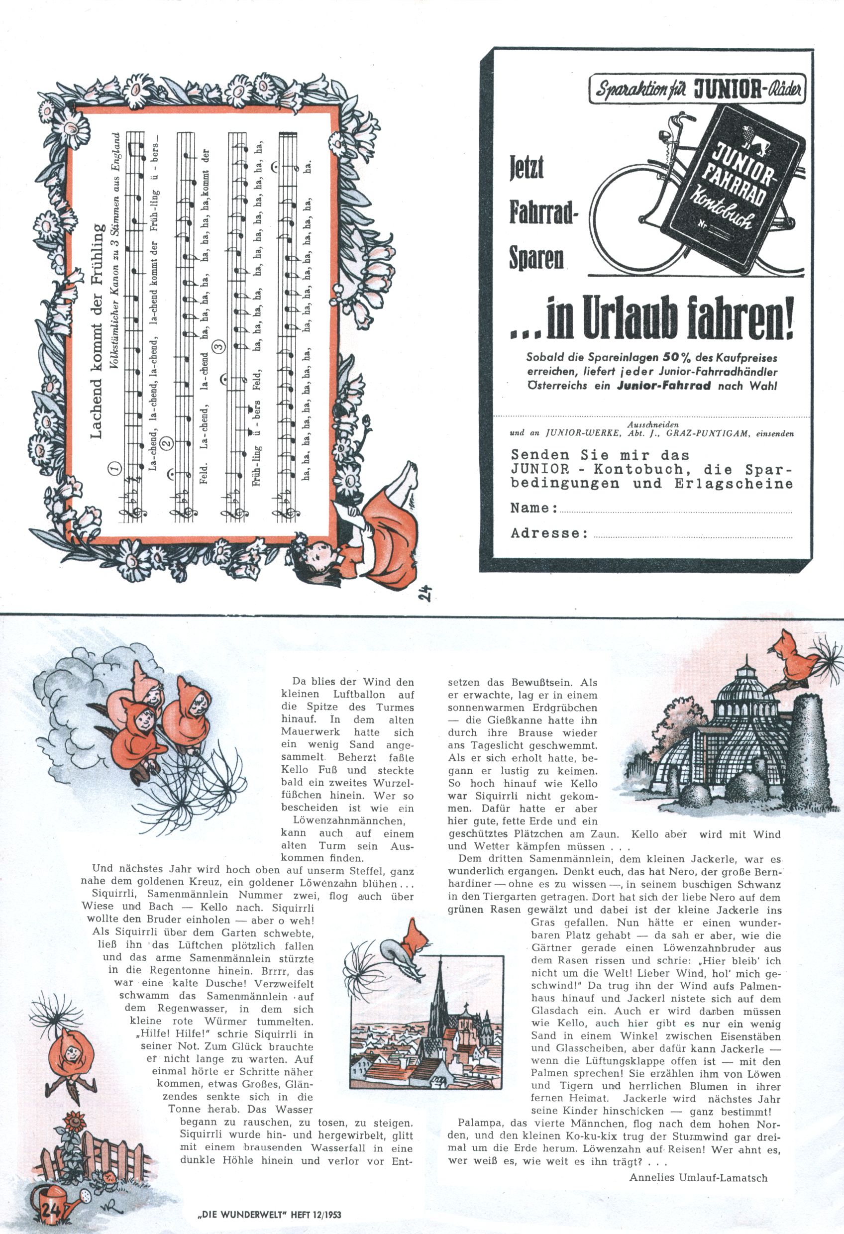 1953 – Alles beim Alten Wie lange darf man sich auf einem Erfolgskonzept ausruhen? Auch 1953 gab es keine offensichtlichen Änderungen am Layout der Zeitung. Zwar wurde Elfriede Vavrovsky teilweise durch andere Autoren abgelöst und erstmals kam Friedrich Bauer zum Zug, der bisher nur als Rätselonkel in Erscheinung getreten war. Allerdings ist anzunehmen, dass eine ganze Reihe unsignierter Erzählungen früherer Hefte ebenfalls der Feder von fb entstammen. ABC Peter Paul Prinz übernahm neuerlich die Illustration der technischen Seiten. Sein Willibald erschien ab sofort in 3 Spalten anstelle von 4 Zeilen, was ihm wesentlich mehr Gestaltungsfreiheit bot. Teja Aicher erfand die Clowns Benjamin und Kasimir nachdem ABC mit seiner Miniserie Zipferling, der lustige Kasperl bereits ein halbes Jahr zuvor durchaus mit Lachern punkten hatte können. Benjamin und Kasimir erschienen 1953 in jedem 2. Heft; nach dem Abdanken von Piff und Paff dann in jeder Ausgabe. Vom Aufbau her ähnelte die Serie dem Erfolgscartoon Willibald, der Zauberlehrling, ohne jedoch (aufgrund ihrer allzu "beschränkten" Möglichkeiten) an den Erfolg des Zauberlehrlings anknüpfen zu können. Nach dem Abschluss der Atlas-Daten und Karten erfand Annelies Umlauf Lamatsch weitere realitätsfremde Geschichten über die Natur und im Speziellen über Blumen. Eine medizinisch-biologische Spalte über den menschlichen Körper von Ewald Seifert war hingegen sachlicher und informativ. Ein kurzzeitiger Neuzugang bei den Grafikern war Hedwig Zumtobel. Sie wurde jedoch bald von Luzia Adelsberger abgelöst, die sich über Jahre hindurch als Zeichnerin etablierte. Friederike Nekut übernahm die Bastelseite für Mädchen. Die Kolumne Die Puppenschneiderin wurde mit Unser Hausmütterchen ergänzt, wodurch das handwerkliche Angebot für Mädchen erweitert werden konnte. Eine wesentliche Änderung am Titelblatt gab es 1953 aber doch: Endlich hatte man dem Erfolg von Zwerg Bumsti Rechnung getragen und ihn ins Logo erhoben. Er löste dort den Zwerg Bums aus dem Jahr 1948 in seiner Gondel ab, der zwar als Namenspatron für Zwerg Bumsti hergehalten hatte, mit dem es ansonsten aber keine Gemeinsamkeiten gab. |