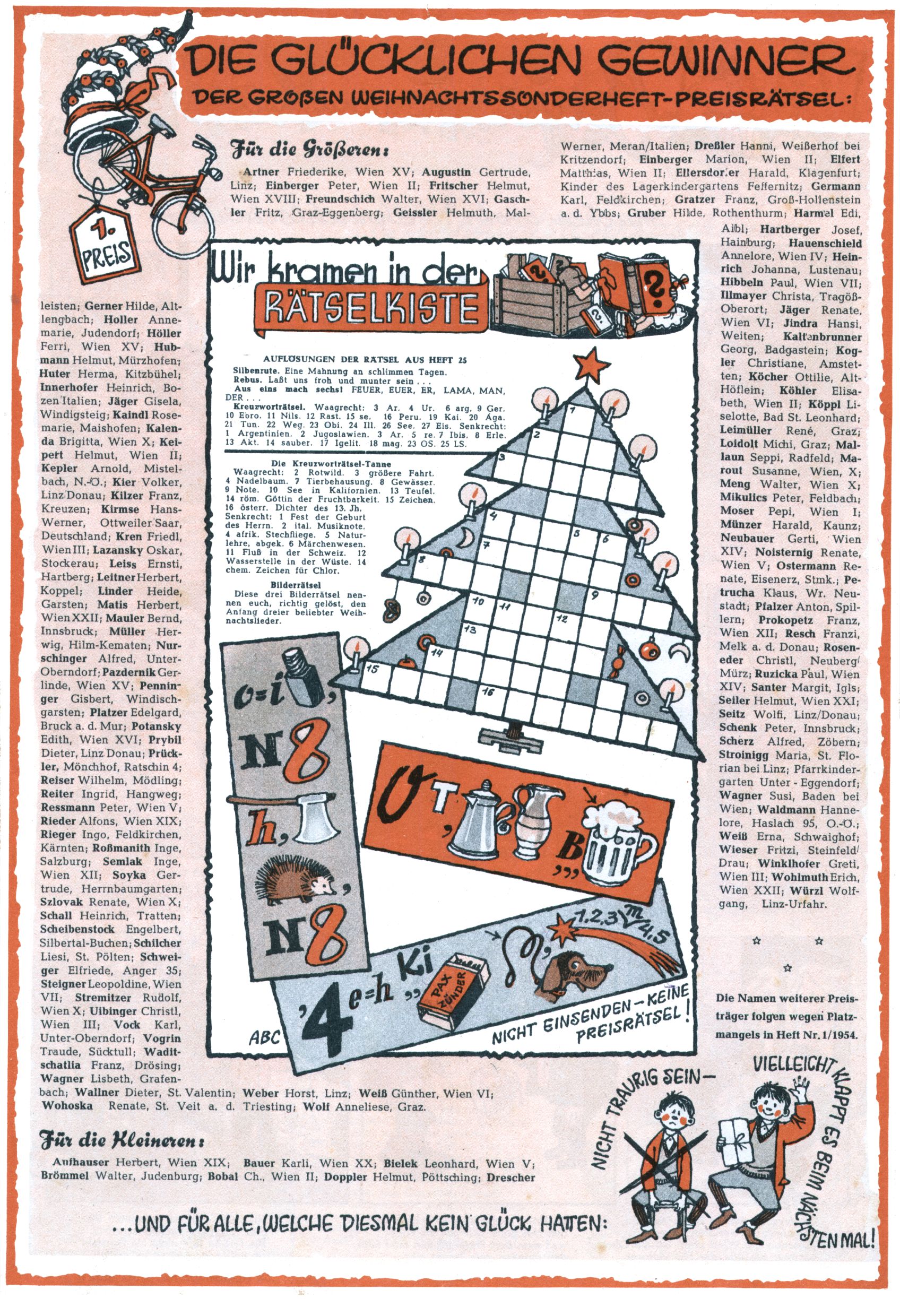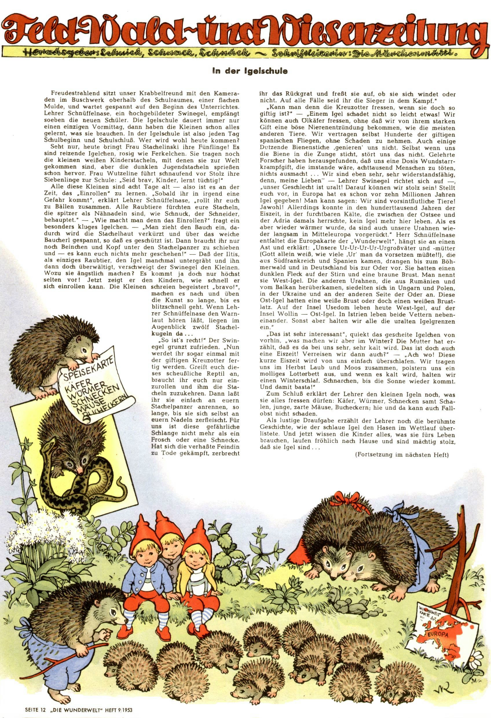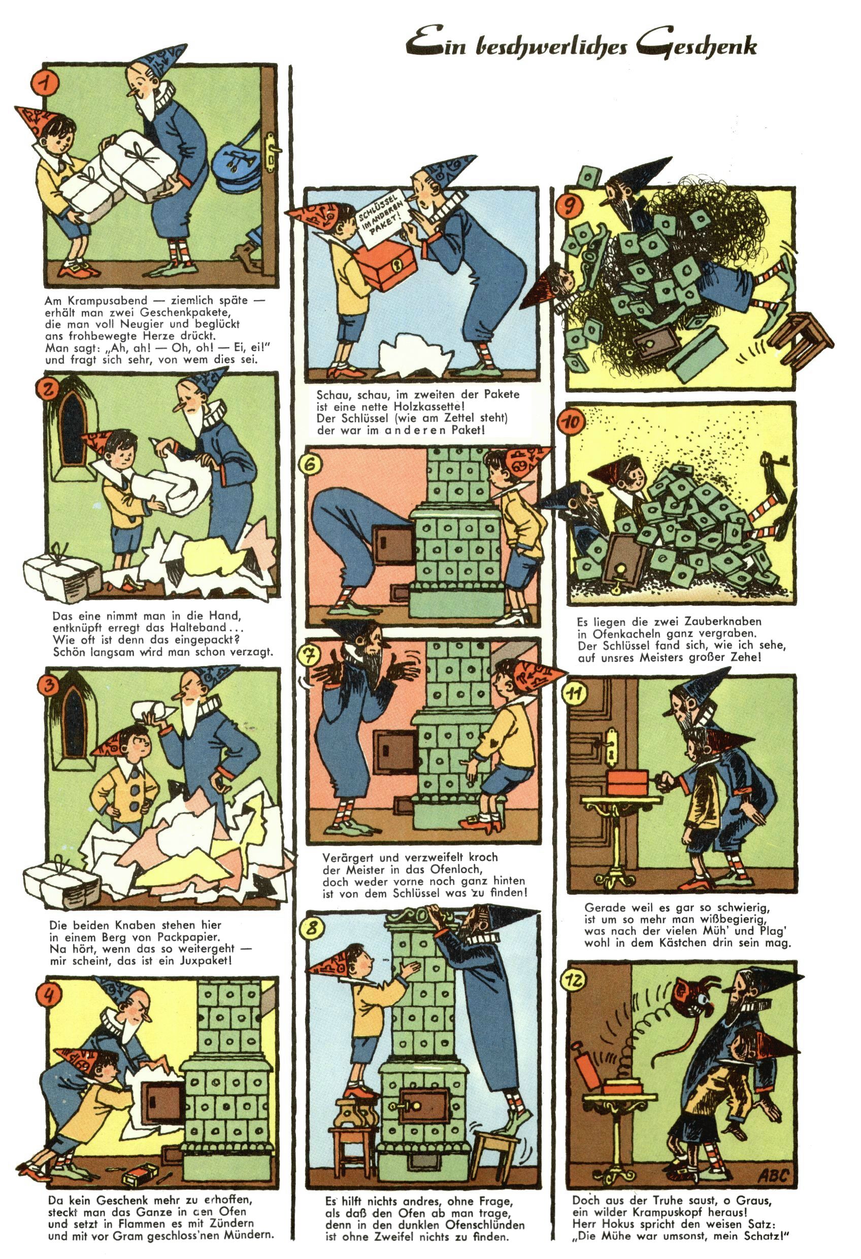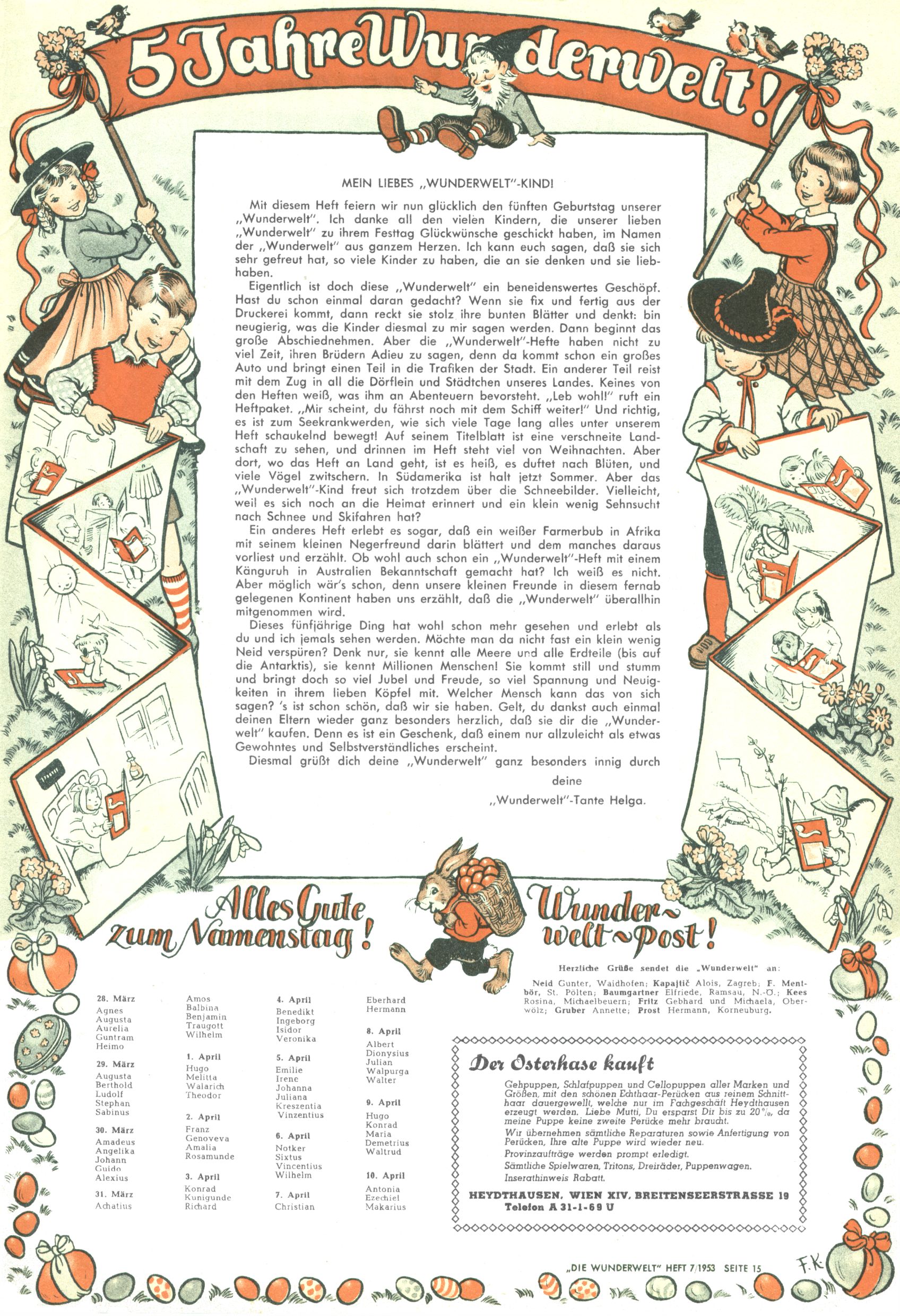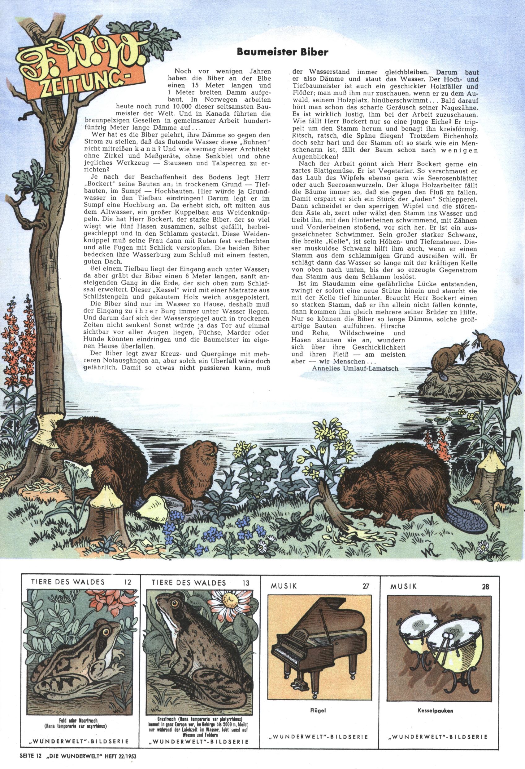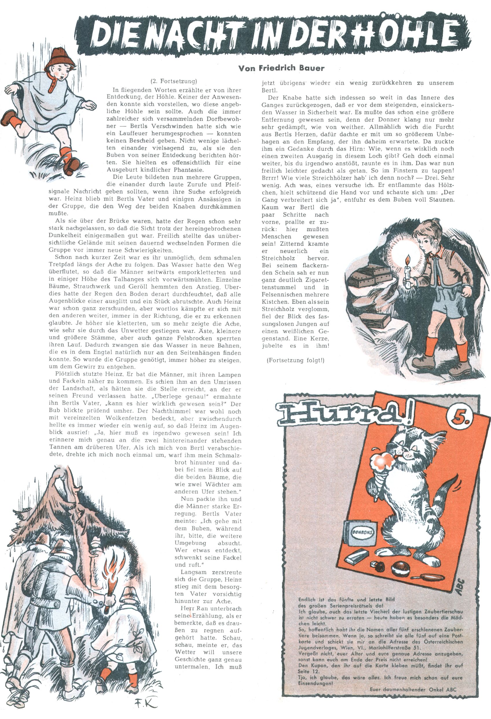 1953 – Alles beim Alten Wie lange darf man sich auf einem Erfolgskonzept ausruhen? Auch 1953 gab es keine offensichtlichen Änderungen am Layout der Zeitung. Zwar wurde Elfriede Vavrovsky teilweise durch andere Autoren abgelöst und erstmals kam Friedrich Bauer zum Zug, der bisher nur als Rätselonkel in Erscheinung getreten war. Allerdings ist anzunehmen, dass eine ganze Reihe unsignierter Erzählungen früherer Hefte ebenfalls der Feder von fb entstammen. ABC Peter Paul Prinz übernahm neuerlich die Illustration der technischen Seiten. Sein Willibald erschien ab sofort in 3 Spalten anstelle von 4 Zeilen, was ihm wesentlich mehr Gestaltungsfreiheit bot. Teja Aicher erfand die Clowns Benjamin und Kasimir nachdem ABC mit seiner Miniserie Zipferling, der lustige Kasperl bereits ein halbes Jahr zuvor durchaus mit Lachern punkten hatte können. Benjamin und Kasimir erschienen 1953 in jedem 2. Heft; nach dem Abdanken von Piff und Paff dann in jeder Ausgabe. Vom Aufbau her ähnelte die Serie dem Erfolgscartoon Willibald, der Zauberlehrling, ohne jedoch (aufgrund ihrer allzu "beschränkten" Möglichkeiten) an den Erfolg des Zauberlehrlings anknüpfen zu können. Nach dem Abschluss der Atlas-Daten und Karten erfand Annelies Umlauf Lamatsch weitere realitätsfremde Geschichten über die Natur und im Speziellen über Blumen. Eine medizinisch-biologische Spalte über den menschlichen Körper von Ewald Seifert war hingegen sachlicher und informativ. Ein kurzzeitiger Neuzugang bei den Grafikern war Hedwig Zumtobel. Sie wurde jedoch bald von Luzia Adelsberger abgelöst, die sich über Jahre hindurch als Zeichnerin etablierte. Friederike Nekut übernahm die Bastelseite für Mädchen. Die Kolumne Die Puppenschneiderin wurde mit Unser Hausmütterchen ergänzt, wodurch das handwerkliche Angebot für Mädchen erweitert werden konnte. Eine wesentliche Änderung am Titelblatt gab es 1953 aber doch: Endlich hatte man dem Erfolg von Zwerg Bumsti Rechnung getragen und ihn ins Logo erhoben. Er löste dort den Zwerg Bums aus dem Jahr 1948 in seiner Gondel ab, der zwar als Namenspatron für Zwerg Bumsti hergehalten hatte, mit dem es ansonsten aber keine Gemeinsamkeiten gab. |