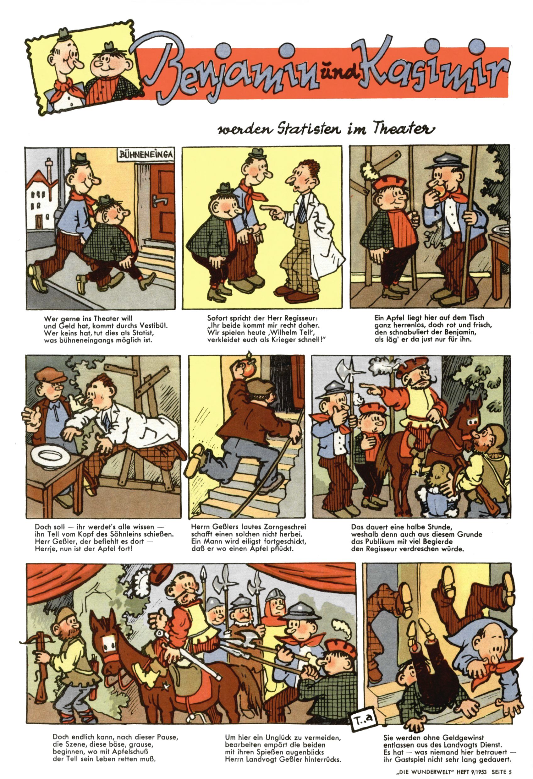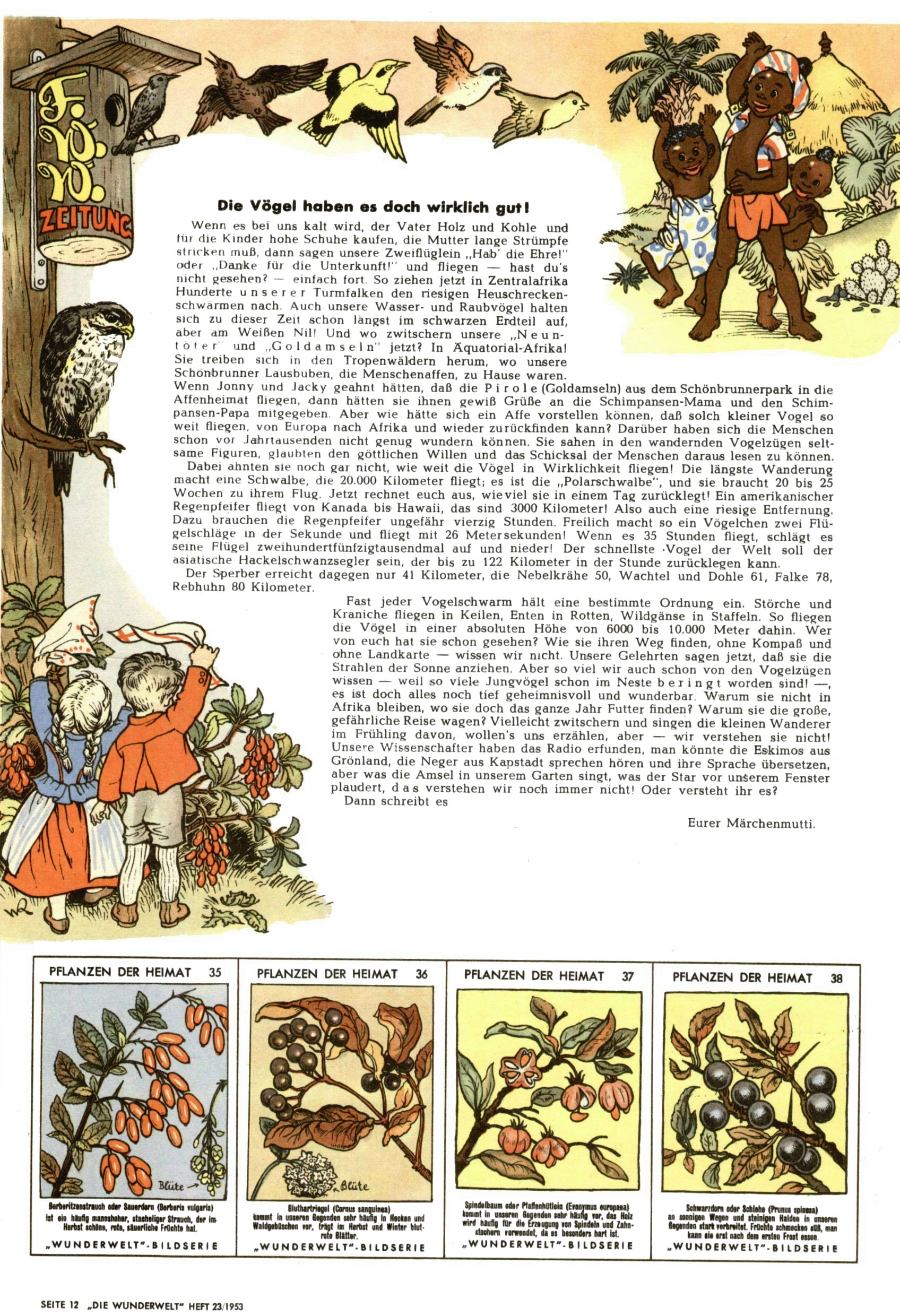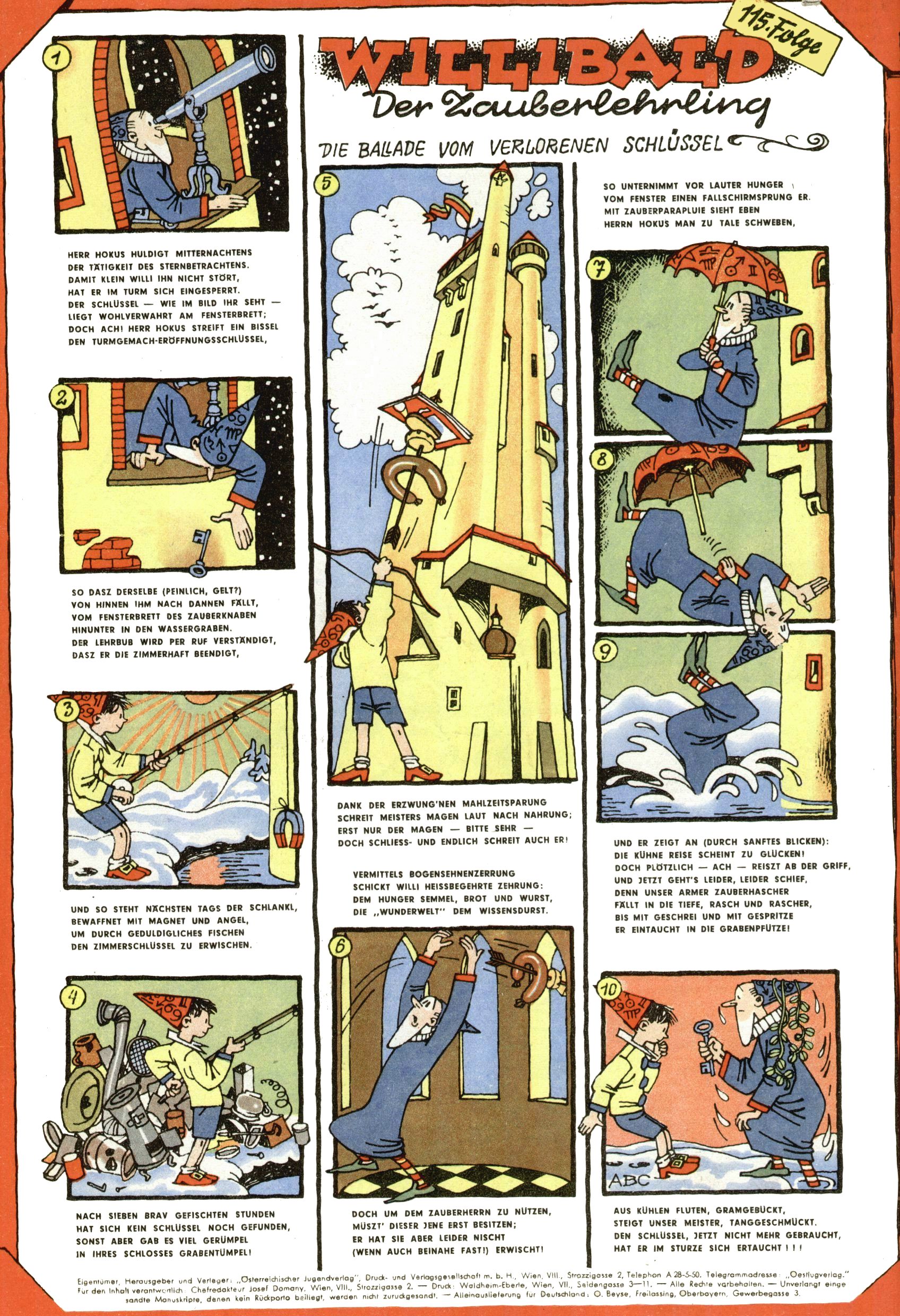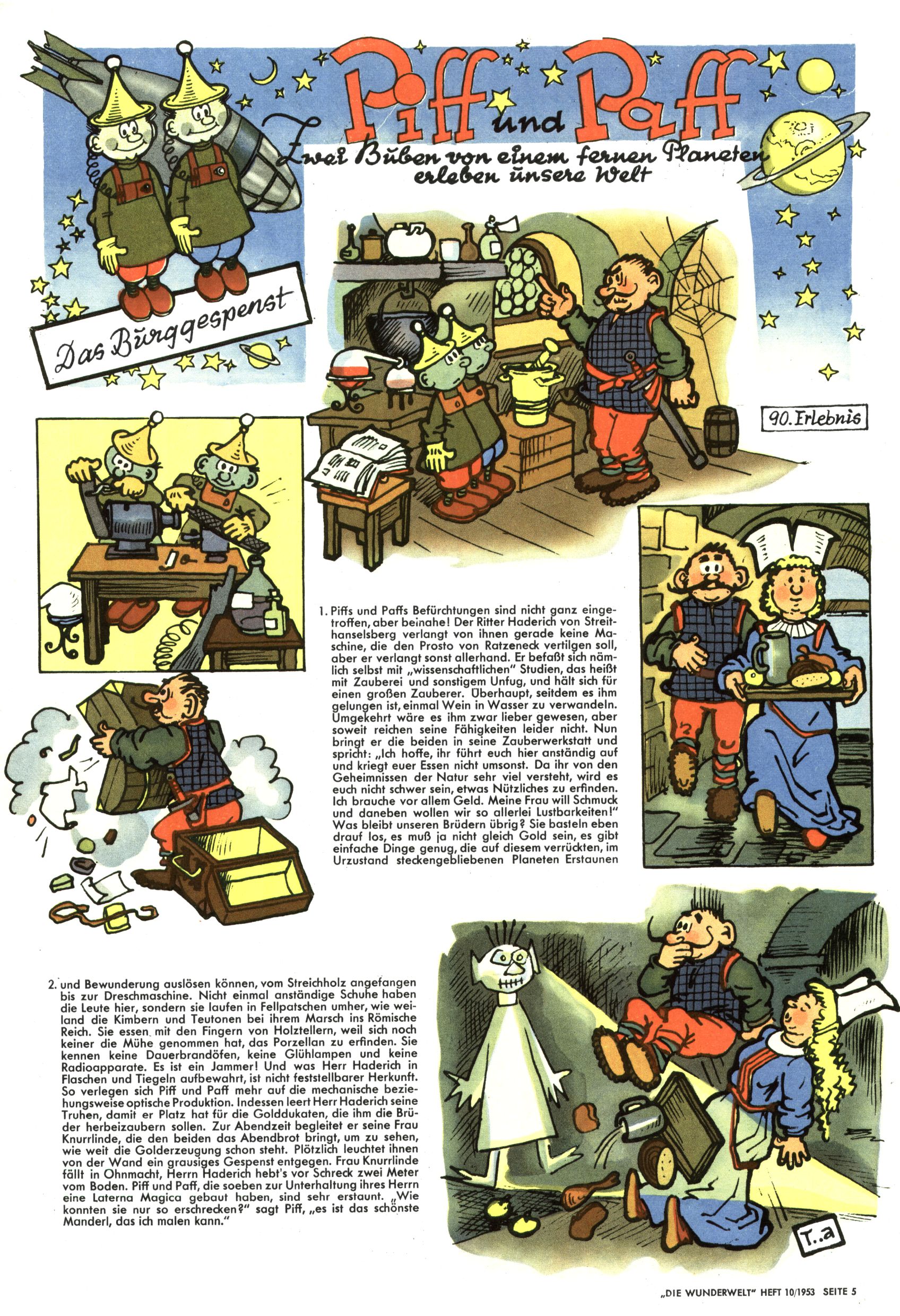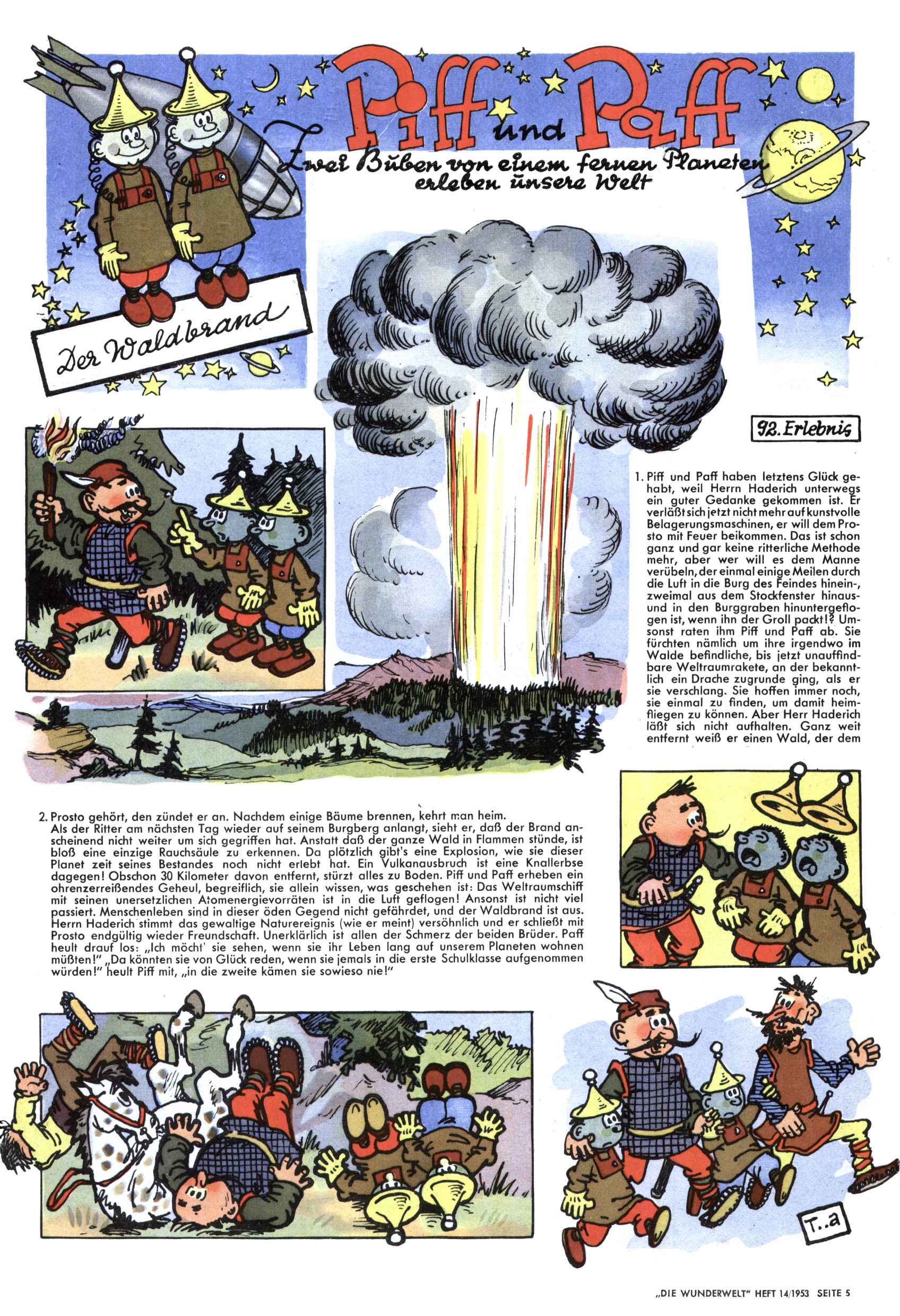 1953 – Alles beim Alten Wie lange darf man sich auf einem Erfolgskonzept ausruhen? Auch 1953 gab es keine offensichtlichen Änderungen am Layout der Zeitung. Zwar wurde Elfriede Vavrovsky teilweise durch andere Autoren abgelöst und erstmals kam Friedrich Bauer zum Zug, der bisher nur als Rätselonkel in Erscheinung getreten war. Allerdings ist anzunehmen, dass eine ganze Reihe unsignierter Erzählungen früherer Hefte ebenfalls der Feder von fb entstammen. ABC Peter Paul Prinz übernahm neuerlich die Illustration der technischen Seiten. Sein Willibald erschien ab sofort in 3 Spalten anstelle von 4 Zeilen, was ihm wesentlich mehr Gestaltungsfreiheit bot. Teja Aicher erfand die Clowns Benjamin und Kasimir nachdem ABC mit seiner Miniserie Zipferling, der lustige Kasperl bereits ein halbes Jahr zuvor durchaus mit Lachern punkten hatte können. Benjamin und Kasimir erschienen 1953 in jedem 2. Heft; nach dem Abdanken von Piff und Paff dann in jeder Ausgabe. Vom Aufbau her ähnelte die Serie dem Erfolgscartoon Willibald, der Zauberlehrling, ohne jedoch (aufgrund ihrer allzu "beschränkten" Möglichkeiten) an den Erfolg des Zauberlehrlings anknüpfen zu können. Nach dem Abschluss der Atlas-Daten und Karten erfand Annelies Umlauf Lamatsch weitere realitätsfremde Geschichten über die Natur und im Speziellen über Blumen. Eine medizinisch-biologische Spalte über den menschlichen Körper von Ewald Seifert war hingegen sachlicher und informativ. Ein kurzzeitiger Neuzugang bei den Grafikern war Hedwig Zumtobel. Sie wurde jedoch bald von Luzia Adelsberger abgelöst, die sich über Jahre hindurch als Zeichnerin etablierte. Friederike Nekut übernahm die Bastelseite für Mädchen. Die Kolumne Die Puppenschneiderin wurde mit Unser Hausmütterchen ergänzt, wodurch das handwerkliche Angebot für Mädchen erweitert werden konnte. Eine wesentliche Änderung am Titelblatt gab es 1953 aber doch: Endlich hatte man dem Erfolg von Zwerg Bumsti Rechnung getragen und ihn ins Logo erhoben. Er löste dort den Zwerg Bums aus dem Jahr 1948 in seiner Gondel ab, der zwar als Namenspatron für Zwerg Bumsti hergehalten hatte, mit dem es ansonsten aber keine Gemeinsamkeiten gab. |