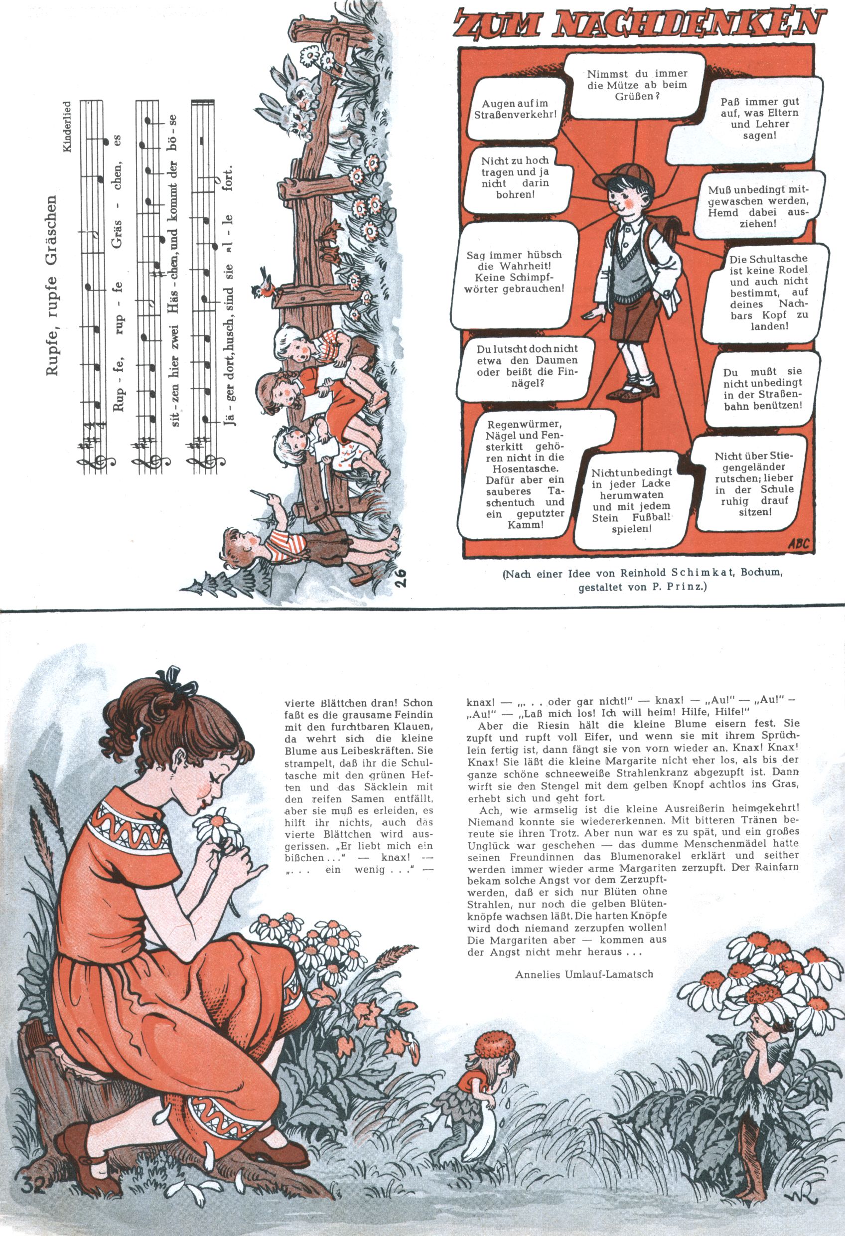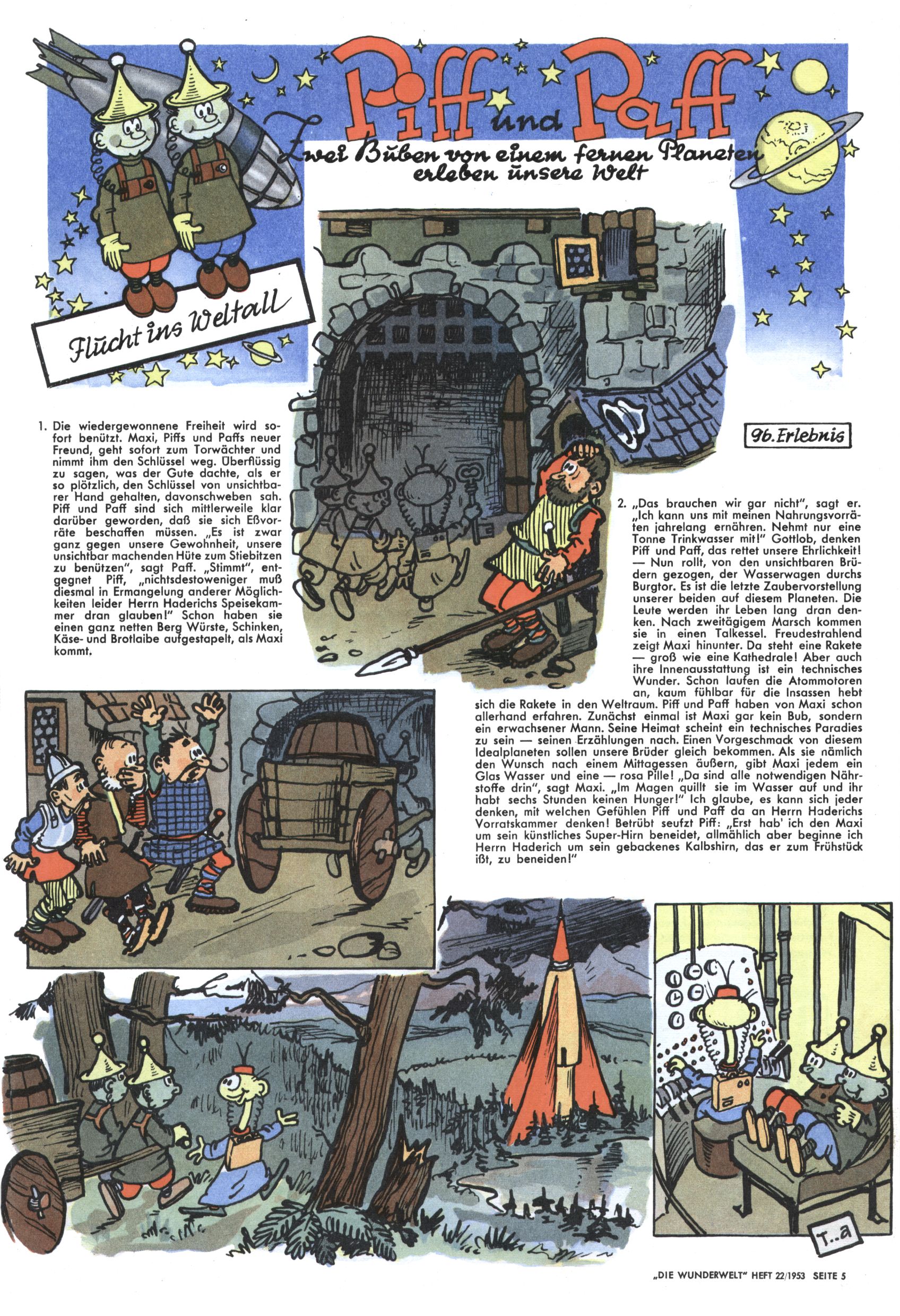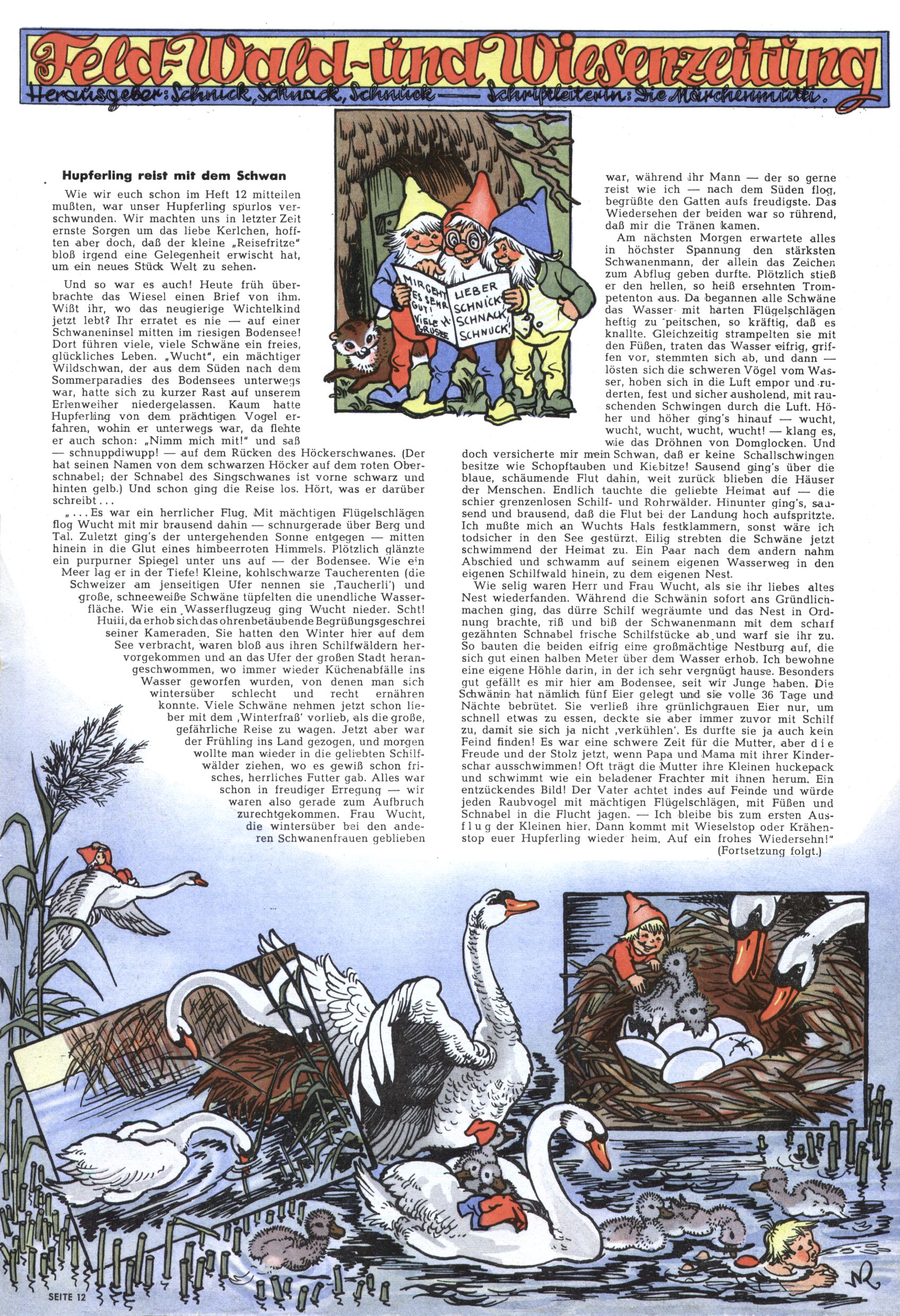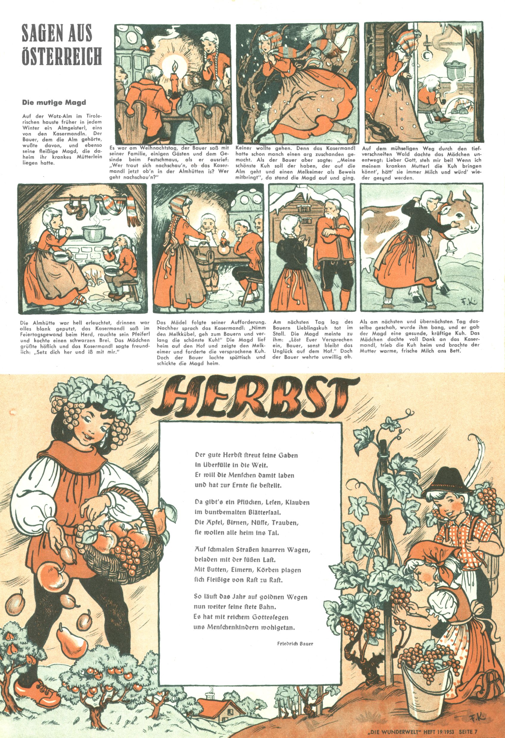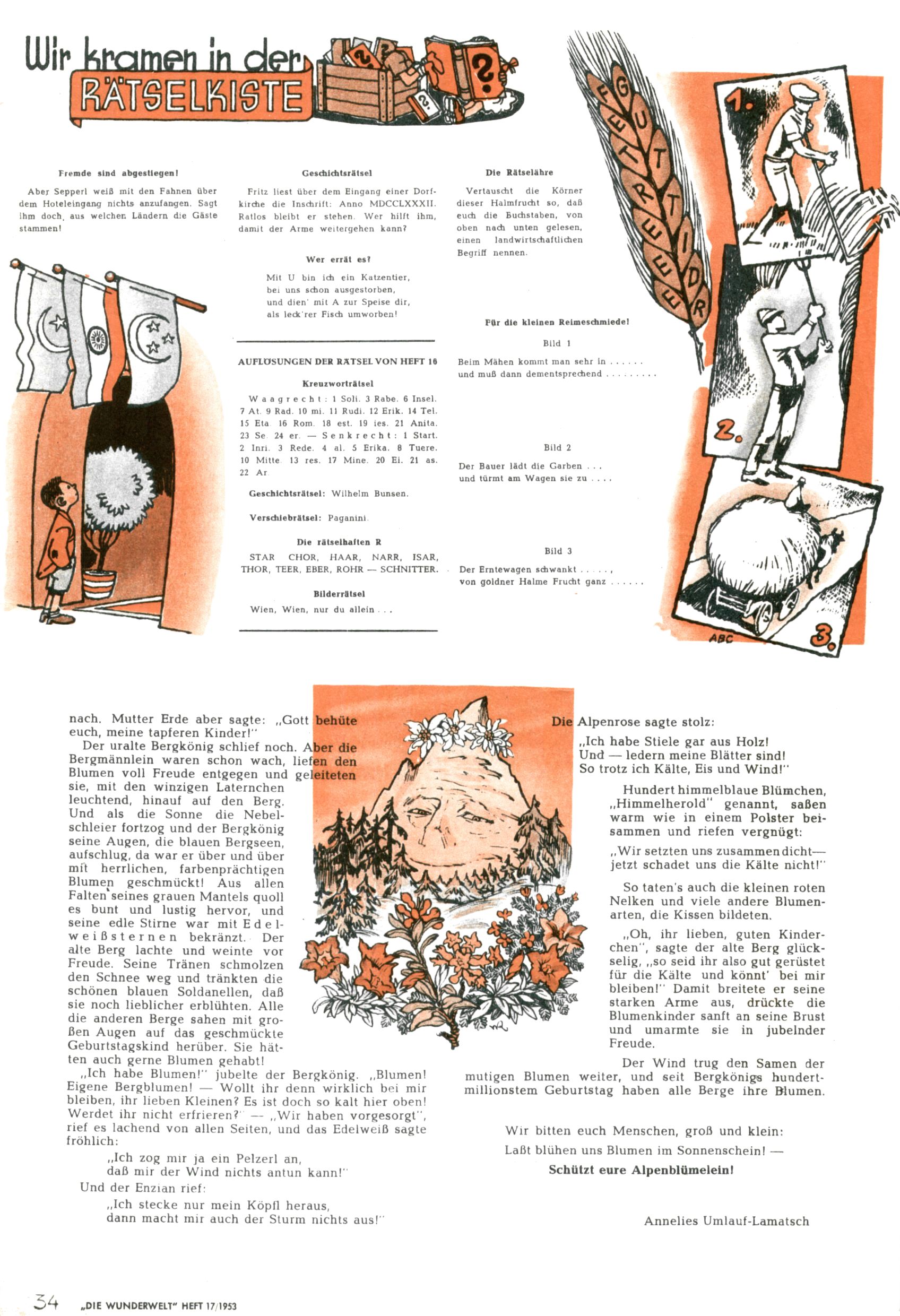 1953 – Alles beim Alten Wie lange darf man sich auf einem Erfolgskonzept ausruhen? Auch 1953 gab es keine offensichtlichen Änderungen am Layout der Zeitung. Zwar wurde Elfriede Vavrovsky teilweise durch andere Autoren abgelöst und erstmals kam Friedrich Bauer zum Zug, der bisher nur als Rätselonkel in Erscheinung getreten war. Allerdings ist anzunehmen, dass eine ganze Reihe unsignierter Erzählungen früherer Hefte ebenfalls der Feder von fb entstammen. ABC Peter Paul Prinz übernahm neuerlich die Illustration der technischen Seiten. Sein Willibald erschien ab sofort in 3 Spalten anstelle von 4 Zeilen, was ihm wesentlich mehr Gestaltungsfreiheit bot. Teja Aicher erfand die Clowns Benjamin und Kasimir nachdem ABC mit seiner Miniserie Zipferling, der lustige Kasperl bereits ein halbes Jahr zuvor durchaus mit Lachern punkten hatte können. Benjamin und Kasimir erschienen 1953 in jedem 2. Heft; nach dem Abdanken von Piff und Paff dann in jeder Ausgabe. Vom Aufbau her ähnelte die Serie dem Erfolgscartoon Willibald, der Zauberlehrling, ohne jedoch (aufgrund ihrer allzu "beschränkten" Möglichkeiten) an den Erfolg des Zauberlehrlings anknüpfen zu können. Nach dem Abschluss der Atlas-Daten und Karten erfand Annelies Umlauf Lamatsch weitere realitätsfremde Geschichten über die Natur und im Speziellen über Blumen. Eine medizinisch-biologische Spalte über den menschlichen Körper von Ewald Seifert war hingegen sachlicher und informativ. Ein kurzzeitiger Neuzugang bei den Grafikern war Hedwig Zumtobel. Sie wurde jedoch bald von Luzia Adelsberger abgelöst, die sich über Jahre hindurch als Zeichnerin etablierte. Friederike Nekut übernahm die Bastelseite für Mädchen. Die Kolumne Die Puppenschneiderin wurde mit Unser Hausmütterchen ergänzt, wodurch das handwerkliche Angebot für Mädchen erweitert werden konnte. Eine wesentliche Änderung am Titelblatt gab es 1953 aber doch: Endlich hatte man dem Erfolg von Zwerg Bumsti Rechnung getragen und ihn ins Logo erhoben. Er löste dort den Zwerg Bums aus dem Jahr 1948 in seiner Gondel ab, der zwar als Namenspatron für Zwerg Bumsti hergehalten hatte, mit dem es ansonsten aber keine Gemeinsamkeiten gab. |