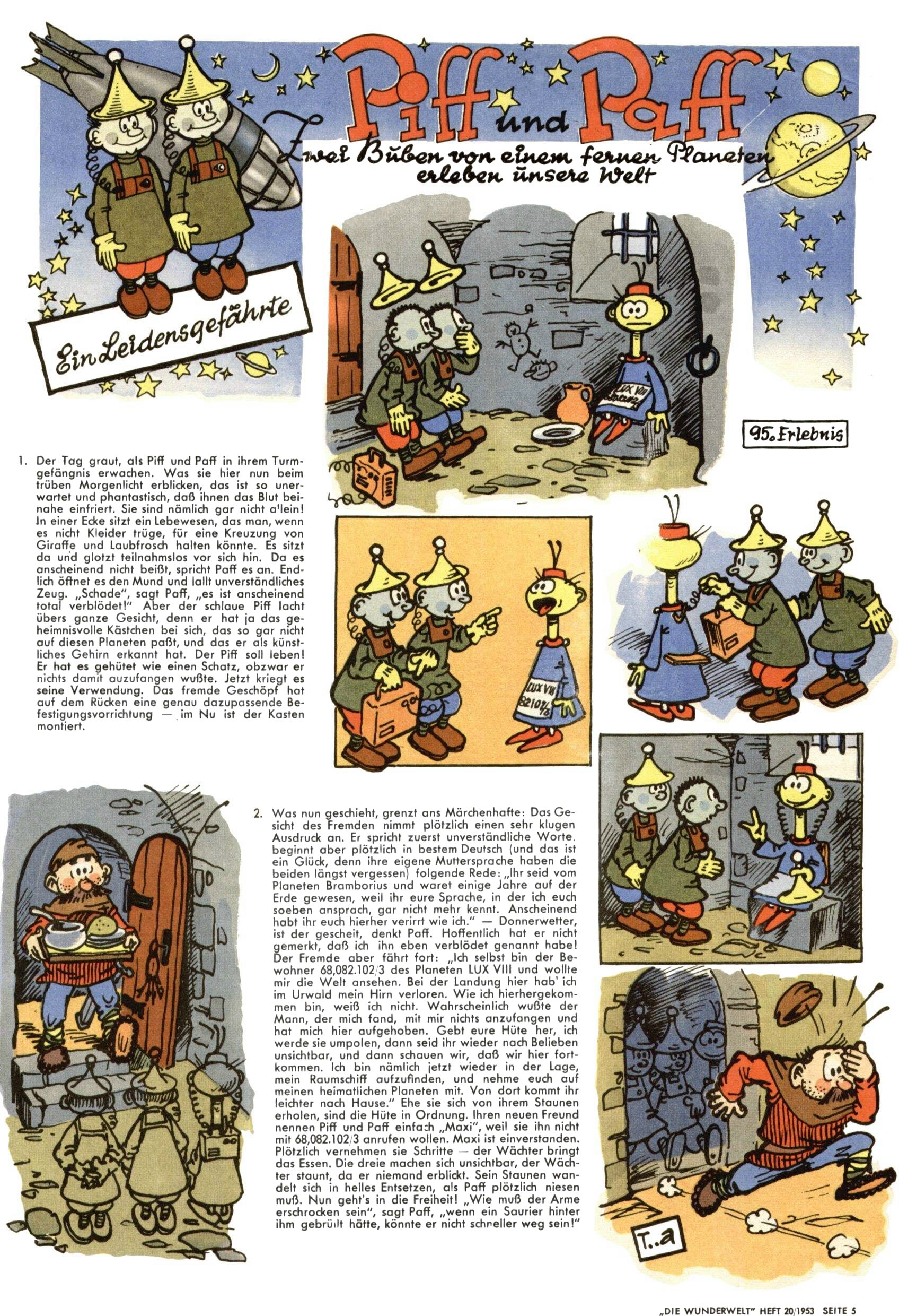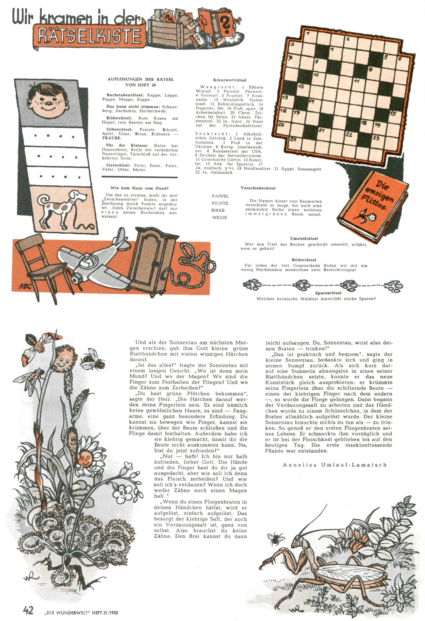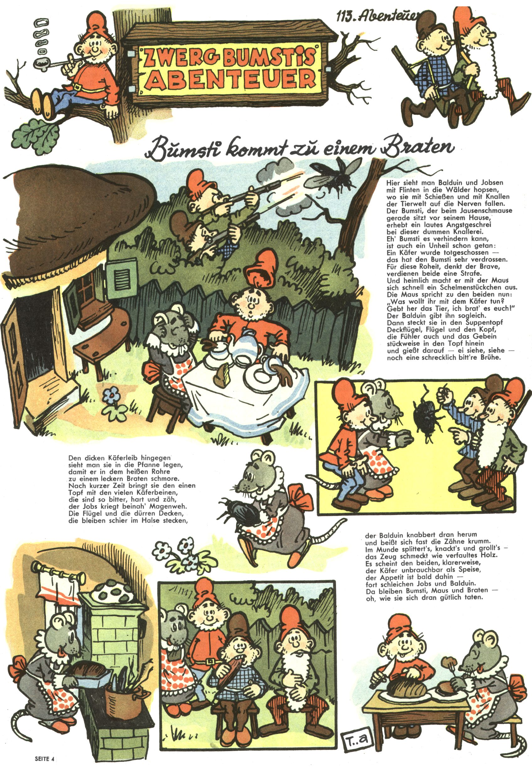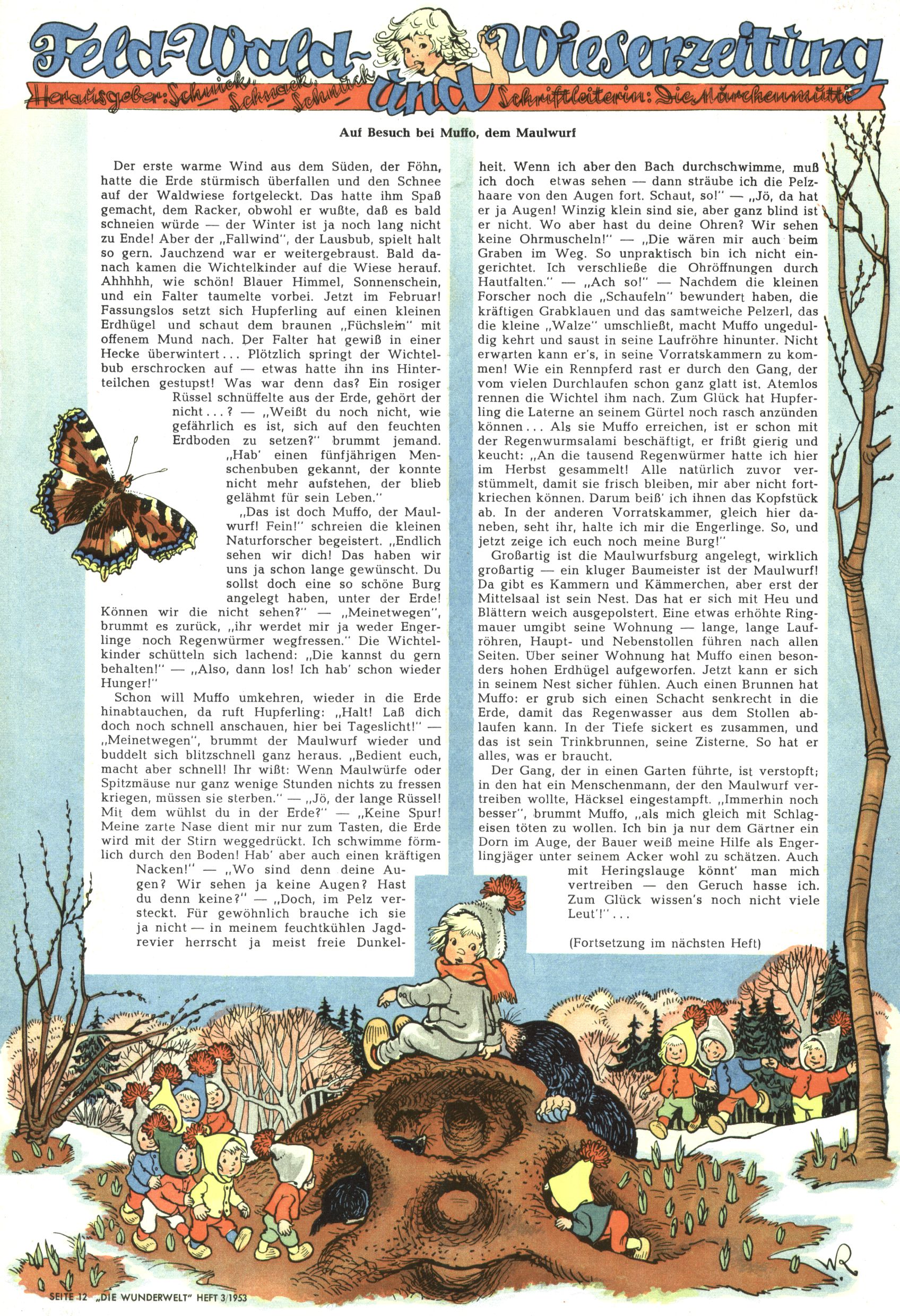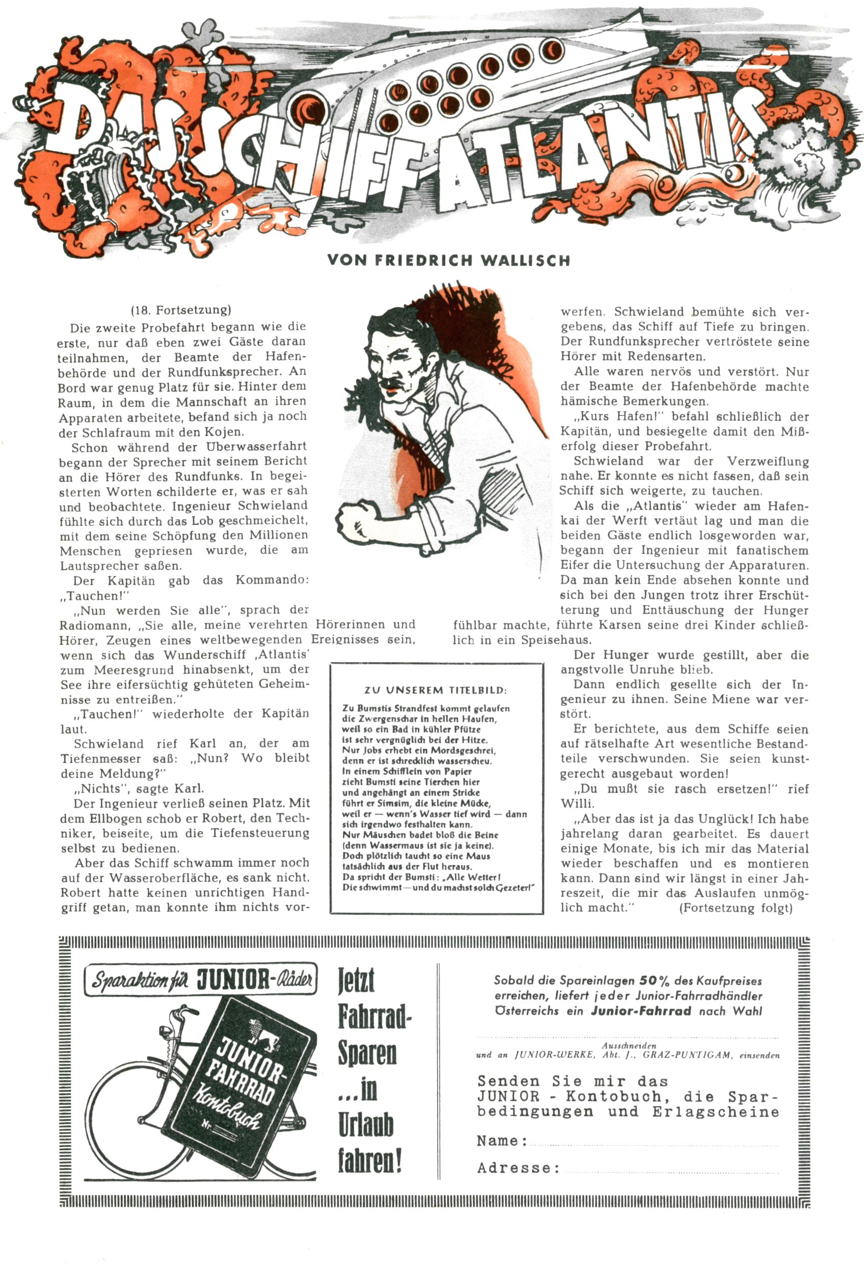 1953 – Alles beim Alten Wie lange darf man sich auf einem Erfolgskonzept ausruhen? Auch 1953 gab es keine offensichtlichen Änderungen am Layout der Zeitung. Zwar wurde Elfriede Vavrovsky teilweise durch andere Autoren abgelöst und erstmals kam Friedrich Bauer zum Zug, der bisher nur als Rätselonkel in Erscheinung getreten war. Allerdings ist anzunehmen, dass eine ganze Reihe unsignierter Erzählungen früherer Hefte ebenfalls der Feder von fb entstammen. ABC Peter Paul Prinz übernahm neuerlich die Illustration der technischen Seiten. Sein Willibald erschien ab sofort in 3 Spalten anstelle von 4 Zeilen, was ihm wesentlich mehr Gestaltungsfreiheit bot. Teja Aicher erfand die Clowns Benjamin und Kasimir nachdem ABC mit seiner Miniserie Zipferling, der lustige Kasperl bereits ein halbes Jahr zuvor durchaus mit Lachern punkten hatte können. Benjamin und Kasimir erschienen 1953 in jedem 2. Heft; nach dem Abdanken von Piff und Paff dann in jeder Ausgabe. Vom Aufbau her ähnelte die Serie dem Erfolgscartoon Willibald, der Zauberlehrling, ohne jedoch (aufgrund ihrer allzu "beschränkten" Möglichkeiten) an den Erfolg des Zauberlehrlings anknüpfen zu können. Nach dem Abschluss der Atlas-Daten und Karten erfand Annelies Umlauf Lamatsch weitere realitätsfremde Geschichten über die Natur und im Speziellen über Blumen. Eine medizinisch-biologische Spalte über den menschlichen Körper von Ewald Seifert war hingegen sachlicher und informativ. Ein kurzzeitiger Neuzugang bei den Grafikern war Hedwig Zumtobel. Sie wurde jedoch bald von Luzia Adelsberger abgelöst, die sich über Jahre hindurch als Zeichnerin etablierte. Friederike Nekut übernahm die Bastelseite für Mädchen. Die Kolumne Die Puppenschneiderin wurde mit Unser Hausmütterchen ergänzt, wodurch das handwerkliche Angebot für Mädchen erweitert werden konnte. Eine wesentliche Änderung am Titelblatt gab es 1953 aber doch: Endlich hatte man dem Erfolg von Zwerg Bumsti Rechnung getragen und ihn ins Logo erhoben. Er löste dort den Zwerg Bums aus dem Jahr 1948 in seiner Gondel ab, der zwar als Namenspatron für Zwerg Bumsti hergehalten hatte, mit dem es ansonsten aber keine Gemeinsamkeiten gab. |