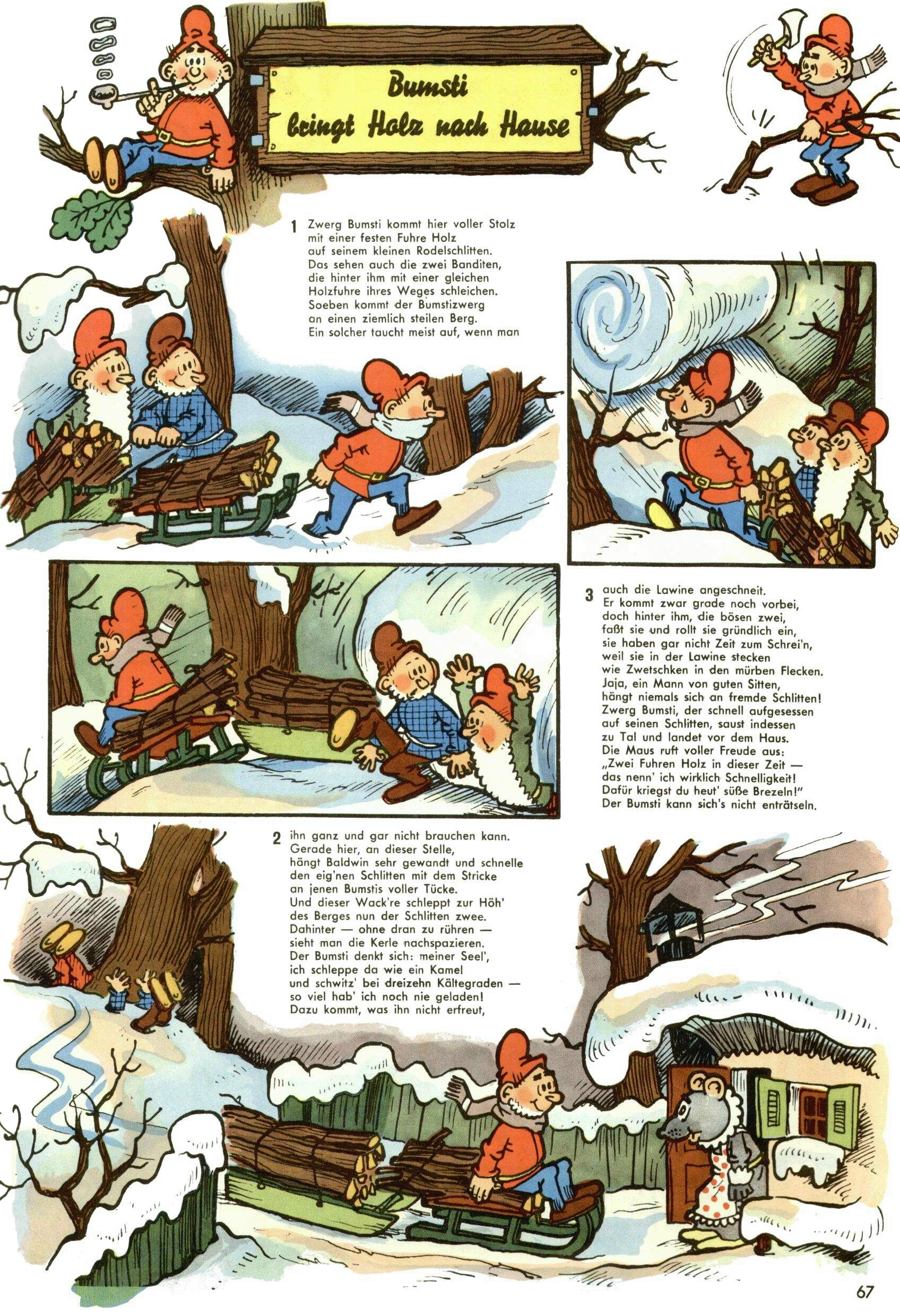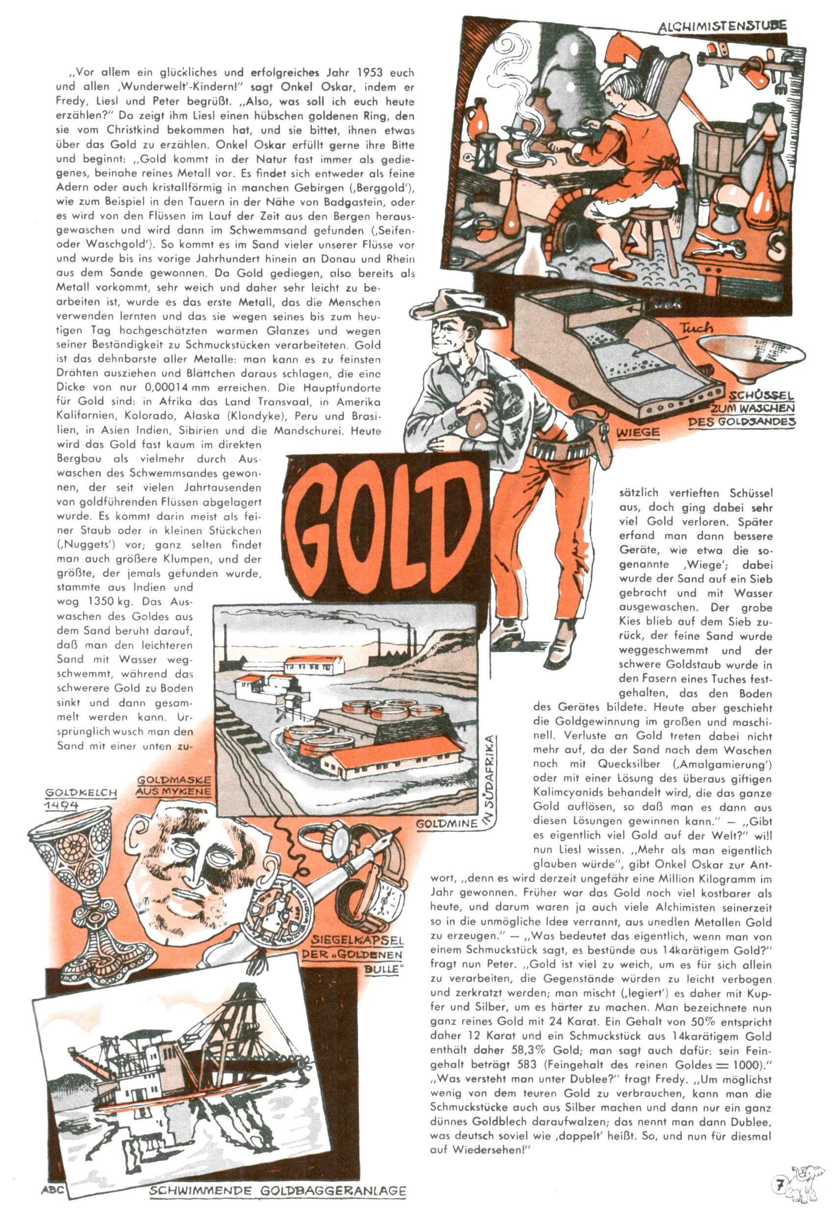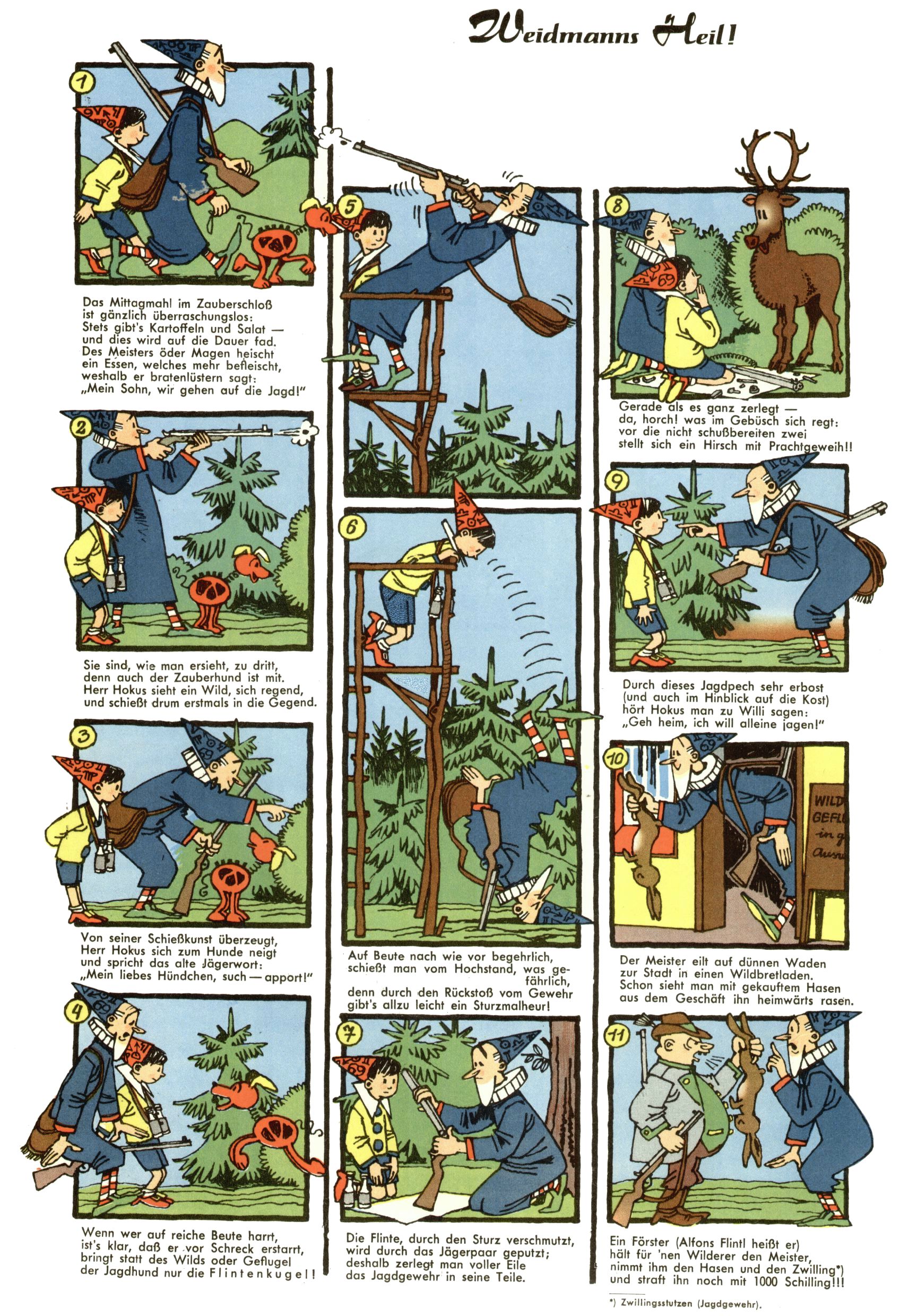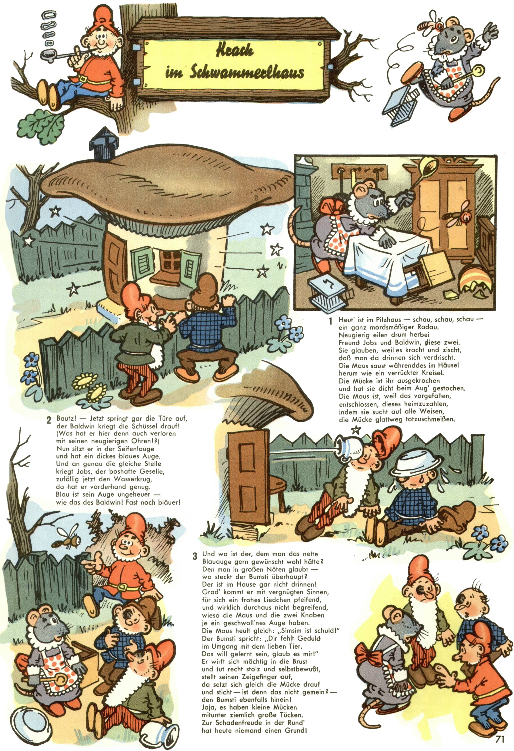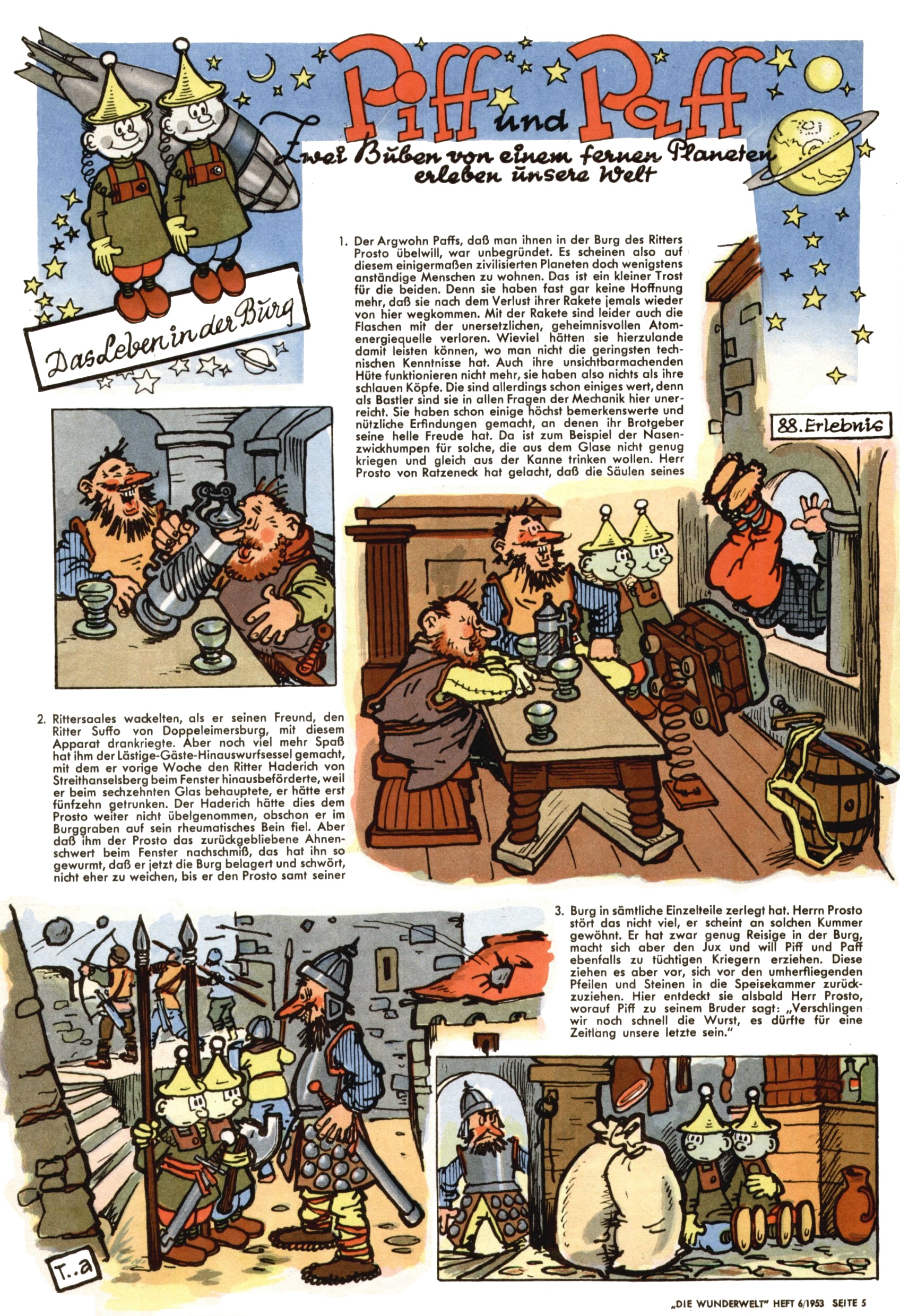 1953 – Alles beim Alten Wie lange darf man sich auf einem Erfolgskonzept ausruhen? Auch 1953 gab es keine offensichtlichen Änderungen am Layout der Zeitung. Zwar wurde Elfriede Vavrovsky teilweise durch andere Autoren abgelöst und erstmals kam Friedrich Bauer zum Zug, der bisher nur als Rätselonkel in Erscheinung getreten war. Allerdings ist anzunehmen, dass eine ganze Reihe unsignierter Erzählungen früherer Hefte ebenfalls der Feder von fb entstammen. ABC Peter Paul Prinz übernahm neuerlich die Illustration der technischen Seiten. Sein Willibald erschien ab sofort in 3 Spalten anstelle von 4 Zeilen, was ihm wesentlich mehr Gestaltungsfreiheit bot. Teja Aicher erfand die Clowns Benjamin und Kasimir nachdem ABC mit seiner Miniserie Zipferling, der lustige Kasperl bereits ein halbes Jahr zuvor durchaus mit Lachern punkten hatte können. Benjamin und Kasimir erschienen 1953 in jedem 2. Heft; nach dem Abdanken von Piff und Paff dann in jeder Ausgabe. Vom Aufbau her ähnelte die Serie dem Erfolgscartoon Willibald, der Zauberlehrling, ohne jedoch (aufgrund ihrer allzu "beschränkten" Möglichkeiten) an den Erfolg des Zauberlehrlings anknüpfen zu können. Nach dem Abschluss der Atlas-Daten und Karten erfand Annelies Umlauf Lamatsch weitere realitätsfremde Geschichten über die Natur und im Speziellen über Blumen. Eine medizinisch-biologische Spalte über den menschlichen Körper von Ewald Seifert war hingegen sachlicher und informativ. Ein kurzzeitiger Neuzugang bei den Grafikern war Hedwig Zumtobel. Sie wurde jedoch bald von Luzia Adelsberger abgelöst, die sich über Jahre hindurch als Zeichnerin etablierte. Friederike Nekut übernahm die Bastelseite für Mädchen. Die Kolumne Die Puppenschneiderin wurde mit Unser Hausmütterchen ergänzt, wodurch das handwerkliche Angebot für Mädchen erweitert werden konnte. Eine wesentliche Änderung am Titelblatt gab es 1953 aber doch: Endlich hatte man dem Erfolg von Zwerg Bumsti Rechnung getragen und ihn ins Logo erhoben. Er löste dort den Zwerg Bums aus dem Jahr 1948 in seiner Gondel ab, der zwar als Namenspatron für Zwerg Bumsti hergehalten hatte, mit dem es ansonsten aber keine Gemeinsamkeiten gab. |