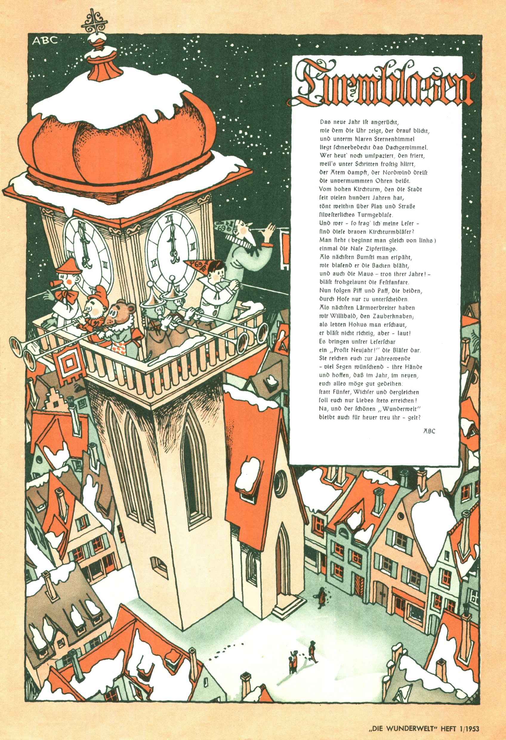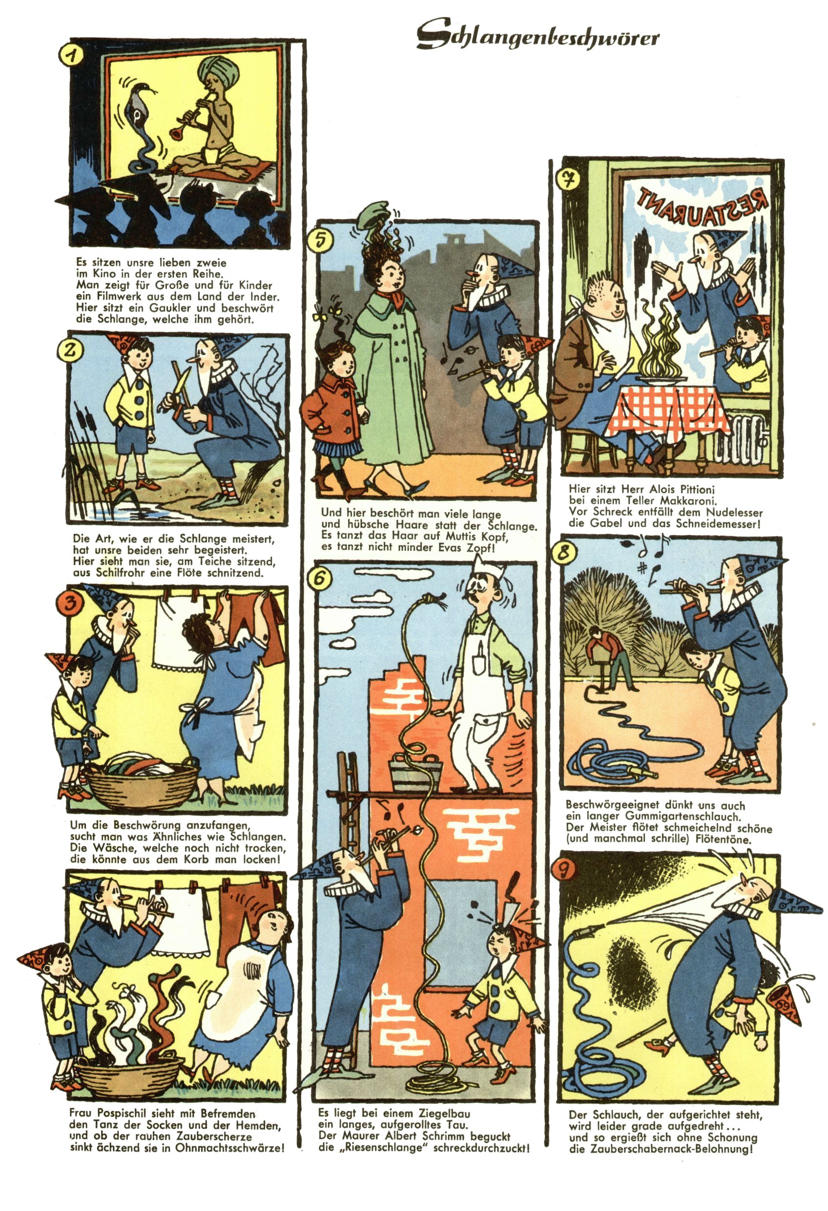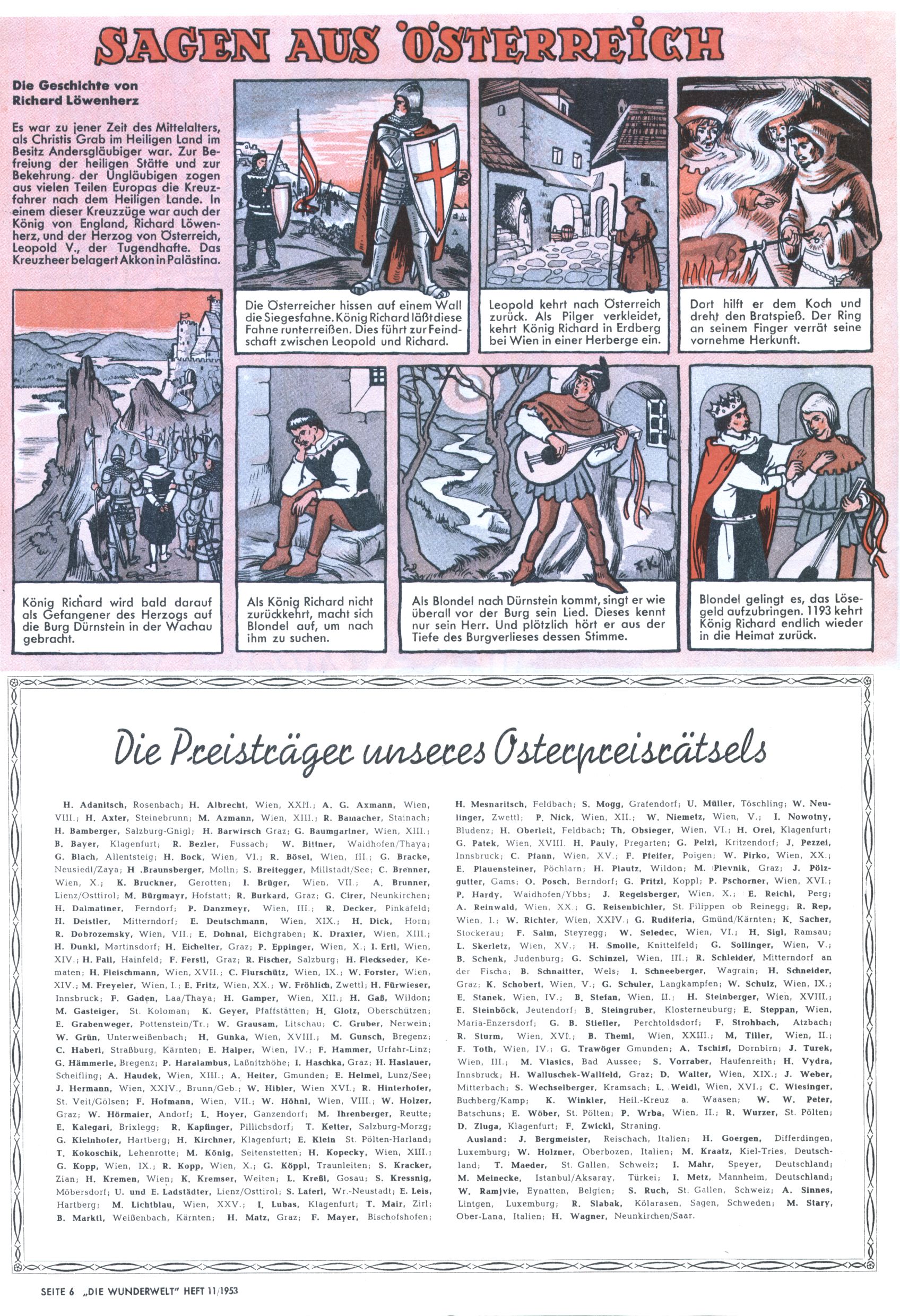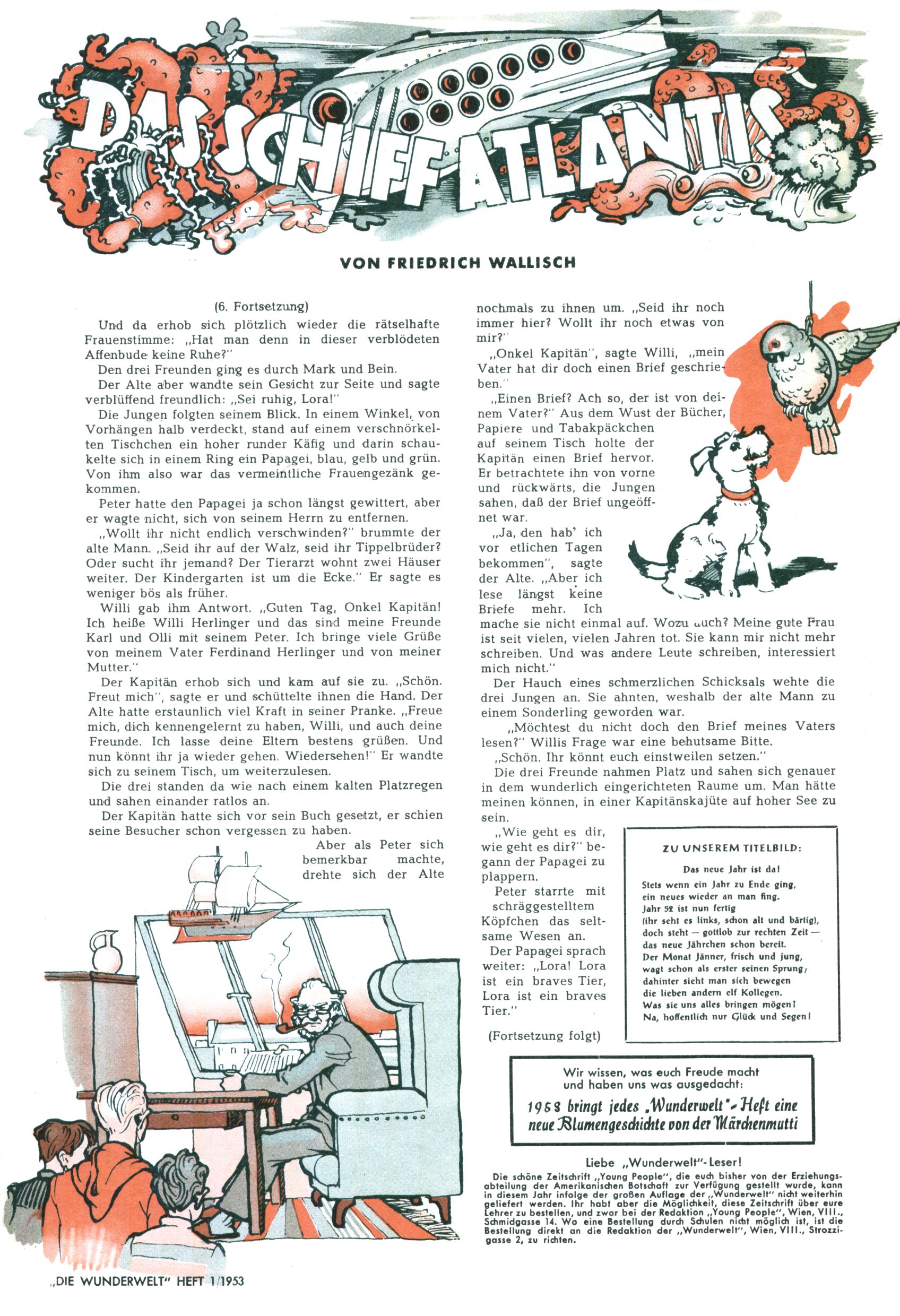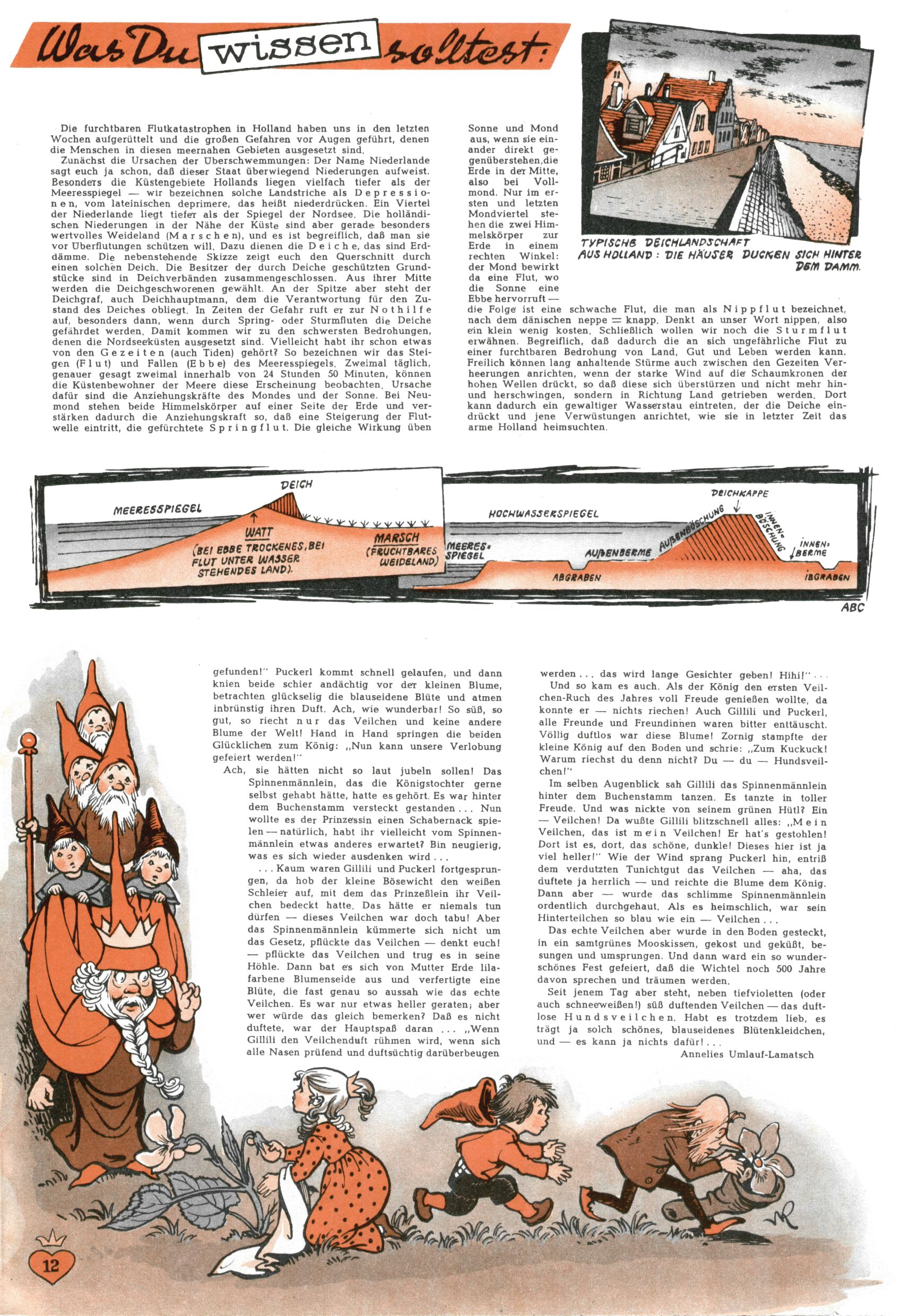 1953 – Alles beim Alten Wie lange darf man sich auf einem Erfolgskonzept ausruhen? Auch 1953 gab es keine offensichtlichen Änderungen am Layout der Zeitung. Zwar wurde Elfriede Vavrovsky teilweise durch andere Autoren abgelöst und erstmals kam Friedrich Bauer zum Zug, der bisher nur als Rätselonkel in Erscheinung getreten war. Allerdings ist anzunehmen, dass eine ganze Reihe unsignierter Erzählungen früherer Hefte ebenfalls der Feder von fb entstammen. ABC Peter Paul Prinz übernahm neuerlich die Illustration der technischen Seiten. Sein Willibald erschien ab sofort in 3 Spalten anstelle von 4 Zeilen, was ihm wesentlich mehr Gestaltungsfreiheit bot. Teja Aicher erfand die Clowns Benjamin und Kasimir nachdem ABC mit seiner Miniserie Zipferling, der lustige Kasperl bereits ein halbes Jahr zuvor durchaus mit Lachern punkten hatte können. Benjamin und Kasimir erschienen 1953 in jedem 2. Heft; nach dem Abdanken von Piff und Paff dann in jeder Ausgabe. Vom Aufbau her ähnelte die Serie dem Erfolgscartoon Willibald, der Zauberlehrling, ohne jedoch (aufgrund ihrer allzu "beschränkten" Möglichkeiten) an den Erfolg des Zauberlehrlings anknüpfen zu können. Nach dem Abschluss der Atlas-Daten und Karten erfand Annelies Umlauf Lamatsch weitere realitätsfremde Geschichten über die Natur und im Speziellen über Blumen. Eine medizinisch-biologische Spalte über den menschlichen Körper von Ewald Seifert war hingegen sachlicher und informativ. Ein kurzzeitiger Neuzugang bei den Grafikern war Hedwig Zumtobel. Sie wurde jedoch bald von Luzia Adelsberger abgelöst, die sich über Jahre hindurch als Zeichnerin etablierte. Friederike Nekut übernahm die Bastelseite für Mädchen. Die Kolumne Die Puppenschneiderin wurde mit Unser Hausmütterchen ergänzt, wodurch das handwerkliche Angebot für Mädchen erweitert werden konnte. Eine wesentliche Änderung am Titelblatt gab es 1953 aber doch: Endlich hatte man dem Erfolg von Zwerg Bumsti Rechnung getragen und ihn ins Logo erhoben. Er löste dort den Zwerg Bums aus dem Jahr 1948 in seiner Gondel ab, der zwar als Namenspatron für Zwerg Bumsti hergehalten hatte, mit dem es ansonsten aber keine Gemeinsamkeiten gab. |