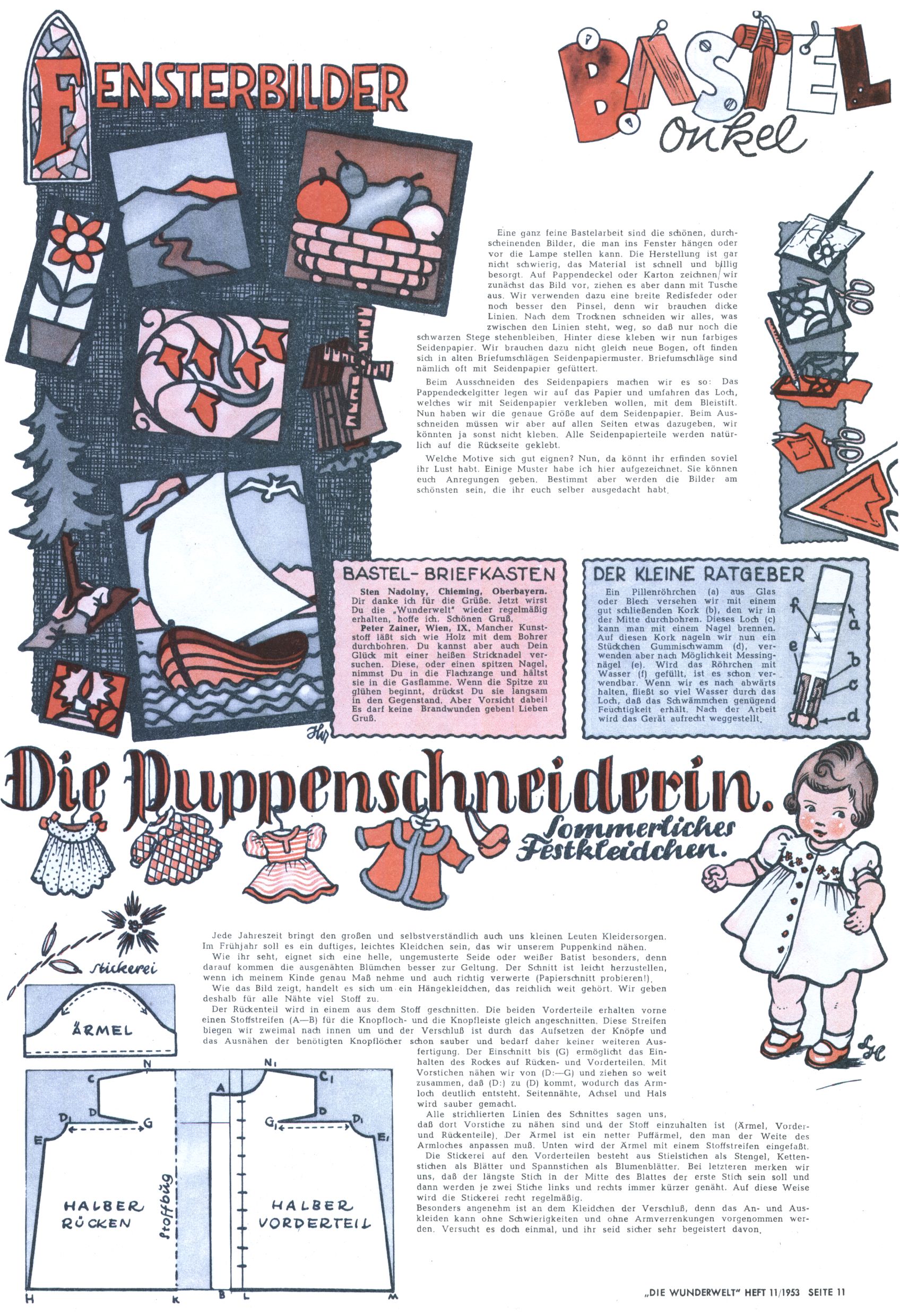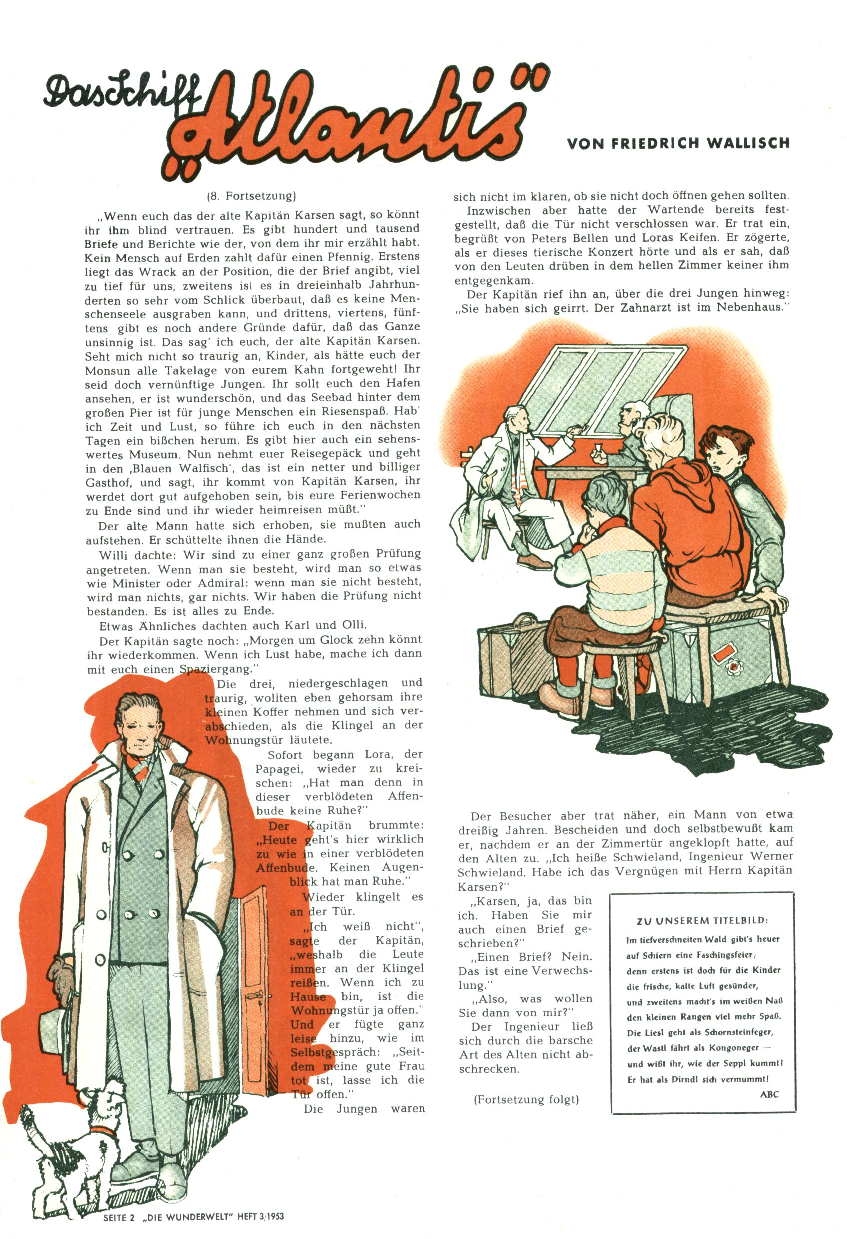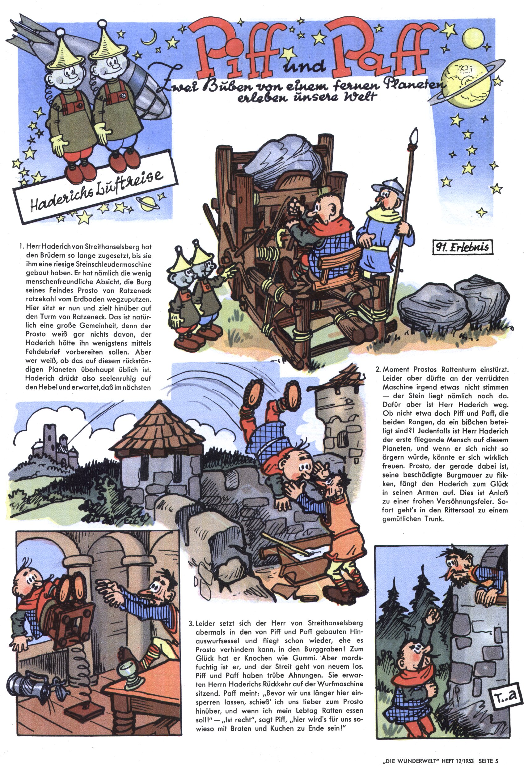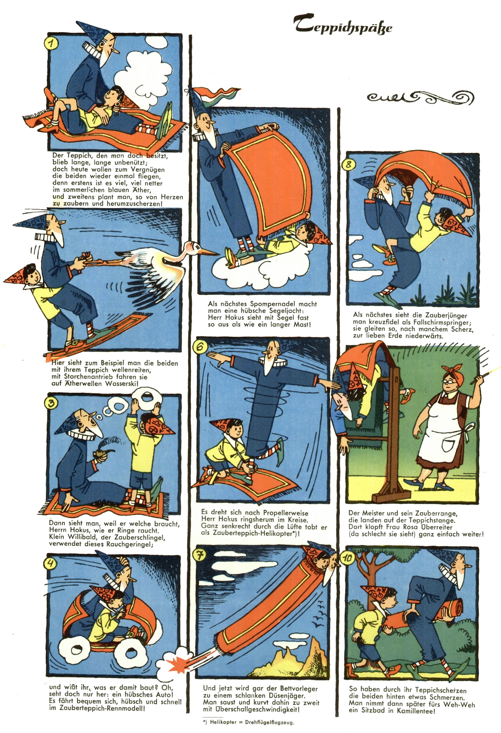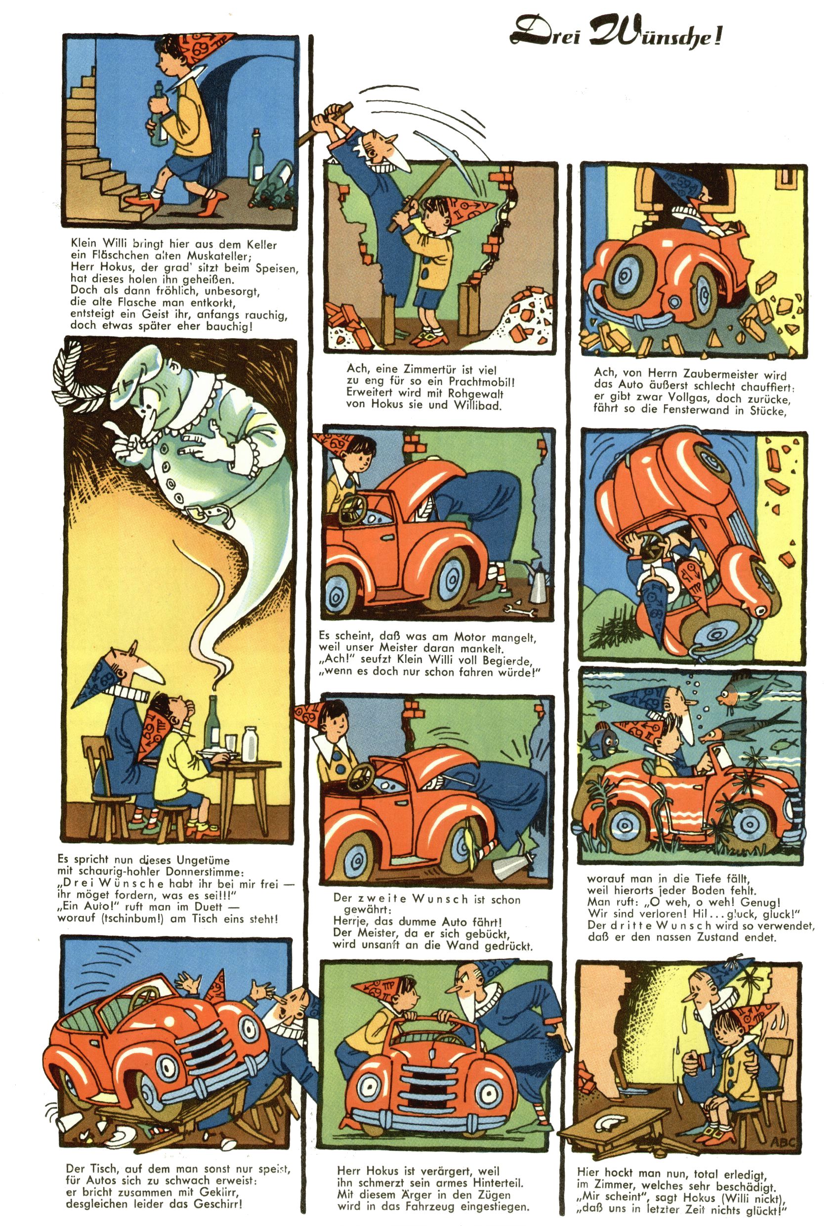 1953 – Alles beim Alten Wie lange darf man sich auf einem Erfolgskonzept ausruhen? Auch 1953 gab es keine offensichtlichen Änderungen am Layout der Zeitung. Zwar wurde Elfriede Vavrovsky teilweise durch andere Autoren abgelöst und erstmals kam Friedrich Bauer zum Zug, der bisher nur als Rätselonkel in Erscheinung getreten war. Allerdings ist anzunehmen, dass eine ganze Reihe unsignierter Erzählungen früherer Hefte ebenfalls der Feder von fb entstammen. ABC Peter Paul Prinz übernahm neuerlich die Illustration der technischen Seiten. Sein Willibald erschien ab sofort in 3 Spalten anstelle von 4 Zeilen, was ihm wesentlich mehr Gestaltungsfreiheit bot. Teja Aicher erfand die Clowns Benjamin und Kasimir nachdem ABC mit seiner Miniserie Zipferling, der lustige Kasperl bereits ein halbes Jahr zuvor durchaus mit Lachern punkten hatte können. Benjamin und Kasimir erschienen 1953 in jedem 2. Heft; nach dem Abdanken von Piff und Paff dann in jeder Ausgabe. Vom Aufbau her ähnelte die Serie dem Erfolgscartoon Willibald, der Zauberlehrling, ohne jedoch (aufgrund ihrer allzu "beschränkten" Möglichkeiten) an den Erfolg des Zauberlehrlings anknüpfen zu können. Nach dem Abschluss der Atlas-Daten und Karten erfand Annelies Umlauf Lamatsch weitere realitätsfremde Geschichten über die Natur und im Speziellen über Blumen. Eine medizinisch-biologische Spalte über den menschlichen Körper von Ewald Seifert war hingegen sachlicher und informativ. Ein kurzzeitiger Neuzugang bei den Grafikern war Hedwig Zumtobel. Sie wurde jedoch bald von Luzia Adelsberger abgelöst, die sich über Jahre hindurch als Zeichnerin etablierte. Friederike Nekut übernahm die Bastelseite für Mädchen. Die Kolumne Die Puppenschneiderin wurde mit Unser Hausmütterchen ergänzt, wodurch das handwerkliche Angebot für Mädchen erweitert werden konnte. Eine wesentliche Änderung am Titelblatt gab es 1953 aber doch: Endlich hatte man dem Erfolg von Zwerg Bumsti Rechnung getragen und ihn ins Logo erhoben. Er löste dort den Zwerg Bums aus dem Jahr 1948 in seiner Gondel ab, der zwar als Namenspatron für Zwerg Bumsti hergehalten hatte, mit dem es ansonsten aber keine Gemeinsamkeiten gab. |