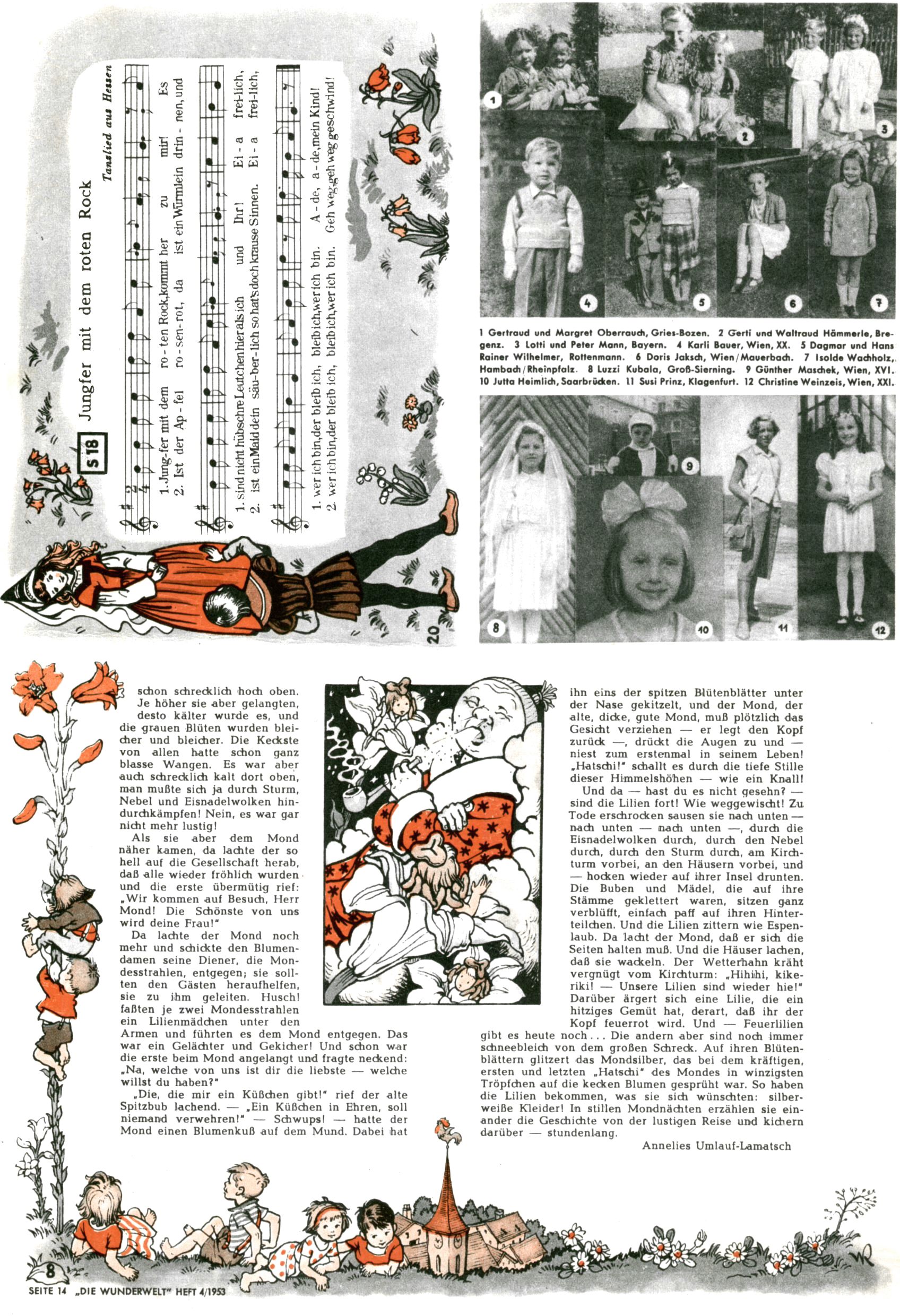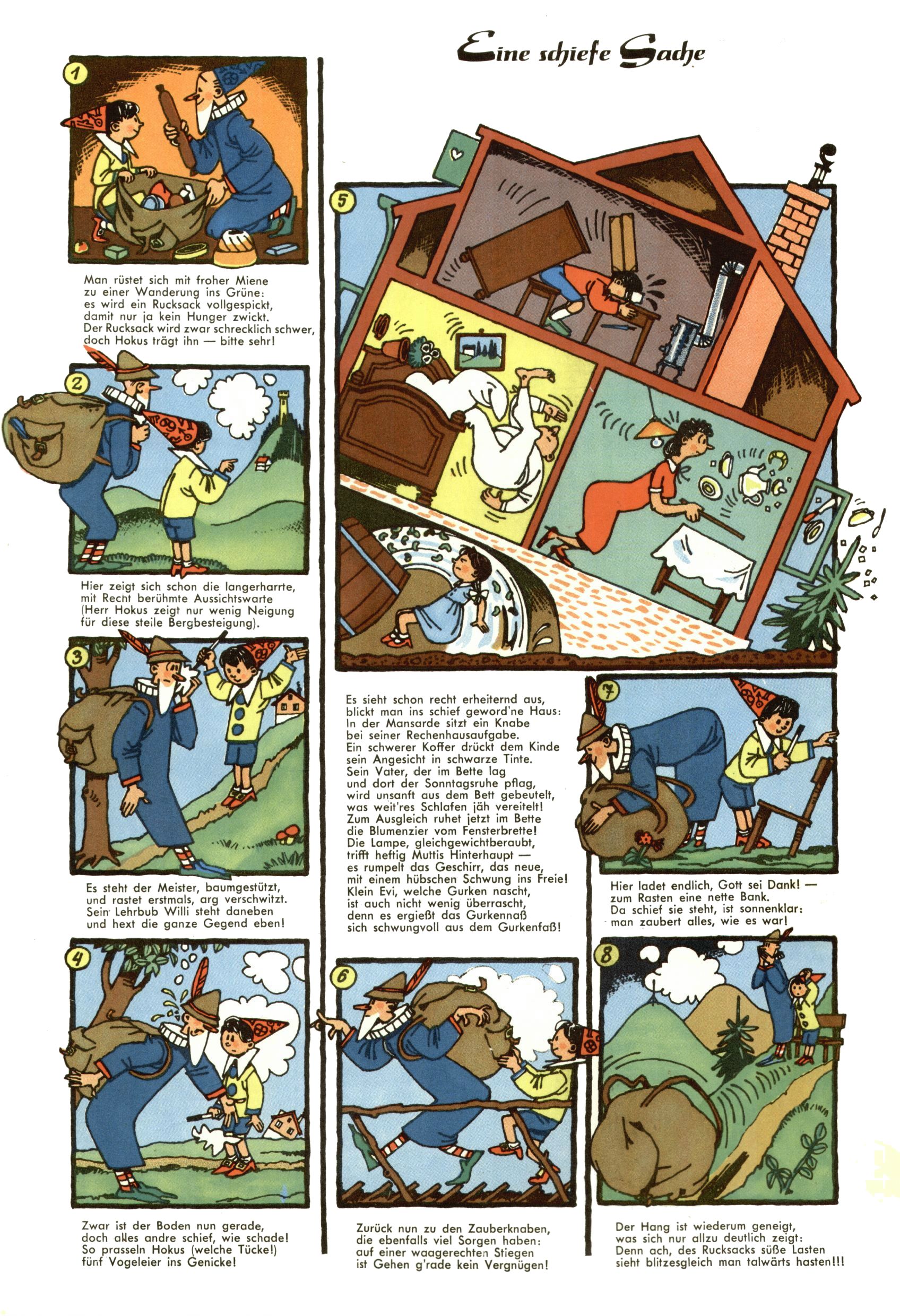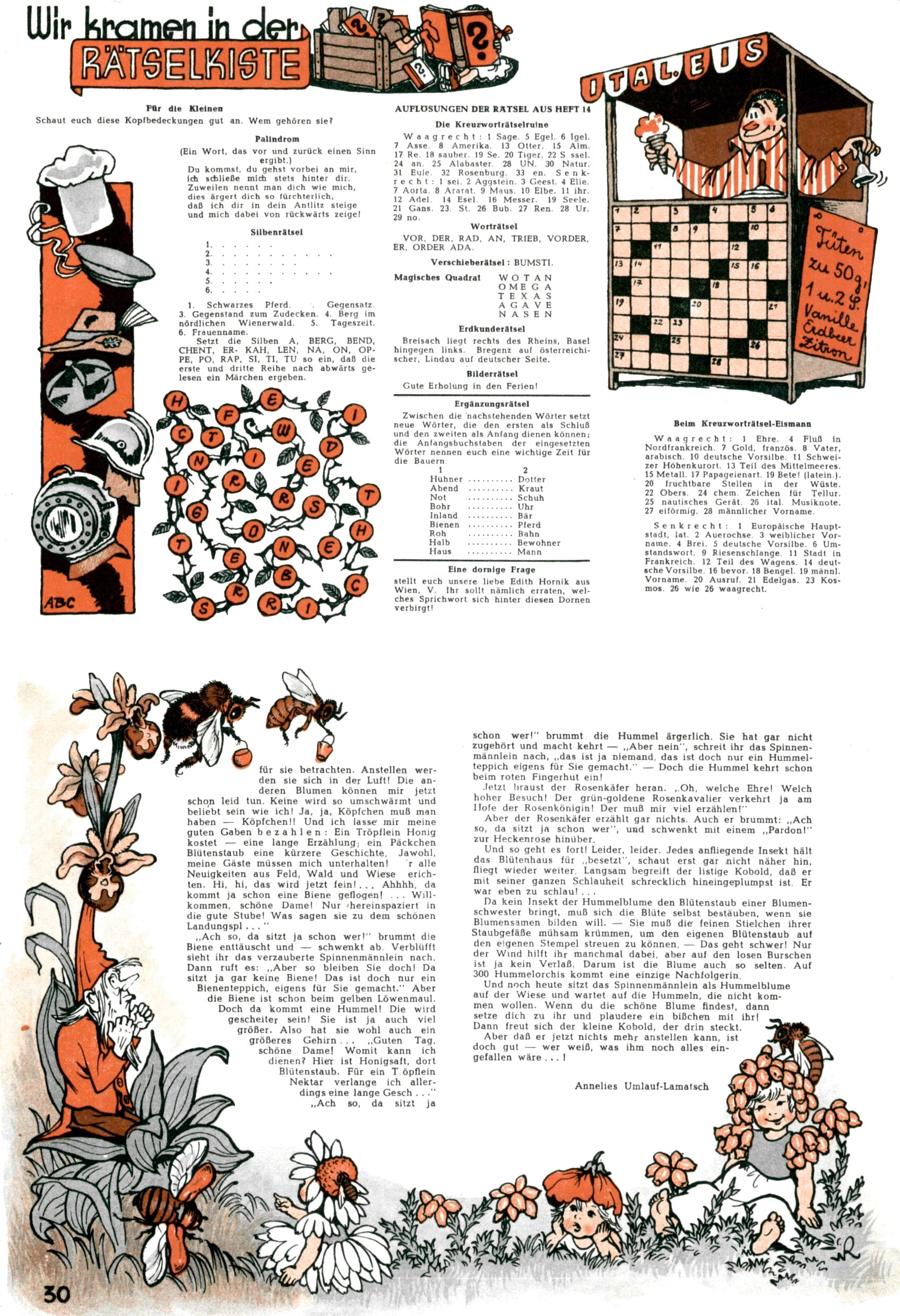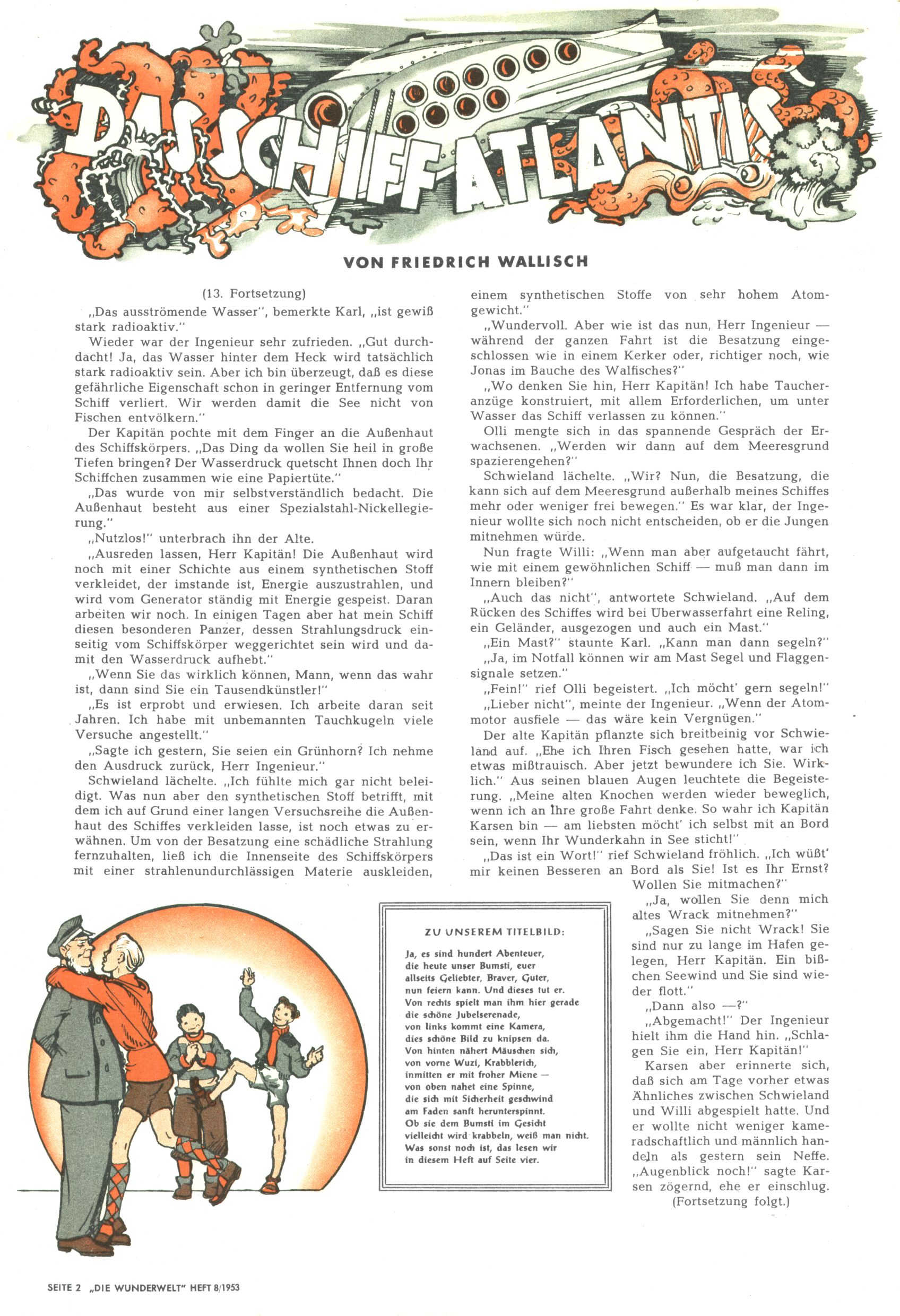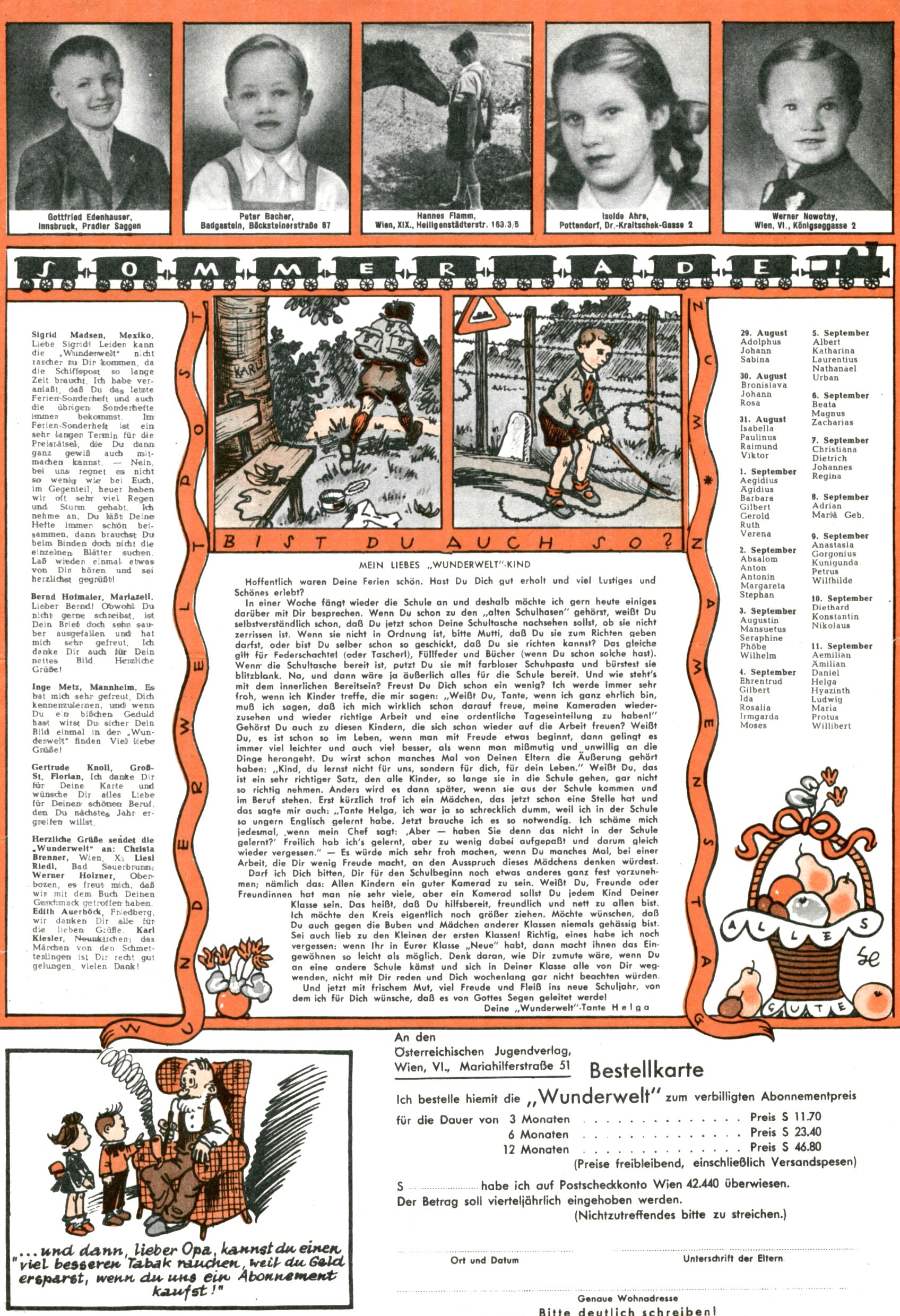1953 – Alles beim Alten Wie lange darf man sich auf einem Erfolgskonzept ausruhen? Auch 1953 gab es keine offensichtlichen Änderungen am Layout der Zeitung. Zwar wurde Elfriede Vavrovsky teilweise durch andere Autoren abgelöst und erstmals kam Friedrich Bauer zum Zug, der bisher nur als Rätselonkel in Erscheinung getreten war. Allerdings ist anzunehmen, dass eine ganze Reihe unsignierter Erzählungen früherer Hefte ebenfalls der Feder von fb entstammen. ABC Peter Paul Prinz übernahm neuerlich die Illustration der technischen Seiten. Sein Willibald erschien ab sofort in 3 Spalten anstelle von 4 Zeilen, was ihm wesentlich mehr Gestaltungsfreiheit bot. Teja Aicher erfand die Clowns Benjamin und Kasimir nachdem ABC mit seiner Miniserie Zipferling, der lustige Kasperl bereits ein halbes Jahr zuvor durchaus mit Lachern punkten hatte können. Benjamin und Kasimir erschienen 1953 in jedem 2. Heft; nach dem Abdanken von Piff und Paff dann in jeder Ausgabe. Vom Aufbau her ähnelte die Serie dem Erfolgscartoon Willibald, der Zauberlehrling, ohne jedoch (aufgrund ihrer allzu "beschränkten" Möglichkeiten) an den Erfolg des Zauberlehrlings anknüpfen zu können. Nach dem Abschluss der Atlas-Daten und Karten erfand Annelies Umlauf Lamatsch weitere realitätsfremde Geschichten über die Natur und im Speziellen über Blumen. Eine medizinisch-biologische Spalte über den menschlichen Körper von Ewald Seifert war hingegen sachlicher und informativ. Ein kurzzeitiger Neuzugang bei den Grafikern war Hedwig Zumtobel. Sie wurde jedoch bald von Luzia Adelsberger abgelöst, die sich über Jahre hindurch als Zeichnerin etablierte. Friederike Nekut übernahm die Bastelseite für Mädchen. Die Kolumne Die Puppenschneiderin wurde mit Unser Hausmütterchen ergänzt, wodurch das handwerkliche Angebot für Mädchen erweitert werden konnte. Eine wesentliche Änderung am Titelblatt gab es 1953 aber doch: Endlich hatte man dem Erfolg von Zwerg Bumsti Rechnung getragen und ihn ins Logo erhoben. Er löste dort den Zwerg Bums aus dem Jahr 1948 in seiner Gondel ab, der zwar als Namenspatron für Zwerg Bumsti hergehalten hatte, mit dem es ansonsten aber keine Gemeinsamkeiten gab. |