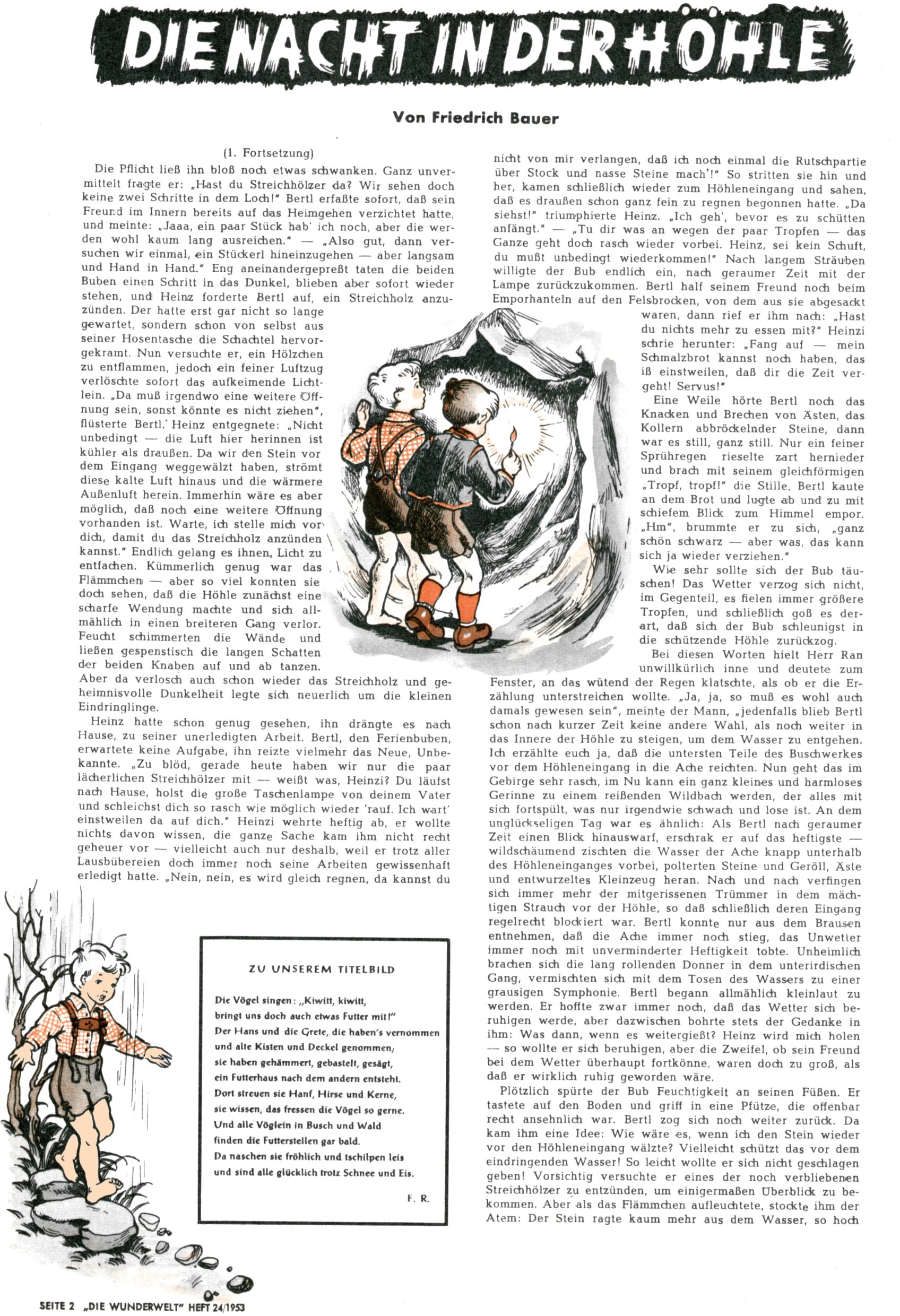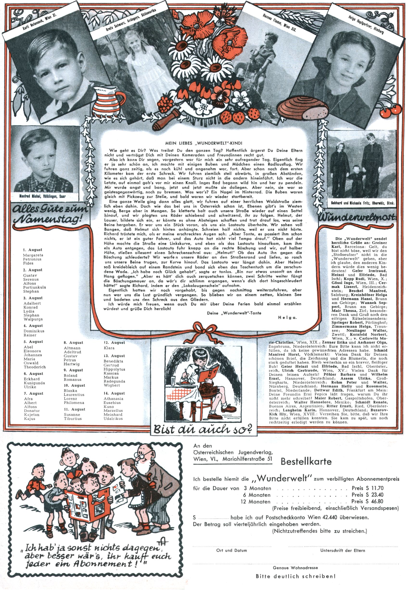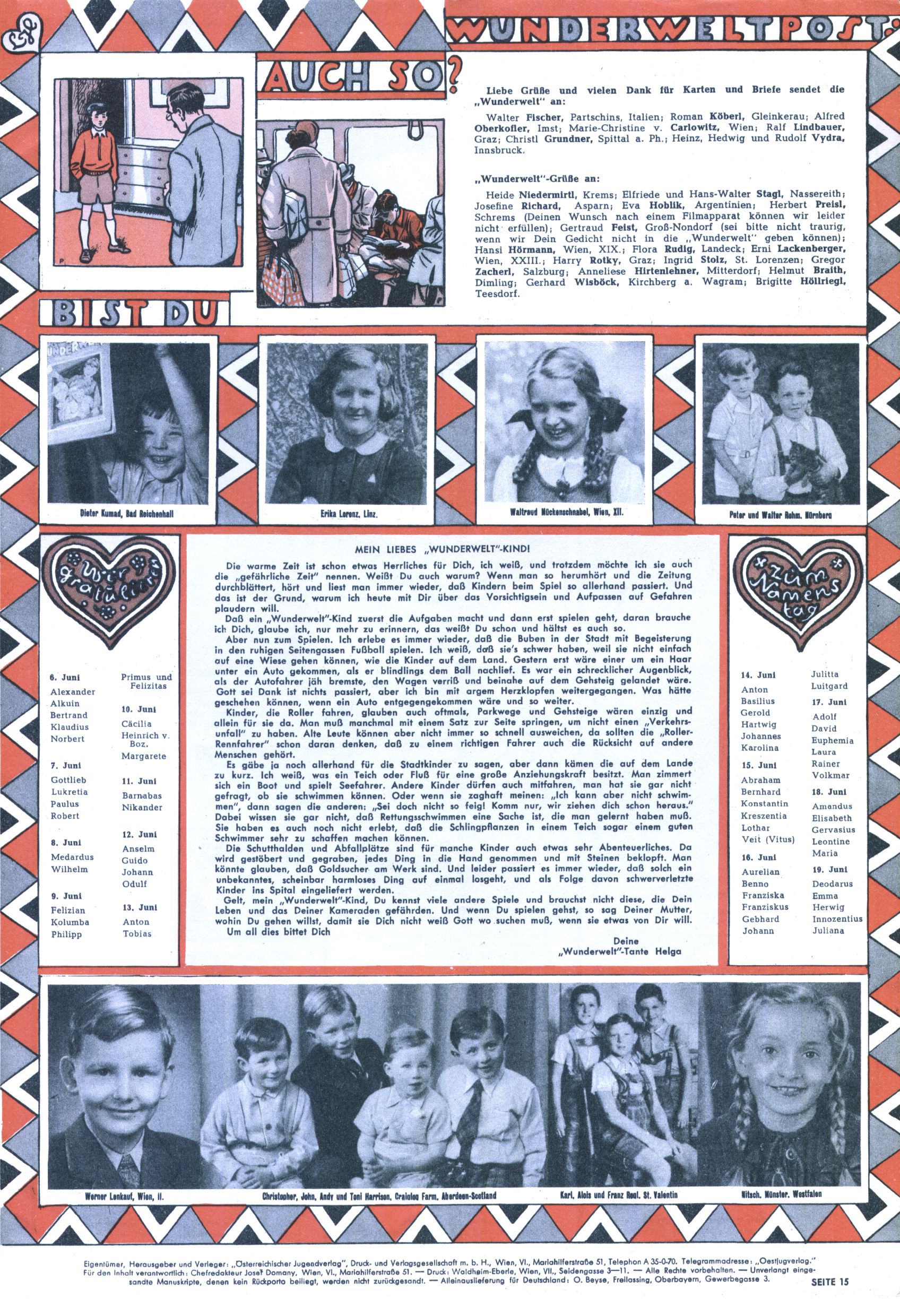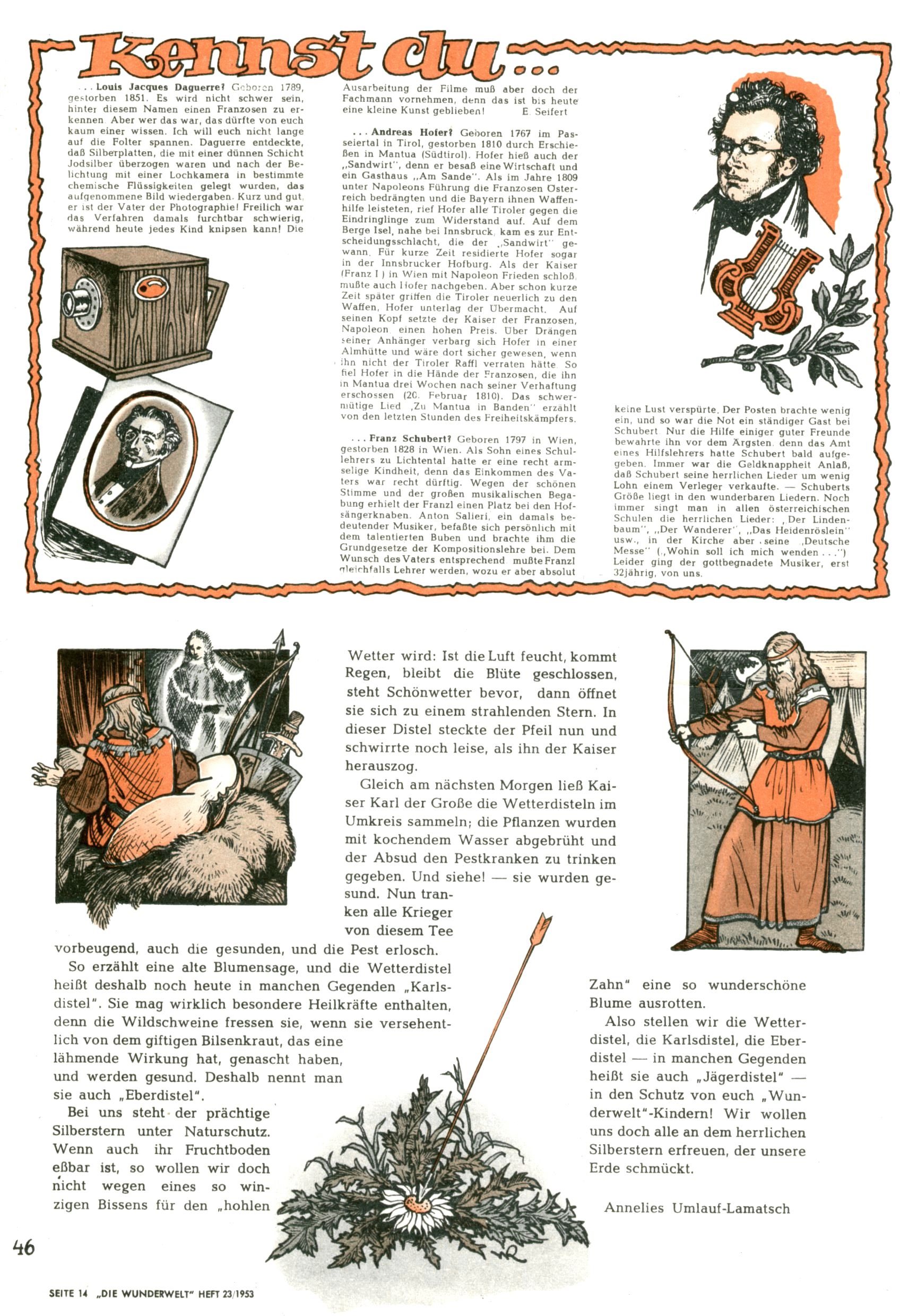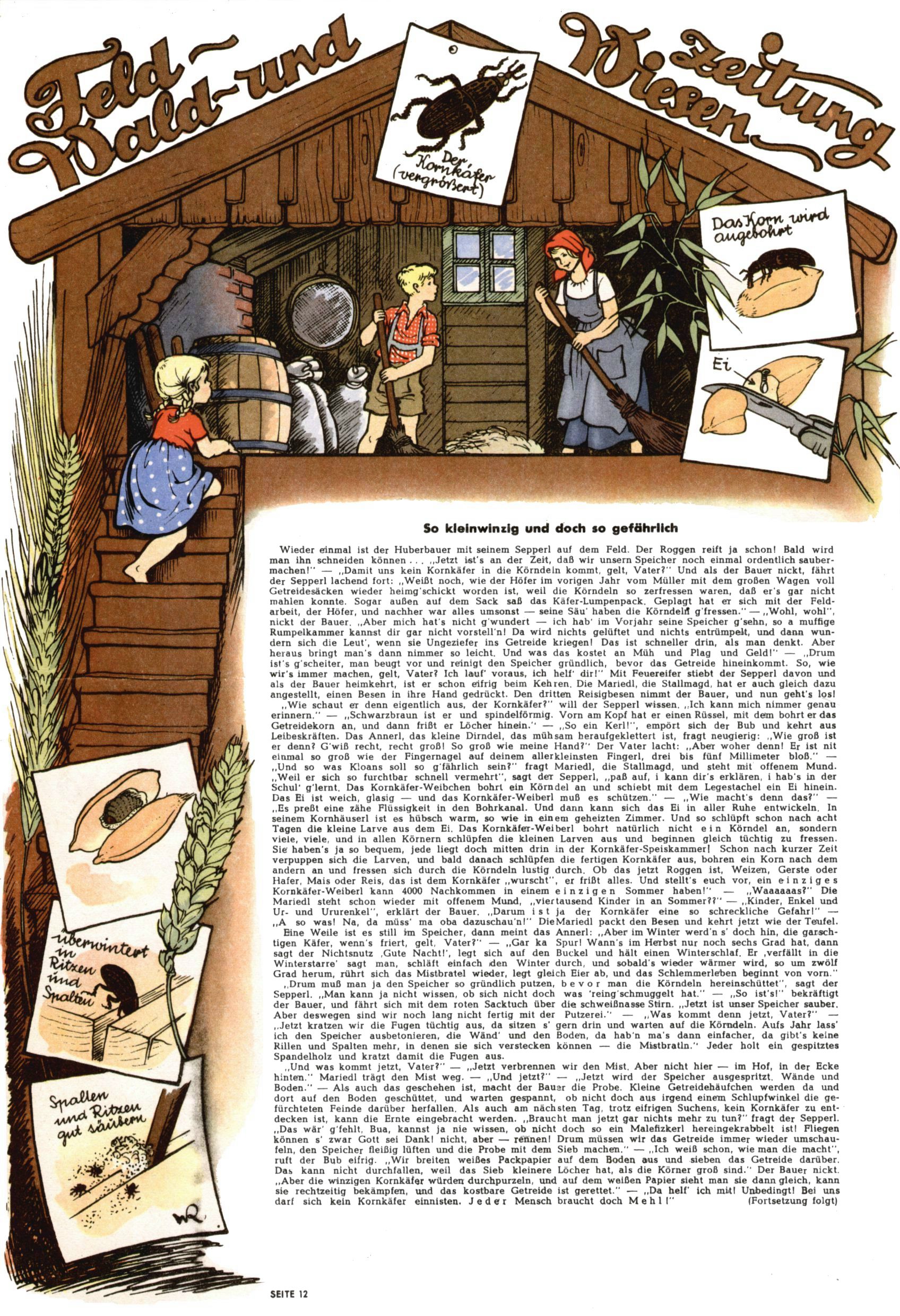 1953 – Alles beim Alten Wie lange darf man sich auf einem Erfolgskonzept ausruhen? Auch 1953 gab es keine offensichtlichen Änderungen am Layout der Zeitung. Zwar wurde Elfriede Vavrovsky teilweise durch andere Autoren abgelöst und erstmals kam Friedrich Bauer zum Zug, der bisher nur als Rätselonkel in Erscheinung getreten war. Allerdings ist anzunehmen, dass eine ganze Reihe unsignierter Erzählungen früherer Hefte ebenfalls der Feder von fb entstammen. ABC Peter Paul Prinz übernahm neuerlich die Illustration der technischen Seiten. Sein Willibald erschien ab sofort in 3 Spalten anstelle von 4 Zeilen, was ihm wesentlich mehr Gestaltungsfreiheit bot. Teja Aicher erfand die Clowns Benjamin und Kasimir nachdem ABC mit seiner Miniserie Zipferling, der lustige Kasperl bereits ein halbes Jahr zuvor durchaus mit Lachern punkten hatte können. Benjamin und Kasimir erschienen 1953 in jedem 2. Heft; nach dem Abdanken von Piff und Paff dann in jeder Ausgabe. Vom Aufbau her ähnelte die Serie dem Erfolgscartoon Willibald, der Zauberlehrling, ohne jedoch (aufgrund ihrer allzu "beschränkten" Möglichkeiten) an den Erfolg des Zauberlehrlings anknüpfen zu können. Nach dem Abschluss der Atlas-Daten und Karten erfand Annelies Umlauf Lamatsch weitere realitätsfremde Geschichten über die Natur und im Speziellen über Blumen. Eine medizinisch-biologische Spalte über den menschlichen Körper von Ewald Seifert war hingegen sachlicher und informativ. Ein kurzzeitiger Neuzugang bei den Grafikern war Hedwig Zumtobel. Sie wurde jedoch bald von Luzia Adelsberger abgelöst, die sich über Jahre hindurch als Zeichnerin etablierte. Friederike Nekut übernahm die Bastelseite für Mädchen. Die Kolumne Die Puppenschneiderin wurde mit Unser Hausmütterchen ergänzt, wodurch das handwerkliche Angebot für Mädchen erweitert werden konnte. Eine wesentliche Änderung am Titelblatt gab es 1953 aber doch: Endlich hatte man dem Erfolg von Zwerg Bumsti Rechnung getragen und ihn ins Logo erhoben. Er löste dort den Zwerg Bums aus dem Jahr 1948 in seiner Gondel ab, der zwar als Namenspatron für Zwerg Bumsti hergehalten hatte, mit dem es ansonsten aber keine Gemeinsamkeiten gab. |