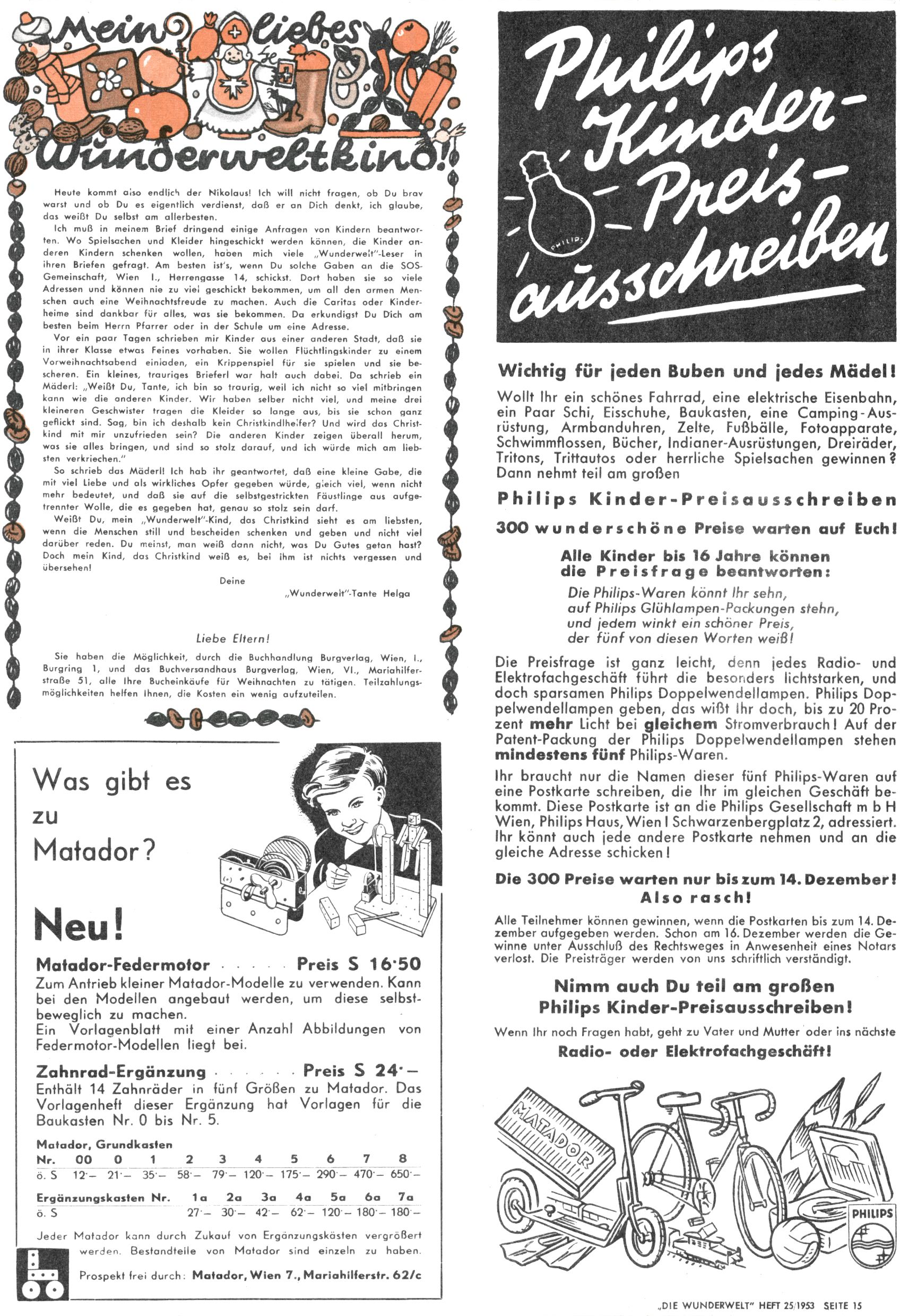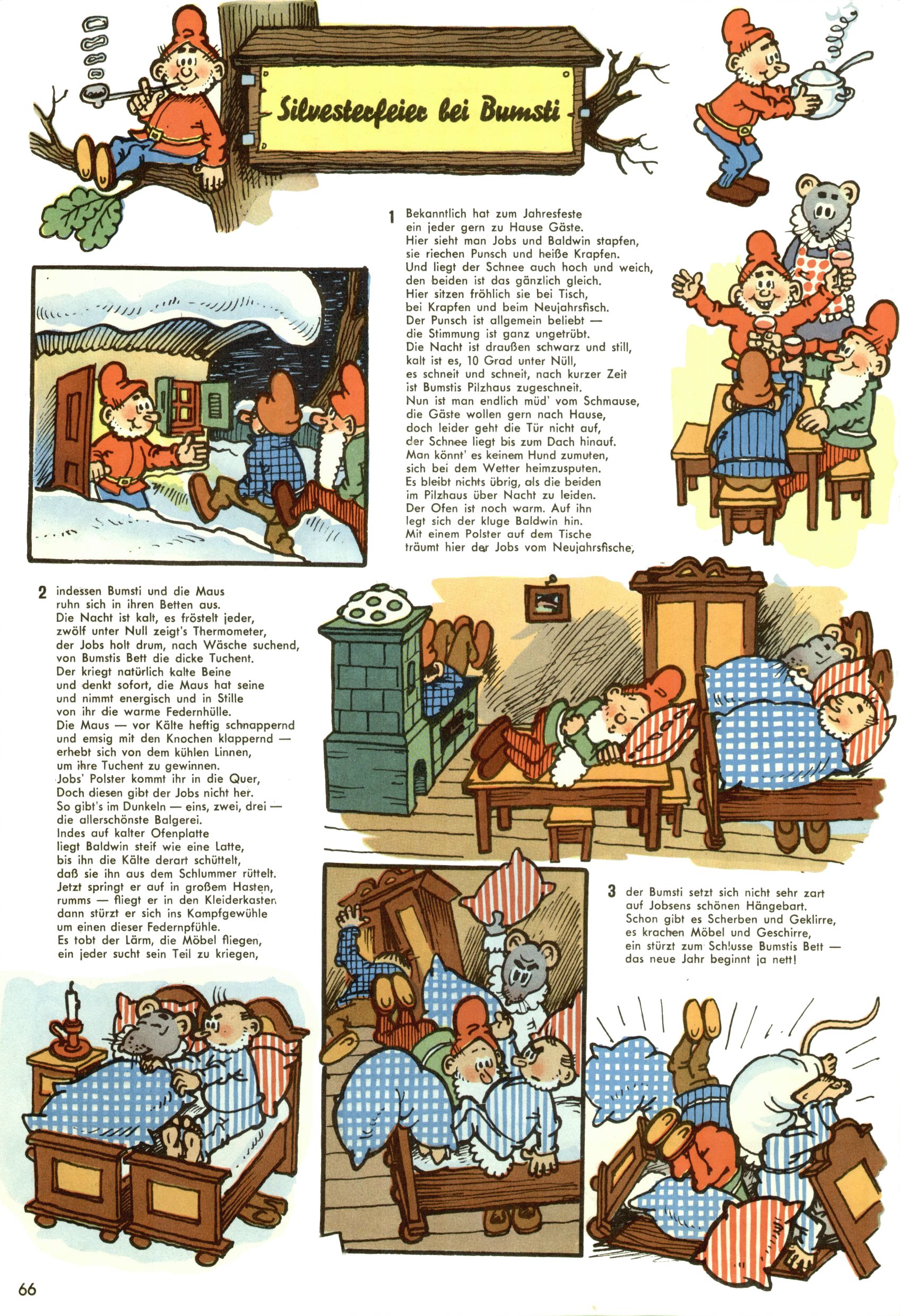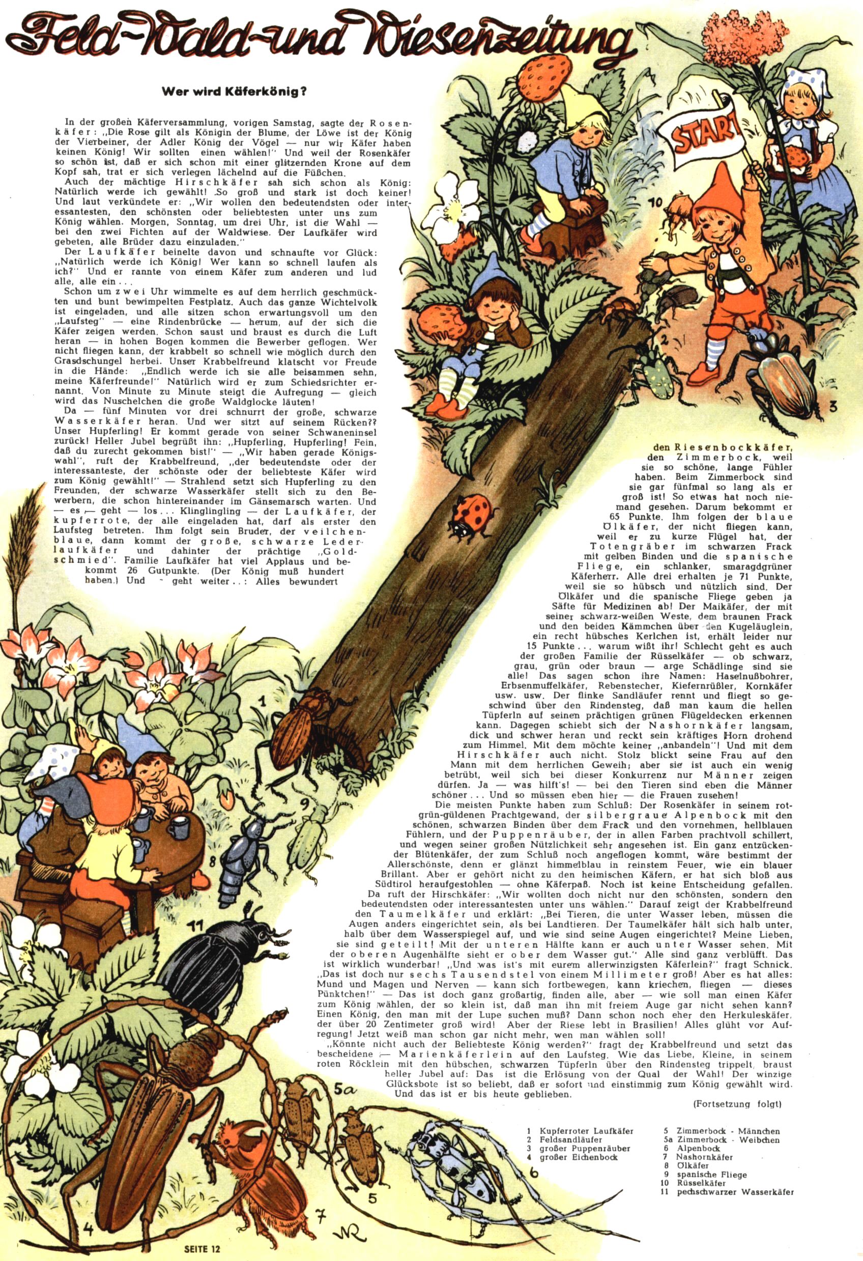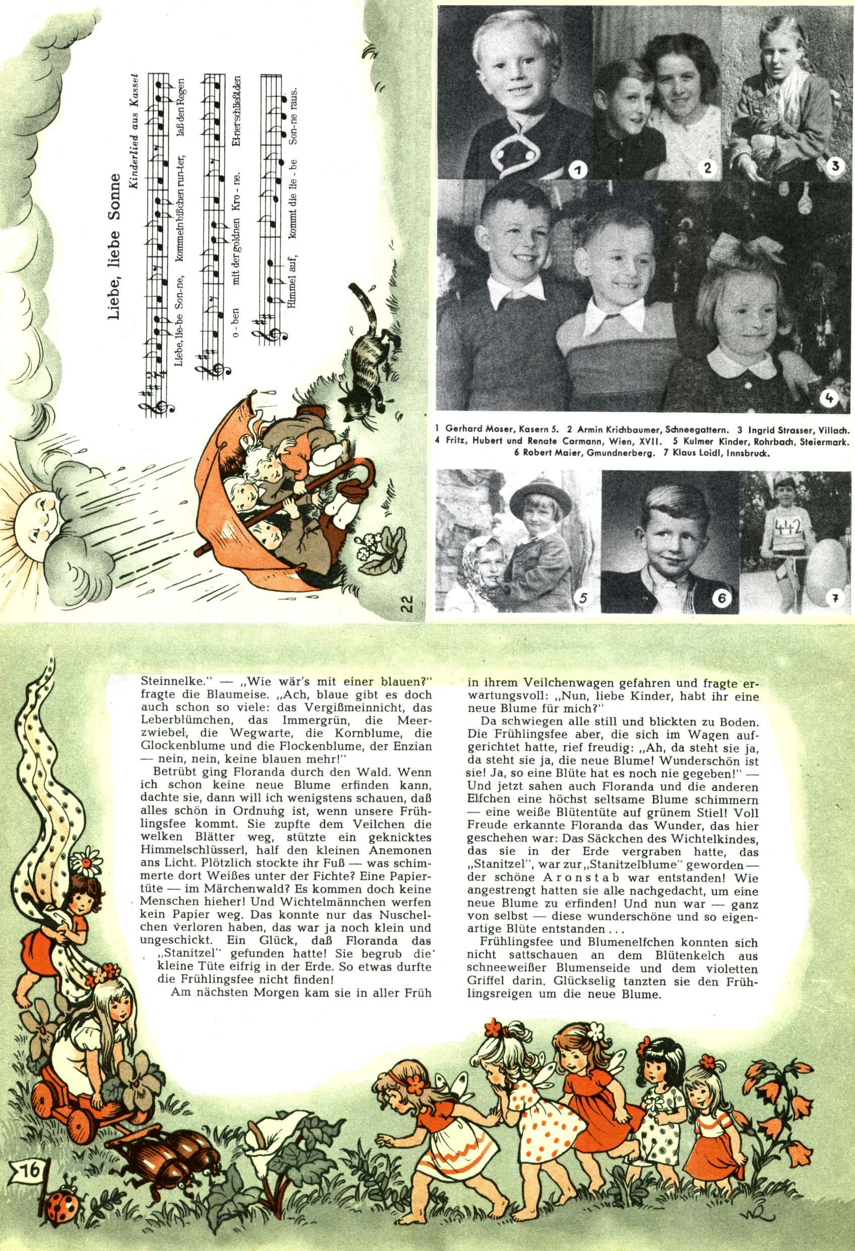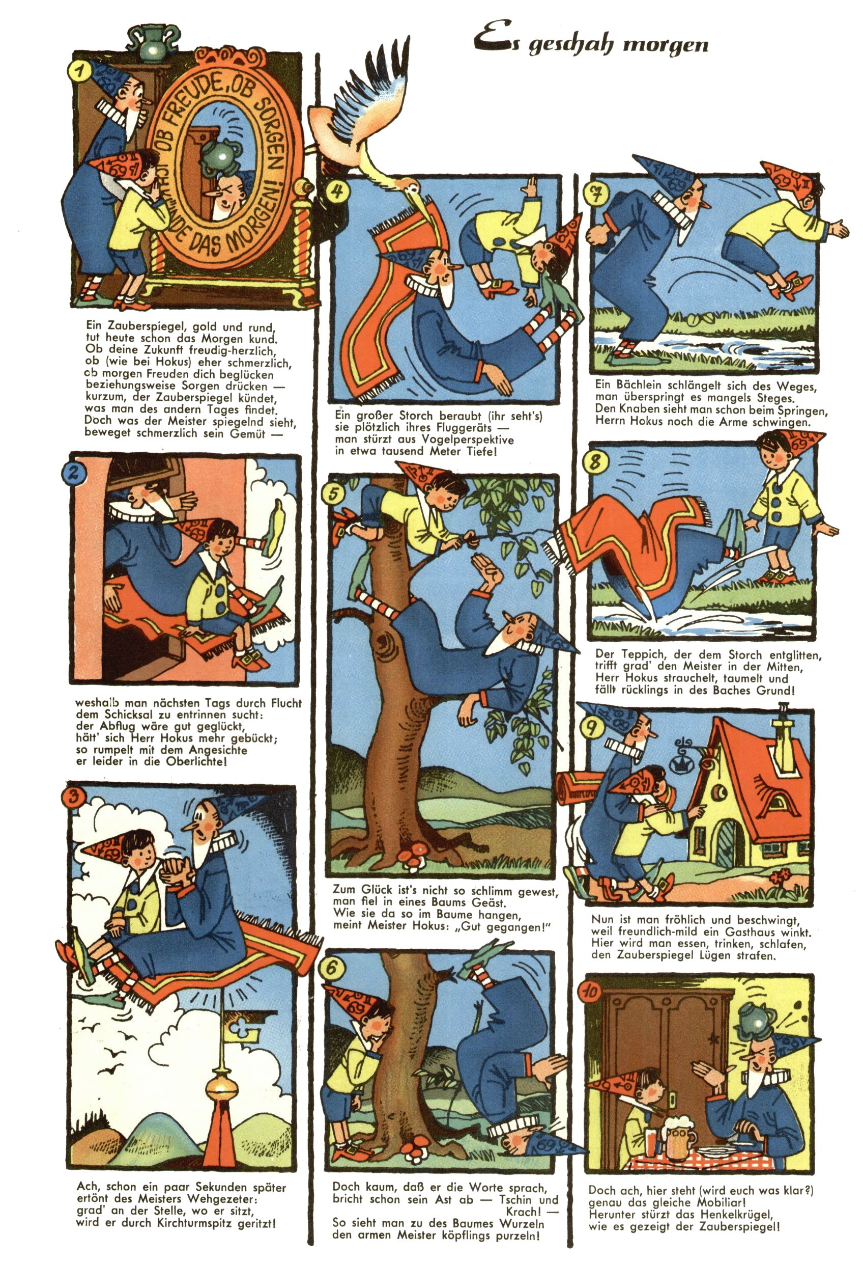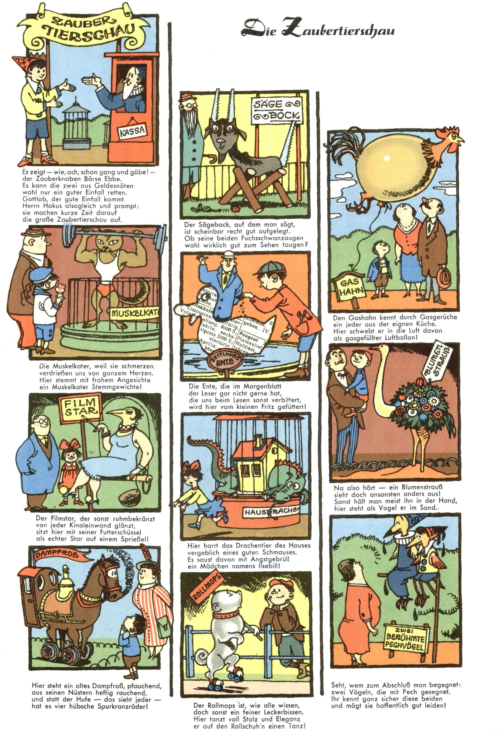 1953 – Alles beim Alten Wie lange darf man sich auf einem Erfolgskonzept ausruhen? Auch 1953 gab es keine offensichtlichen Änderungen am Layout der Zeitung. Zwar wurde Elfriede Vavrovsky teilweise durch andere Autoren abgelöst und erstmals kam Friedrich Bauer zum Zug, der bisher nur als Rätselonkel in Erscheinung getreten war. Allerdings ist anzunehmen, dass eine ganze Reihe unsignierter Erzählungen früherer Hefte ebenfalls der Feder von fb entstammen. ABC Peter Paul Prinz übernahm neuerlich die Illustration der technischen Seiten. Sein Willibald erschien ab sofort in 3 Spalten anstelle von 4 Zeilen, was ihm wesentlich mehr Gestaltungsfreiheit bot. Teja Aicher erfand die Clowns Benjamin und Kasimir nachdem ABC mit seiner Miniserie Zipferling, der lustige Kasperl bereits ein halbes Jahr zuvor durchaus mit Lachern punkten hatte können. Benjamin und Kasimir erschienen 1953 in jedem 2. Heft; nach dem Abdanken von Piff und Paff dann in jeder Ausgabe. Vom Aufbau her ähnelte die Serie dem Erfolgscartoon Willibald, der Zauberlehrling, ohne jedoch (aufgrund ihrer allzu "beschränkten" Möglichkeiten) an den Erfolg des Zauberlehrlings anknüpfen zu können. Nach dem Abschluss der Atlas-Daten und Karten erfand Annelies Umlauf Lamatsch weitere realitätsfremde Geschichten über die Natur und im Speziellen über Blumen. Eine medizinisch-biologische Spalte über den menschlichen Körper von Ewald Seifert war hingegen sachlicher und informativ. Ein kurzzeitiger Neuzugang bei den Grafikern war Hedwig Zumtobel. Sie wurde jedoch bald von Luzia Adelsberger abgelöst, die sich über Jahre hindurch als Zeichnerin etablierte. Friederike Nekut übernahm die Bastelseite für Mädchen. Die Kolumne Die Puppenschneiderin wurde mit Unser Hausmütterchen ergänzt, wodurch das handwerkliche Angebot für Mädchen erweitert werden konnte. Eine wesentliche Änderung am Titelblatt gab es 1953 aber doch: Endlich hatte man dem Erfolg von Zwerg Bumsti Rechnung getragen und ihn ins Logo erhoben. Er löste dort den Zwerg Bums aus dem Jahr 1948 in seiner Gondel ab, der zwar als Namenspatron für Zwerg Bumsti hergehalten hatte, mit dem es ansonsten aber keine Gemeinsamkeiten gab. |