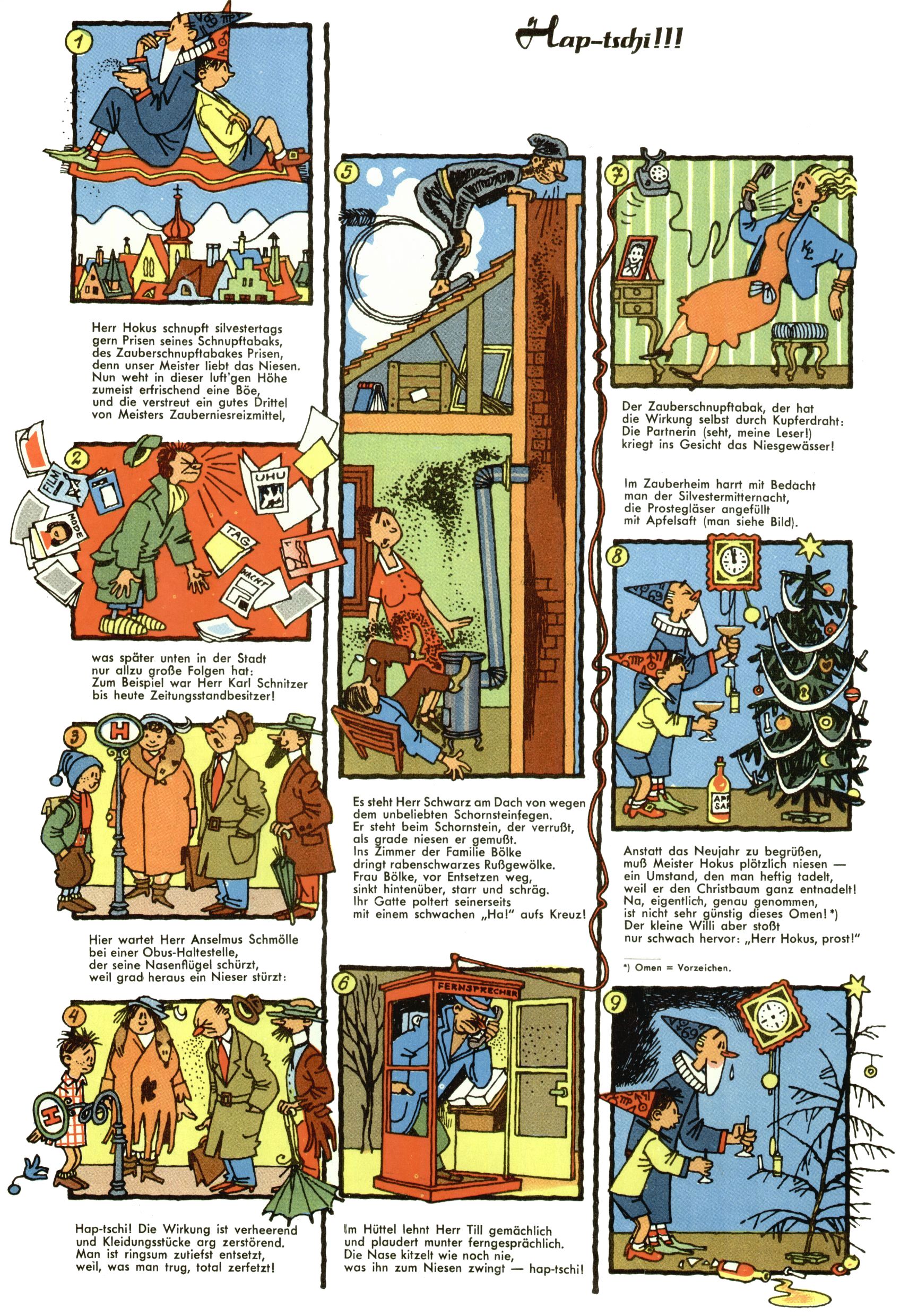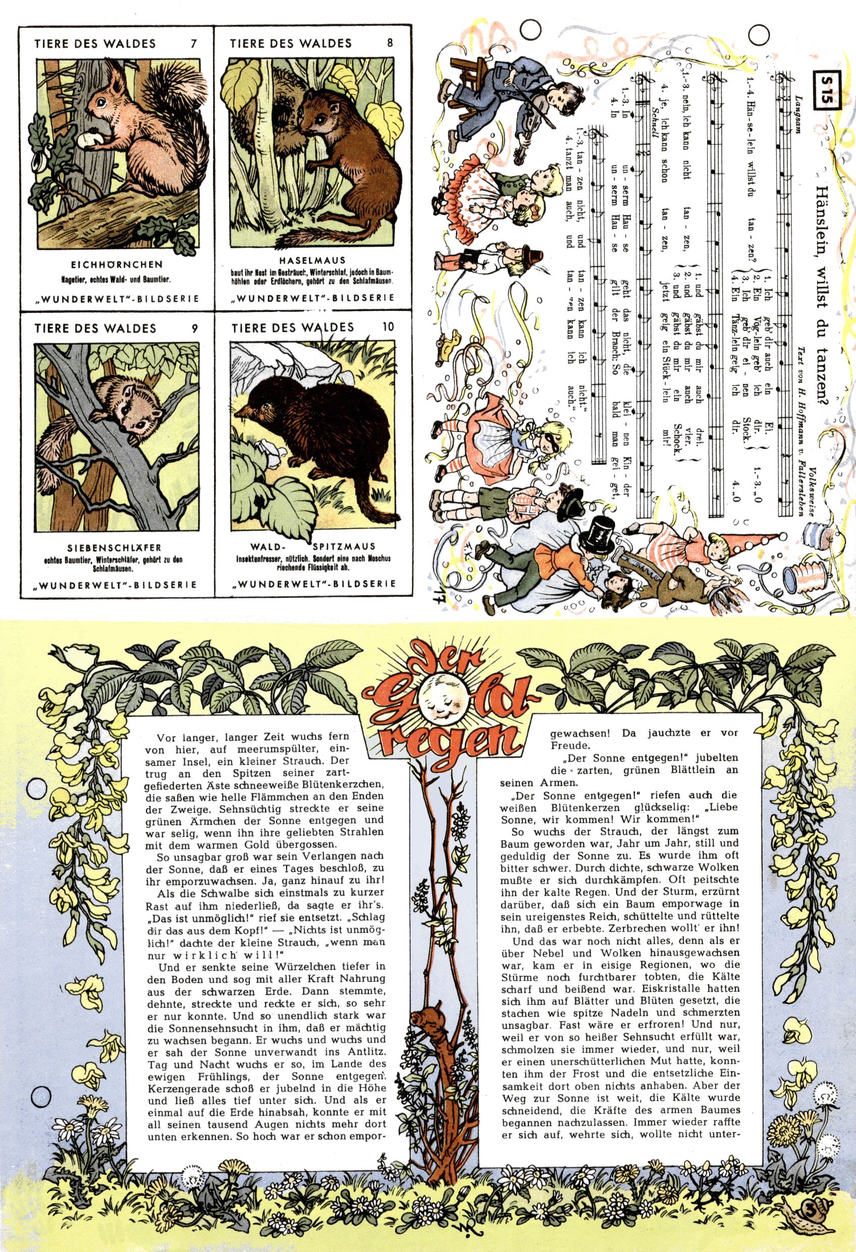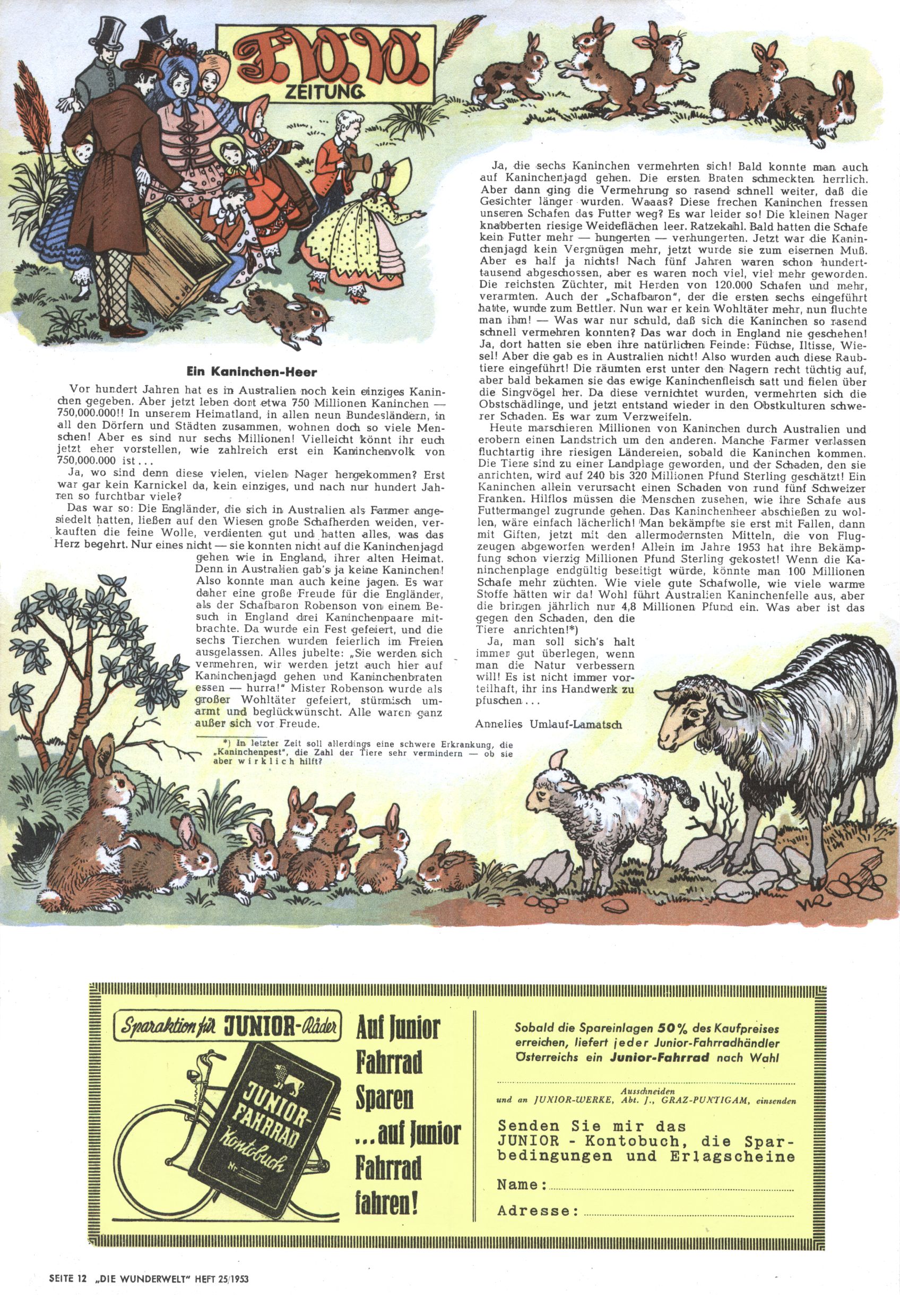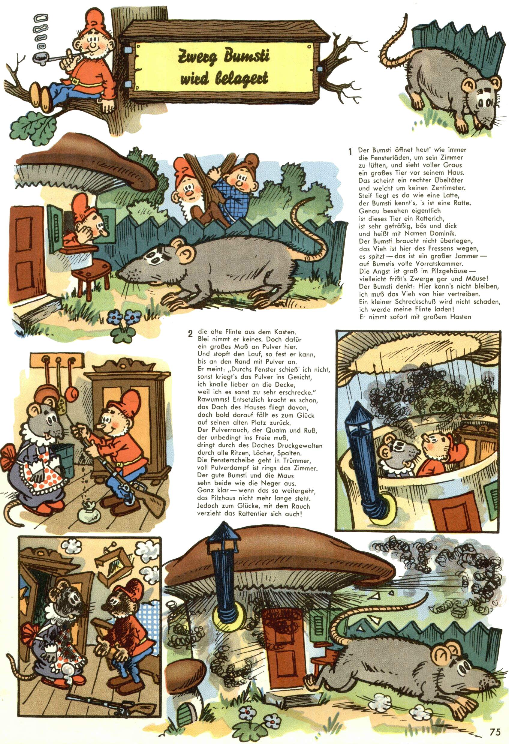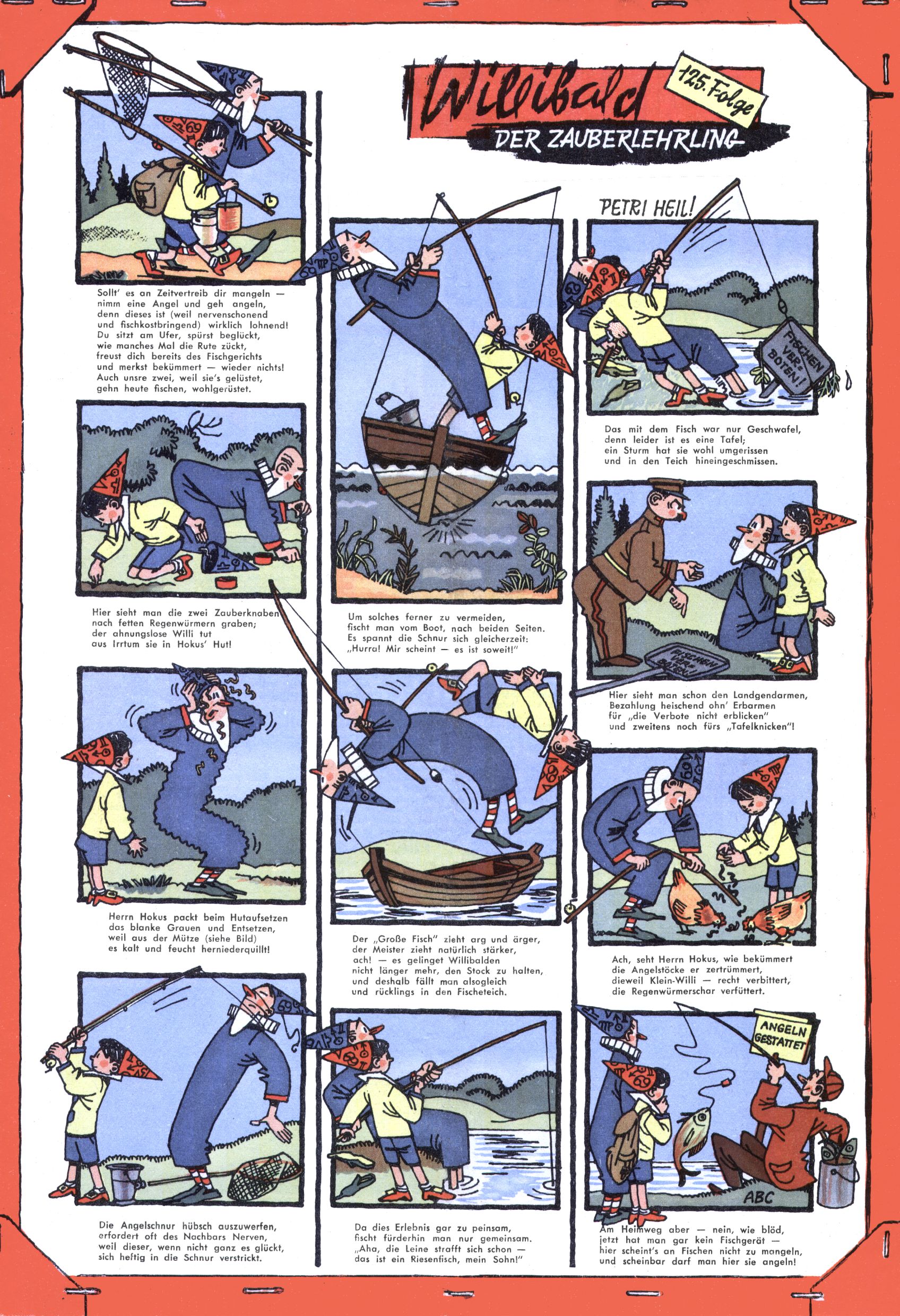 1953 – Alles beim Alten Wie lange darf man sich auf einem Erfolgskonzept ausruhen? Auch 1953 gab es keine offensichtlichen Änderungen am Layout der Zeitung. Zwar wurde Elfriede Vavrovsky teilweise durch andere Autoren abgelöst und erstmals kam Friedrich Bauer zum Zug, der bisher nur als Rätselonkel in Erscheinung getreten war. Allerdings ist anzunehmen, dass eine ganze Reihe unsignierter Erzählungen früherer Hefte ebenfalls der Feder von fb entstammen. ABC Peter Paul Prinz übernahm neuerlich die Illustration der technischen Seiten. Sein Willibald erschien ab sofort in 3 Spalten anstelle von 4 Zeilen, was ihm wesentlich mehr Gestaltungsfreiheit bot. Teja Aicher erfand die Clowns Benjamin und Kasimir nachdem ABC mit seiner Miniserie Zipferling, der lustige Kasperl bereits ein halbes Jahr zuvor durchaus mit Lachern punkten hatte können. Benjamin und Kasimir erschienen 1953 in jedem 2. Heft; nach dem Abdanken von Piff und Paff dann in jeder Ausgabe. Vom Aufbau her ähnelte die Serie dem Erfolgscartoon Willibald, der Zauberlehrling, ohne jedoch (aufgrund ihrer allzu "beschränkten" Möglichkeiten) an den Erfolg des Zauberlehrlings anknüpfen zu können. Nach dem Abschluss der Atlas-Daten und Karten erfand Annelies Umlauf Lamatsch weitere realitätsfremde Geschichten über die Natur und im Speziellen über Blumen. Eine medizinisch-biologische Spalte über den menschlichen Körper von Ewald Seifert war hingegen sachlicher und informativ. Ein kurzzeitiger Neuzugang bei den Grafikern war Hedwig Zumtobel. Sie wurde jedoch bald von Luzia Adelsberger abgelöst, die sich über Jahre hindurch als Zeichnerin etablierte. Friederike Nekut übernahm die Bastelseite für Mädchen. Die Kolumne Die Puppenschneiderin wurde mit Unser Hausmütterchen ergänzt, wodurch das handwerkliche Angebot für Mädchen erweitert werden konnte. Eine wesentliche Änderung am Titelblatt gab es 1953 aber doch: Endlich hatte man dem Erfolg von Zwerg Bumsti Rechnung getragen und ihn ins Logo erhoben. Er löste dort den Zwerg Bums aus dem Jahr 1948 in seiner Gondel ab, der zwar als Namenspatron für Zwerg Bumsti hergehalten hatte, mit dem es ansonsten aber keine Gemeinsamkeiten gab. |