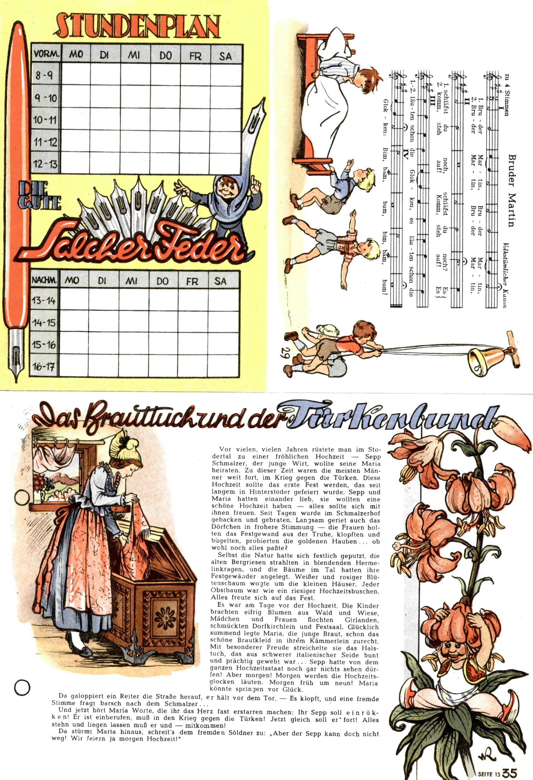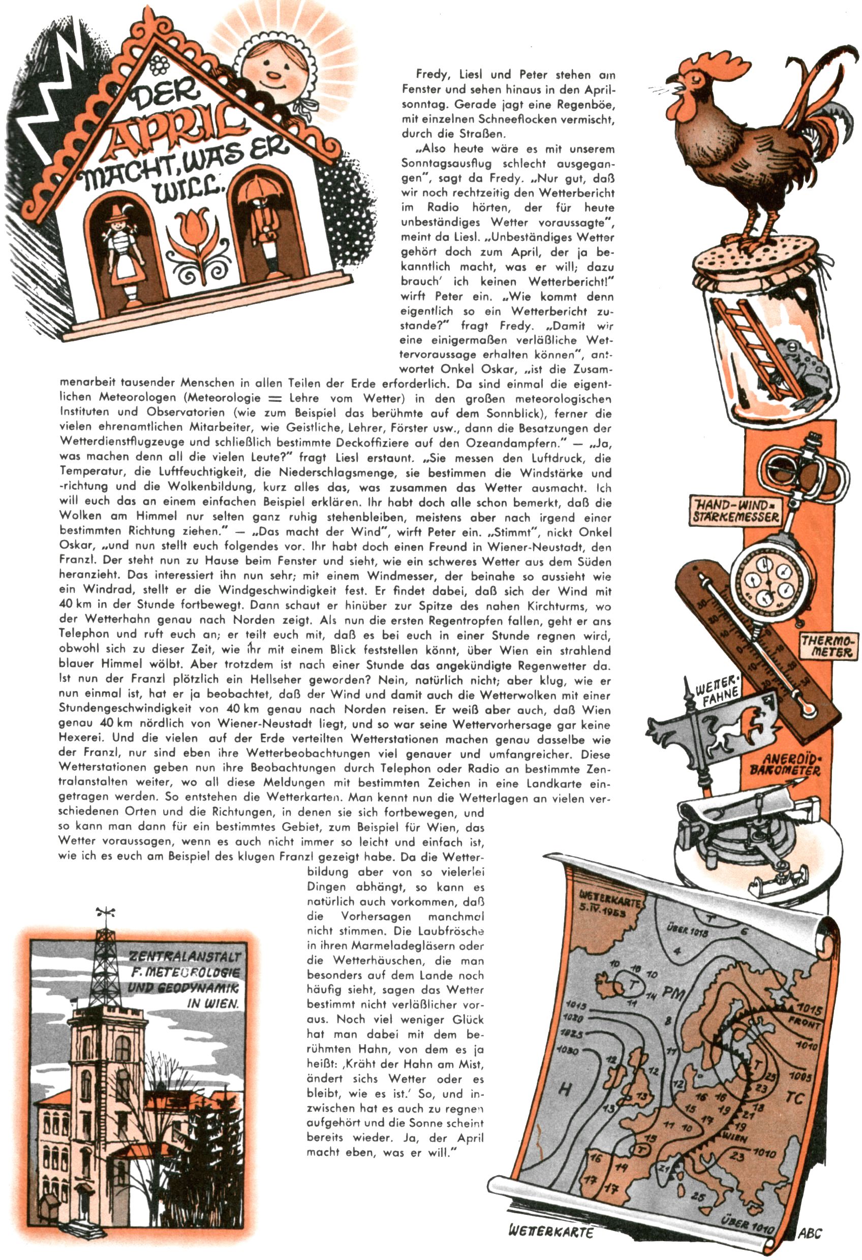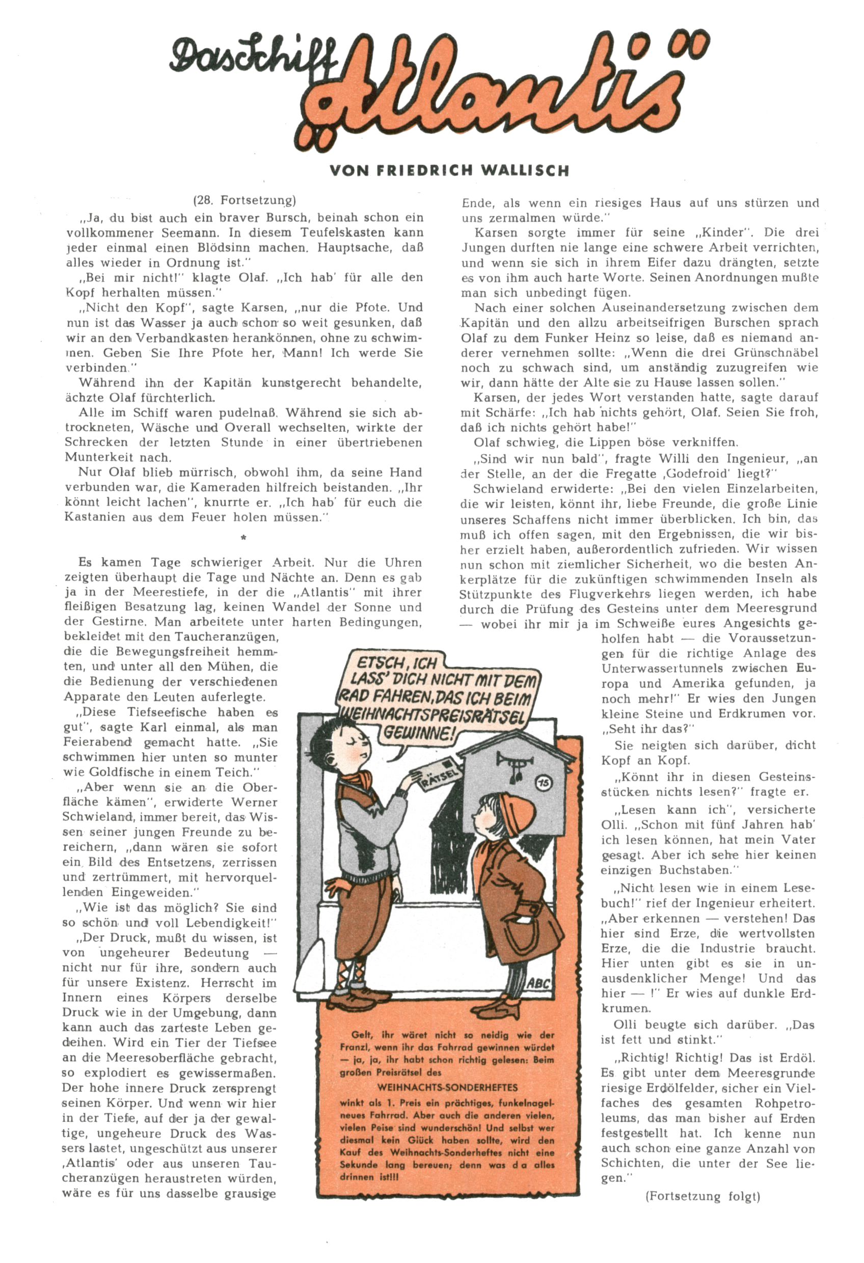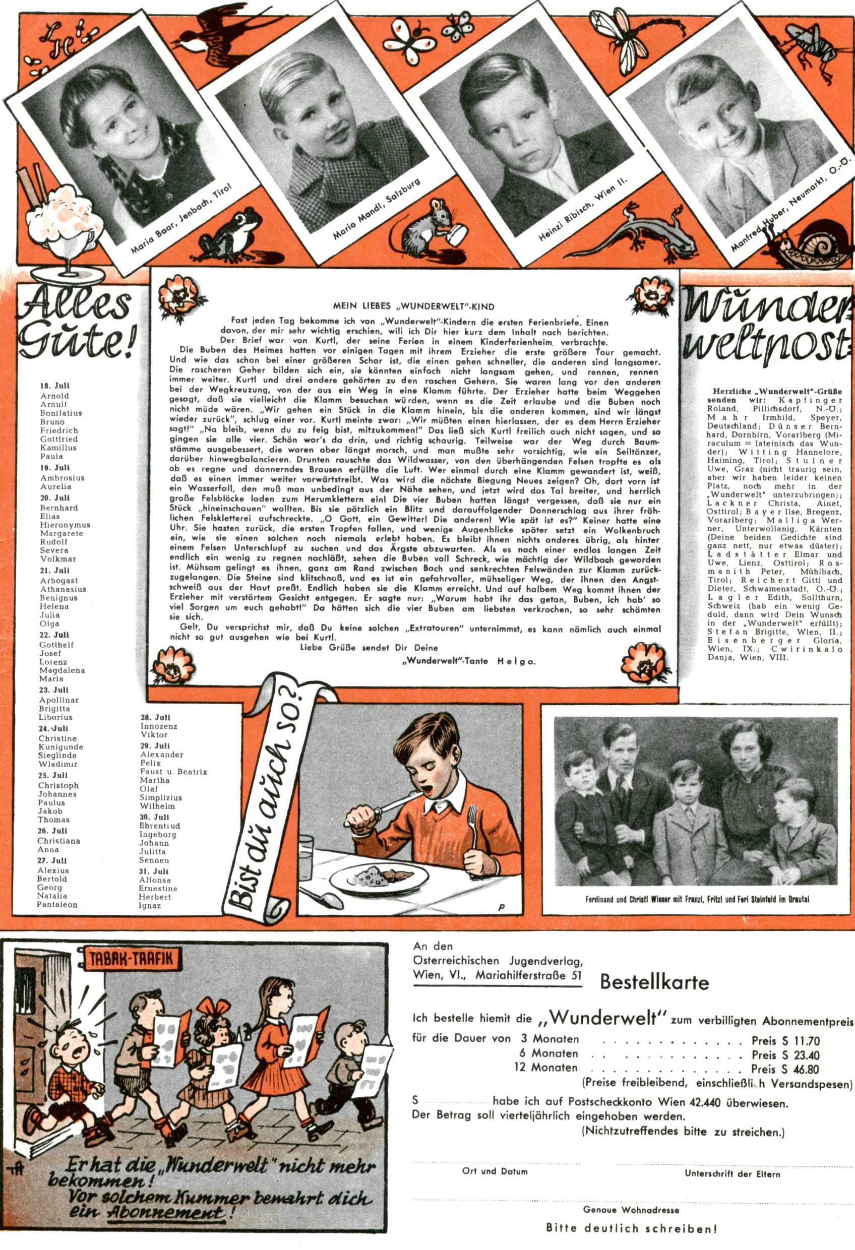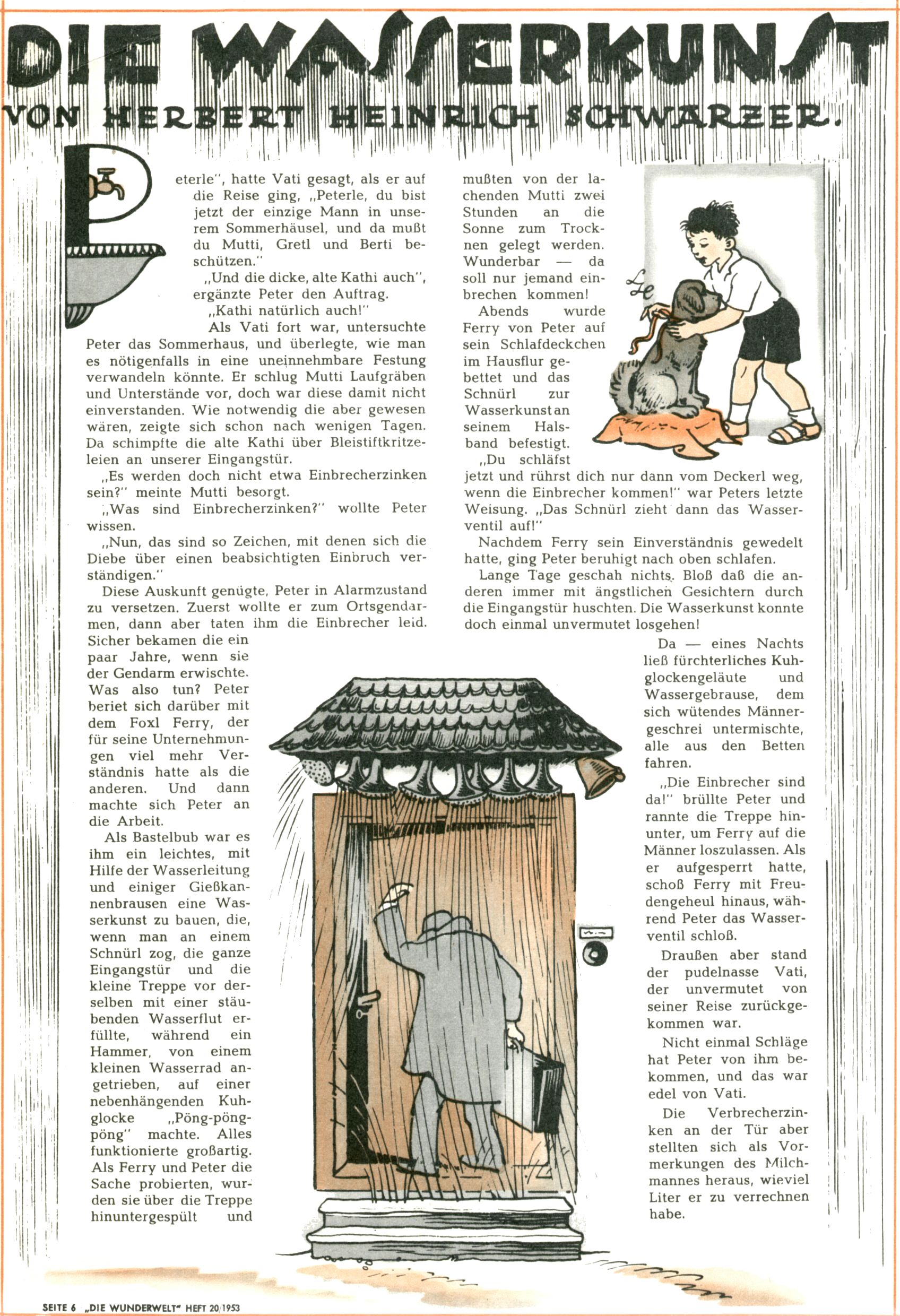 1953 – Alles beim Alten Wie lange darf man sich auf einem Erfolgskonzept ausruhen? Auch 1953 gab es keine offensichtlichen Änderungen am Layout der Zeitung. Zwar wurde Elfriede Vavrovsky teilweise durch andere Autoren abgelöst und erstmals kam Friedrich Bauer zum Zug, der bisher nur als Rätselonkel in Erscheinung getreten war. Allerdings ist anzunehmen, dass eine ganze Reihe unsignierter Erzählungen früherer Hefte ebenfalls der Feder von fb entstammen. ABC Peter Paul Prinz übernahm neuerlich die Illustration der technischen Seiten. Sein Willibald erschien ab sofort in 3 Spalten anstelle von 4 Zeilen, was ihm wesentlich mehr Gestaltungsfreiheit bot. Teja Aicher erfand die Clowns Benjamin und Kasimir nachdem ABC mit seiner Miniserie Zipferling, der lustige Kasperl bereits ein halbes Jahr zuvor durchaus mit Lachern punkten hatte können. Benjamin und Kasimir erschienen 1953 in jedem 2. Heft; nach dem Abdanken von Piff und Paff dann in jeder Ausgabe. Vom Aufbau her ähnelte die Serie dem Erfolgscartoon Willibald, der Zauberlehrling, ohne jedoch (aufgrund ihrer allzu "beschränkten" Möglichkeiten) an den Erfolg des Zauberlehrlings anknüpfen zu können. Nach dem Abschluss der Atlas-Daten und Karten erfand Annelies Umlauf Lamatsch weitere realitätsfremde Geschichten über die Natur und im Speziellen über Blumen. Eine medizinisch-biologische Spalte über den menschlichen Körper von Ewald Seifert war hingegen sachlicher und informativ. Ein kurzzeitiger Neuzugang bei den Grafikern war Hedwig Zumtobel. Sie wurde jedoch bald von Luzia Adelsberger abgelöst, die sich über Jahre hindurch als Zeichnerin etablierte. Friederike Nekut übernahm die Bastelseite für Mädchen. Die Kolumne Die Puppenschneiderin wurde mit Unser Hausmütterchen ergänzt, wodurch das handwerkliche Angebot für Mädchen erweitert werden konnte. Eine wesentliche Änderung am Titelblatt gab es 1953 aber doch: Endlich hatte man dem Erfolg von Zwerg Bumsti Rechnung getragen und ihn ins Logo erhoben. Er löste dort den Zwerg Bums aus dem Jahr 1948 in seiner Gondel ab, der zwar als Namenspatron für Zwerg Bumsti hergehalten hatte, mit dem es ansonsten aber keine Gemeinsamkeiten gab. |