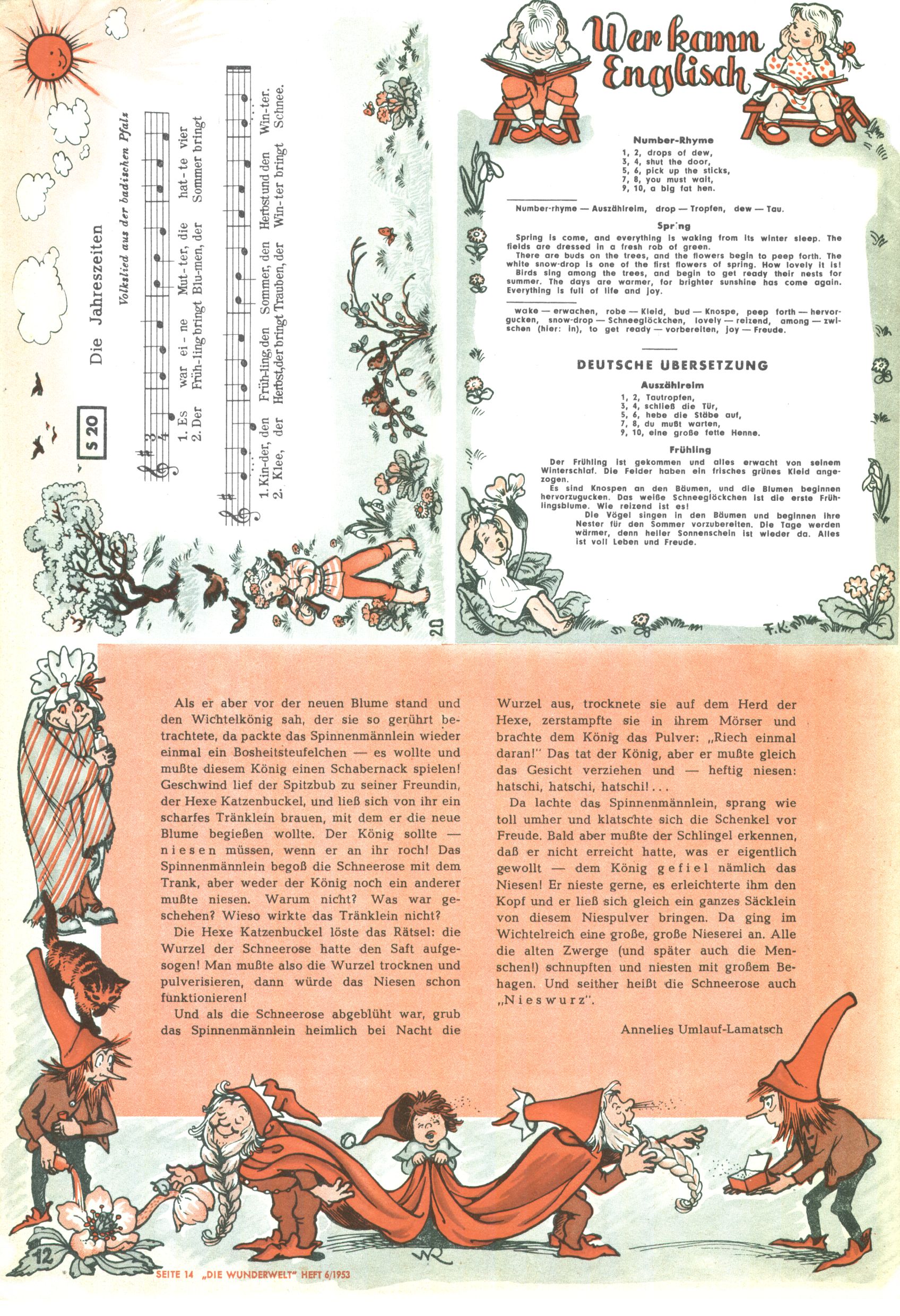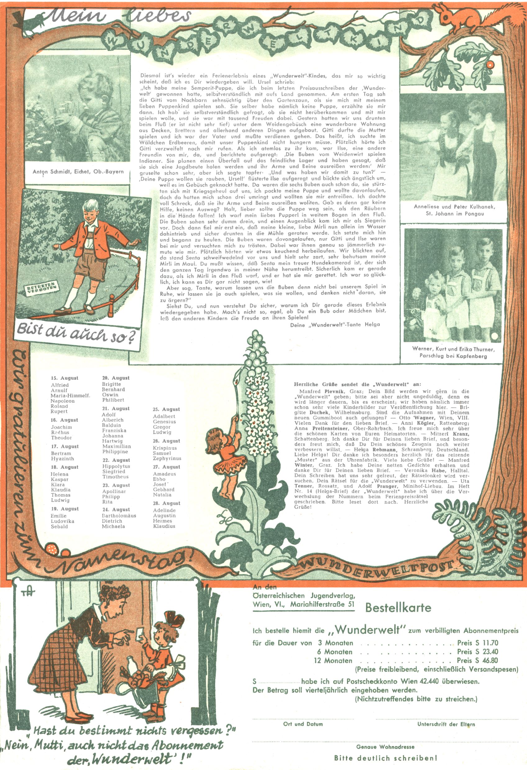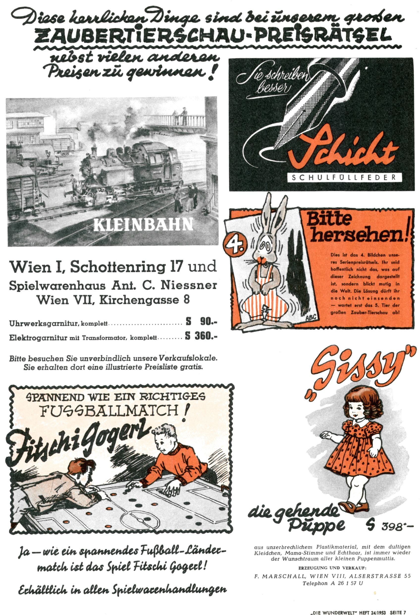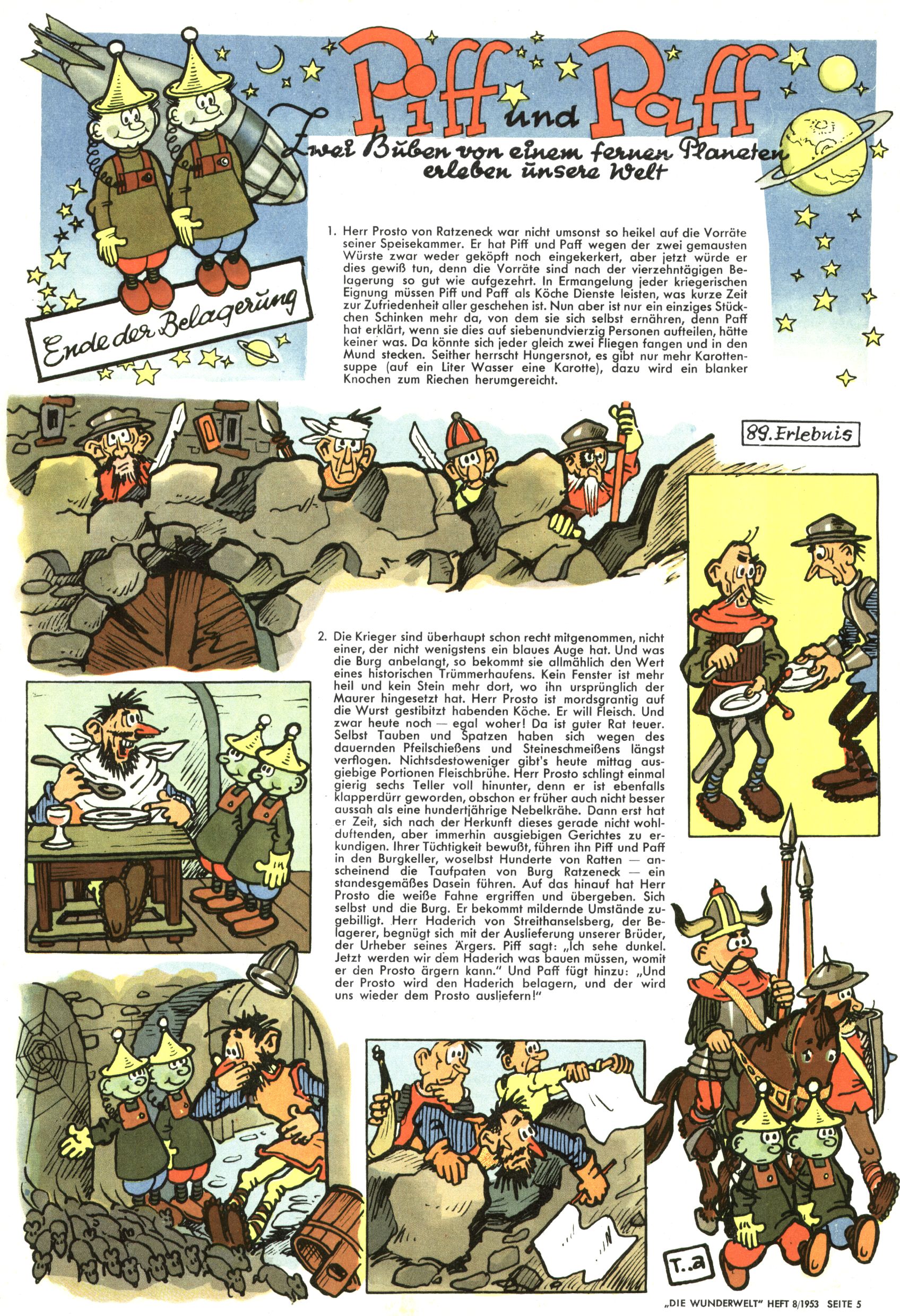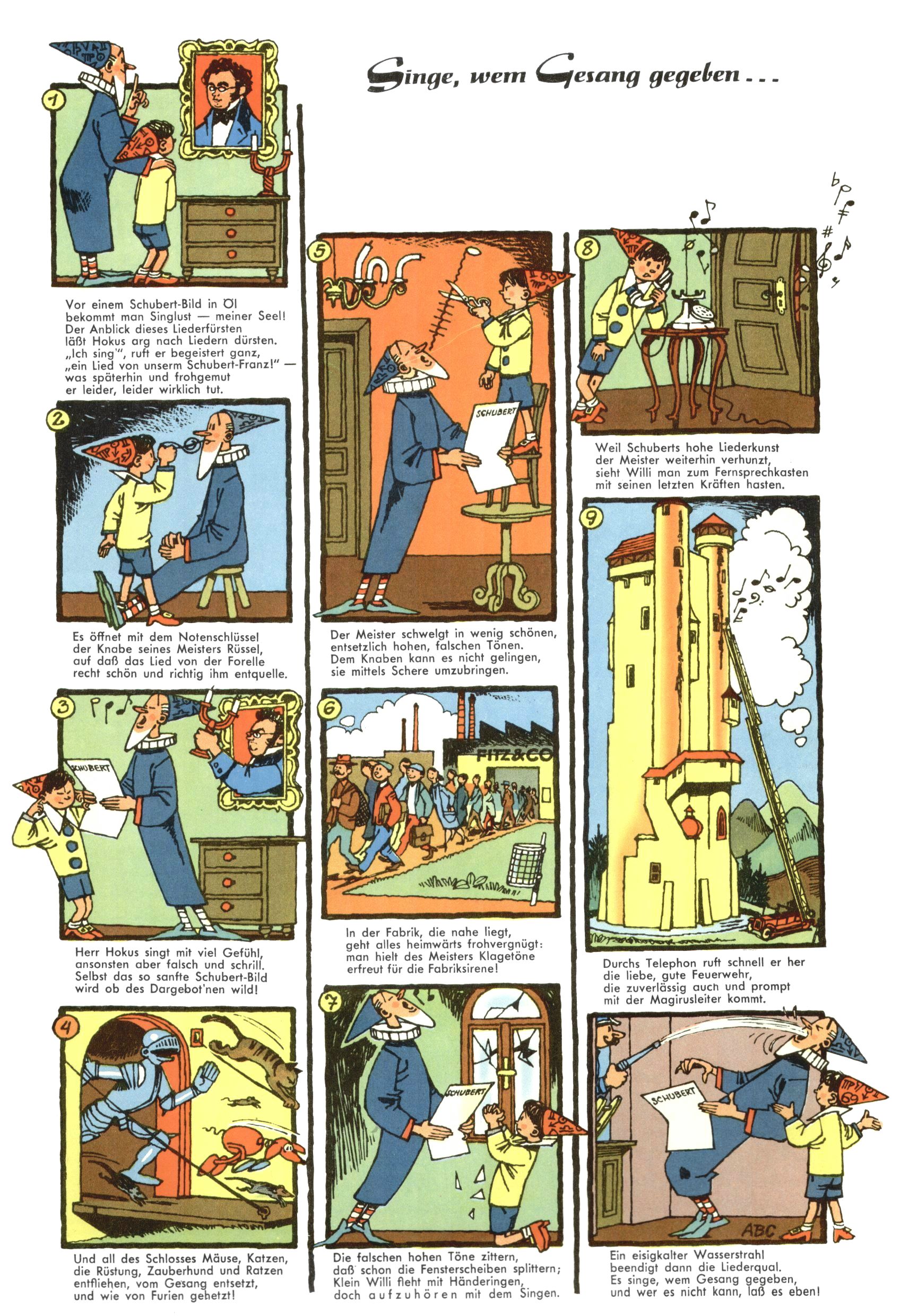 1953 – Alles beim Alten Wie lange darf man sich auf einem Erfolgskonzept ausruhen? Auch 1953 gab es keine offensichtlichen Änderungen am Layout der Zeitung. Zwar wurde Elfriede Vavrovsky teilweise durch andere Autoren abgelöst und erstmals kam Friedrich Bauer zum Zug, der bisher nur als Rätselonkel in Erscheinung getreten war. Allerdings ist anzunehmen, dass eine ganze Reihe unsignierter Erzählungen früherer Hefte ebenfalls der Feder von fb entstammen. ABC Peter Paul Prinz übernahm neuerlich die Illustration der technischen Seiten. Sein Willibald erschien ab sofort in 3 Spalten anstelle von 4 Zeilen, was ihm wesentlich mehr Gestaltungsfreiheit bot. Teja Aicher erfand die Clowns Benjamin und Kasimir nachdem ABC mit seiner Miniserie Zipferling, der lustige Kasperl bereits ein halbes Jahr zuvor durchaus mit Lachern punkten hatte können. Benjamin und Kasimir erschienen 1953 in jedem 2. Heft; nach dem Abdanken von Piff und Paff dann in jeder Ausgabe. Vom Aufbau her ähnelte die Serie dem Erfolgscartoon Willibald, der Zauberlehrling, ohne jedoch (aufgrund ihrer allzu "beschränkten" Möglichkeiten) an den Erfolg des Zauberlehrlings anknüpfen zu können. Nach dem Abschluss der Atlas-Daten und Karten erfand Annelies Umlauf Lamatsch weitere realitätsfremde Geschichten über die Natur und im Speziellen über Blumen. Eine medizinisch-biologische Spalte über den menschlichen Körper von Ewald Seifert war hingegen sachlicher und informativ. Ein kurzzeitiger Neuzugang bei den Grafikern war Hedwig Zumtobel. Sie wurde jedoch bald von Luzia Adelsberger abgelöst, die sich über Jahre hindurch als Zeichnerin etablierte. Friederike Nekut übernahm die Bastelseite für Mädchen. Die Kolumne Die Puppenschneiderin wurde mit Unser Hausmütterchen ergänzt, wodurch das handwerkliche Angebot für Mädchen erweitert werden konnte. Eine wesentliche Änderung am Titelblatt gab es 1953 aber doch: Endlich hatte man dem Erfolg von Zwerg Bumsti Rechnung getragen und ihn ins Logo erhoben. Er löste dort den Zwerg Bums aus dem Jahr 1948 in seiner Gondel ab, der zwar als Namenspatron für Zwerg Bumsti hergehalten hatte, mit dem es ansonsten aber keine Gemeinsamkeiten gab. |