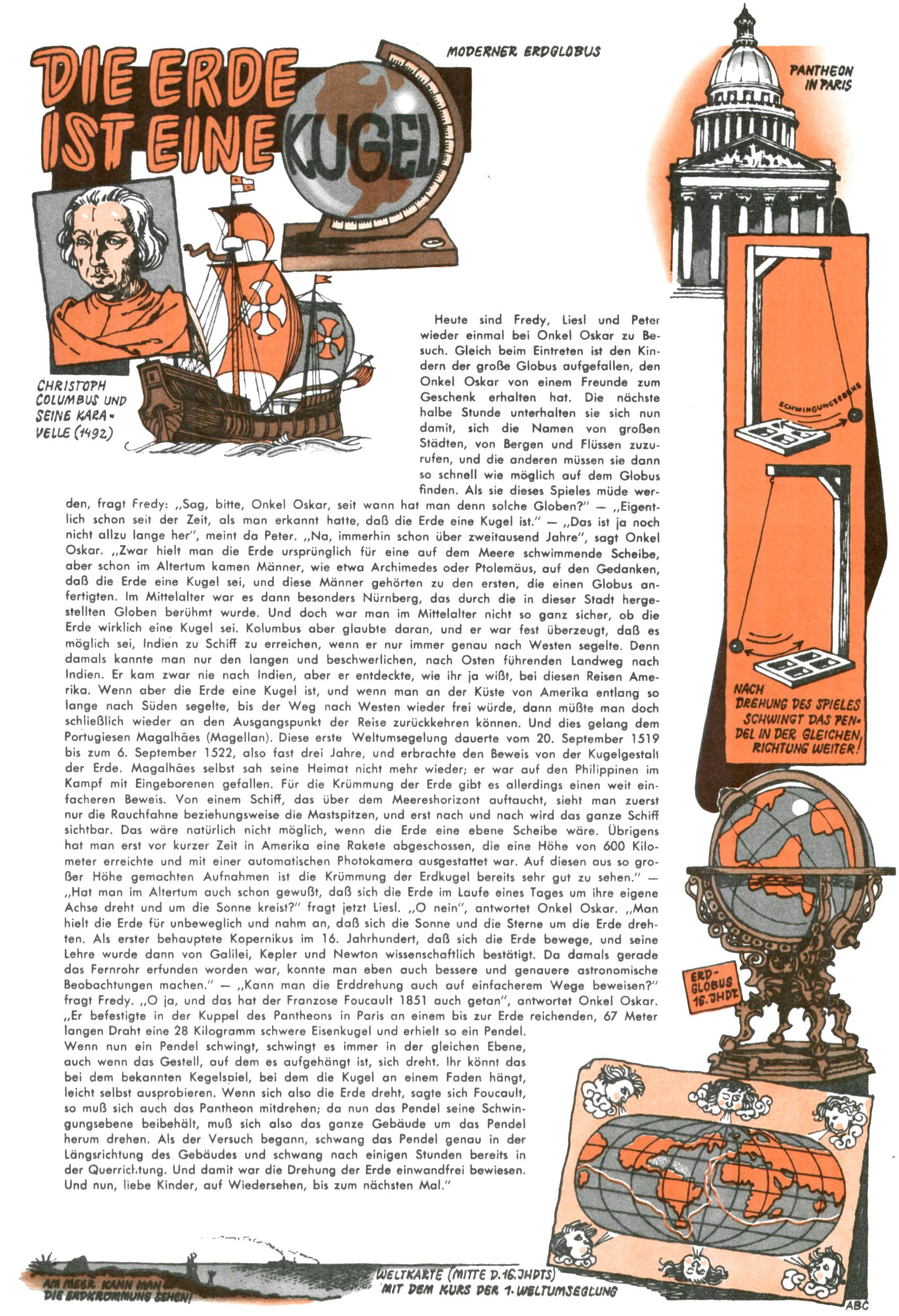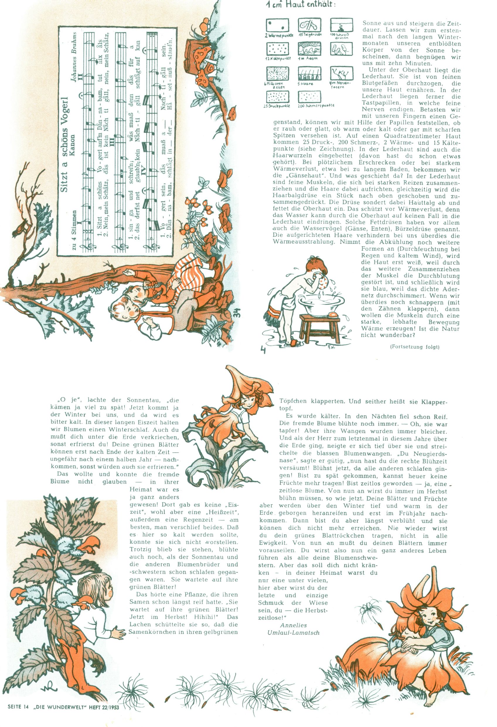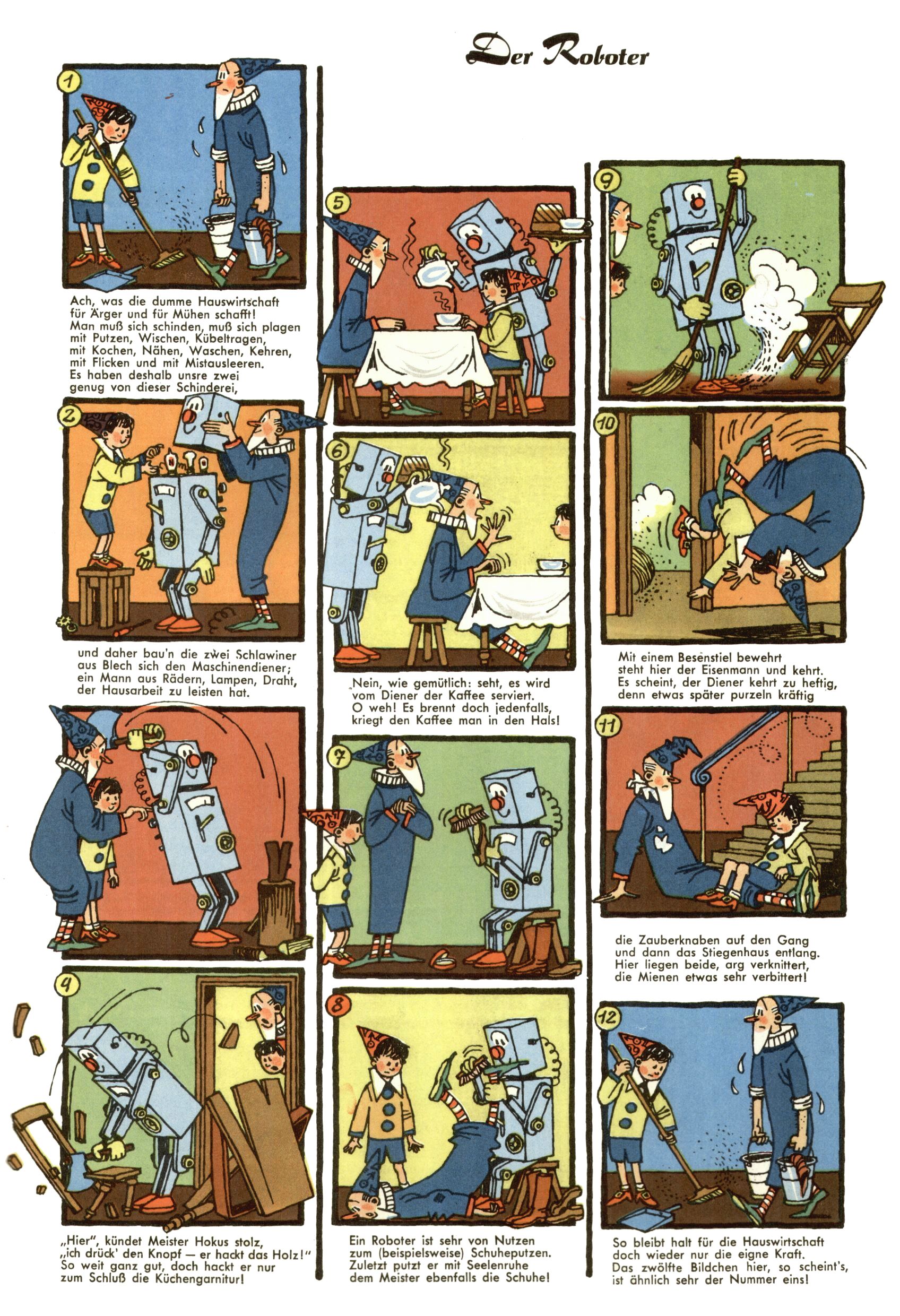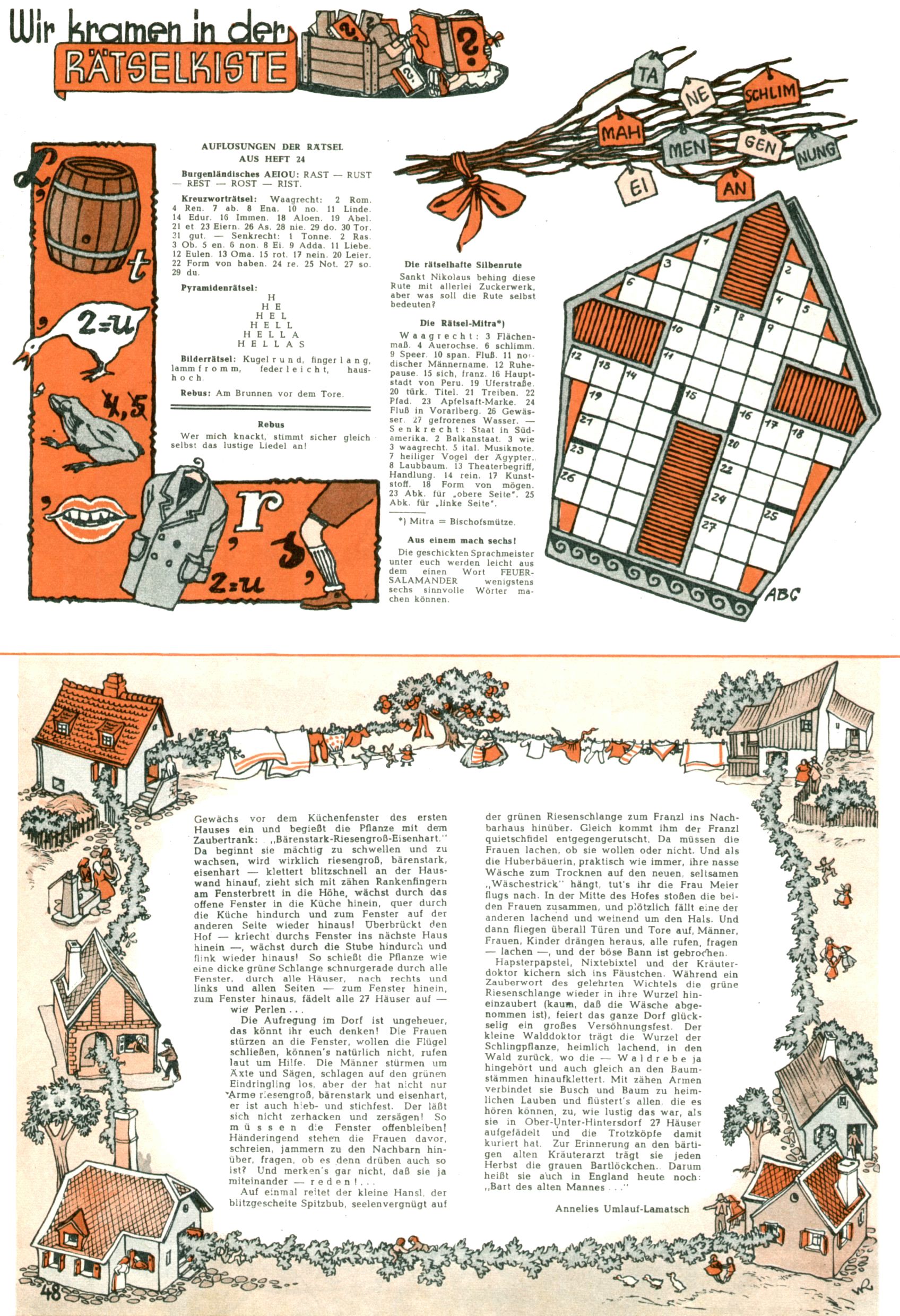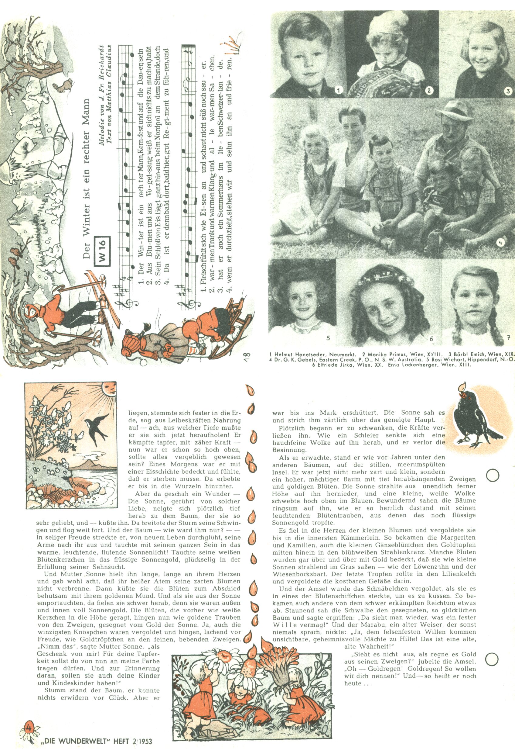1953 – Alles beim Alten Wie lange darf man sich auf einem Erfolgskonzept ausruhen? Auch 1953 gab es keine offensichtlichen Änderungen am Layout der Zeitung. Zwar wurde Elfriede Vavrovsky teilweise durch andere Autoren abgelöst und erstmals kam Friedrich Bauer zum Zug, der bisher nur als Rätselonkel in Erscheinung getreten war. Allerdings ist anzunehmen, dass eine ganze Reihe unsignierter Erzählungen früherer Hefte ebenfalls der Feder von fb entstammen. ABC Peter Paul Prinz übernahm neuerlich die Illustration der technischen Seiten. Sein Willibald erschien ab sofort in 3 Spalten anstelle von 4 Zeilen, was ihm wesentlich mehr Gestaltungsfreiheit bot. Teja Aicher erfand die Clowns Benjamin und Kasimir nachdem ABC mit seiner Miniserie Zipferling, der lustige Kasperl bereits ein halbes Jahr zuvor durchaus mit Lachern punkten hatte können. Benjamin und Kasimir erschienen 1953 in jedem 2. Heft; nach dem Abdanken von Piff und Paff dann in jeder Ausgabe. Vom Aufbau her ähnelte die Serie dem Erfolgscartoon Willibald, der Zauberlehrling, ohne jedoch (aufgrund ihrer allzu "beschränkten" Möglichkeiten) an den Erfolg des Zauberlehrlings anknüpfen zu können. Nach dem Abschluss der Atlas-Daten und Karten erfand Annelies Umlauf Lamatsch weitere realitätsfremde Geschichten über die Natur und im Speziellen über Blumen. Eine medizinisch-biologische Spalte über den menschlichen Körper von Ewald Seifert war hingegen sachlicher und informativ. Ein kurzzeitiger Neuzugang bei den Grafikern war Hedwig Zumtobel. Sie wurde jedoch bald von Luzia Adelsberger abgelöst, die sich über Jahre hindurch als Zeichnerin etablierte. Friederike Nekut übernahm die Bastelseite für Mädchen. Die Kolumne Die Puppenschneiderin wurde mit Unser Hausmütterchen ergänzt, wodurch das handwerkliche Angebot für Mädchen erweitert werden konnte. Eine wesentliche Änderung am Titelblatt gab es 1953 aber doch: Endlich hatte man dem Erfolg von Zwerg Bumsti Rechnung getragen und ihn ins Logo erhoben. Er löste dort den Zwerg Bums aus dem Jahr 1948 in seiner Gondel ab, der zwar als Namenspatron für Zwerg Bumsti hergehalten hatte, mit dem es ansonsten aber keine Gemeinsamkeiten gab. |