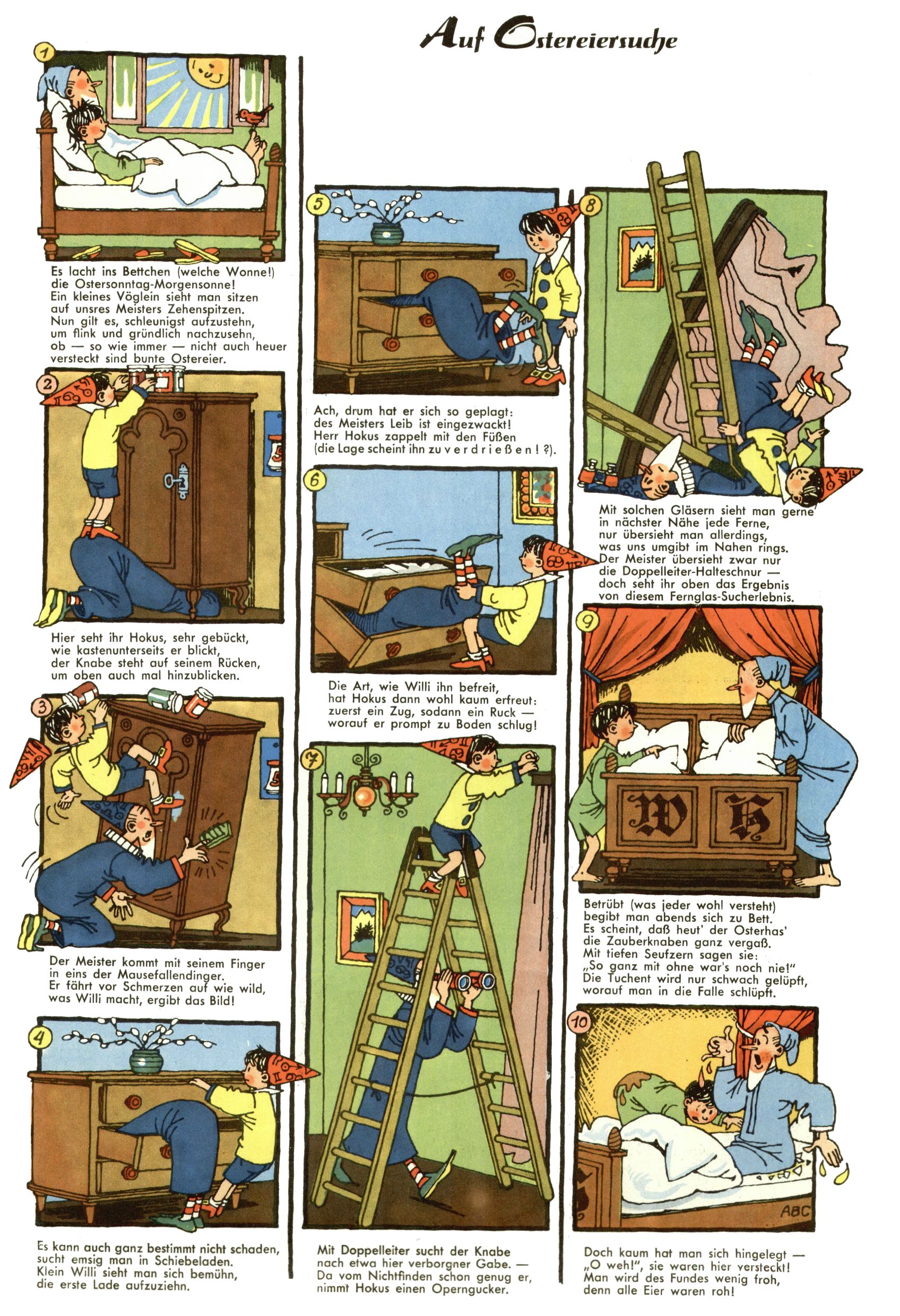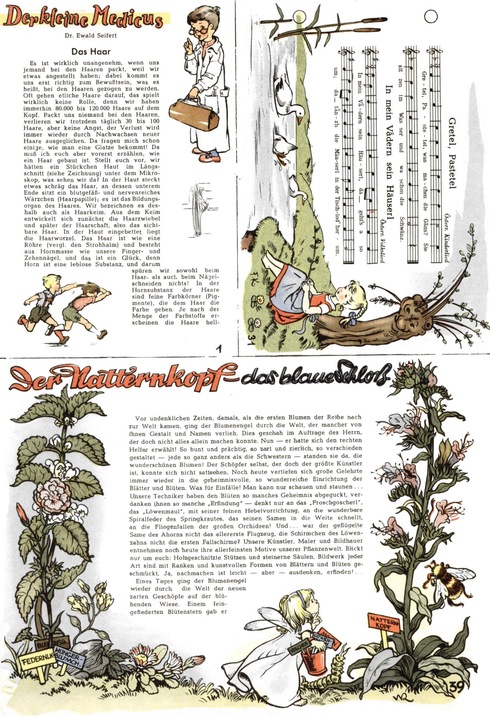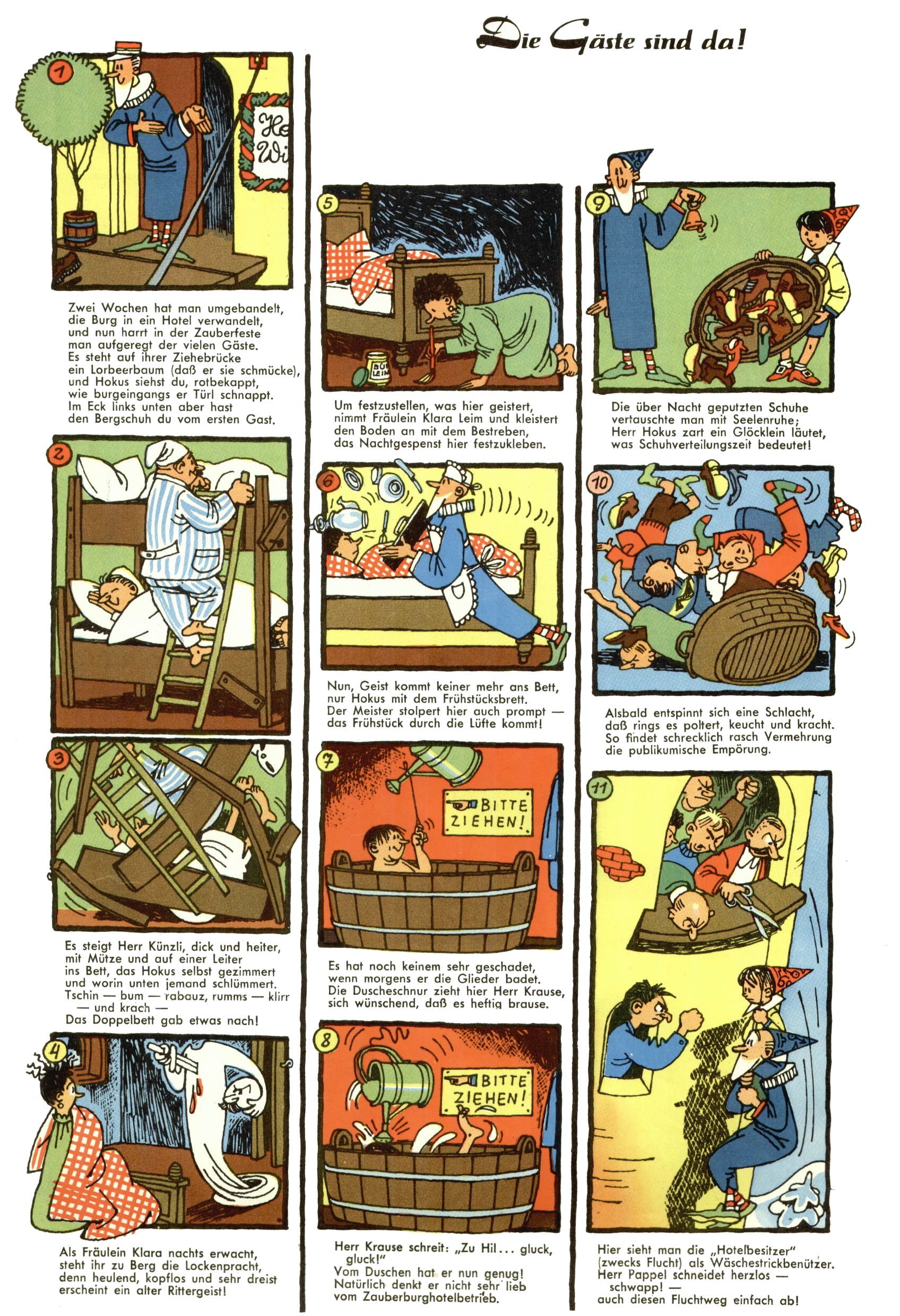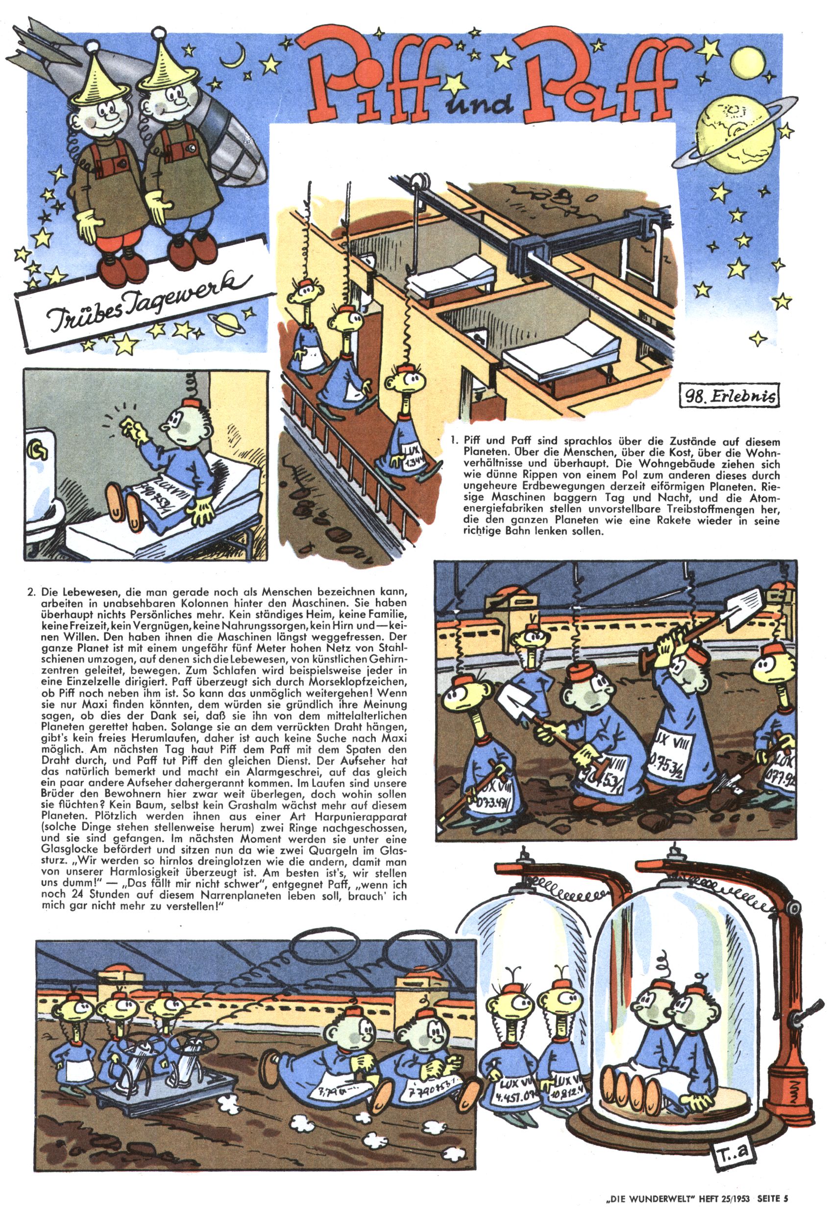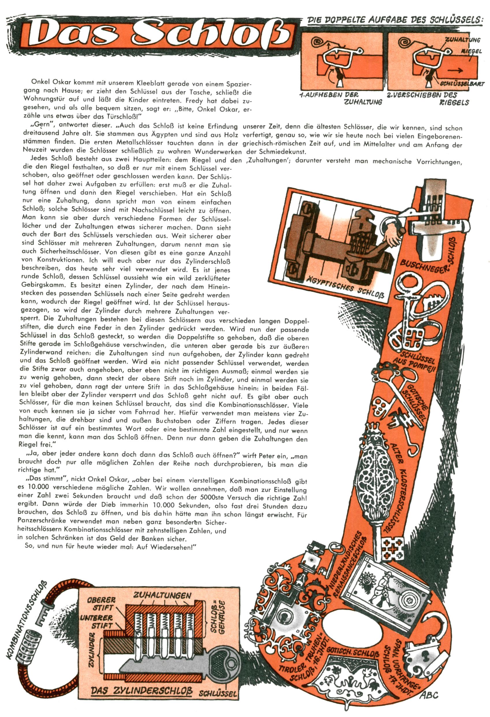 1953 – Alles beim Alten Wie lange darf man sich auf einem Erfolgskonzept ausruhen? Auch 1953 gab es keine offensichtlichen Änderungen am Layout der Zeitung. Zwar wurde Elfriede Vavrovsky teilweise durch andere Autoren abgelöst und erstmals kam Friedrich Bauer zum Zug, der bisher nur als Rätselonkel in Erscheinung getreten war. Allerdings ist anzunehmen, dass eine ganze Reihe unsignierter Erzählungen früherer Hefte ebenfalls der Feder von fb entstammen. ABC Peter Paul Prinz übernahm neuerlich die Illustration der technischen Seiten. Sein Willibald erschien ab sofort in 3 Spalten anstelle von 4 Zeilen, was ihm wesentlich mehr Gestaltungsfreiheit bot. Teja Aicher erfand die Clowns Benjamin und Kasimir nachdem ABC mit seiner Miniserie Zipferling, der lustige Kasperl bereits ein halbes Jahr zuvor durchaus mit Lachern punkten hatte können. Benjamin und Kasimir erschienen 1953 in jedem 2. Heft; nach dem Abdanken von Piff und Paff dann in jeder Ausgabe. Vom Aufbau her ähnelte die Serie dem Erfolgscartoon Willibald, der Zauberlehrling, ohne jedoch (aufgrund ihrer allzu "beschränkten" Möglichkeiten) an den Erfolg des Zauberlehrlings anknüpfen zu können. Nach dem Abschluss der Atlas-Daten und Karten erfand Annelies Umlauf Lamatsch weitere realitätsfremde Geschichten über die Natur und im Speziellen über Blumen. Eine medizinisch-biologische Spalte über den menschlichen Körper von Ewald Seifert war hingegen sachlicher und informativ. Ein kurzzeitiger Neuzugang bei den Grafikern war Hedwig Zumtobel. Sie wurde jedoch bald von Luzia Adelsberger abgelöst, die sich über Jahre hindurch als Zeichnerin etablierte. Friederike Nekut übernahm die Bastelseite für Mädchen. Die Kolumne Die Puppenschneiderin wurde mit Unser Hausmütterchen ergänzt, wodurch das handwerkliche Angebot für Mädchen erweitert werden konnte. Eine wesentliche Änderung am Titelblatt gab es 1953 aber doch: Endlich hatte man dem Erfolg von Zwerg Bumsti Rechnung getragen und ihn ins Logo erhoben. Er löste dort den Zwerg Bums aus dem Jahr 1948 in seiner Gondel ab, der zwar als Namenspatron für Zwerg Bumsti hergehalten hatte, mit dem es ansonsten aber keine Gemeinsamkeiten gab. |