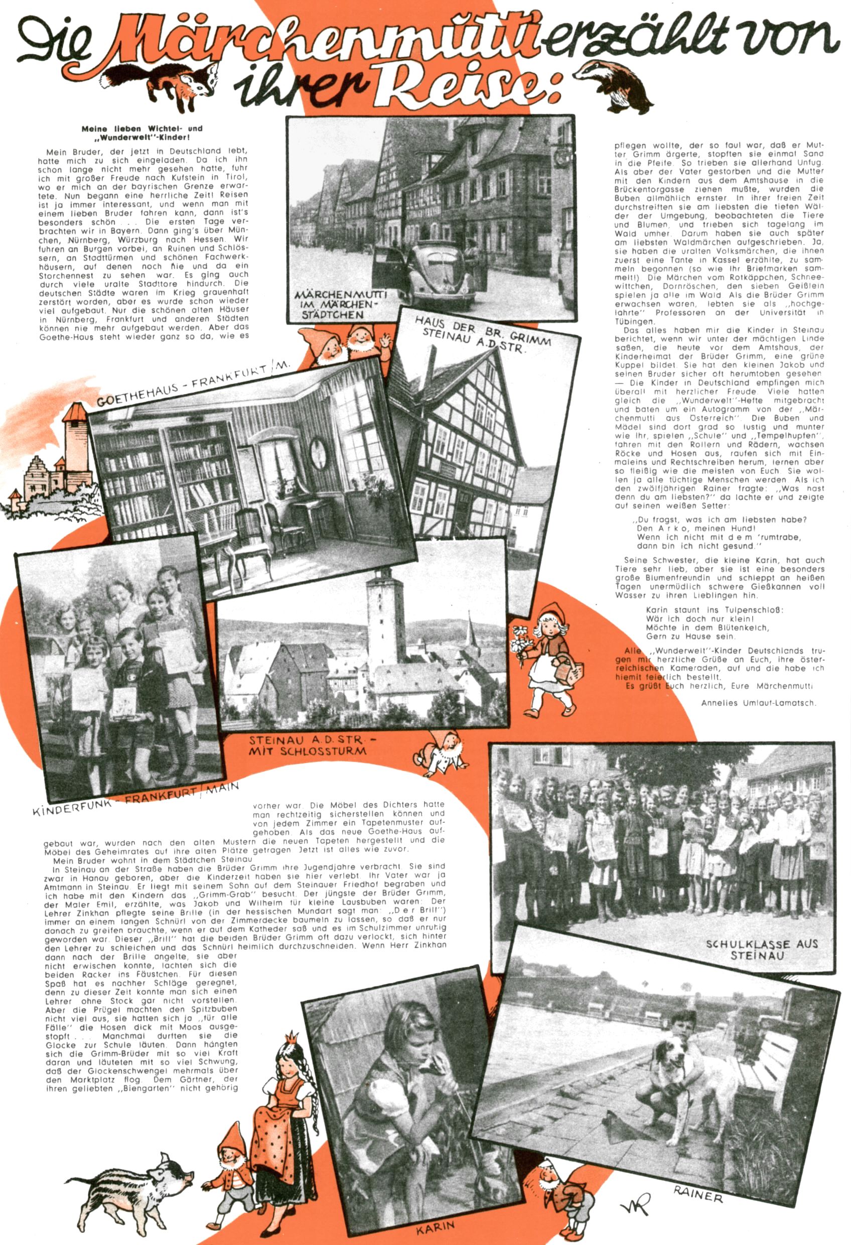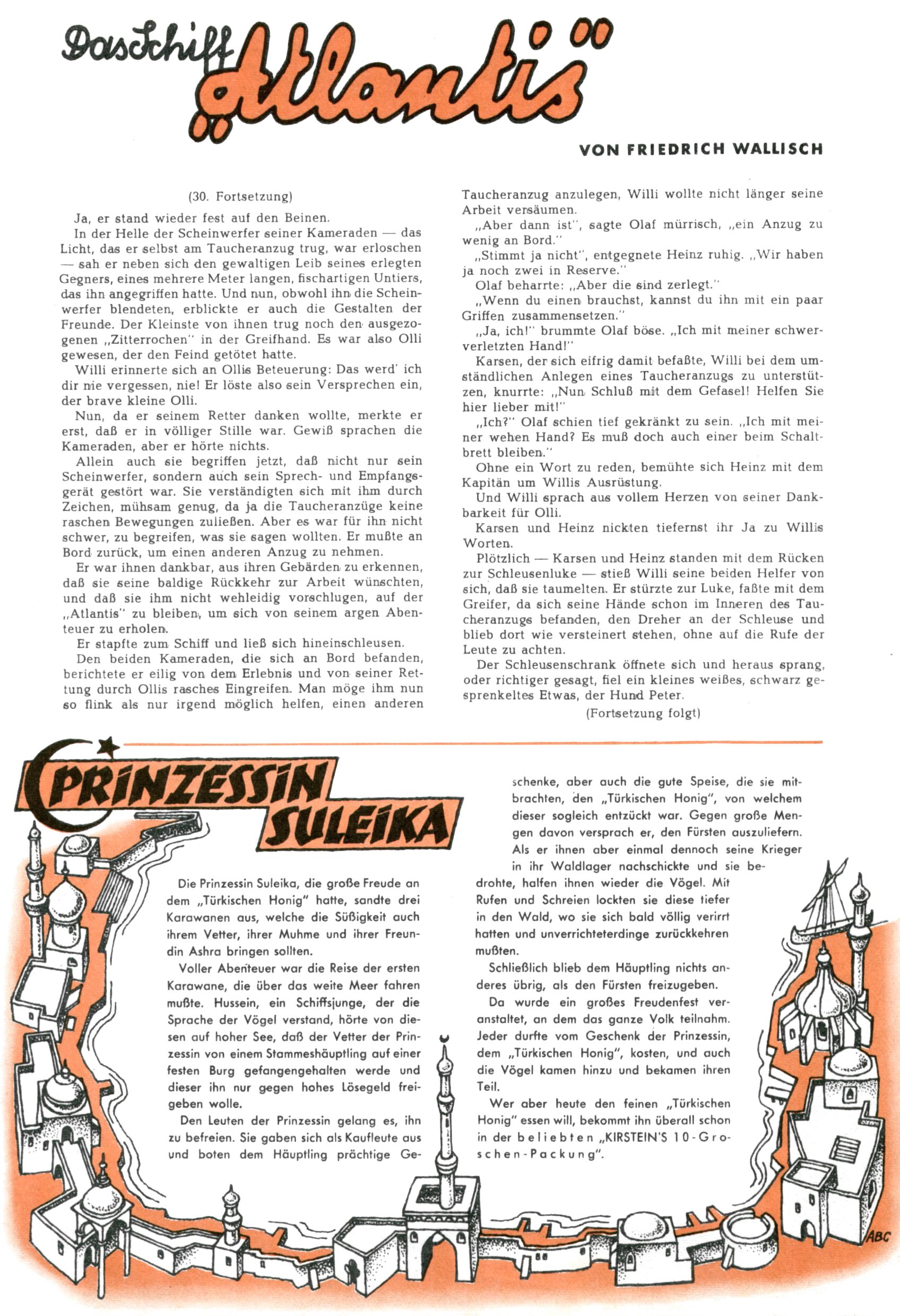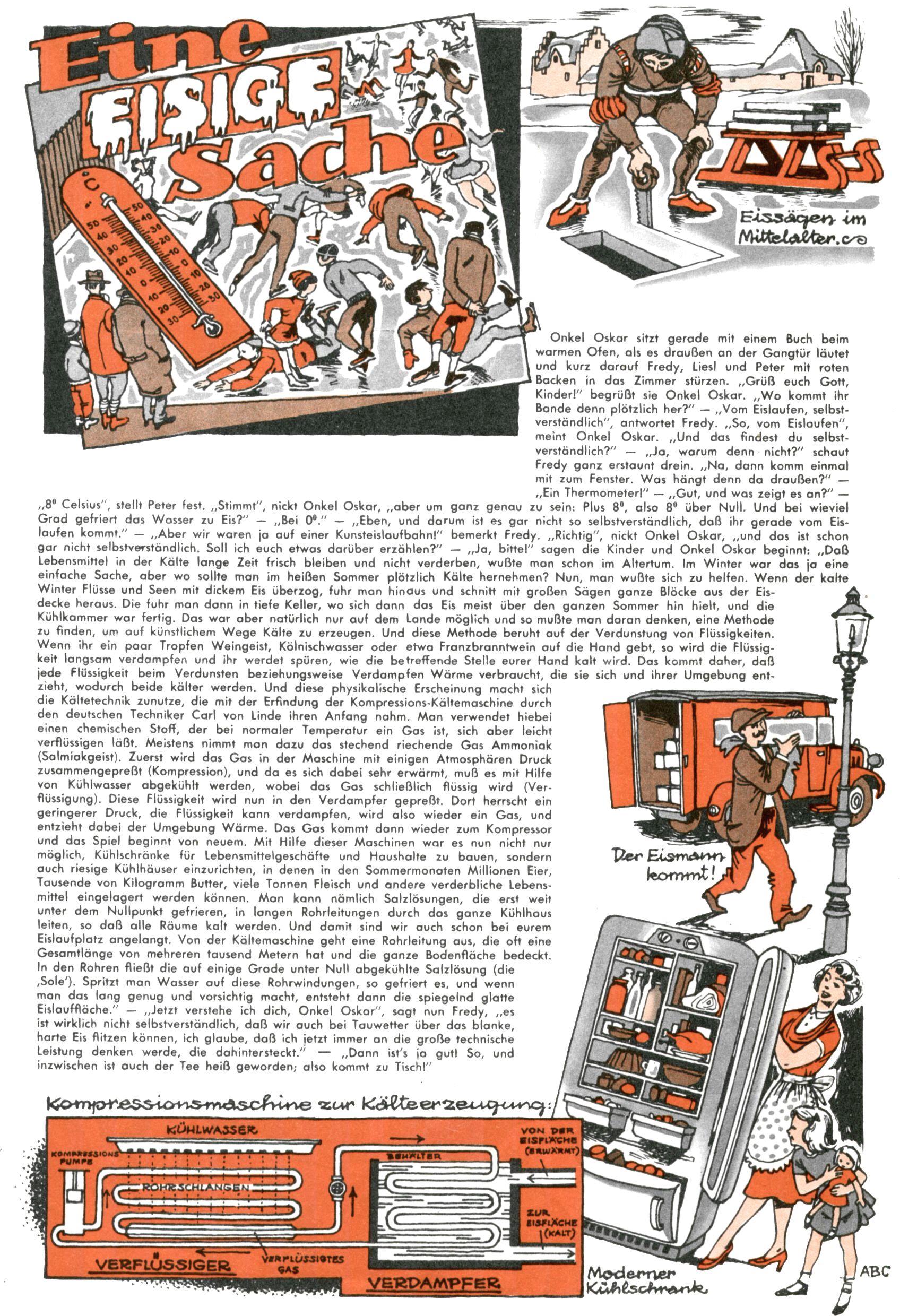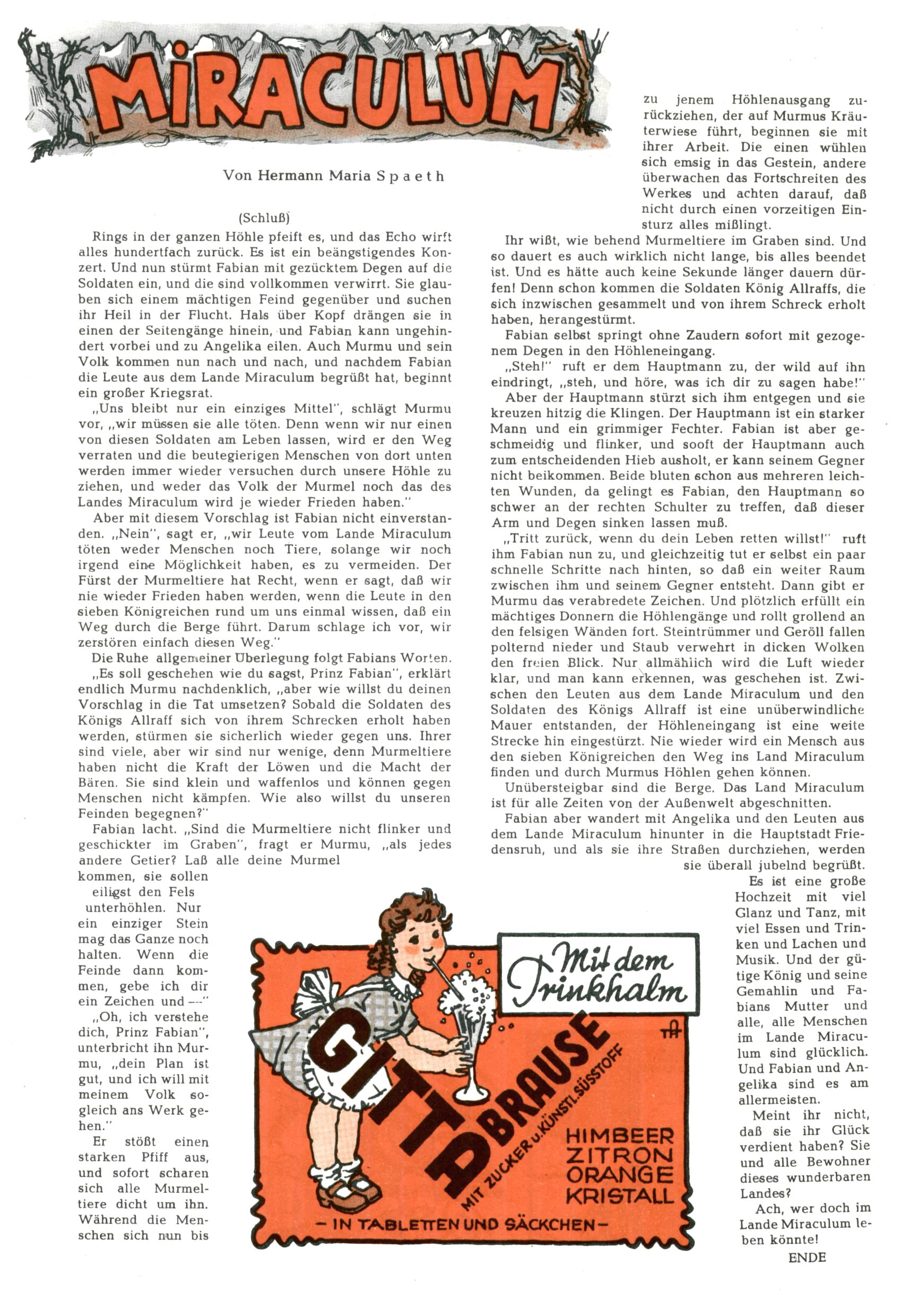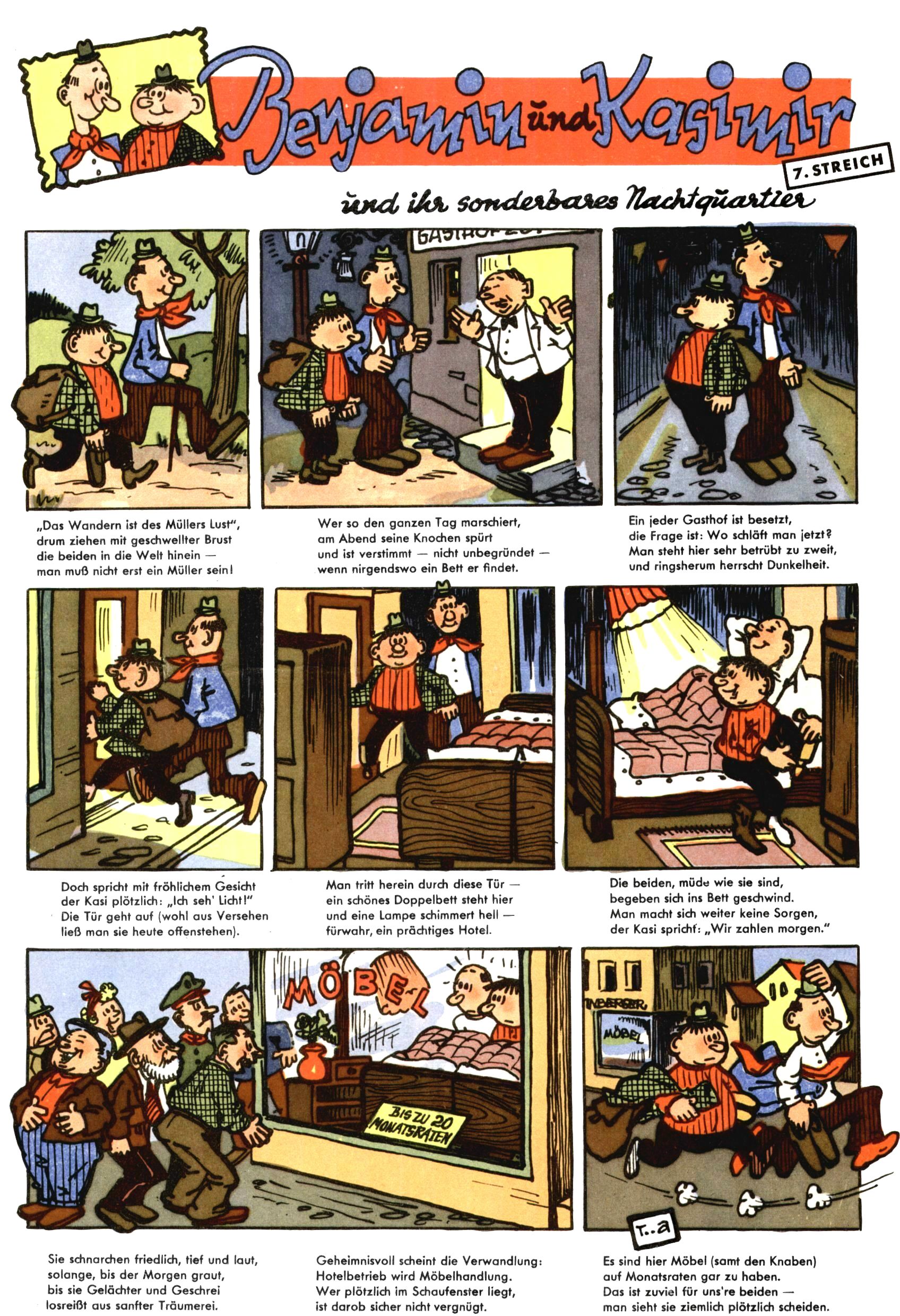 1953 – Alles beim Alten Wie lange darf man sich auf einem Erfolgskonzept ausruhen? Auch 1953 gab es keine offensichtlichen Änderungen am Layout der Zeitung. Zwar wurde Elfriede Vavrovsky teilweise durch andere Autoren abgelöst und erstmals kam Friedrich Bauer zum Zug, der bisher nur als Rätselonkel in Erscheinung getreten war. Allerdings ist anzunehmen, dass eine ganze Reihe unsignierter Erzählungen früherer Hefte ebenfalls der Feder von fb entstammen. ABC Peter Paul Prinz übernahm neuerlich die Illustration der technischen Seiten. Sein Willibald erschien ab sofort in 3 Spalten anstelle von 4 Zeilen, was ihm wesentlich mehr Gestaltungsfreiheit bot. Teja Aicher erfand die Clowns Benjamin und Kasimir nachdem ABC mit seiner Miniserie Zipferling, der lustige Kasperl bereits ein halbes Jahr zuvor durchaus mit Lachern punkten hatte können. Benjamin und Kasimir erschienen 1953 in jedem 2. Heft; nach dem Abdanken von Piff und Paff dann in jeder Ausgabe. Vom Aufbau her ähnelte die Serie dem Erfolgscartoon Willibald, der Zauberlehrling, ohne jedoch (aufgrund ihrer allzu "beschränkten" Möglichkeiten) an den Erfolg des Zauberlehrlings anknüpfen zu können. Nach dem Abschluss der Atlas-Daten und Karten erfand Annelies Umlauf Lamatsch weitere realitätsfremde Geschichten über die Natur und im Speziellen über Blumen. Eine medizinisch-biologische Spalte über den menschlichen Körper von Ewald Seifert war hingegen sachlicher und informativ. Ein kurzzeitiger Neuzugang bei den Grafikern war Hedwig Zumtobel. Sie wurde jedoch bald von Luzia Adelsberger abgelöst, die sich über Jahre hindurch als Zeichnerin etablierte. Friederike Nekut übernahm die Bastelseite für Mädchen. Die Kolumne Die Puppenschneiderin wurde mit Unser Hausmütterchen ergänzt, wodurch das handwerkliche Angebot für Mädchen erweitert werden konnte. Eine wesentliche Änderung am Titelblatt gab es 1953 aber doch: Endlich hatte man dem Erfolg von Zwerg Bumsti Rechnung getragen und ihn ins Logo erhoben. Er löste dort den Zwerg Bums aus dem Jahr 1948 in seiner Gondel ab, der zwar als Namenspatron für Zwerg Bumsti hergehalten hatte, mit dem es ansonsten aber keine Gemeinsamkeiten gab. |