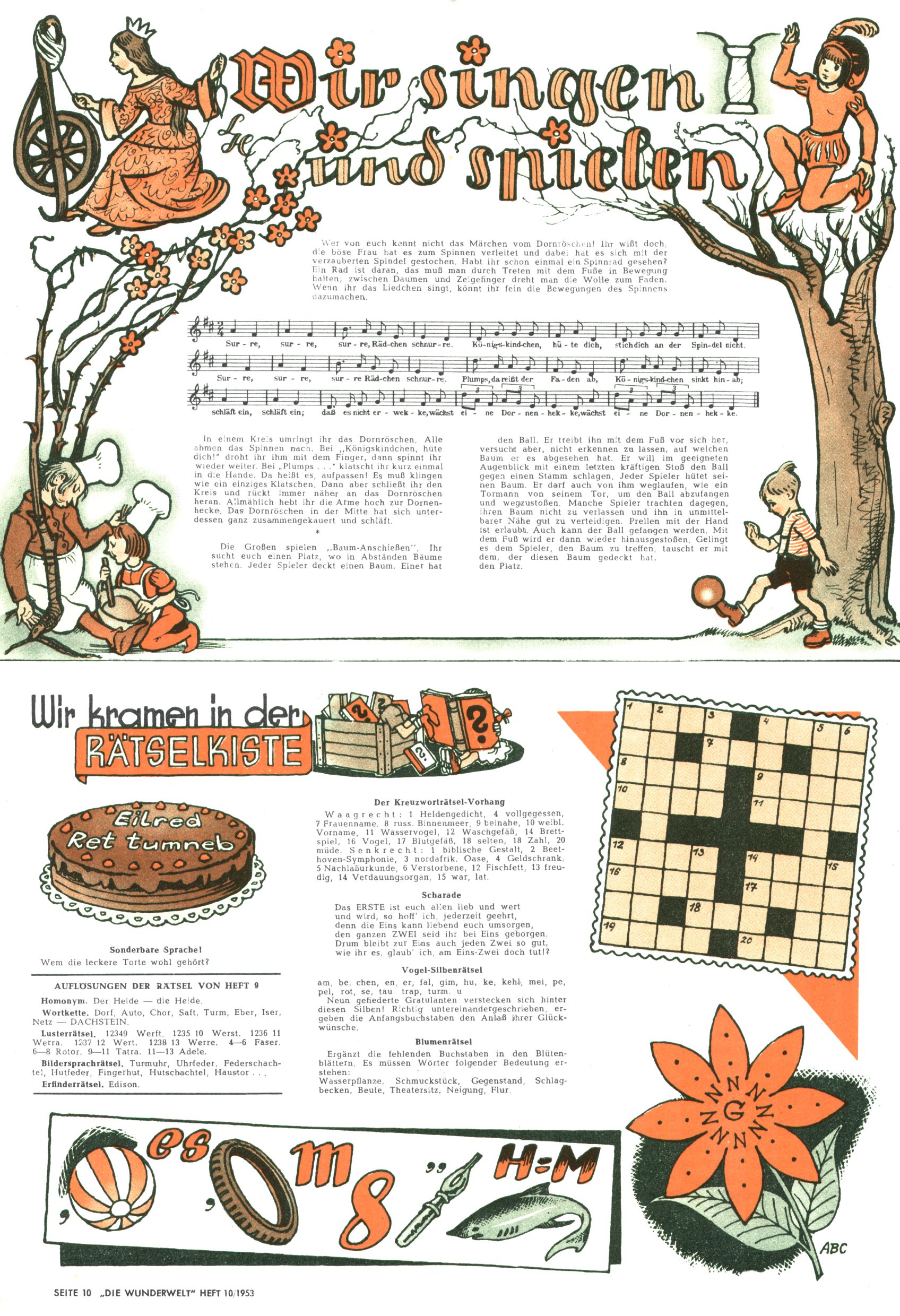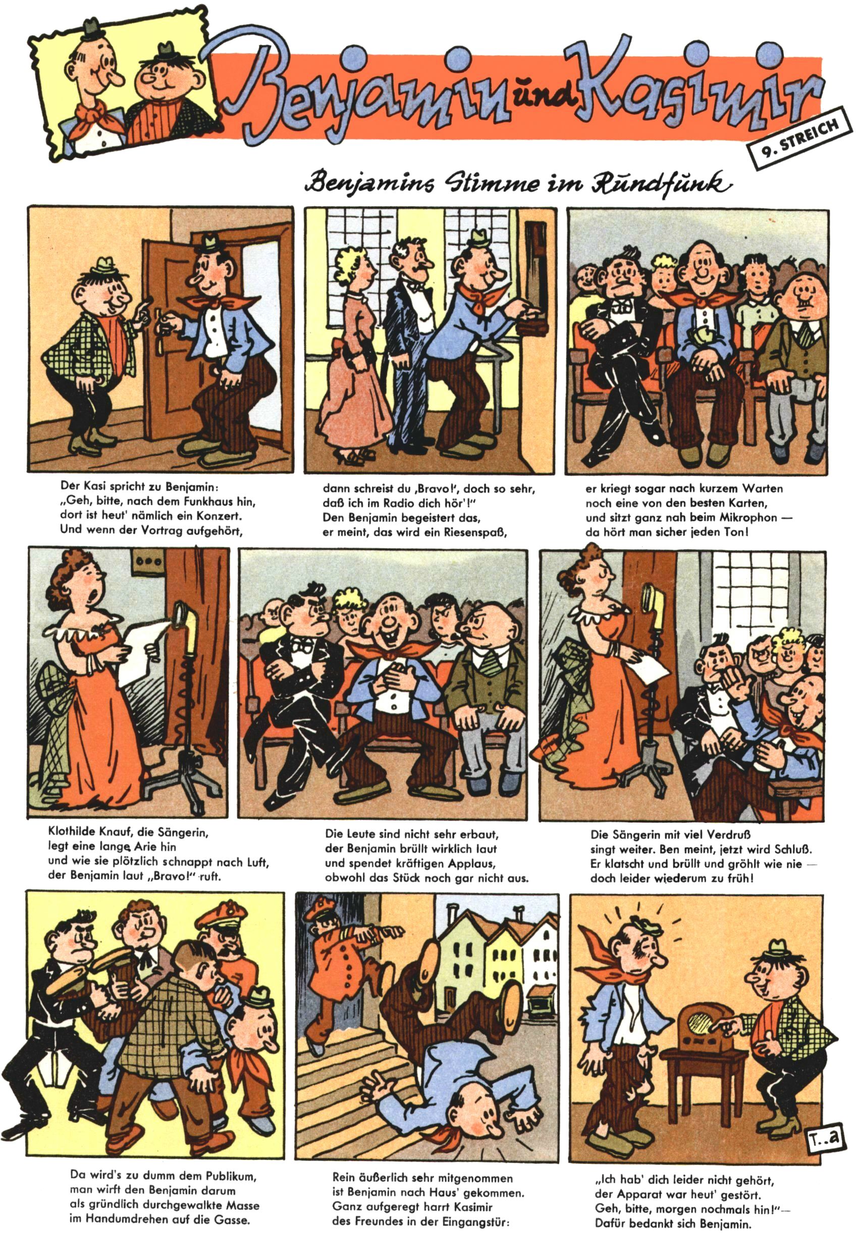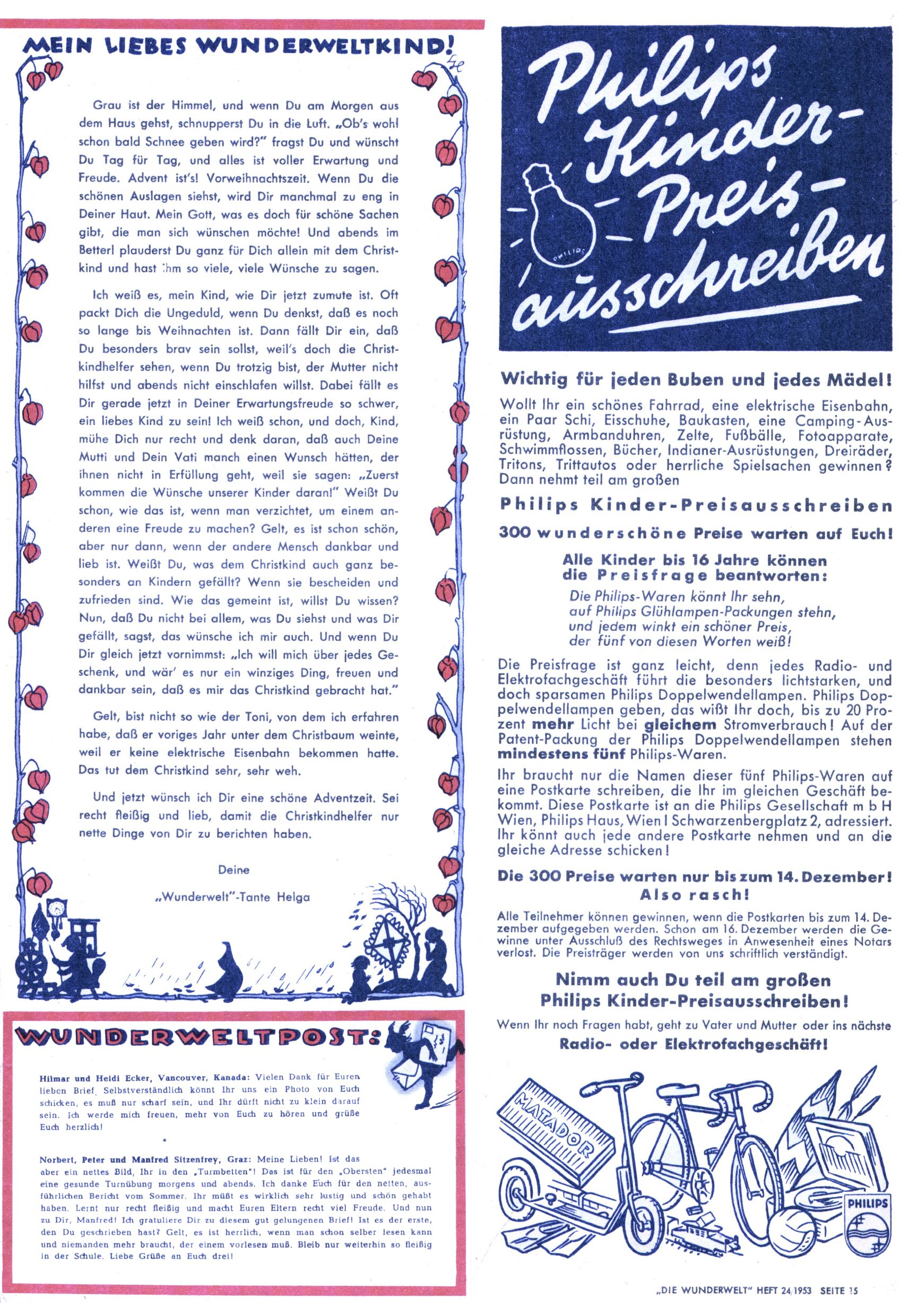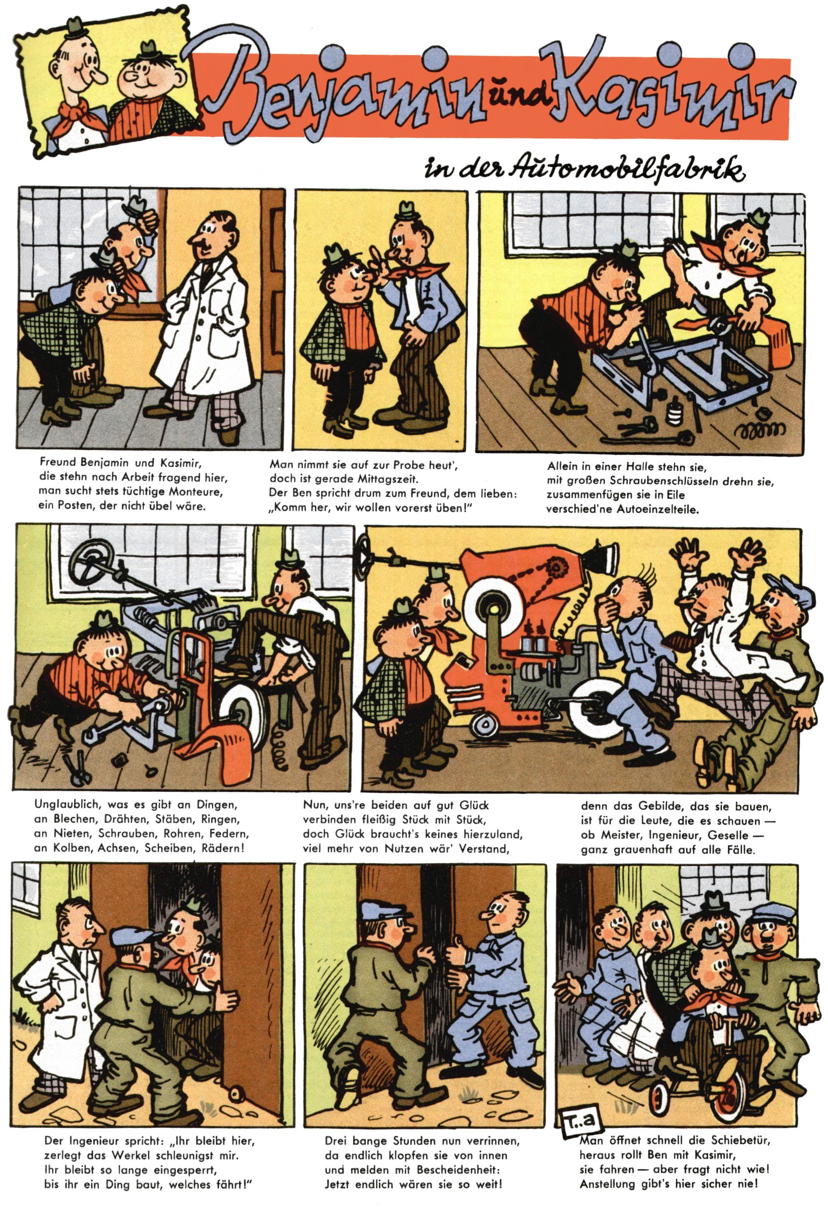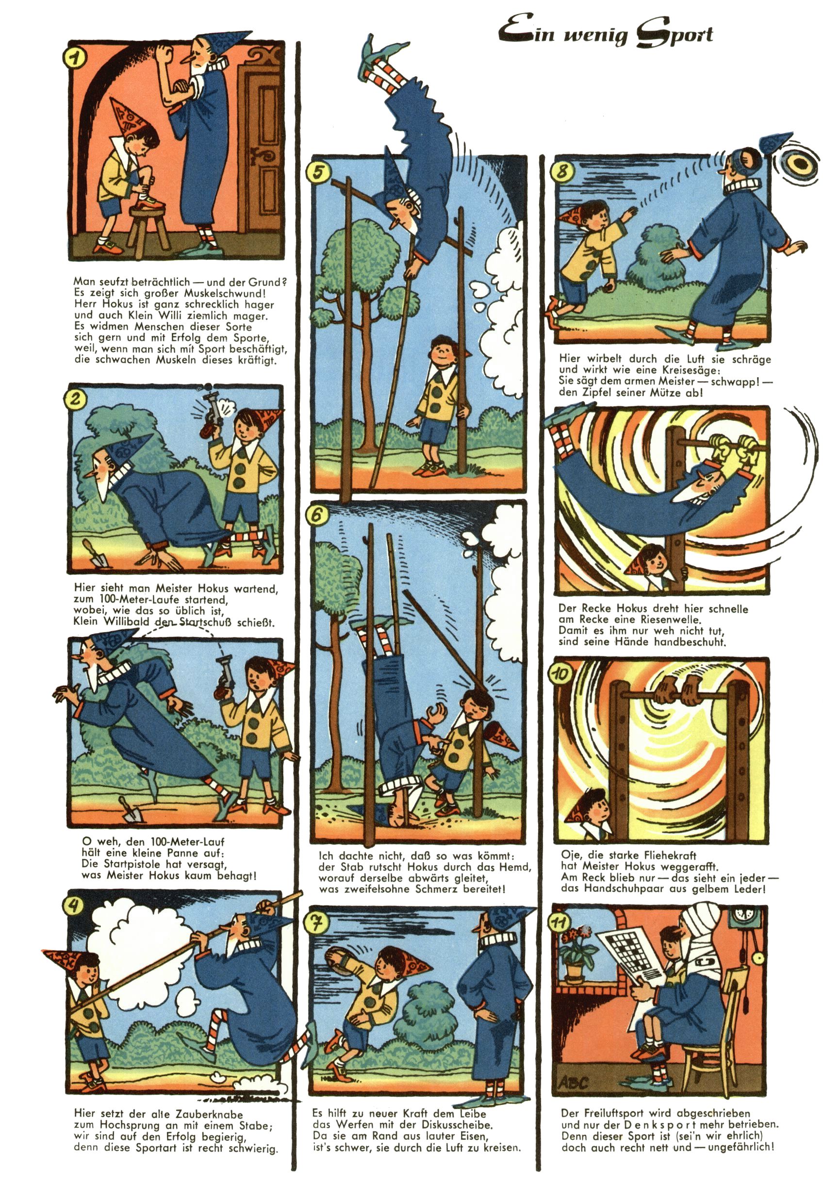 1953 – Alles beim Alten Wie lange darf man sich auf einem Erfolgskonzept ausruhen? Auch 1953 gab es keine offensichtlichen Änderungen am Layout der Zeitung. Zwar wurde Elfriede Vavrovsky teilweise durch andere Autoren abgelöst und erstmals kam Friedrich Bauer zum Zug, der bisher nur als Rätselonkel in Erscheinung getreten war. Allerdings ist anzunehmen, dass eine ganze Reihe unsignierter Erzählungen früherer Hefte ebenfalls der Feder von fb entstammen. ABC Peter Paul Prinz übernahm neuerlich die Illustration der technischen Seiten. Sein Willibald erschien ab sofort in 3 Spalten anstelle von 4 Zeilen, was ihm wesentlich mehr Gestaltungsfreiheit bot. Teja Aicher erfand die Clowns Benjamin und Kasimir nachdem ABC mit seiner Miniserie Zipferling, der lustige Kasperl bereits ein halbes Jahr zuvor durchaus mit Lachern punkten hatte können. Benjamin und Kasimir erschienen 1953 in jedem 2. Heft; nach dem Abdanken von Piff und Paff dann in jeder Ausgabe. Vom Aufbau her ähnelte die Serie dem Erfolgscartoon Willibald, der Zauberlehrling, ohne jedoch (aufgrund ihrer allzu "beschränkten" Möglichkeiten) an den Erfolg des Zauberlehrlings anknüpfen zu können. Nach dem Abschluss der Atlas-Daten und Karten erfand Annelies Umlauf Lamatsch weitere realitätsfremde Geschichten über die Natur und im Speziellen über Blumen. Eine medizinisch-biologische Spalte über den menschlichen Körper von Ewald Seifert war hingegen sachlicher und informativ. Ein kurzzeitiger Neuzugang bei den Grafikern war Hedwig Zumtobel. Sie wurde jedoch bald von Luzia Adelsberger abgelöst, die sich über Jahre hindurch als Zeichnerin etablierte. Friederike Nekut übernahm die Bastelseite für Mädchen. Die Kolumne Die Puppenschneiderin wurde mit Unser Hausmütterchen ergänzt, wodurch das handwerkliche Angebot für Mädchen erweitert werden konnte. Eine wesentliche Änderung am Titelblatt gab es 1953 aber doch: Endlich hatte man dem Erfolg von Zwerg Bumsti Rechnung getragen und ihn ins Logo erhoben. Er löste dort den Zwerg Bums aus dem Jahr 1948 in seiner Gondel ab, der zwar als Namenspatron für Zwerg Bumsti hergehalten hatte, mit dem es ansonsten aber keine Gemeinsamkeiten gab. |