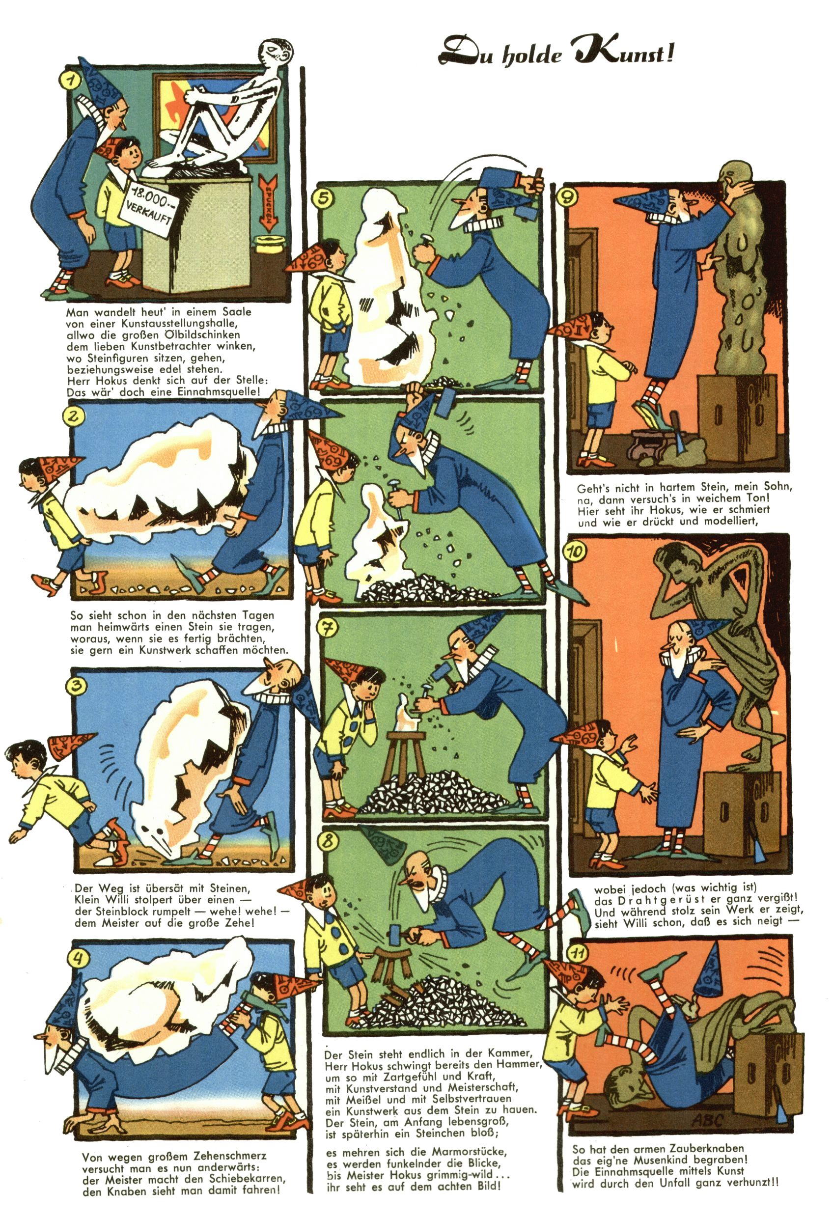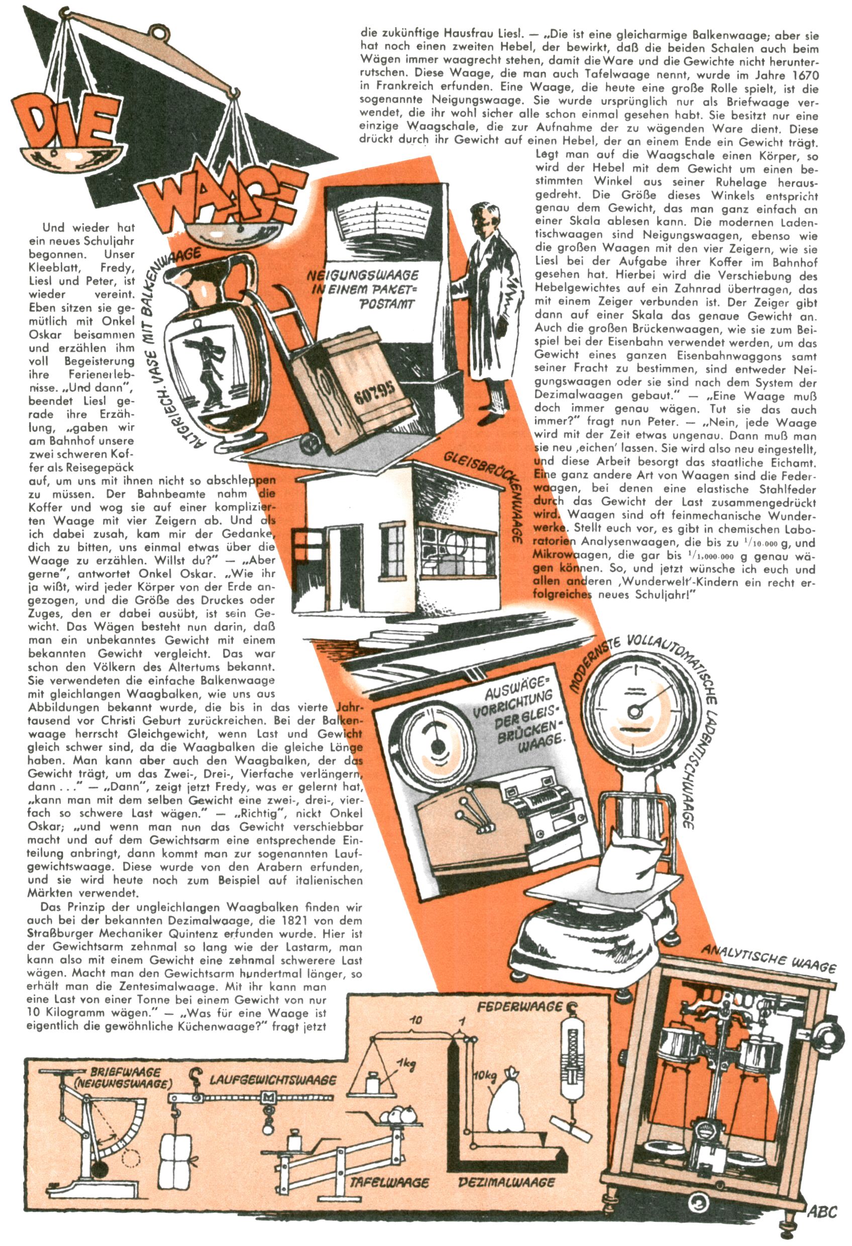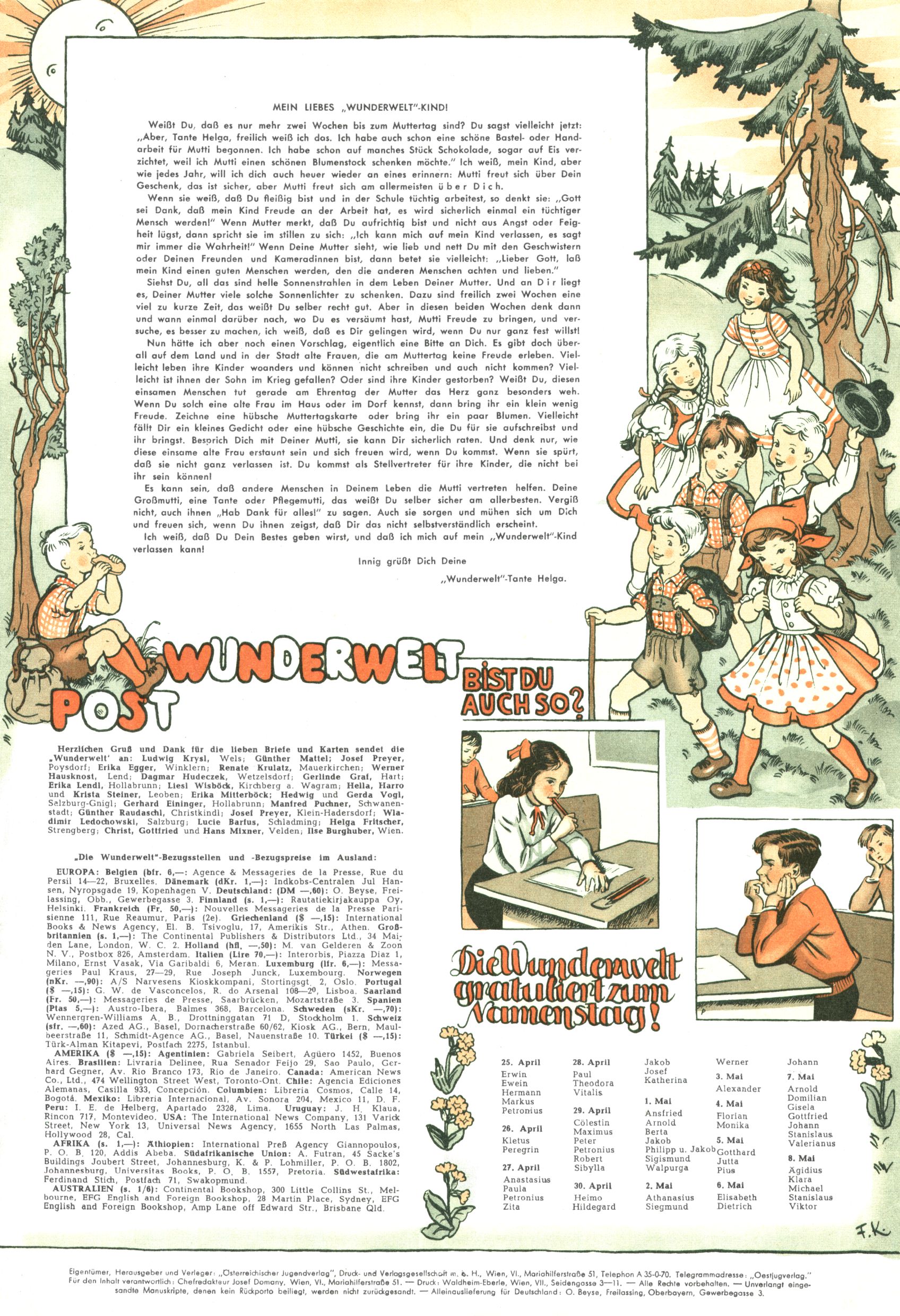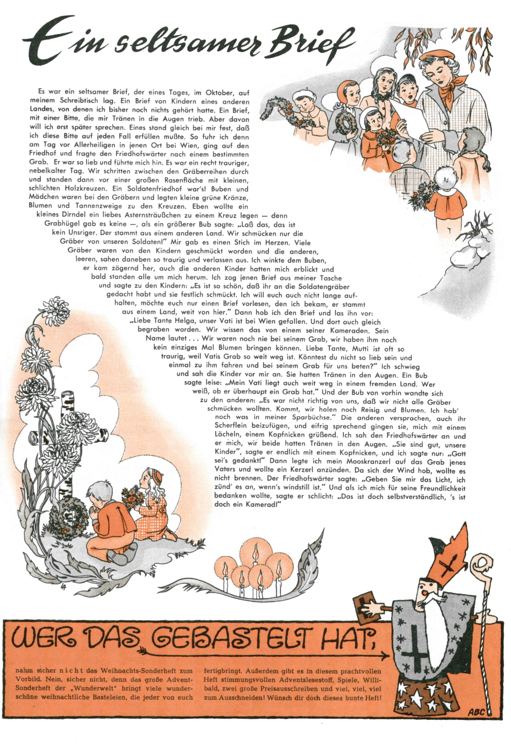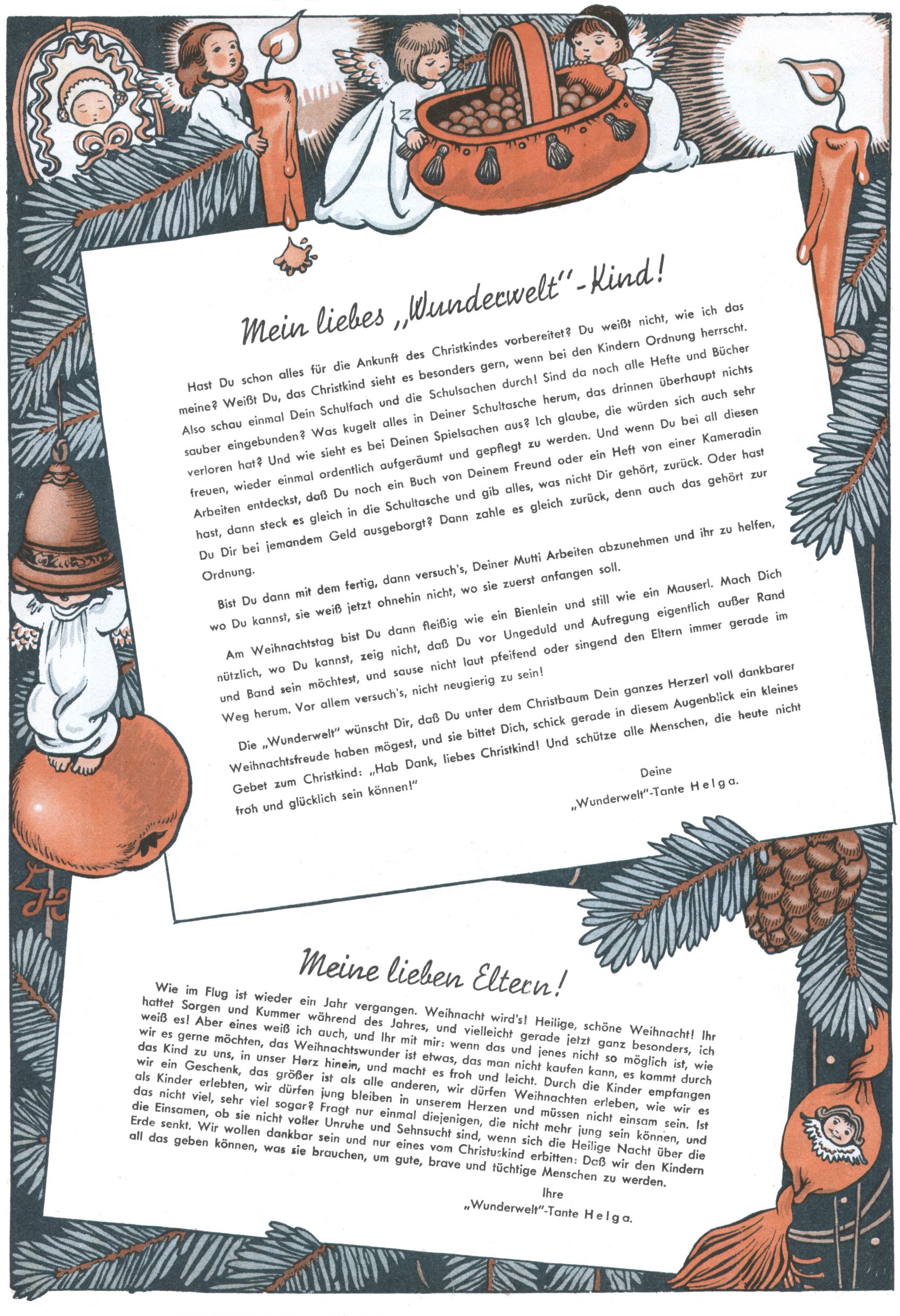 1953 – Alles beim Alten Wie lange darf man sich auf einem Erfolgskonzept ausruhen? Auch 1953 gab es keine offensichtlichen Änderungen am Layout der Zeitung. Zwar wurde Elfriede Vavrovsky teilweise durch andere Autoren abgelöst und erstmals kam Friedrich Bauer zum Zug, der bisher nur als Rätselonkel in Erscheinung getreten war. Allerdings ist anzunehmen, dass eine ganze Reihe unsignierter Erzählungen früherer Hefte ebenfalls der Feder von fb entstammen. ABC Peter Paul Prinz übernahm neuerlich die Illustration der technischen Seiten. Sein Willibald erschien ab sofort in 3 Spalten anstelle von 4 Zeilen, was ihm wesentlich mehr Gestaltungsfreiheit bot. Teja Aicher erfand die Clowns Benjamin und Kasimir nachdem ABC mit seiner Miniserie Zipferling, der lustige Kasperl bereits ein halbes Jahr zuvor durchaus mit Lachern punkten hatte können. Benjamin und Kasimir erschienen 1953 in jedem 2. Heft; nach dem Abdanken von Piff und Paff dann in jeder Ausgabe. Vom Aufbau her ähnelte die Serie dem Erfolgscartoon Willibald, der Zauberlehrling, ohne jedoch (aufgrund ihrer allzu "beschränkten" Möglichkeiten) an den Erfolg des Zauberlehrlings anknüpfen zu können. Nach dem Abschluss der Atlas-Daten und Karten erfand Annelies Umlauf Lamatsch weitere realitätsfremde Geschichten über die Natur und im Speziellen über Blumen. Eine medizinisch-biologische Spalte über den menschlichen Körper von Ewald Seifert war hingegen sachlicher und informativ. Ein kurzzeitiger Neuzugang bei den Grafikern war Hedwig Zumtobel. Sie wurde jedoch bald von Luzia Adelsberger abgelöst, die sich über Jahre hindurch als Zeichnerin etablierte. Friederike Nekut übernahm die Bastelseite für Mädchen. Die Kolumne Die Puppenschneiderin wurde mit Unser Hausmütterchen ergänzt, wodurch das handwerkliche Angebot für Mädchen erweitert werden konnte. Eine wesentliche Änderung am Titelblatt gab es 1953 aber doch: Endlich hatte man dem Erfolg von Zwerg Bumsti Rechnung getragen und ihn ins Logo erhoben. Er löste dort den Zwerg Bums aus dem Jahr 1948 in seiner Gondel ab, der zwar als Namenspatron für Zwerg Bumsti hergehalten hatte, mit dem es ansonsten aber keine Gemeinsamkeiten gab. |