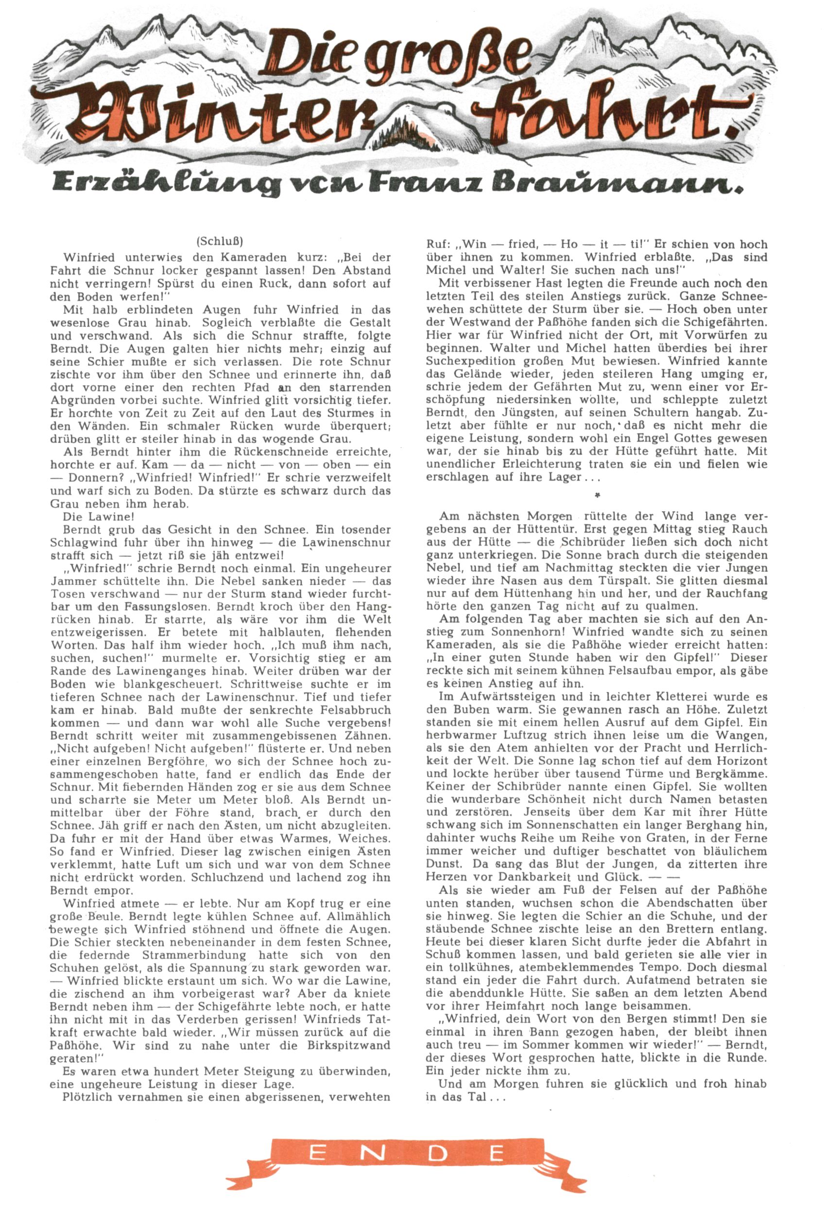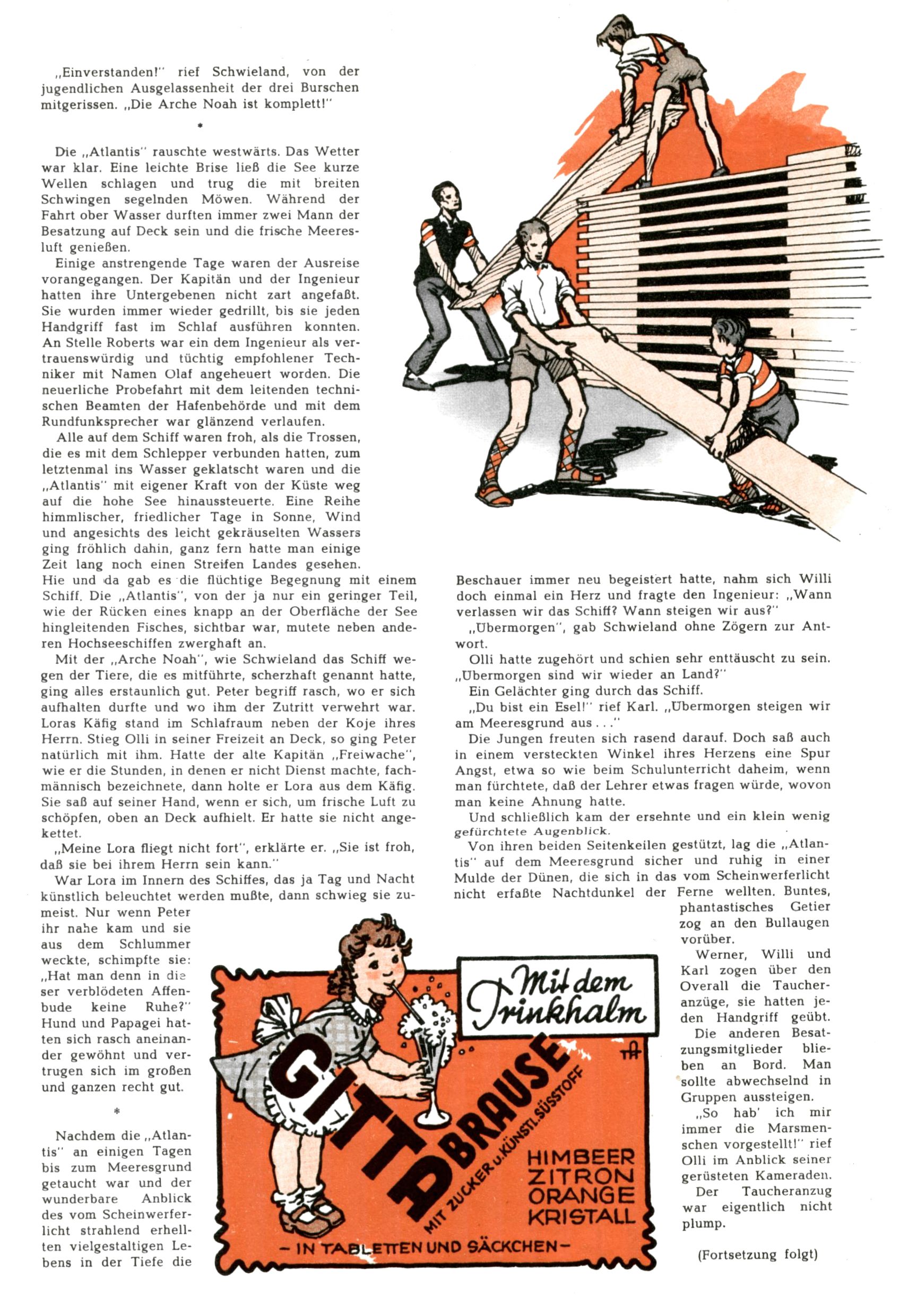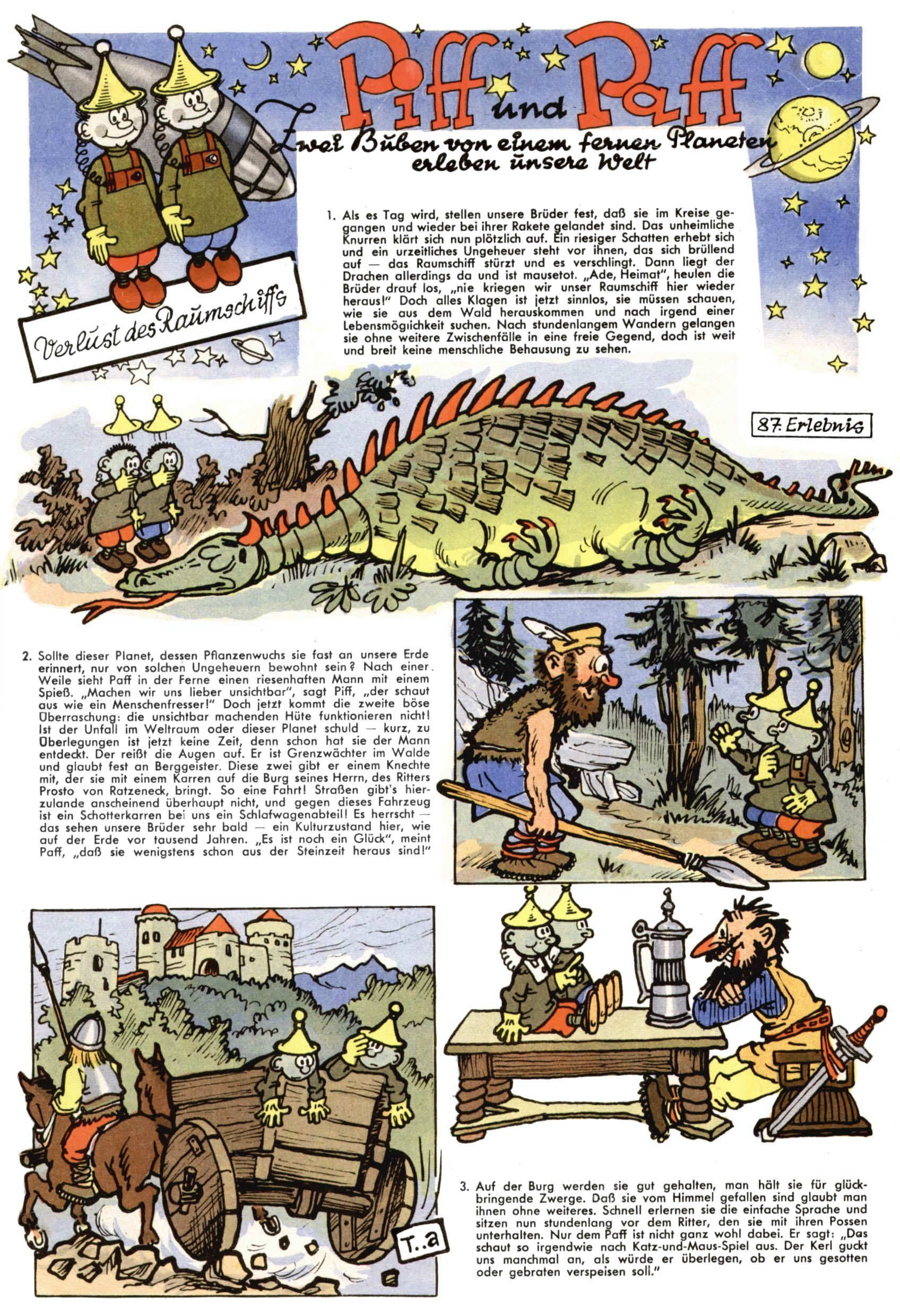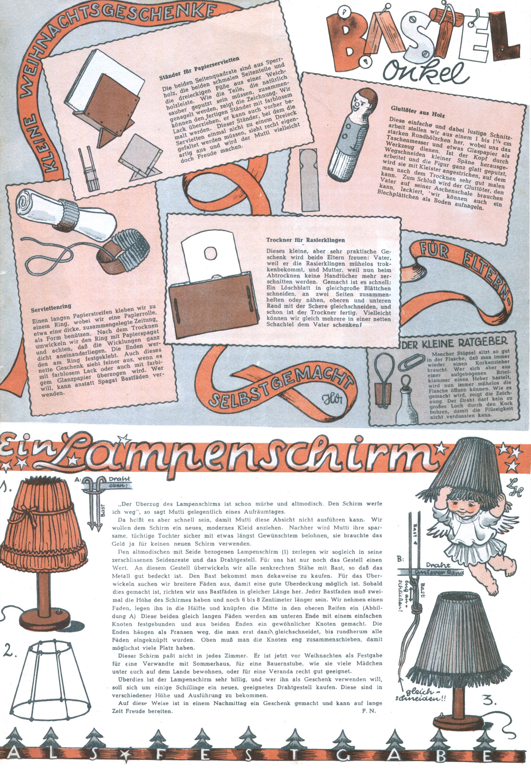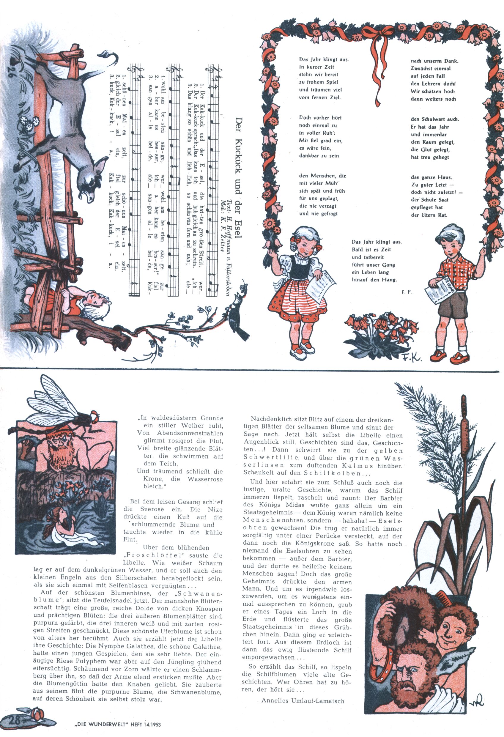 1953 – Alles beim Alten Wie lange darf man sich auf einem Erfolgskonzept ausruhen? Auch 1953 gab es keine offensichtlichen Änderungen am Layout der Zeitung. Zwar wurde Elfriede Vavrovsky teilweise durch andere Autoren abgelöst und erstmals kam Friedrich Bauer zum Zug, der bisher nur als Rätselonkel in Erscheinung getreten war. Allerdings ist anzunehmen, dass eine ganze Reihe unsignierter Erzählungen früherer Hefte ebenfalls der Feder von fb entstammen. ABC Peter Paul Prinz übernahm neuerlich die Illustration der technischen Seiten. Sein Willibald erschien ab sofort in 3 Spalten anstelle von 4 Zeilen, was ihm wesentlich mehr Gestaltungsfreiheit bot. Teja Aicher erfand die Clowns Benjamin und Kasimir nachdem ABC mit seiner Miniserie Zipferling, der lustige Kasperl bereits ein halbes Jahr zuvor durchaus mit Lachern punkten hatte können. Benjamin und Kasimir erschienen 1953 in jedem 2. Heft; nach dem Abdanken von Piff und Paff dann in jeder Ausgabe. Vom Aufbau her ähnelte die Serie dem Erfolgscartoon Willibald, der Zauberlehrling, ohne jedoch (aufgrund ihrer allzu "beschränkten" Möglichkeiten) an den Erfolg des Zauberlehrlings anknüpfen zu können. Nach dem Abschluss der Atlas-Daten und Karten erfand Annelies Umlauf Lamatsch weitere realitätsfremde Geschichten über die Natur und im Speziellen über Blumen. Eine medizinisch-biologische Spalte über den menschlichen Körper von Ewald Seifert war hingegen sachlicher und informativ. Ein kurzzeitiger Neuzugang bei den Grafikern war Hedwig Zumtobel. Sie wurde jedoch bald von Luzia Adelsberger abgelöst, die sich über Jahre hindurch als Zeichnerin etablierte. Friederike Nekut übernahm die Bastelseite für Mädchen. Die Kolumne Die Puppenschneiderin wurde mit Unser Hausmütterchen ergänzt, wodurch das handwerkliche Angebot für Mädchen erweitert werden konnte. Eine wesentliche Änderung am Titelblatt gab es 1953 aber doch: Endlich hatte man dem Erfolg von Zwerg Bumsti Rechnung getragen und ihn ins Logo erhoben. Er löste dort den Zwerg Bums aus dem Jahr 1948 in seiner Gondel ab, der zwar als Namenspatron für Zwerg Bumsti hergehalten hatte, mit dem es ansonsten aber keine Gemeinsamkeiten gab. |