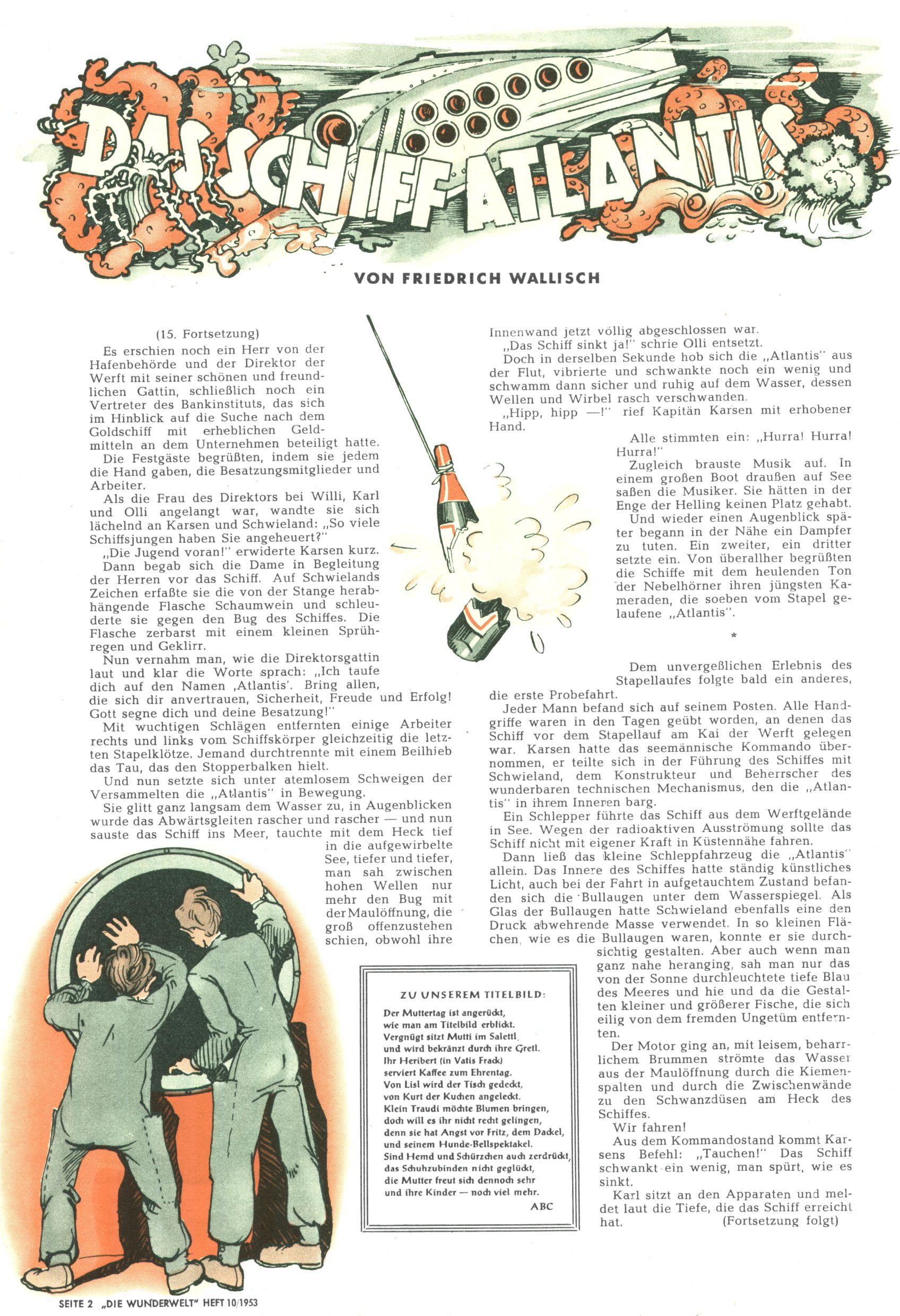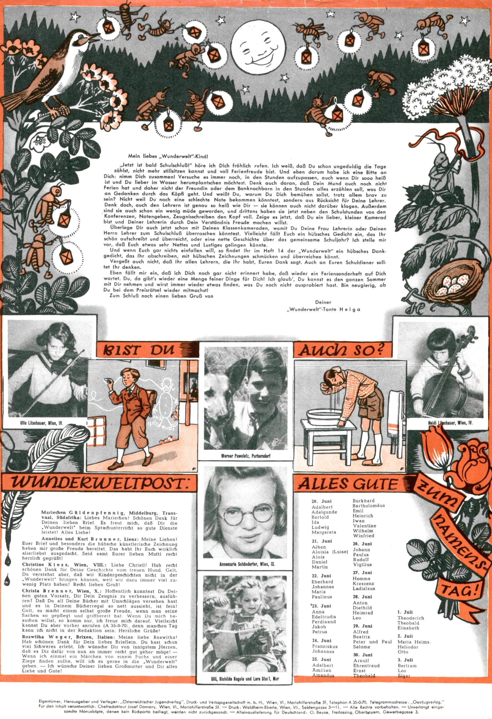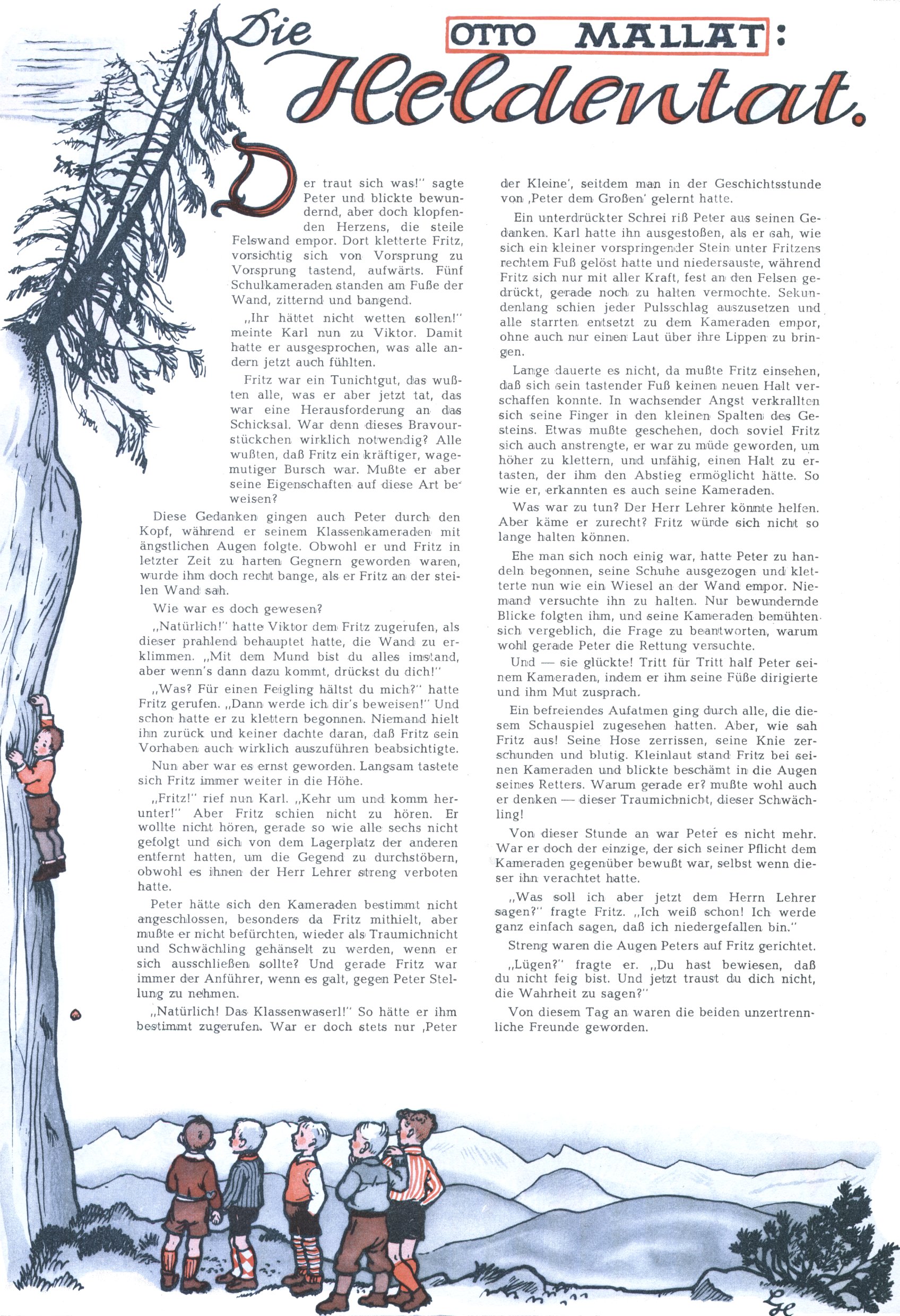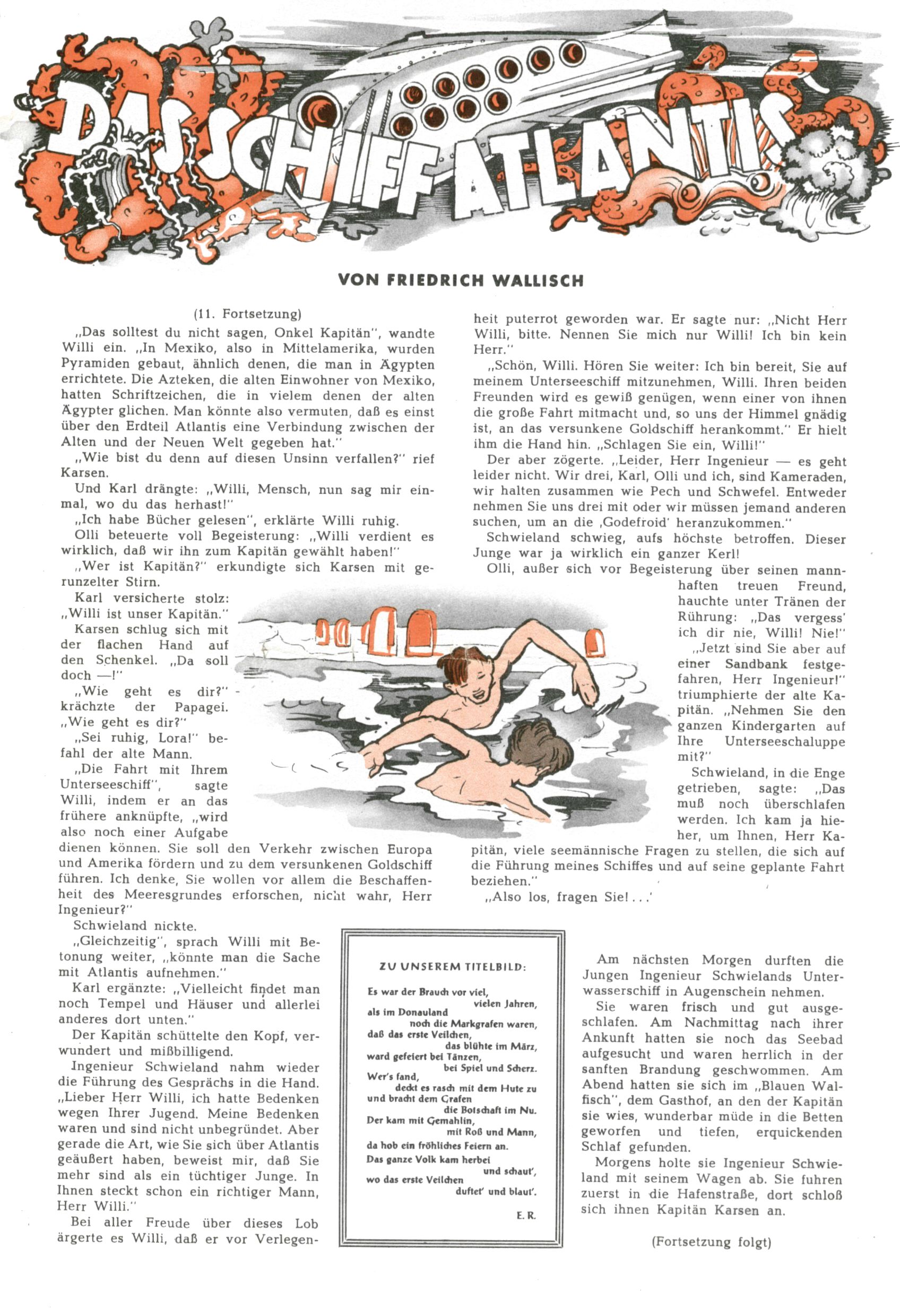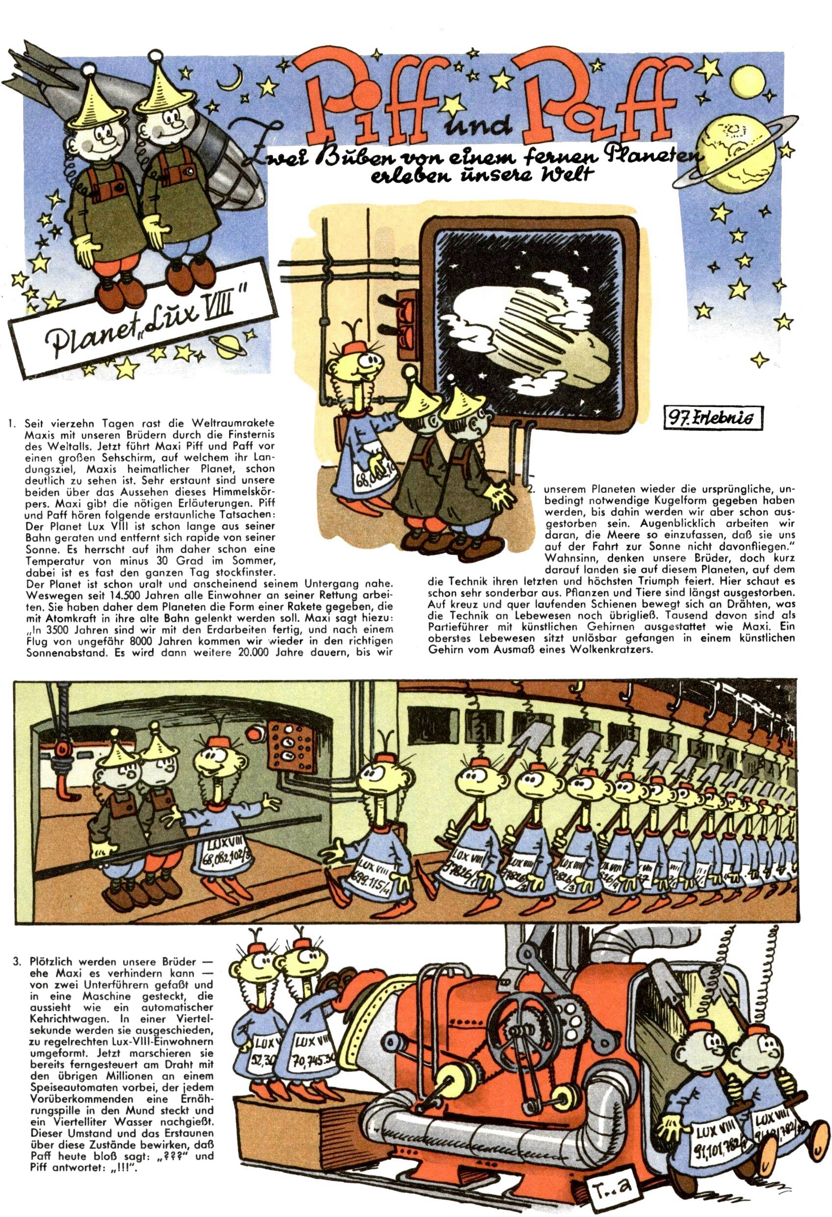 1953 – Alles beim Alten Wie lange darf man sich auf einem Erfolgskonzept ausruhen? Auch 1953 gab es keine offensichtlichen Änderungen am Layout der Zeitung. Zwar wurde Elfriede Vavrovsky teilweise durch andere Autoren abgelöst und erstmals kam Friedrich Bauer zum Zug, der bisher nur als Rätselonkel in Erscheinung getreten war. Allerdings ist anzunehmen, dass eine ganze Reihe unsignierter Erzählungen früherer Hefte ebenfalls der Feder von fb entstammen. ABC Peter Paul Prinz übernahm neuerlich die Illustration der technischen Seiten. Sein Willibald erschien ab sofort in 3 Spalten anstelle von 4 Zeilen, was ihm wesentlich mehr Gestaltungsfreiheit bot. Teja Aicher erfand die Clowns Benjamin und Kasimir nachdem ABC mit seiner Miniserie Zipferling, der lustige Kasperl bereits ein halbes Jahr zuvor durchaus mit Lachern punkten hatte können. Benjamin und Kasimir erschienen 1953 in jedem 2. Heft; nach dem Abdanken von Piff und Paff dann in jeder Ausgabe. Vom Aufbau her ähnelte die Serie dem Erfolgscartoon Willibald, der Zauberlehrling, ohne jedoch (aufgrund ihrer allzu "beschränkten" Möglichkeiten) an den Erfolg des Zauberlehrlings anknüpfen zu können. Nach dem Abschluss der Atlas-Daten und Karten erfand Annelies Umlauf Lamatsch weitere realitätsfremde Geschichten über die Natur und im Speziellen über Blumen. Eine medizinisch-biologische Spalte über den menschlichen Körper von Ewald Seifert war hingegen sachlicher und informativ. Ein kurzzeitiger Neuzugang bei den Grafikern war Hedwig Zumtobel. Sie wurde jedoch bald von Luzia Adelsberger abgelöst, die sich über Jahre hindurch als Zeichnerin etablierte. Friederike Nekut übernahm die Bastelseite für Mädchen. Die Kolumne Die Puppenschneiderin wurde mit Unser Hausmütterchen ergänzt, wodurch das handwerkliche Angebot für Mädchen erweitert werden konnte. Eine wesentliche Änderung am Titelblatt gab es 1953 aber doch: Endlich hatte man dem Erfolg von Zwerg Bumsti Rechnung getragen und ihn ins Logo erhoben. Er löste dort den Zwerg Bums aus dem Jahr 1948 in seiner Gondel ab, der zwar als Namenspatron für Zwerg Bumsti hergehalten hatte, mit dem es ansonsten aber keine Gemeinsamkeiten gab. |