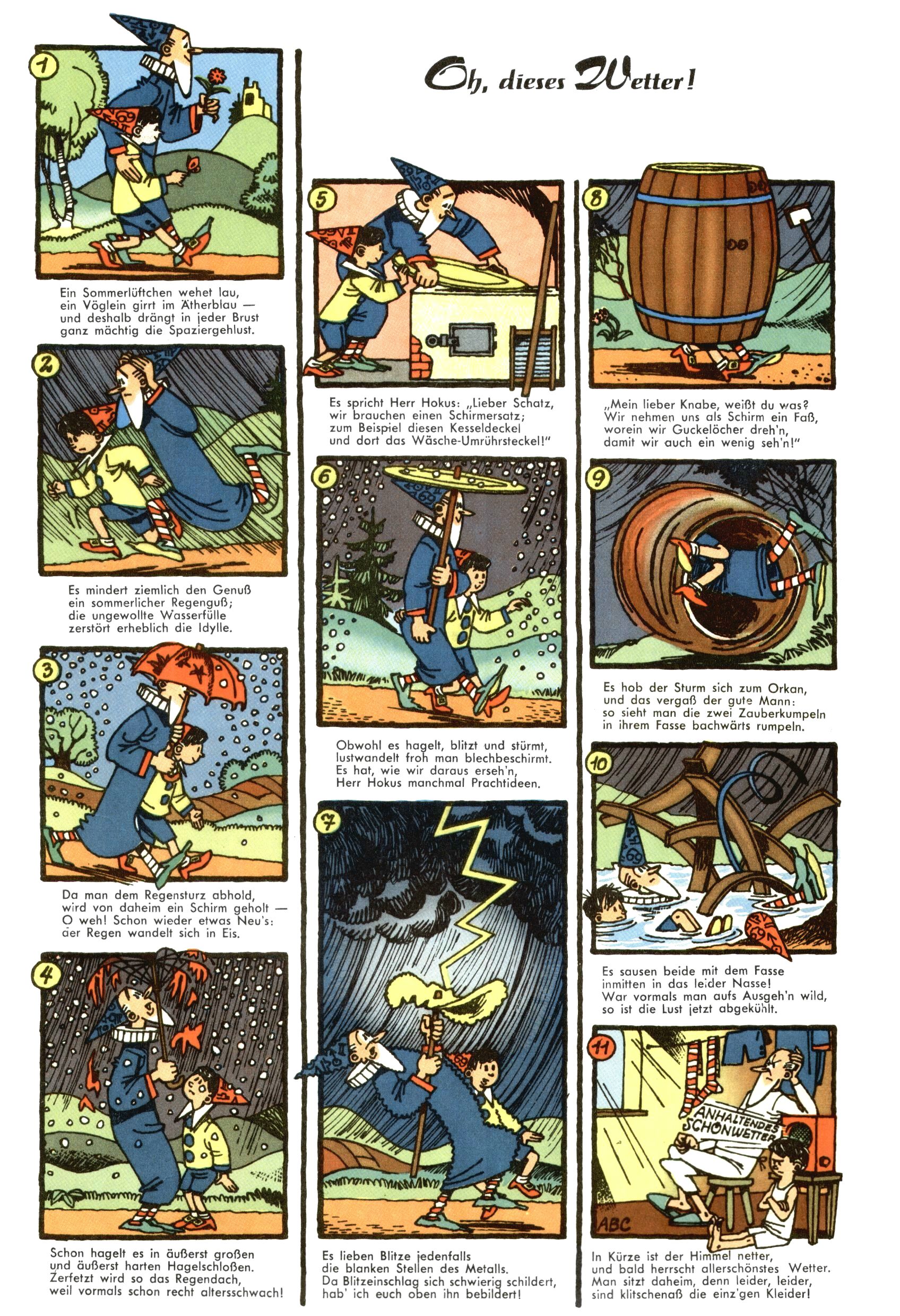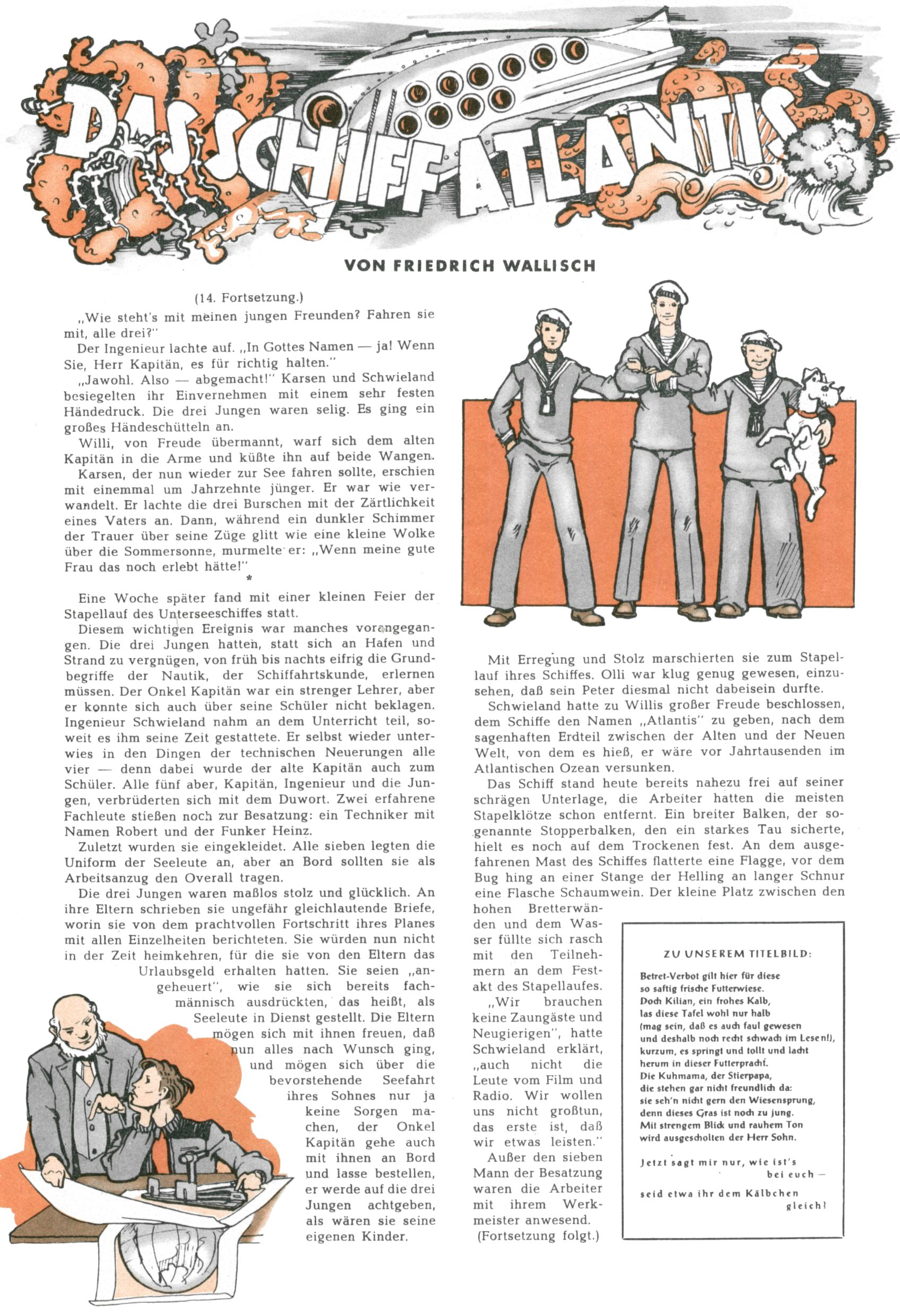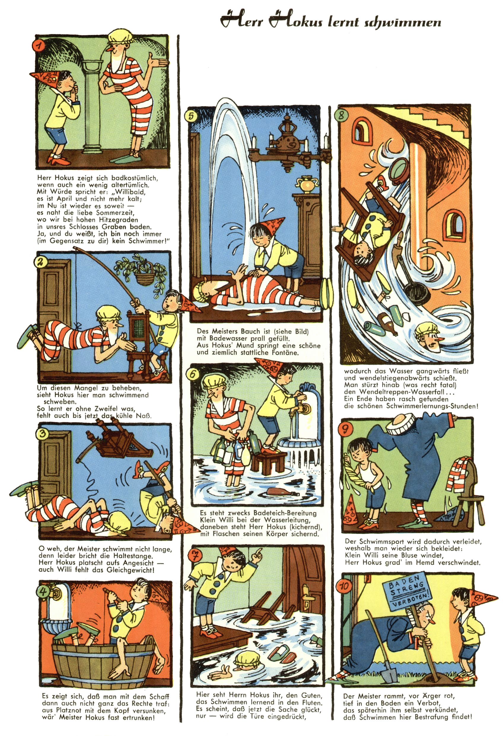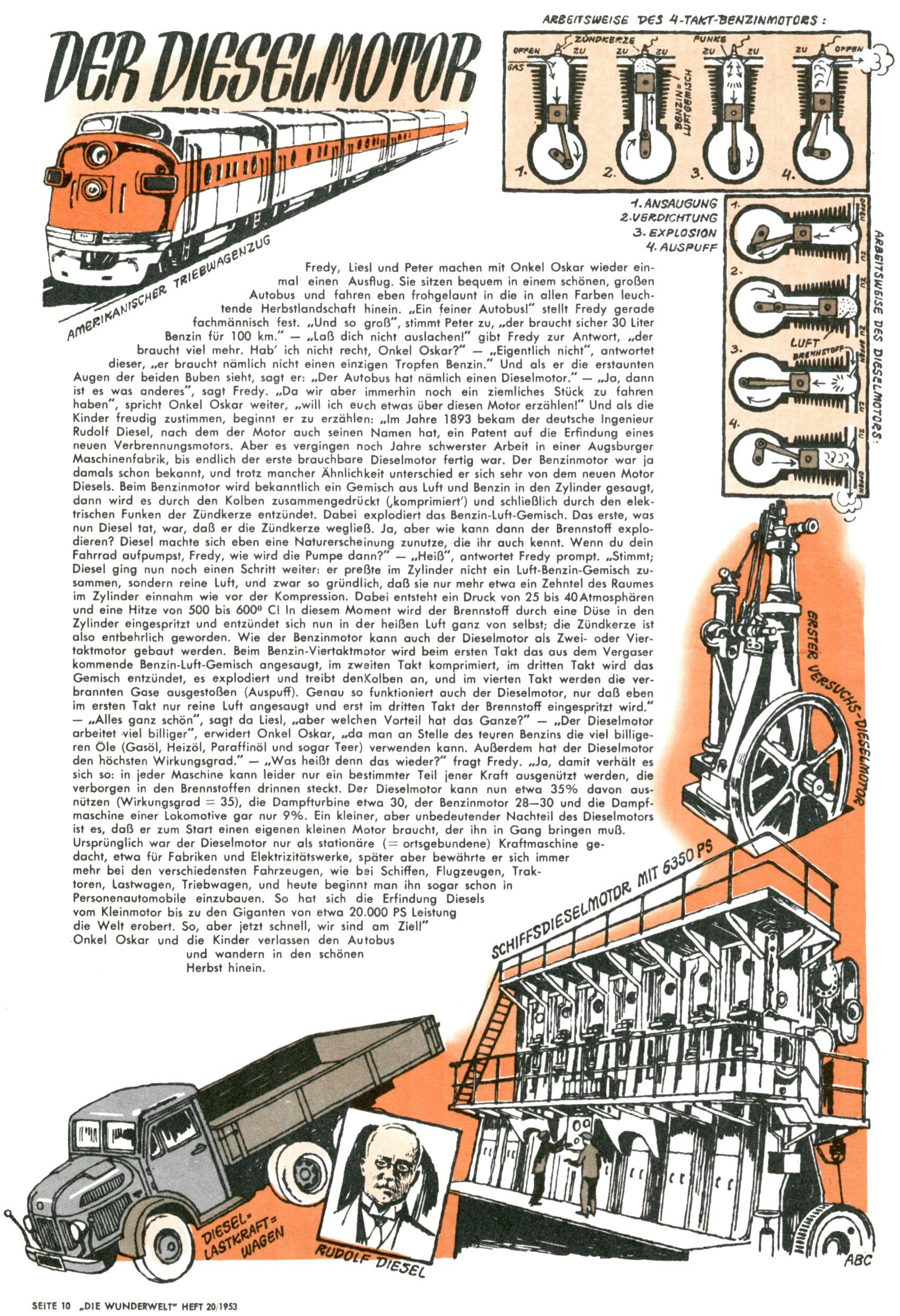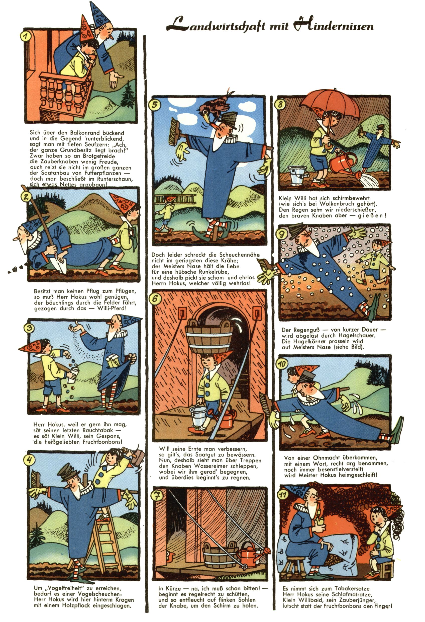 1953 – Alles beim Alten Wie lange darf man sich auf einem Erfolgskonzept ausruhen? Auch 1953 gab es keine offensichtlichen Änderungen am Layout der Zeitung. Zwar wurde Elfriede Vavrovsky teilweise durch andere Autoren abgelöst und erstmals kam Friedrich Bauer zum Zug, der bisher nur als Rätselonkel in Erscheinung getreten war. Allerdings ist anzunehmen, dass eine ganze Reihe unsignierter Erzählungen früherer Hefte ebenfalls der Feder von fb entstammen. ABC Peter Paul Prinz übernahm neuerlich die Illustration der technischen Seiten. Sein Willibald erschien ab sofort in 3 Spalten anstelle von 4 Zeilen, was ihm wesentlich mehr Gestaltungsfreiheit bot. Teja Aicher erfand die Clowns Benjamin und Kasimir nachdem ABC mit seiner Miniserie Zipferling, der lustige Kasperl bereits ein halbes Jahr zuvor durchaus mit Lachern punkten hatte können. Benjamin und Kasimir erschienen 1953 in jedem 2. Heft; nach dem Abdanken von Piff und Paff dann in jeder Ausgabe. Vom Aufbau her ähnelte die Serie dem Erfolgscartoon Willibald, der Zauberlehrling, ohne jedoch (aufgrund ihrer allzu "beschränkten" Möglichkeiten) an den Erfolg des Zauberlehrlings anknüpfen zu können. Nach dem Abschluss der Atlas-Daten und Karten erfand Annelies Umlauf Lamatsch weitere realitätsfremde Geschichten über die Natur und im Speziellen über Blumen. Eine medizinisch-biologische Spalte über den menschlichen Körper von Ewald Seifert war hingegen sachlicher und informativ. Ein kurzzeitiger Neuzugang bei den Grafikern war Hedwig Zumtobel. Sie wurde jedoch bald von Luzia Adelsberger abgelöst, die sich über Jahre hindurch als Zeichnerin etablierte. Friederike Nekut übernahm die Bastelseite für Mädchen. Die Kolumne Die Puppenschneiderin wurde mit Unser Hausmütterchen ergänzt, wodurch das handwerkliche Angebot für Mädchen erweitert werden konnte. Eine wesentliche Änderung am Titelblatt gab es 1953 aber doch: Endlich hatte man dem Erfolg von Zwerg Bumsti Rechnung getragen und ihn ins Logo erhoben. Er löste dort den Zwerg Bums aus dem Jahr 1948 in seiner Gondel ab, der zwar als Namenspatron für Zwerg Bumsti hergehalten hatte, mit dem es ansonsten aber keine Gemeinsamkeiten gab. |