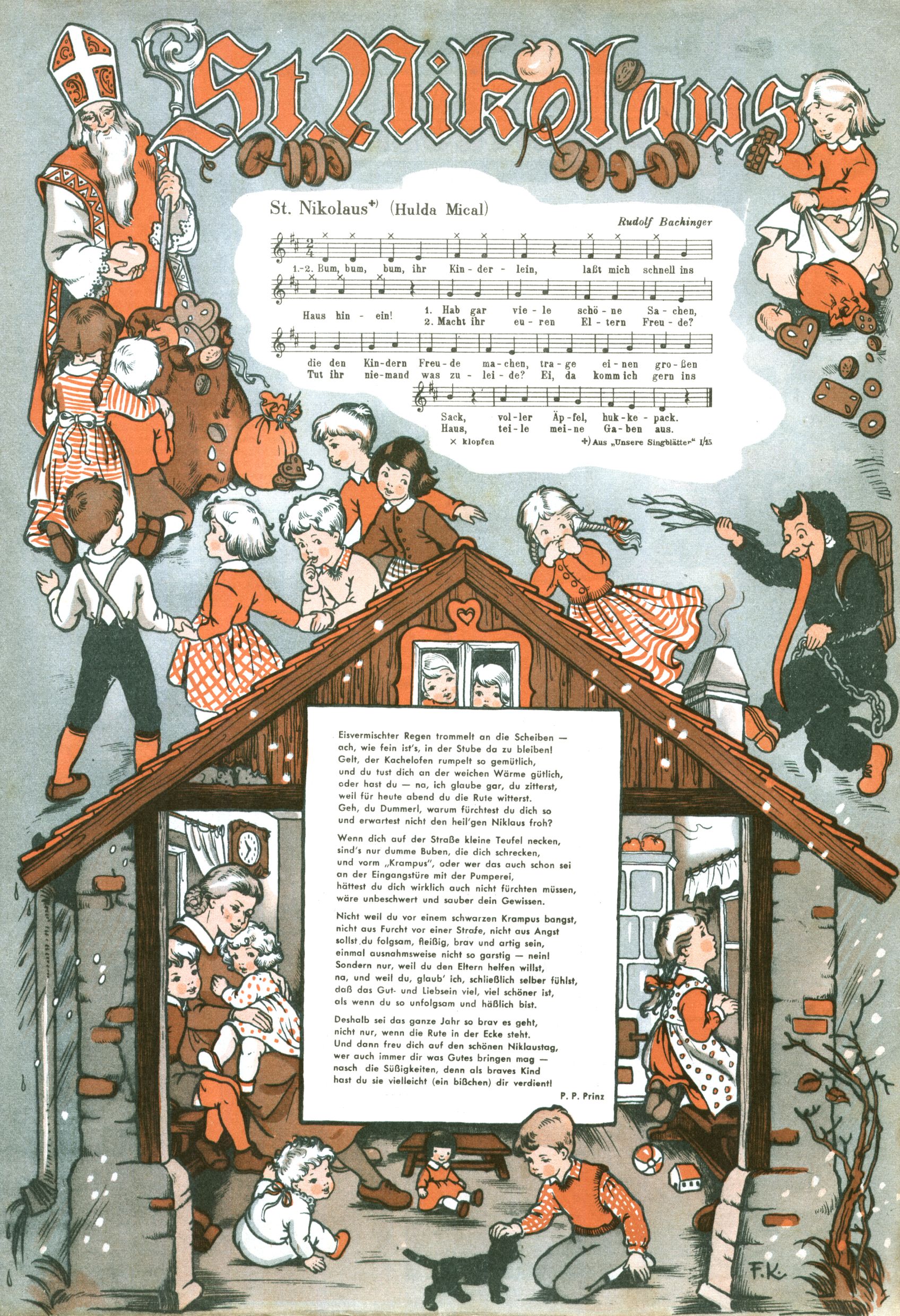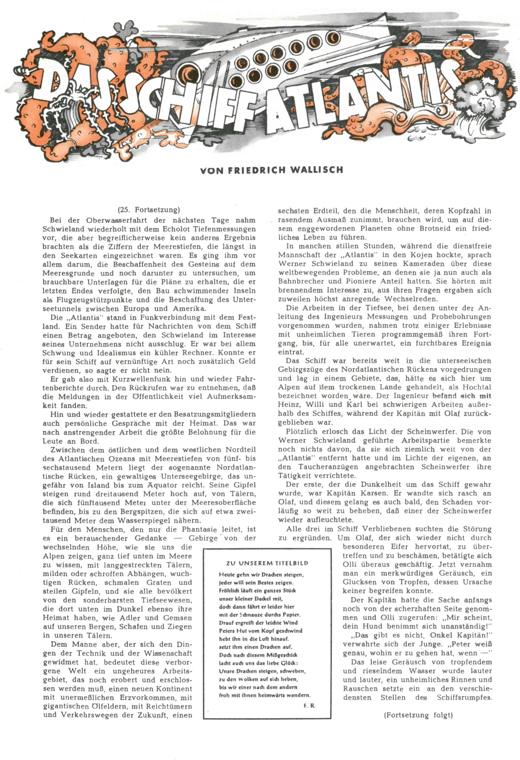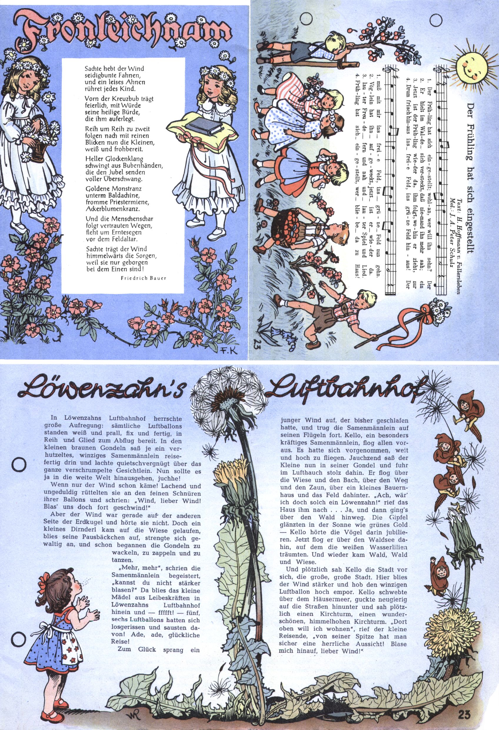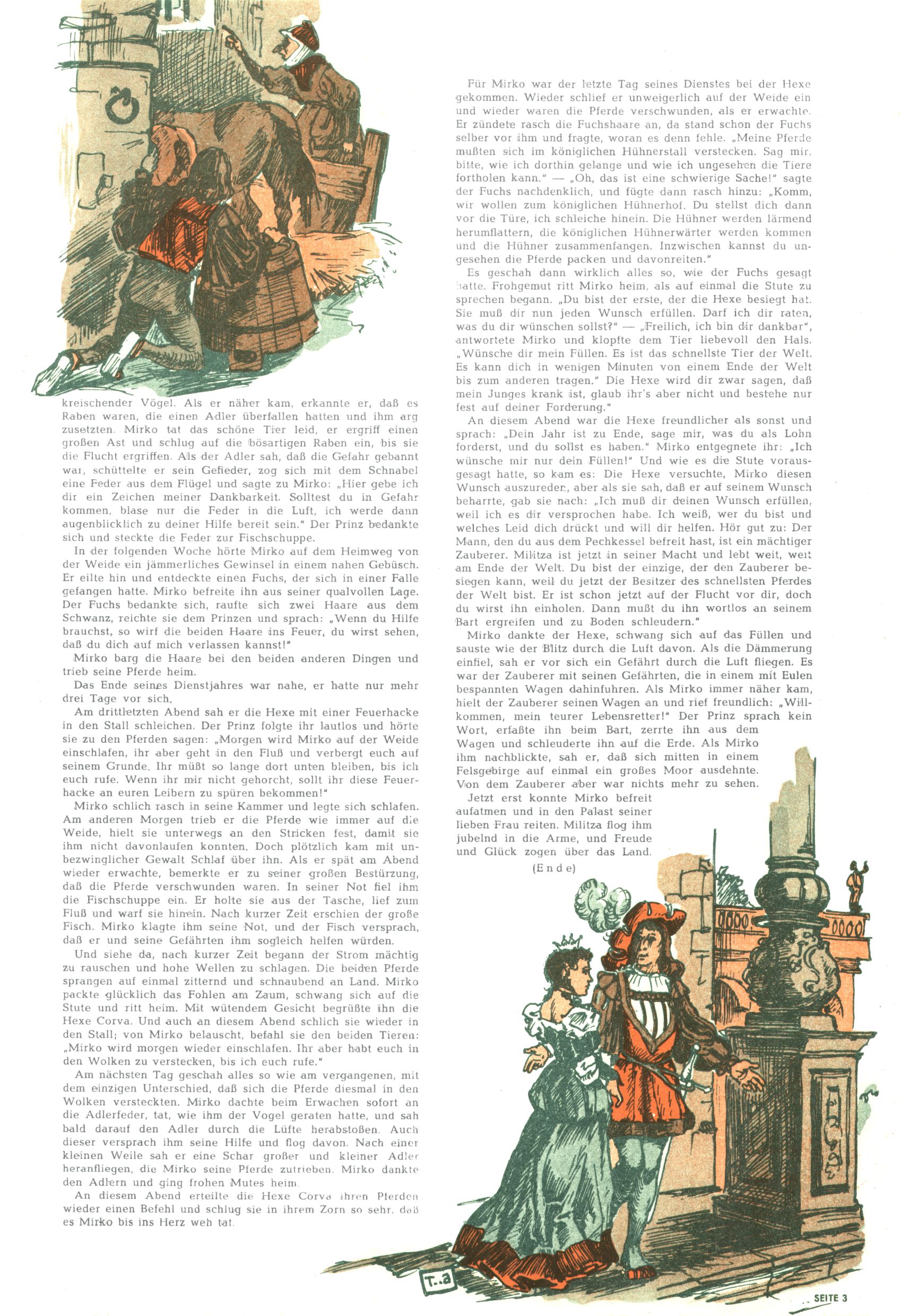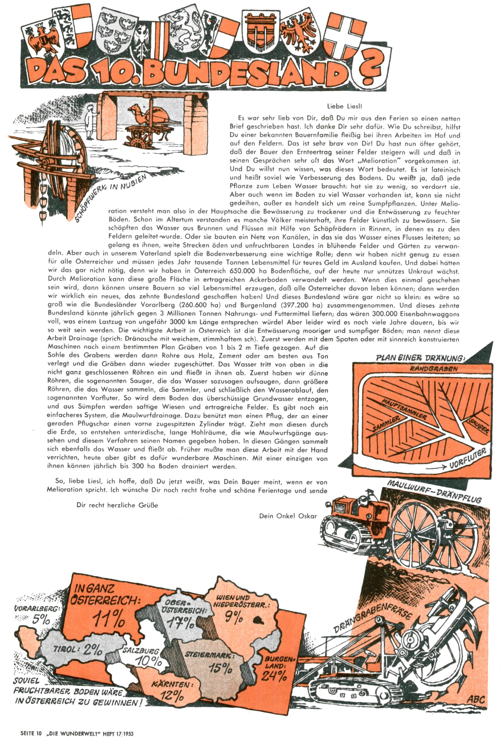 1953 – Alles beim Alten Wie lange darf man sich auf einem Erfolgskonzept ausruhen? Auch 1953 gab es keine offensichtlichen Änderungen am Layout der Zeitung. Zwar wurde Elfriede Vavrovsky teilweise durch andere Autoren abgelöst und erstmals kam Friedrich Bauer zum Zug, der bisher nur als Rätselonkel in Erscheinung getreten war. Allerdings ist anzunehmen, dass eine ganze Reihe unsignierter Erzählungen früherer Hefte ebenfalls der Feder von fb entstammen. ABC Peter Paul Prinz übernahm neuerlich die Illustration der technischen Seiten. Sein Willibald erschien ab sofort in 3 Spalten anstelle von 4 Zeilen, was ihm wesentlich mehr Gestaltungsfreiheit bot. Teja Aicher erfand die Clowns Benjamin und Kasimir nachdem ABC mit seiner Miniserie Zipferling, der lustige Kasperl bereits ein halbes Jahr zuvor durchaus mit Lachern punkten hatte können. Benjamin und Kasimir erschienen 1953 in jedem 2. Heft; nach dem Abdanken von Piff und Paff dann in jeder Ausgabe. Vom Aufbau her ähnelte die Serie dem Erfolgscartoon Willibald, der Zauberlehrling, ohne jedoch (aufgrund ihrer allzu "beschränkten" Möglichkeiten) an den Erfolg des Zauberlehrlings anknüpfen zu können. Nach dem Abschluss der Atlas-Daten und Karten erfand Annelies Umlauf Lamatsch weitere realitätsfremde Geschichten über die Natur und im Speziellen über Blumen. Eine medizinisch-biologische Spalte über den menschlichen Körper von Ewald Seifert war hingegen sachlicher und informativ. Ein kurzzeitiger Neuzugang bei den Grafikern war Hedwig Zumtobel. Sie wurde jedoch bald von Luzia Adelsberger abgelöst, die sich über Jahre hindurch als Zeichnerin etablierte. Friederike Nekut übernahm die Bastelseite für Mädchen. Die Kolumne Die Puppenschneiderin wurde mit Unser Hausmütterchen ergänzt, wodurch das handwerkliche Angebot für Mädchen erweitert werden konnte. Eine wesentliche Änderung am Titelblatt gab es 1953 aber doch: Endlich hatte man dem Erfolg von Zwerg Bumsti Rechnung getragen und ihn ins Logo erhoben. Er löste dort den Zwerg Bums aus dem Jahr 1948 in seiner Gondel ab, der zwar als Namenspatron für Zwerg Bumsti hergehalten hatte, mit dem es ansonsten aber keine Gemeinsamkeiten gab. |