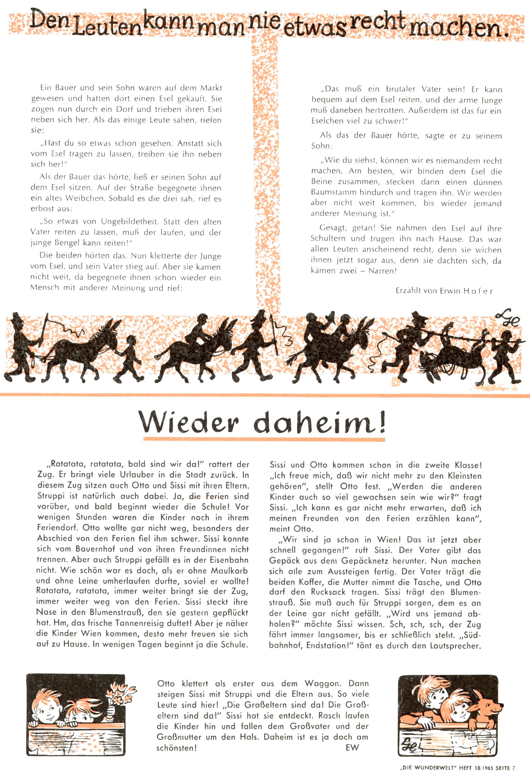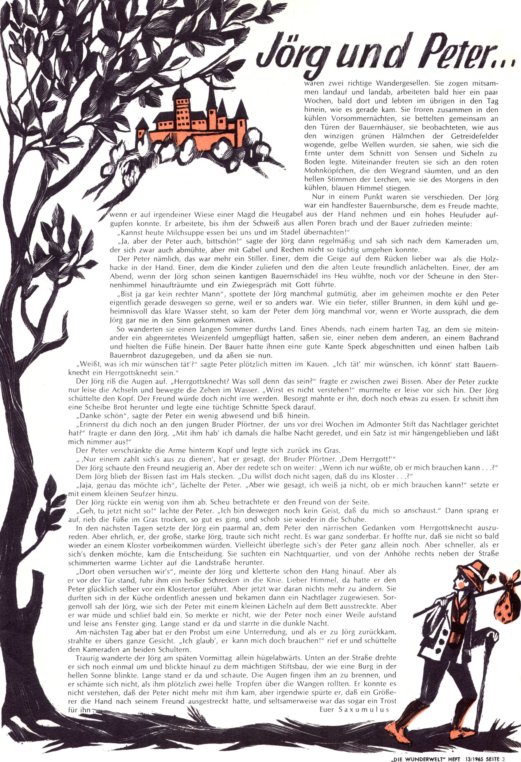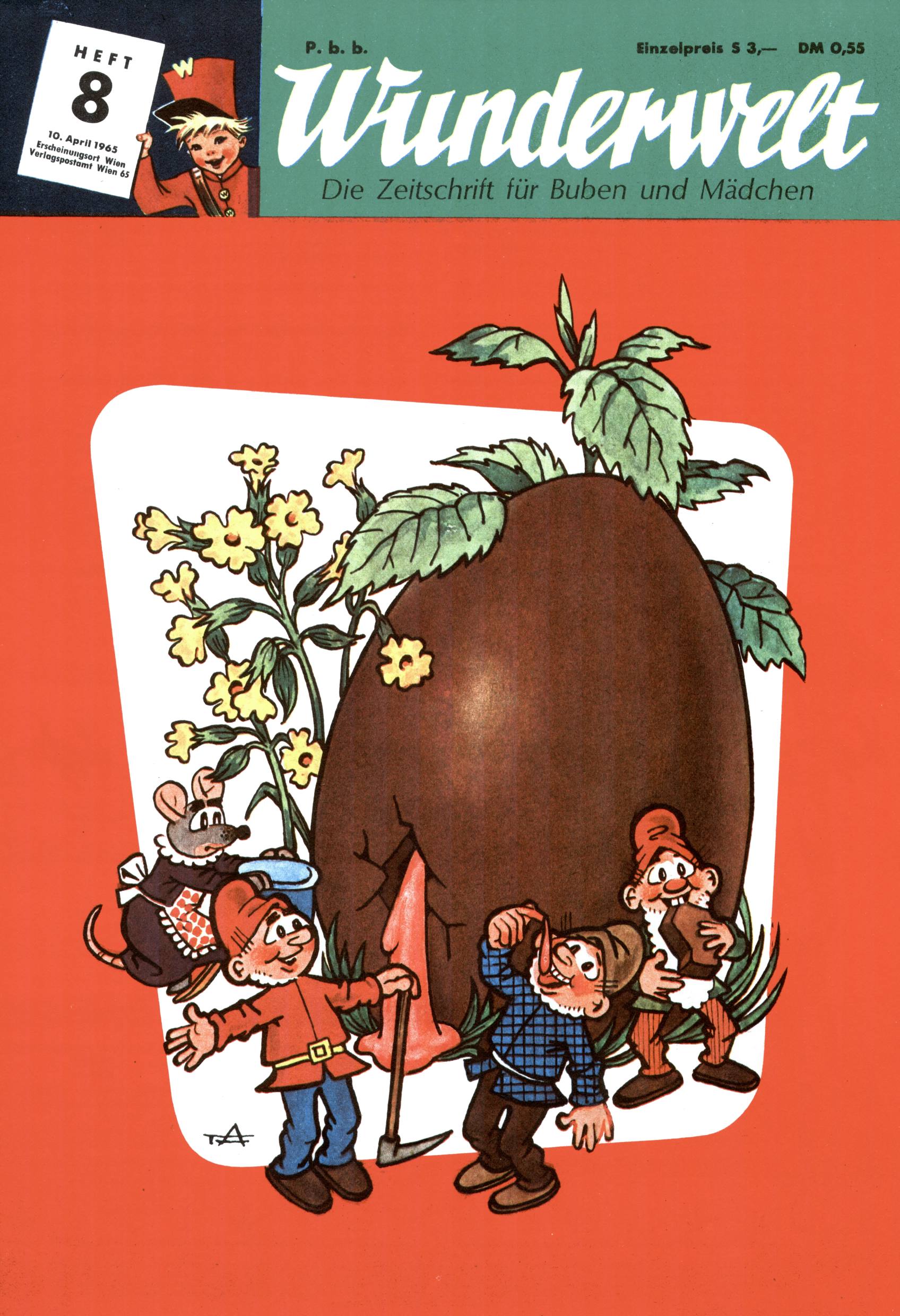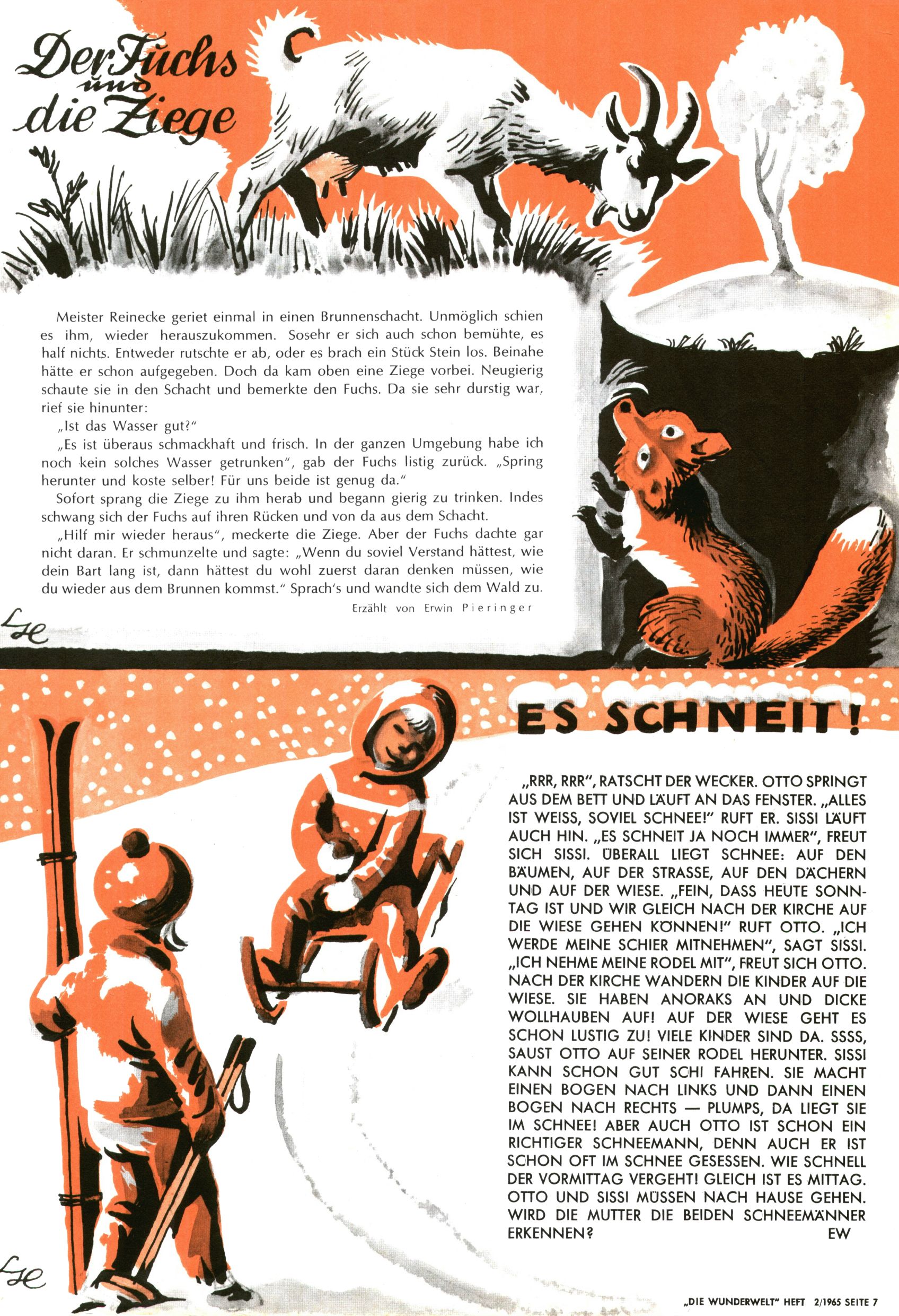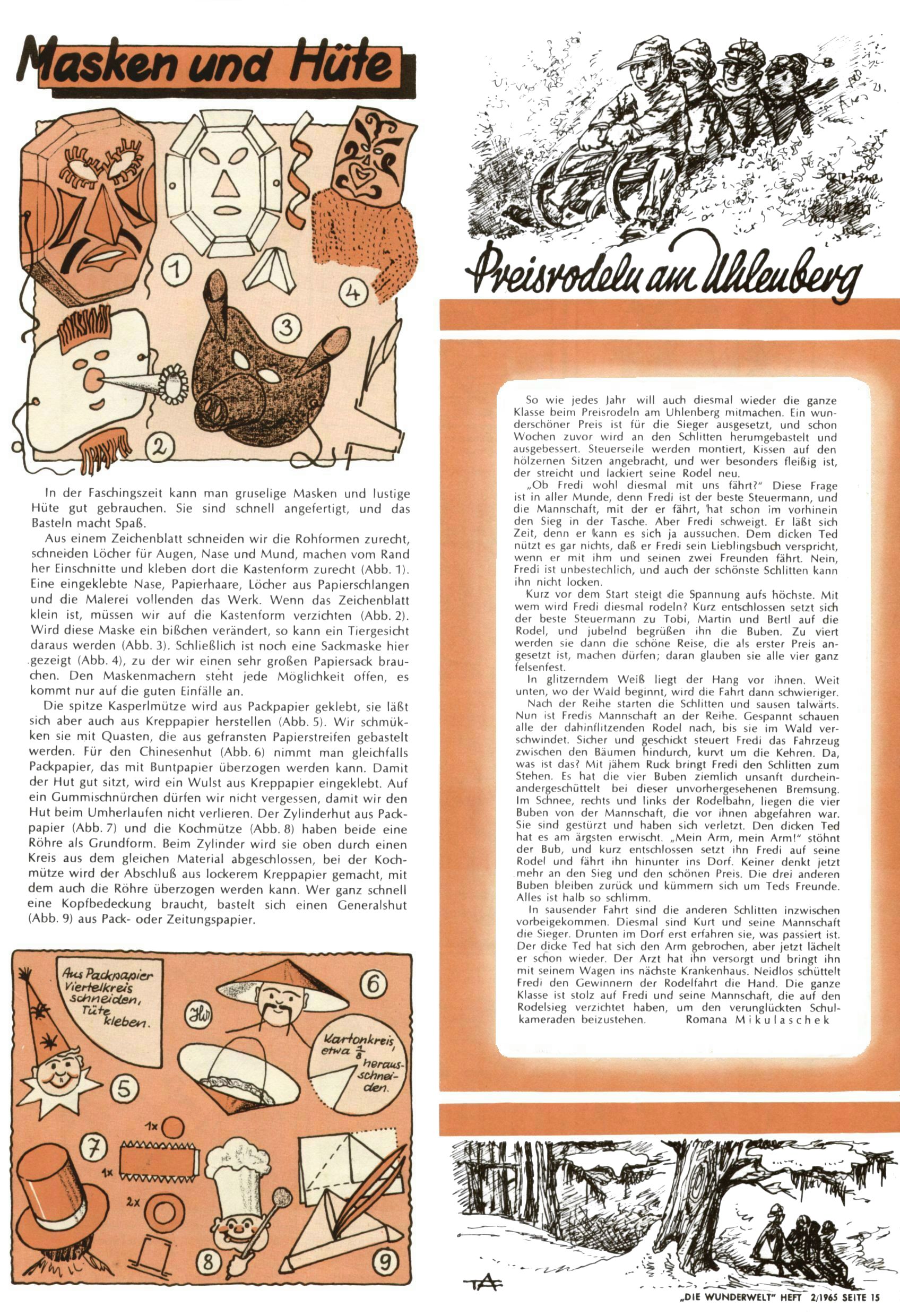 1965 - Die Zeichen der Zeit ignorieren In den Sonderheften hatte man längst umgestellt. In den Standardheften klammerte man sich mit Händen und Füßen an das Altbewährte. Ein einziges Mal bekam Gudrun Groh-Götzinger 1965 die Chance, ihren modenernen Zeichenstil in einem Mittelmärchen umsetzen zu können. Teja Aicher setzte seine Nachbildungen historischer Gebäude fort und startete eine neue Serie über Bauernhöfe in Österreich. Neben seinen beiden Comicserien Zwerg Bumsti und Kri, der Zauberlehrling gestaltete er nach wie vor die Technikseite. Zusammen mit Rosl Warzilek, die nach 5 Jahren Pause erstmals wieder regelmäßig Titelseiten entwerfen durfte, war er für mehr als 50 Prozenz des Heftinhalts verantwortlich. Monica Skidelsky hatte sich ganz auf die Bastelarbeiten für Mädchen verlagert. Daneben waren nach wie vor Lisbeth Hölzl und Gudrun Groh-Götzinger im Einsatz. |