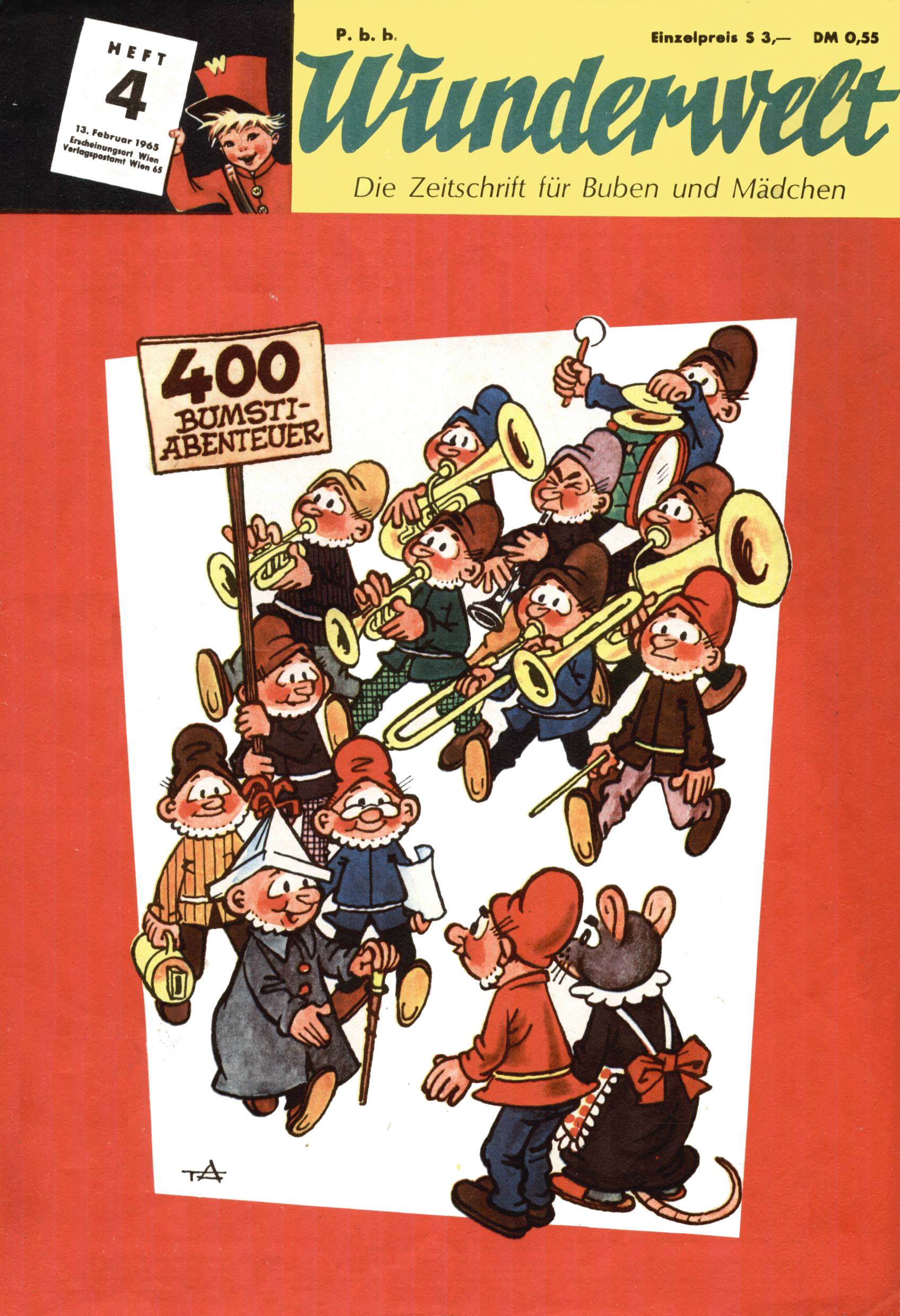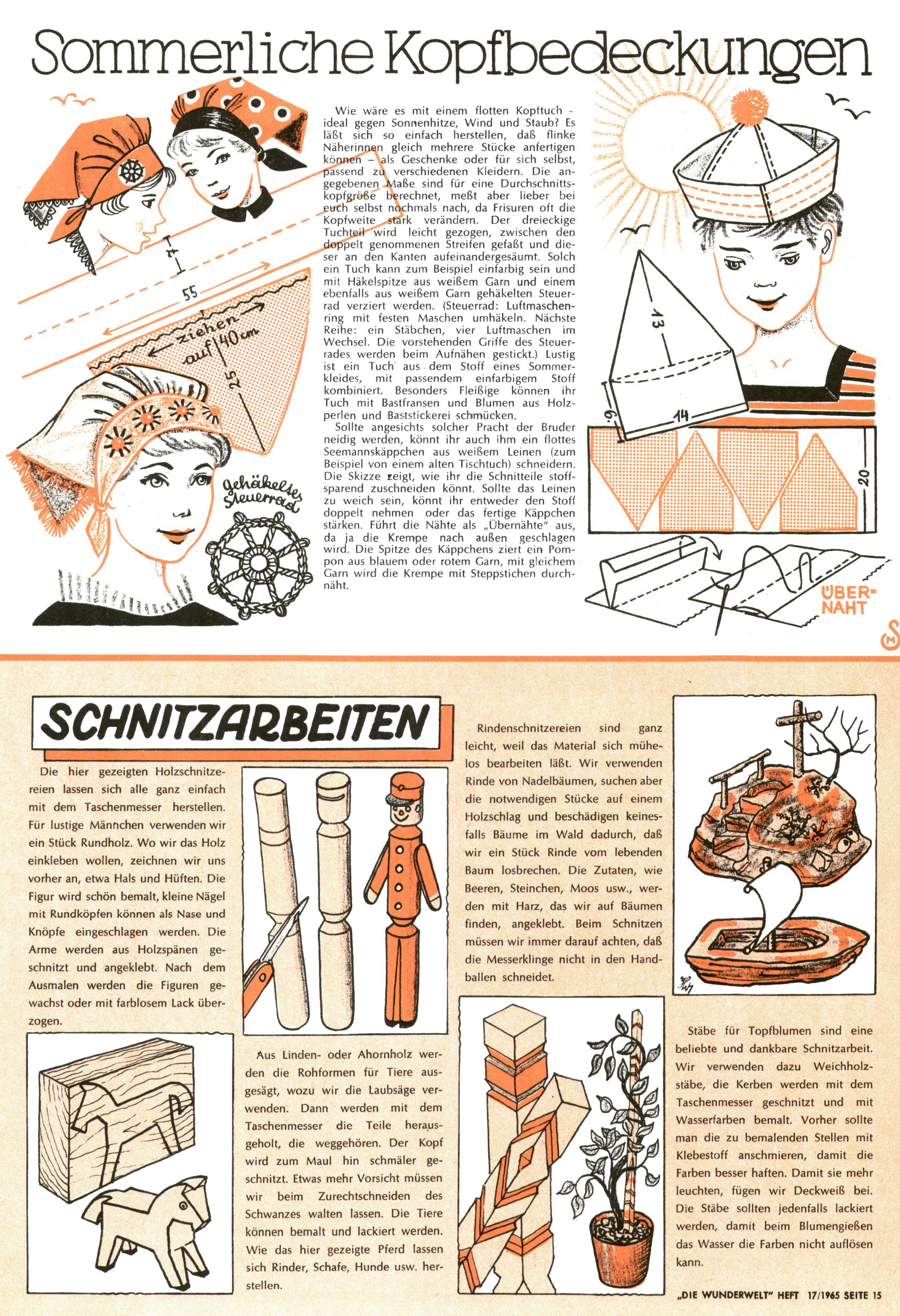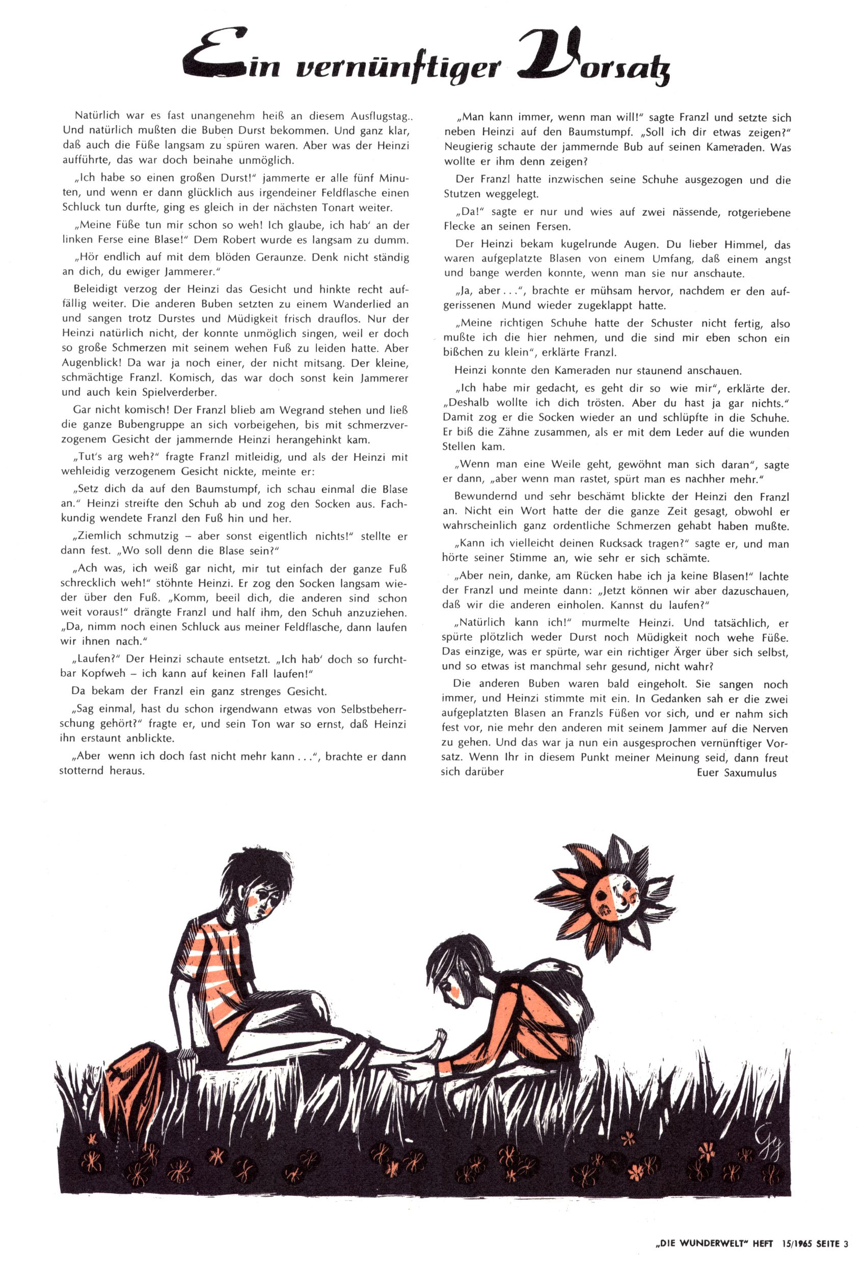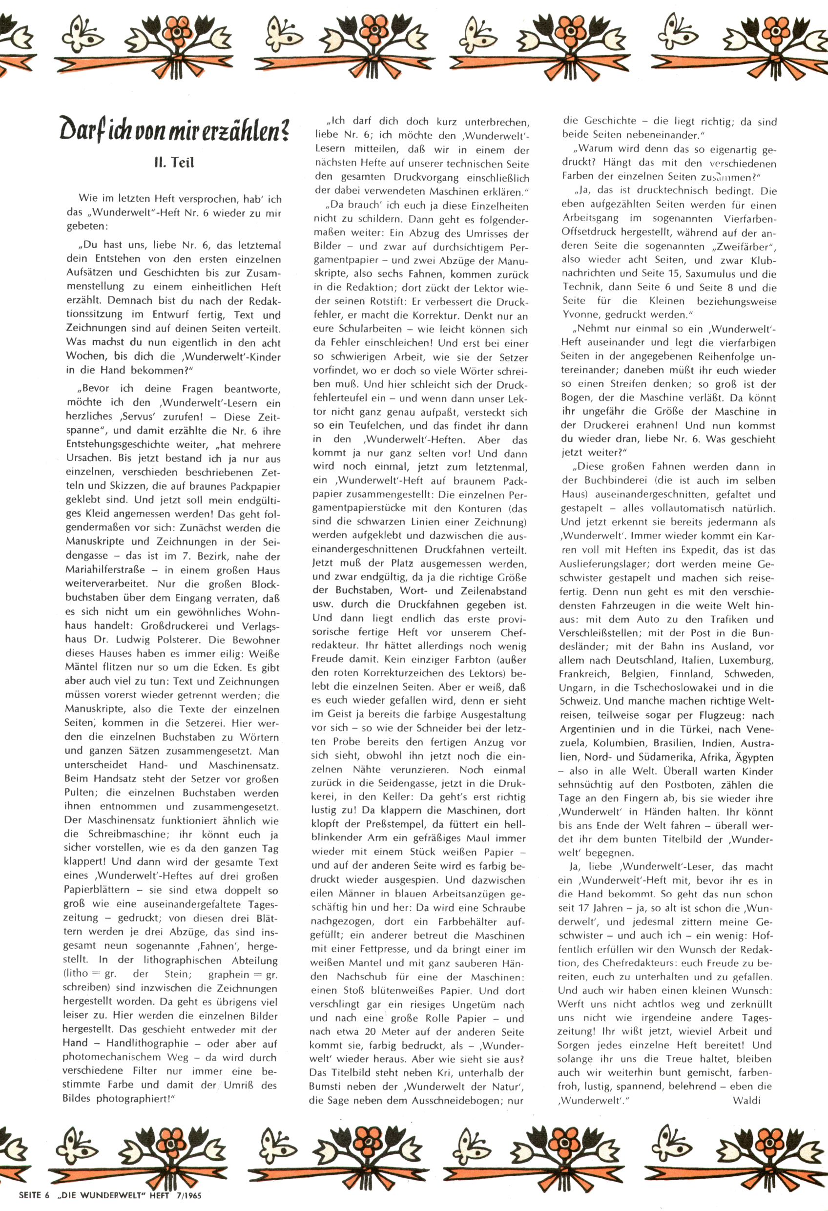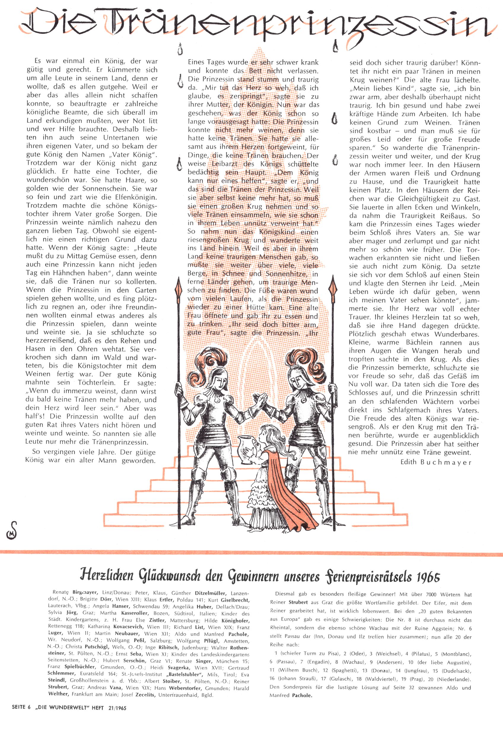 1965 - Die Zeichen der Zeit ignorieren In den Sonderheften hatte man längst umgestellt. In den Standardheften klammerte man sich mit Händen und Füßen an das Altbewährte. Ein einziges Mal bekam Gudrun Groh-Götzinger 1965 die Chance, ihren modenernen Zeichenstil in einem Mittelmärchen umsetzen zu können. Teja Aicher setzte seine Nachbildungen historischer Gebäude fort und startete eine neue Serie über Bauernhöfe in Österreich. Neben seinen beiden Comicserien Zwerg Bumsti und Kri, der Zauberlehrling gestaltete er nach wie vor die Technikseite. Zusammen mit Rosl Warzilek, die nach 5 Jahren Pause erstmals wieder regelmäßig Titelseiten entwerfen durfte, war er für mehr als 50 Prozenz des Heftinhalts verantwortlich. Monica Skidelsky hatte sich ganz auf die Bastelarbeiten für Mädchen verlagert. Daneben waren nach wie vor Lisbeth Hölzl und Gudrun Groh-Götzinger im Einsatz. |