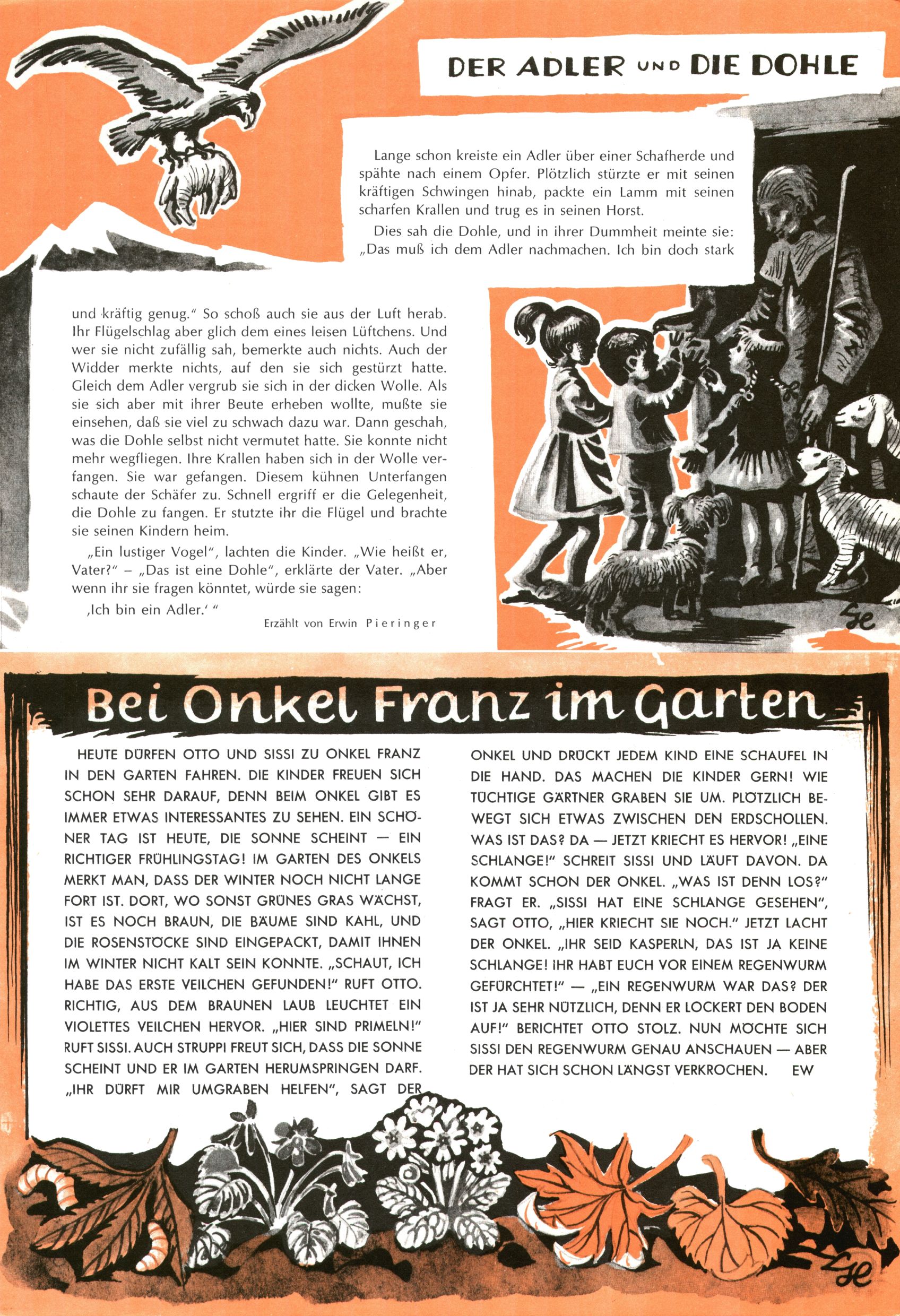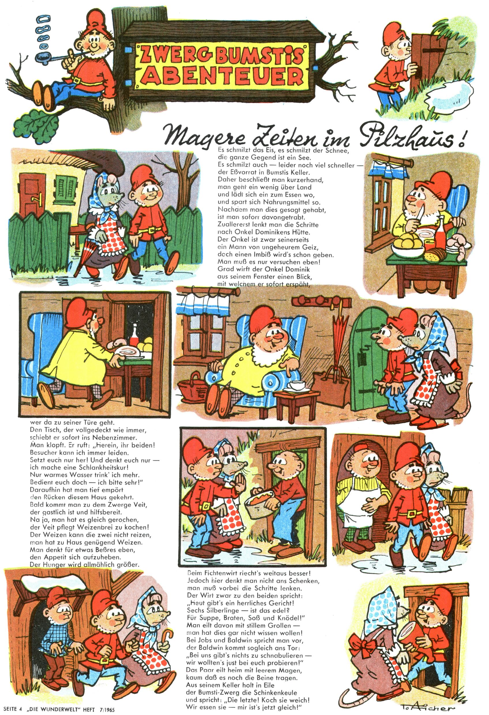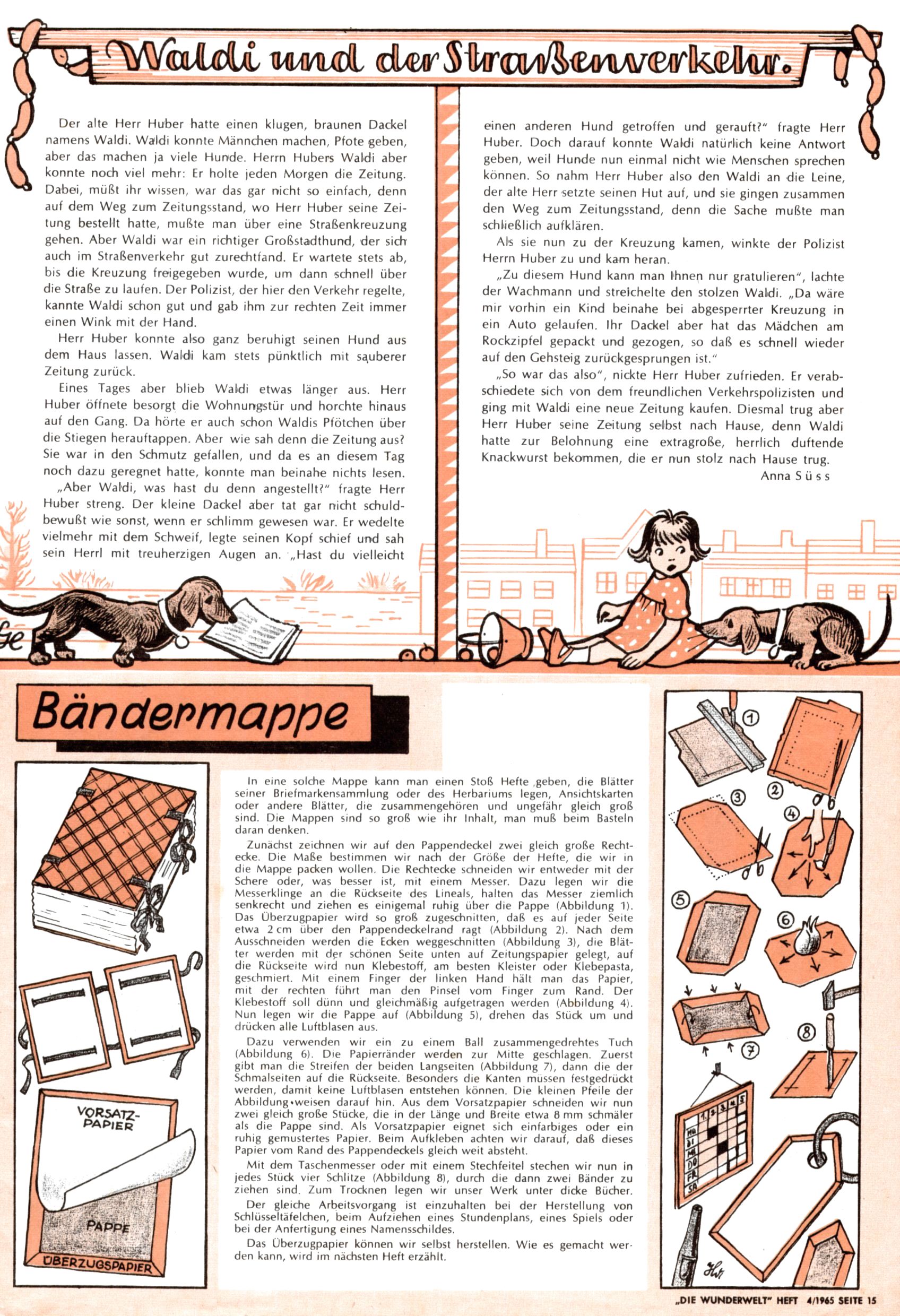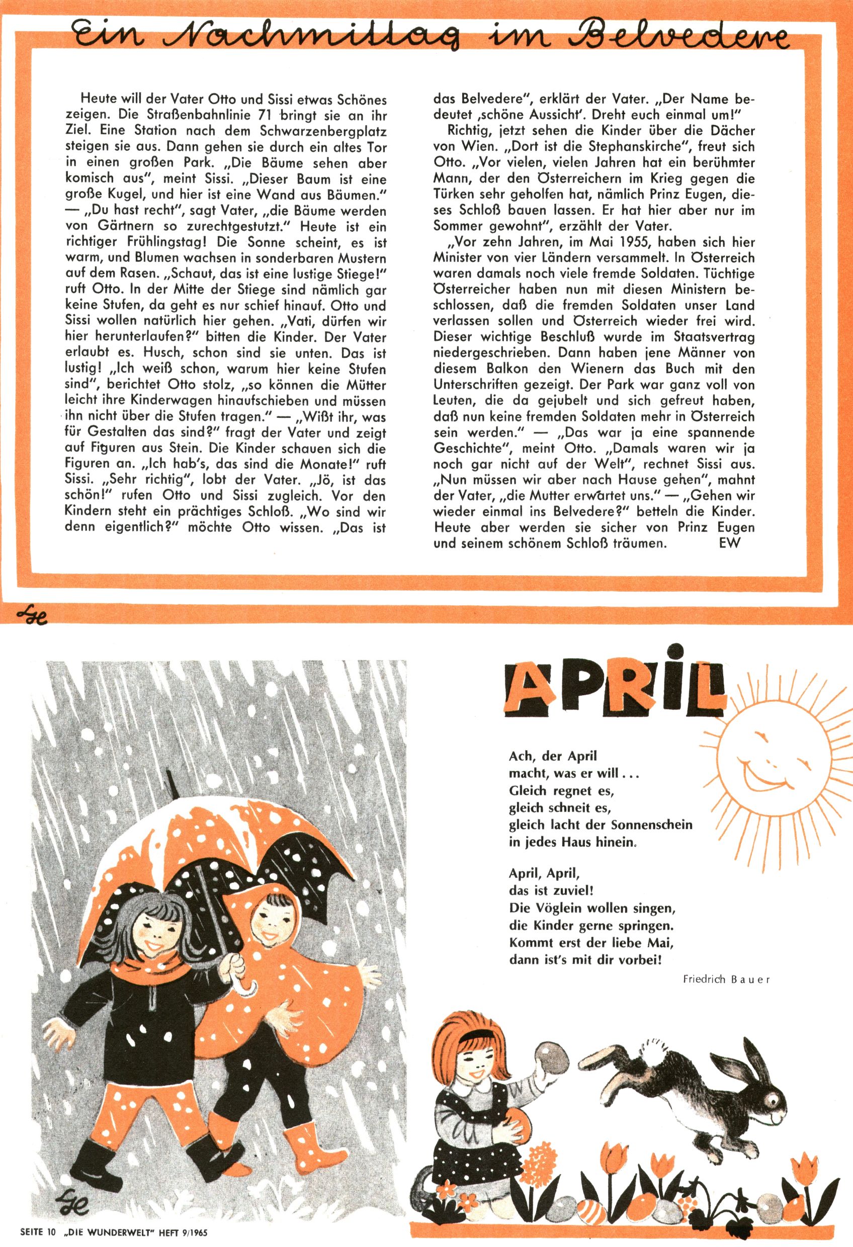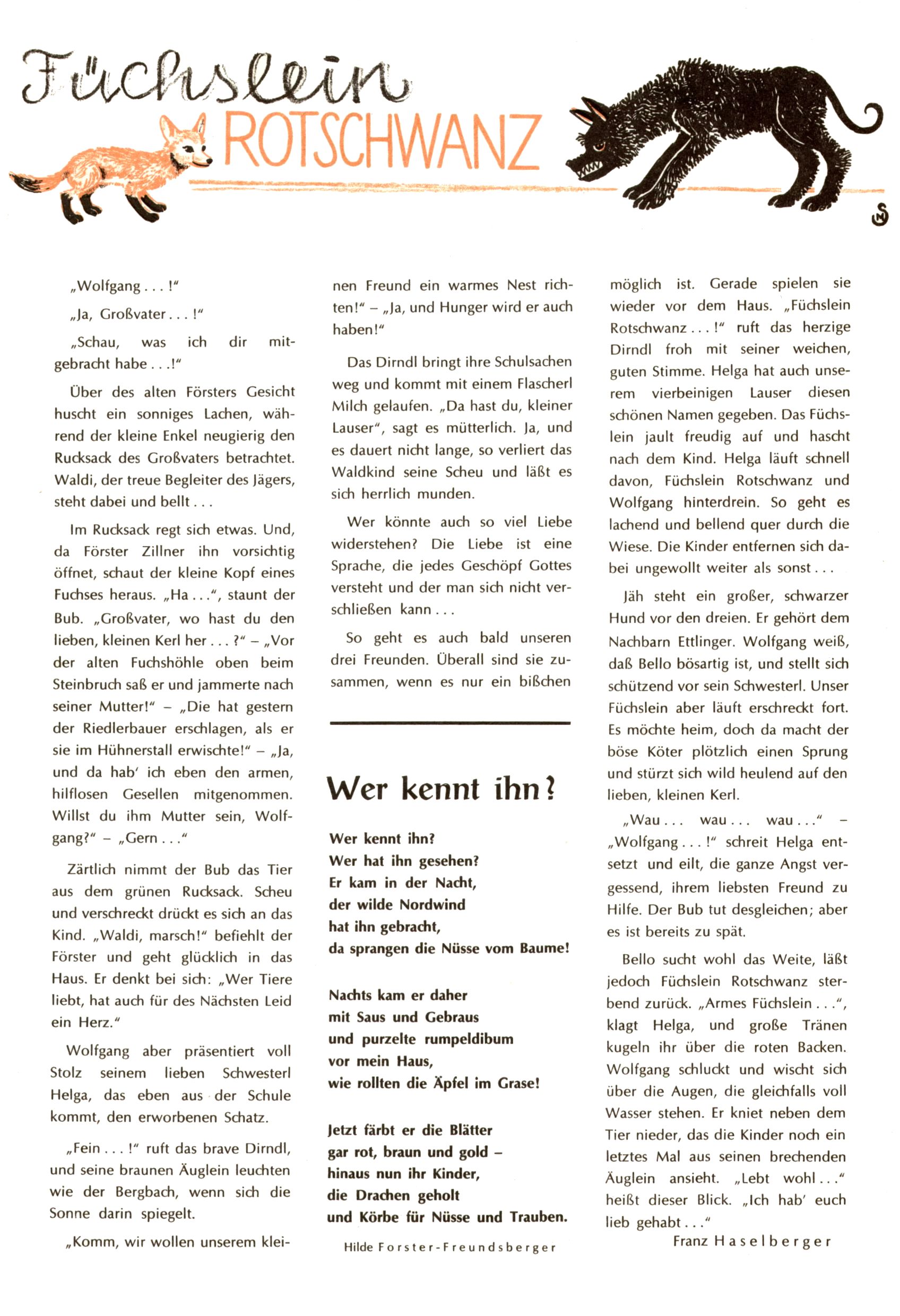1965 - Die Zeichen der Zeit ignorieren In den Sonderheften hatte man längst umgestellt. In den Standardheften klammerte man sich mit Händen und Füßen an das Altbewährte. Ein einziges Mal bekam Gudrun Groh-Götzinger 1965 die Chance, ihren modenernen Zeichenstil in einem Mittelmärchen umsetzen zu können. Teja Aicher setzte seine Nachbildungen historischer Gebäude fort und startete eine neue Serie über Bauernhöfe in Österreich. Neben seinen beiden Comicserien Zwerg Bumsti und Kri, der Zauberlehrling gestaltete er nach wie vor die Technikseite. Zusammen mit Rosl Warzilek, die nach 5 Jahren Pause erstmals wieder regelmäßig Titelseiten entwerfen durfte, war er für mehr als 50 Prozenz des Heftinhalts verantwortlich. Monica Skidelsky hatte sich ganz auf die Bastelarbeiten für Mädchen verlagert. Daneben waren nach wie vor Lisbeth Hölzl und Gudrun Groh-Götzinger im Einsatz. |