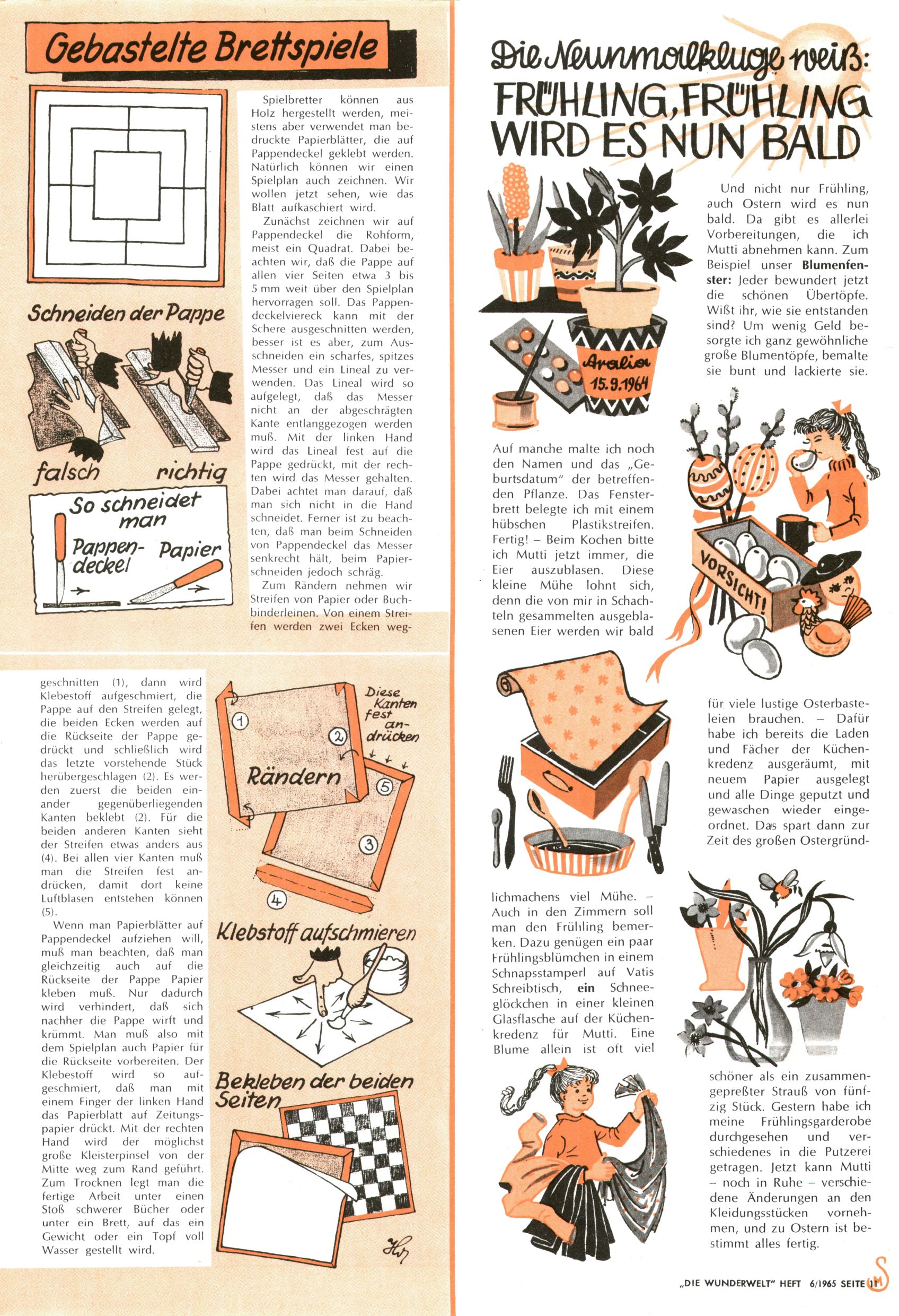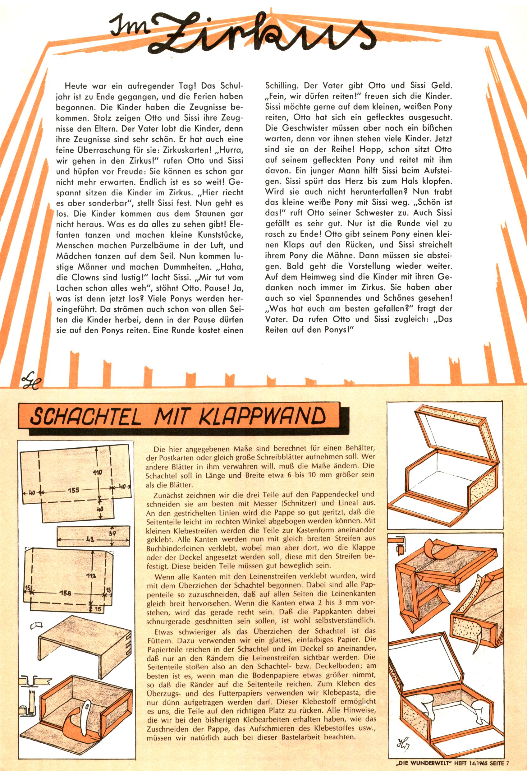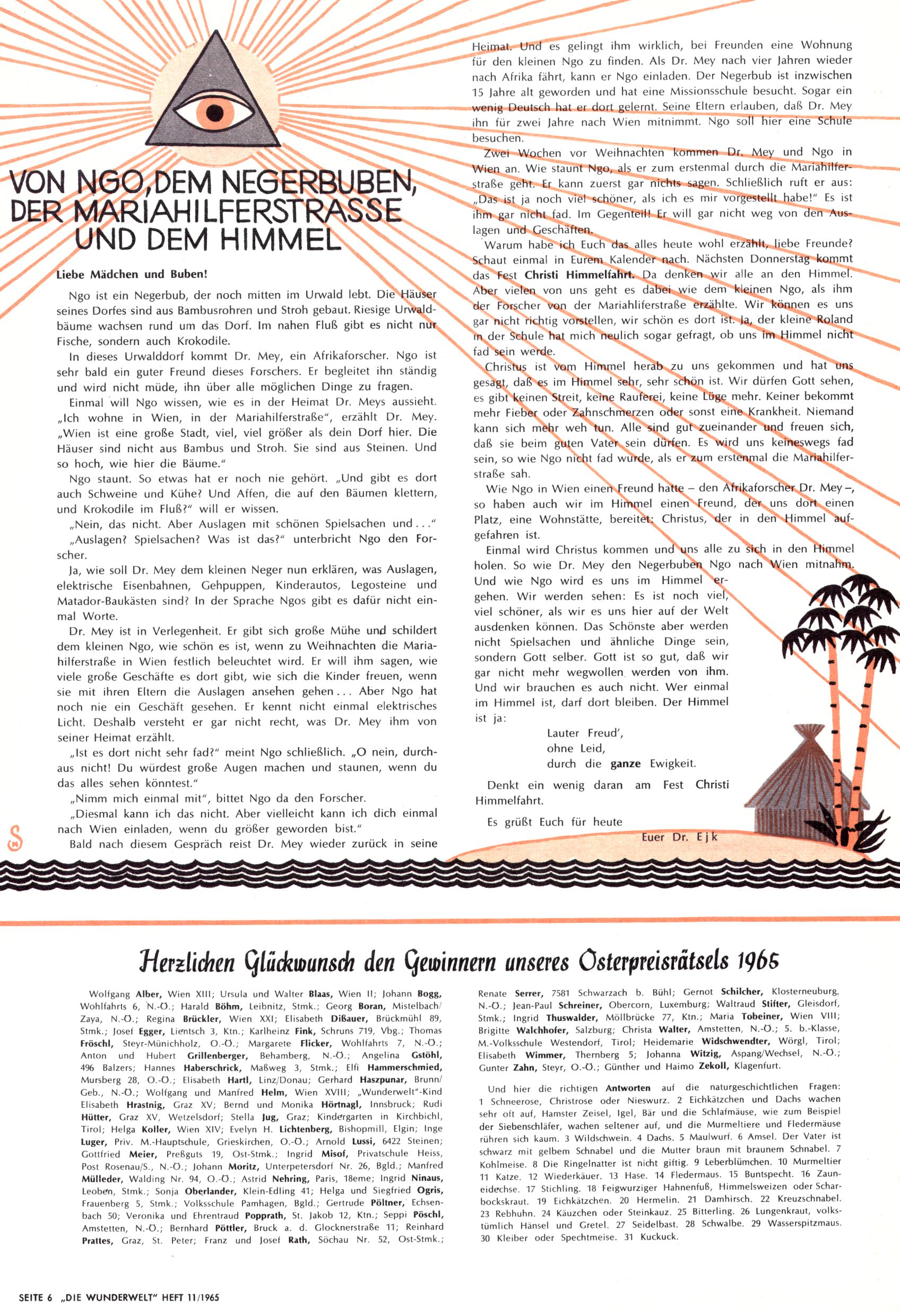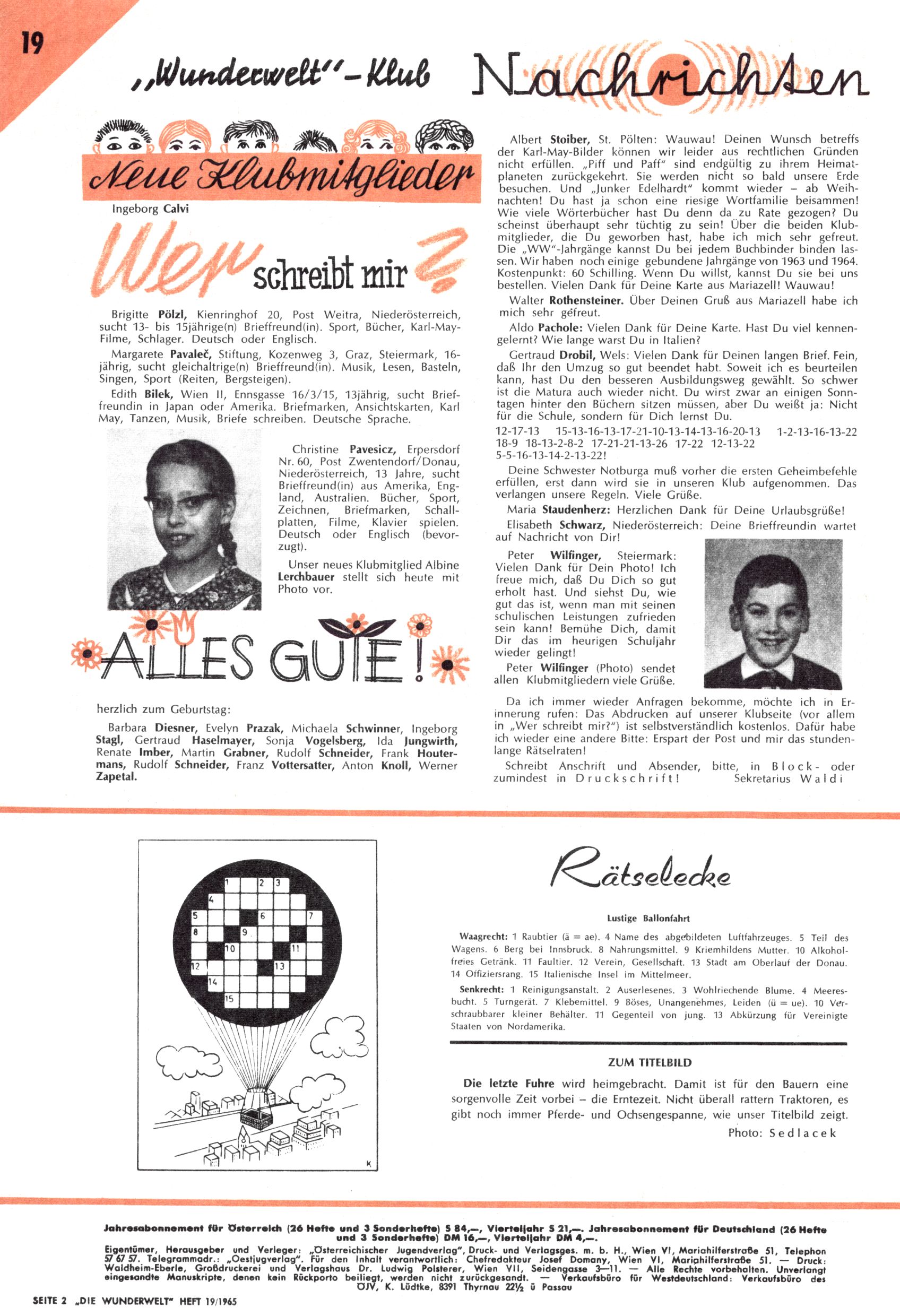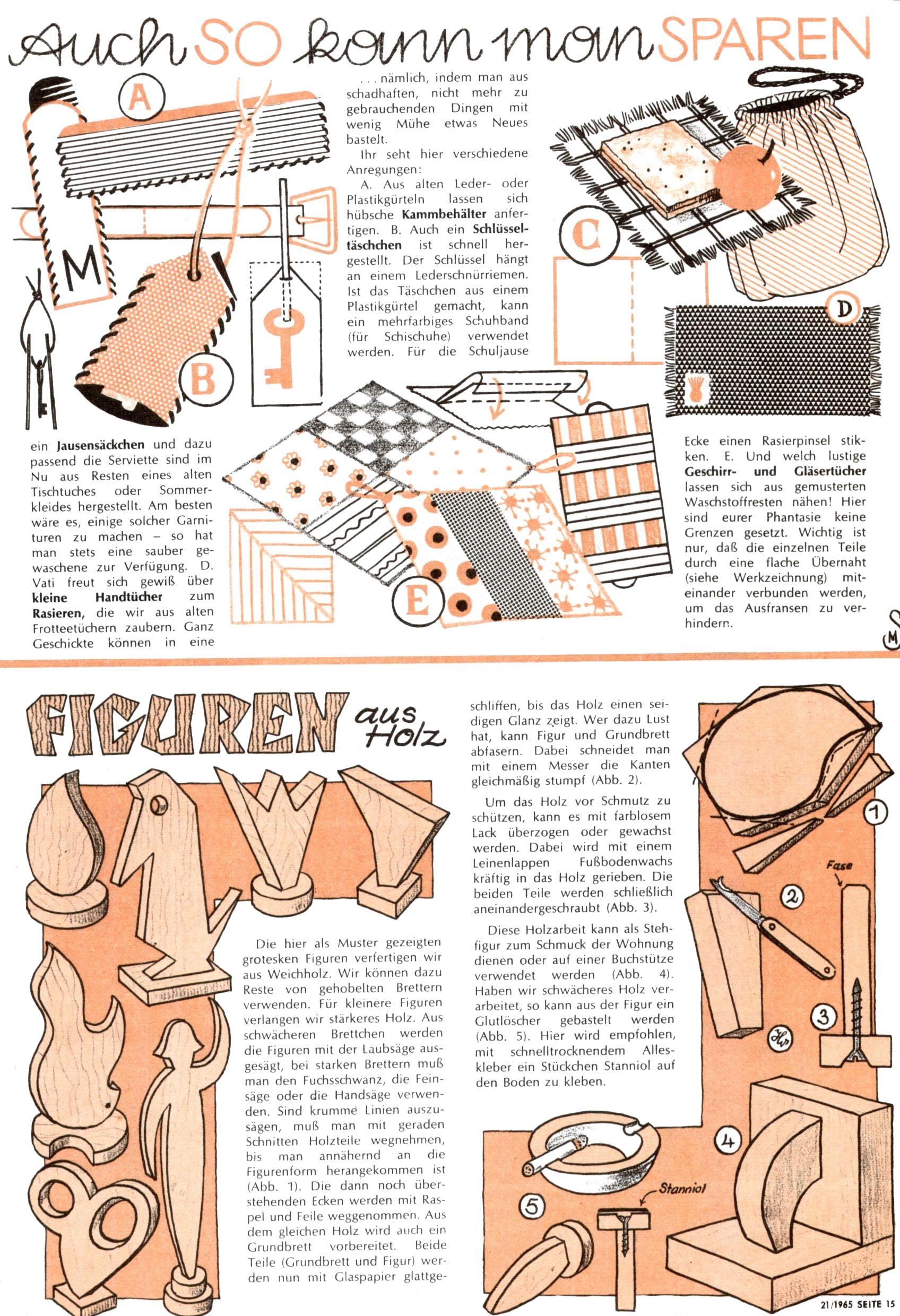 1965 - Die Zeichen der Zeit ignorieren In den Sonderheften hatte man längst umgestellt. In den Standardheften klammerte man sich mit Händen und Füßen an das Altbewährte. Ein einziges Mal bekam Gudrun Groh-Götzinger 1965 die Chance, ihren modenernen Zeichenstil in einem Mittelmärchen umsetzen zu können. Teja Aicher setzte seine Nachbildungen historischer Gebäude fort und startete eine neue Serie über Bauernhöfe in Österreich. Neben seinen beiden Comicserien Zwerg Bumsti und Kri, der Zauberlehrling gestaltete er nach wie vor die Technikseite. Zusammen mit Rosl Warzilek, die nach 5 Jahren Pause erstmals wieder regelmäßig Titelseiten entwerfen durfte, war er für mehr als 50 Prozenz des Heftinhalts verantwortlich. Monica Skidelsky hatte sich ganz auf die Bastelarbeiten für Mädchen verlagert. Daneben waren nach wie vor Lisbeth Hölzl und Gudrun Groh-Götzinger im Einsatz. |
