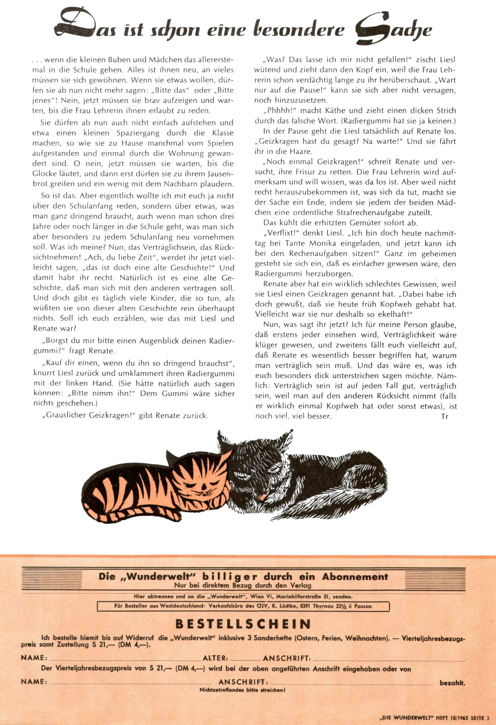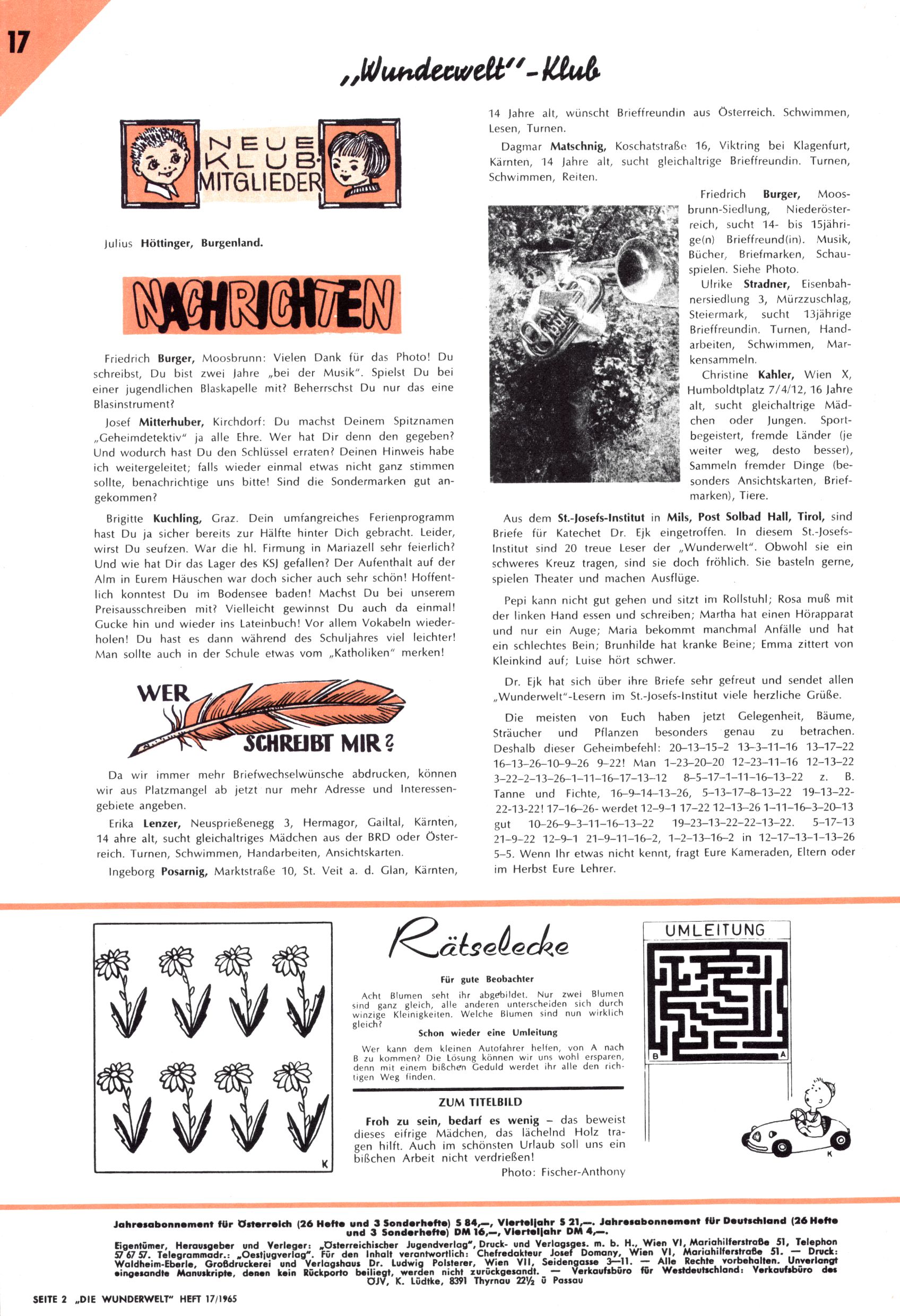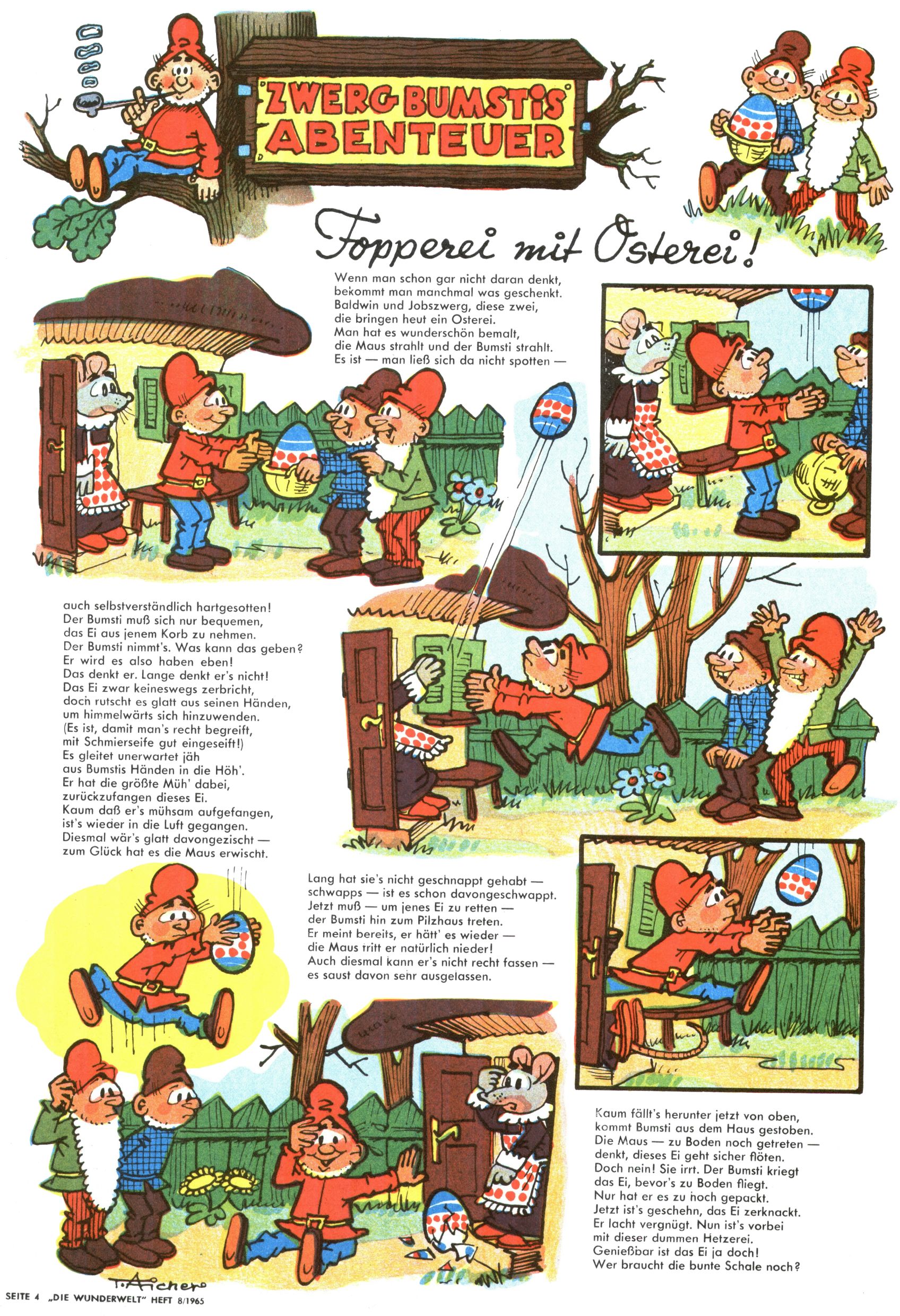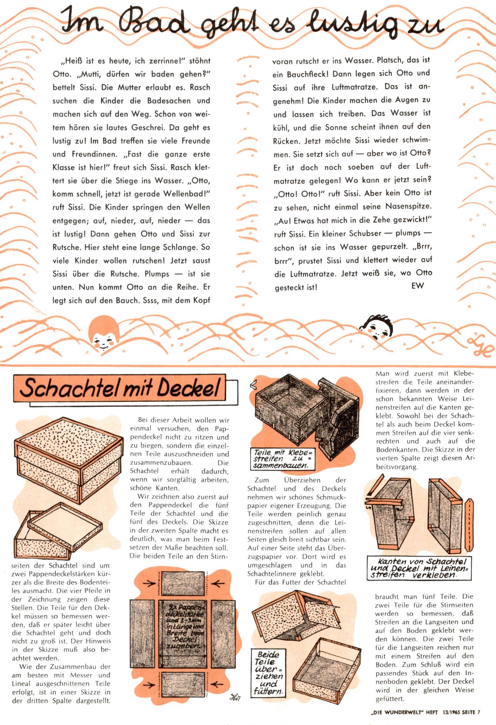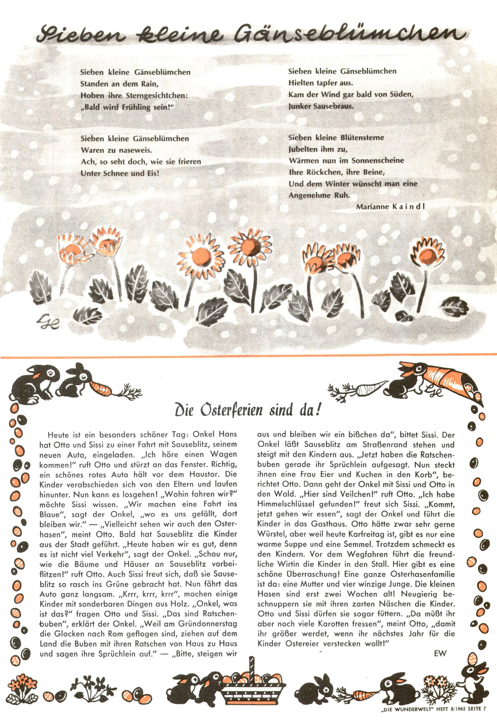1965 - Die Zeichen der Zeit ignorieren In den Sonderheften hatte man längst umgestellt. In den Standardheften klammerte man sich mit Händen und Füßen an das Altbewährte. Ein einziges Mal bekam Gudrun Groh-Götzinger 1965 die Chance, ihren modenernen Zeichenstil in einem Mittelmärchen umsetzen zu können. Teja Aicher setzte seine Nachbildungen historischer Gebäude fort und startete eine neue Serie über Bauernhöfe in Österreich. Neben seinen beiden Comicserien Zwerg Bumsti und Kri, der Zauberlehrling gestaltete er nach wie vor die Technikseite. Zusammen mit Rosl Warzilek, die nach 5 Jahren Pause erstmals wieder regelmäßig Titelseiten entwerfen durfte, war er für mehr als 50 Prozenz des Heftinhalts verantwortlich. Monica Skidelsky hatte sich ganz auf die Bastelarbeiten für Mädchen verlagert. Daneben waren nach wie vor Lisbeth Hölzl und Gudrun Groh-Götzinger im Einsatz. |