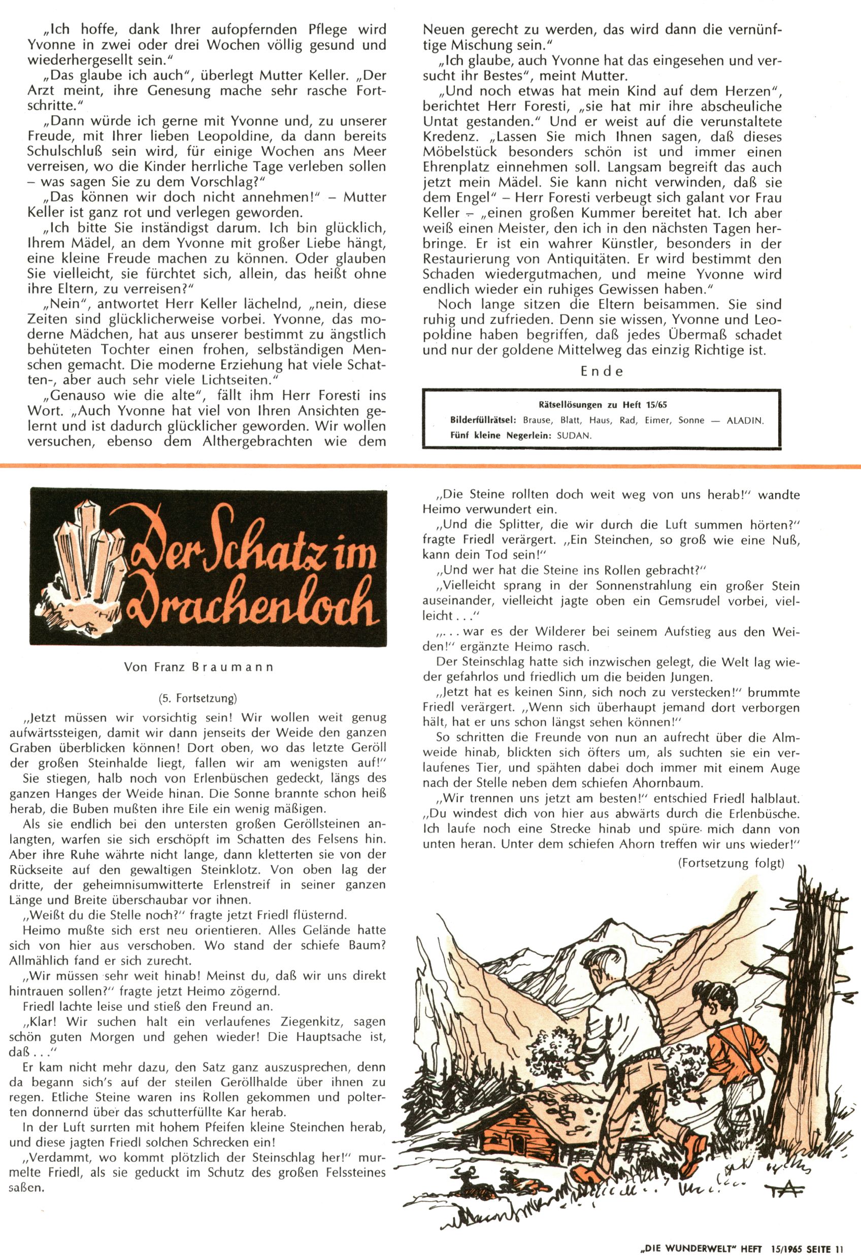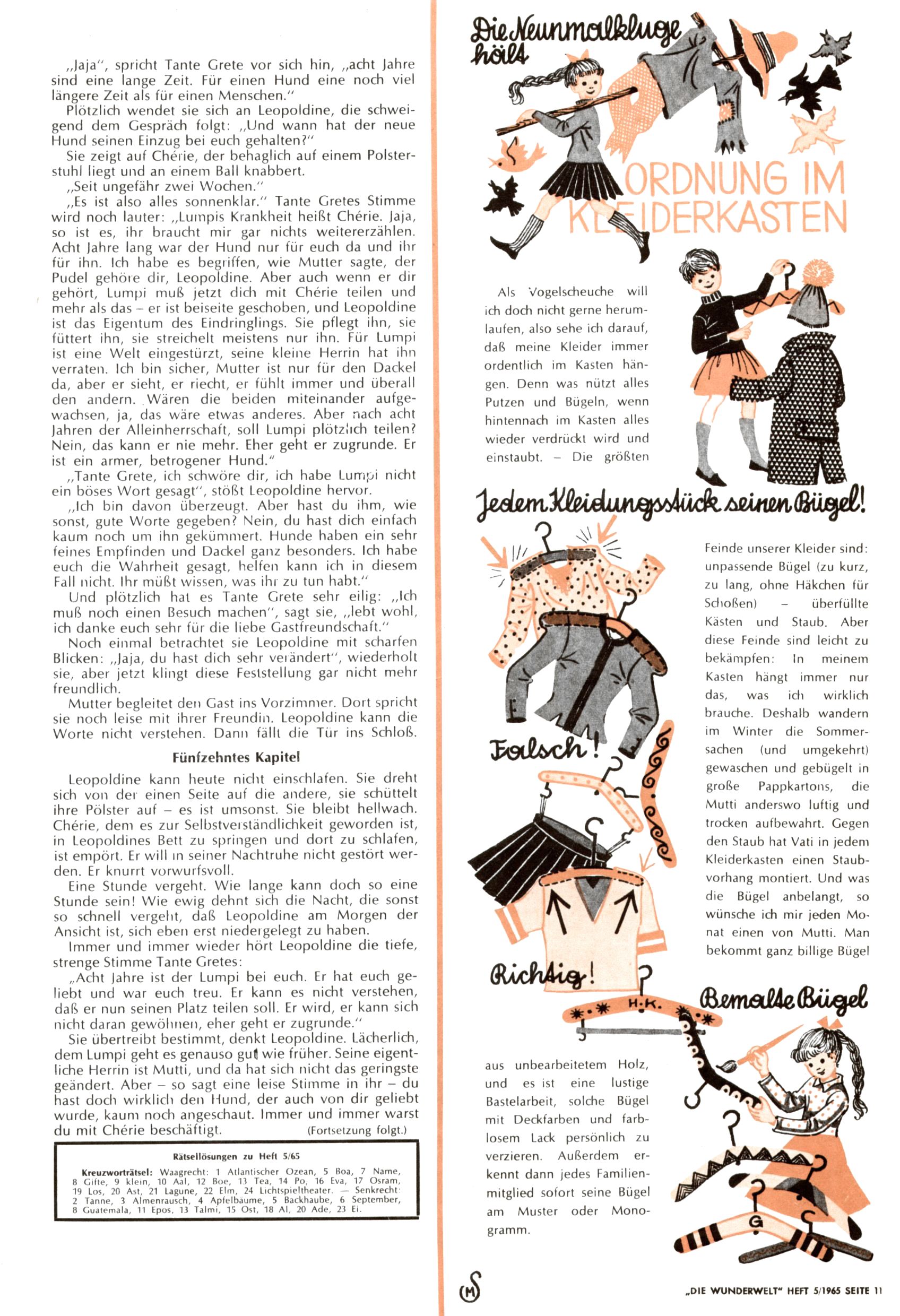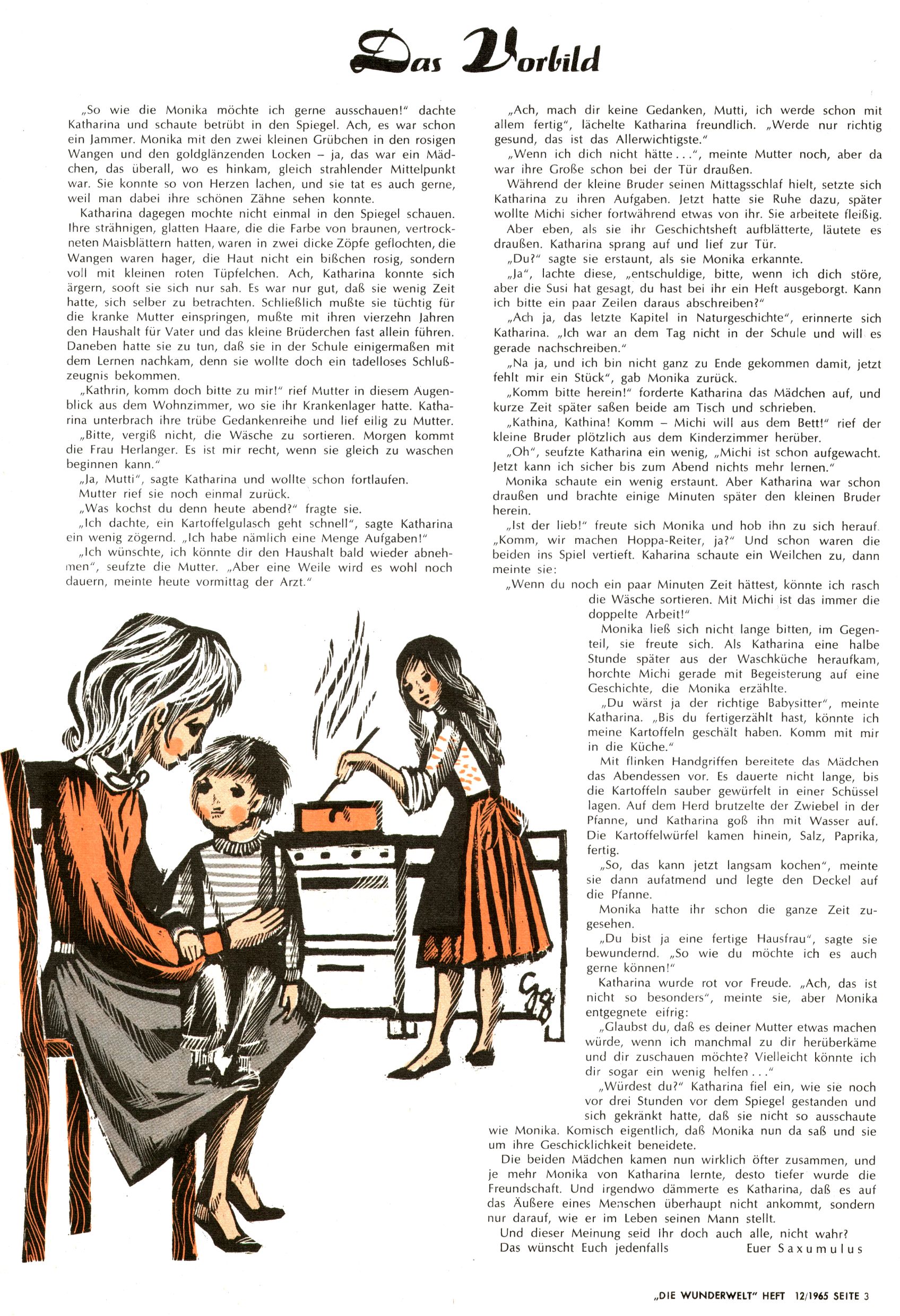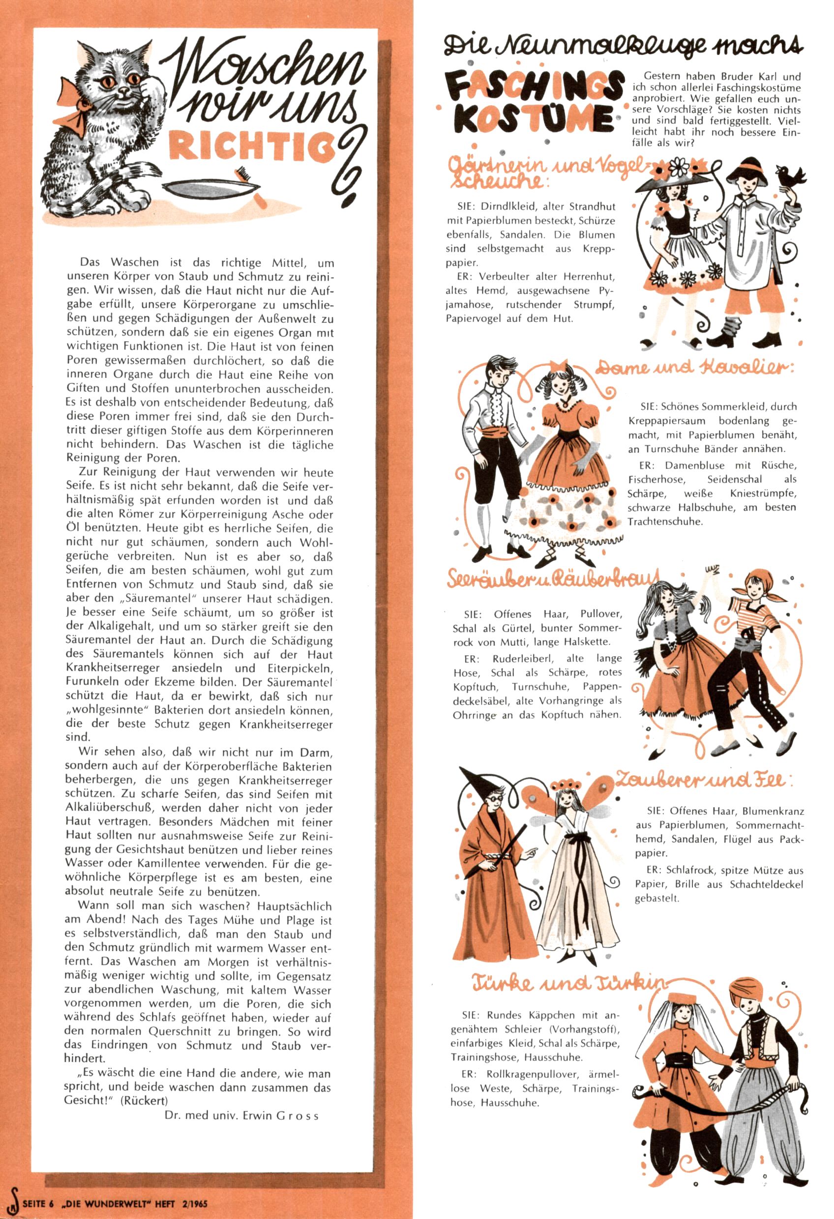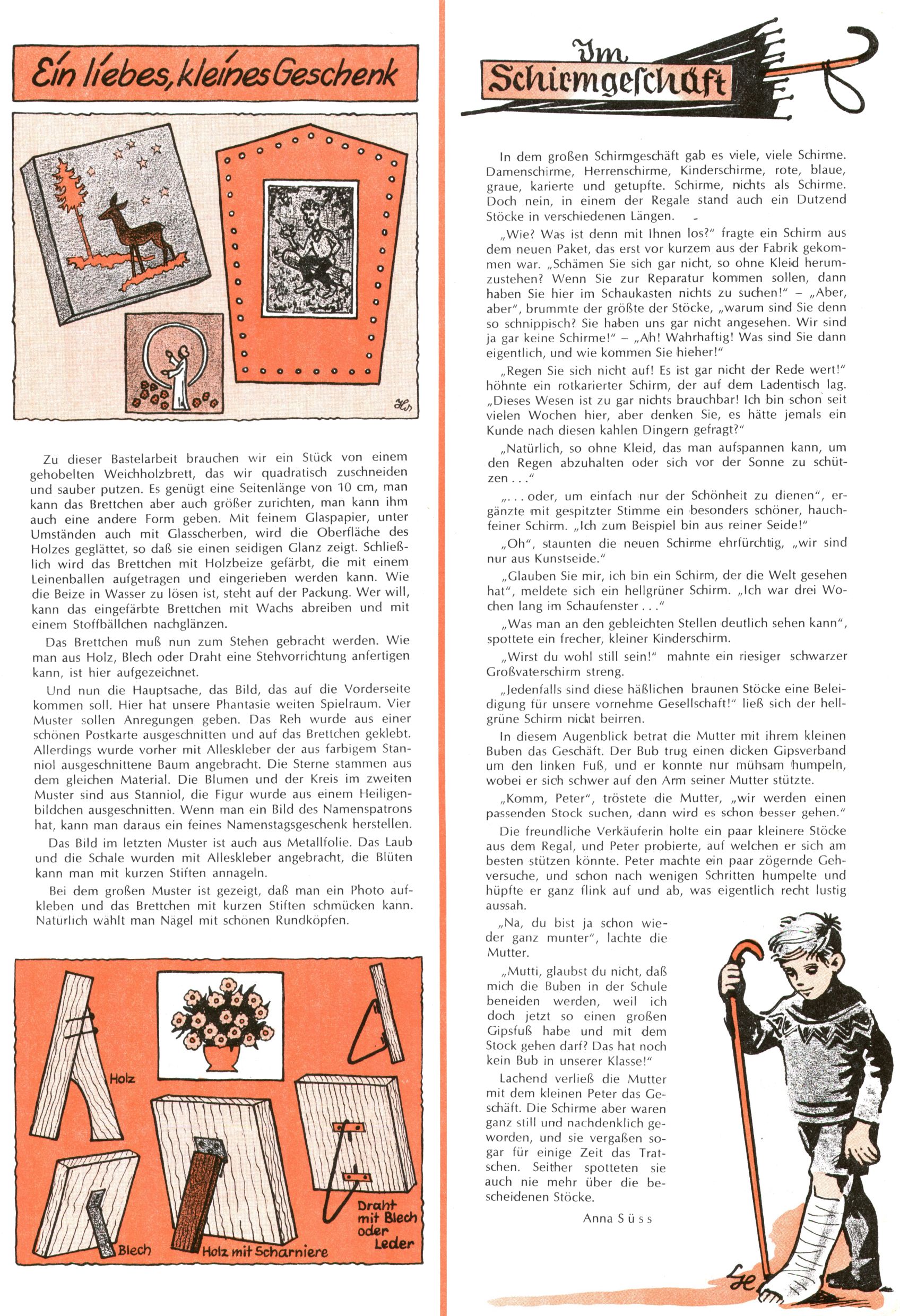 1965 - Die Zeichen der Zeit ignorieren In den Sonderheften hatte man längst umgestellt. In den Standardheften klammerte man sich mit Händen und Füßen an das Altbewährte. Ein einziges Mal bekam Gudrun Groh-Götzinger 1965 die Chance, ihren modenernen Zeichenstil in einem Mittelmärchen umsetzen zu können. Teja Aicher setzte seine Nachbildungen historischer Gebäude fort und startete eine neue Serie über Bauernhöfe in Österreich. Neben seinen beiden Comicserien Zwerg Bumsti und Kri, der Zauberlehrling gestaltete er nach wie vor die Technikseite. Zusammen mit Rosl Warzilek, die nach 5 Jahren Pause erstmals wieder regelmäßig Titelseiten entwerfen durfte, war er für mehr als 50 Prozenz des Heftinhalts verantwortlich. Monica Skidelsky hatte sich ganz auf die Bastelarbeiten für Mädchen verlagert. Daneben waren nach wie vor Lisbeth Hölzl und Gudrun Groh-Götzinger im Einsatz. |