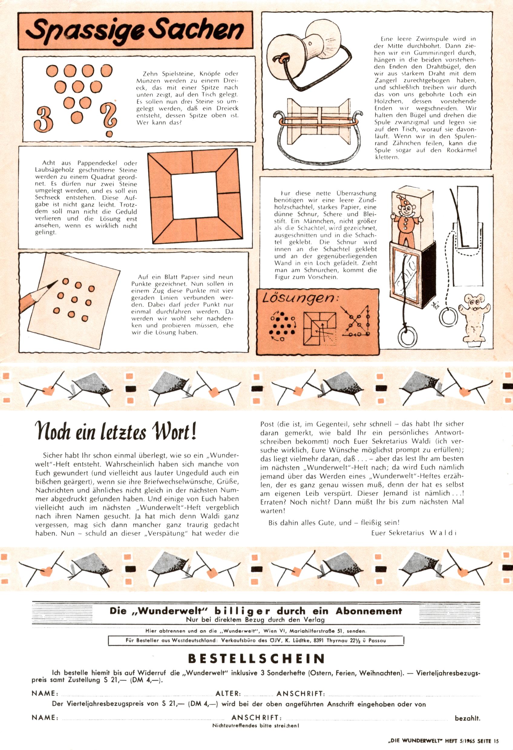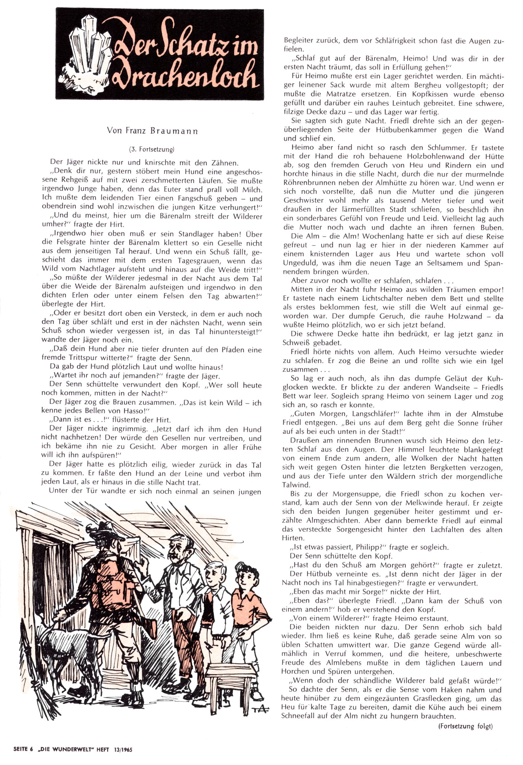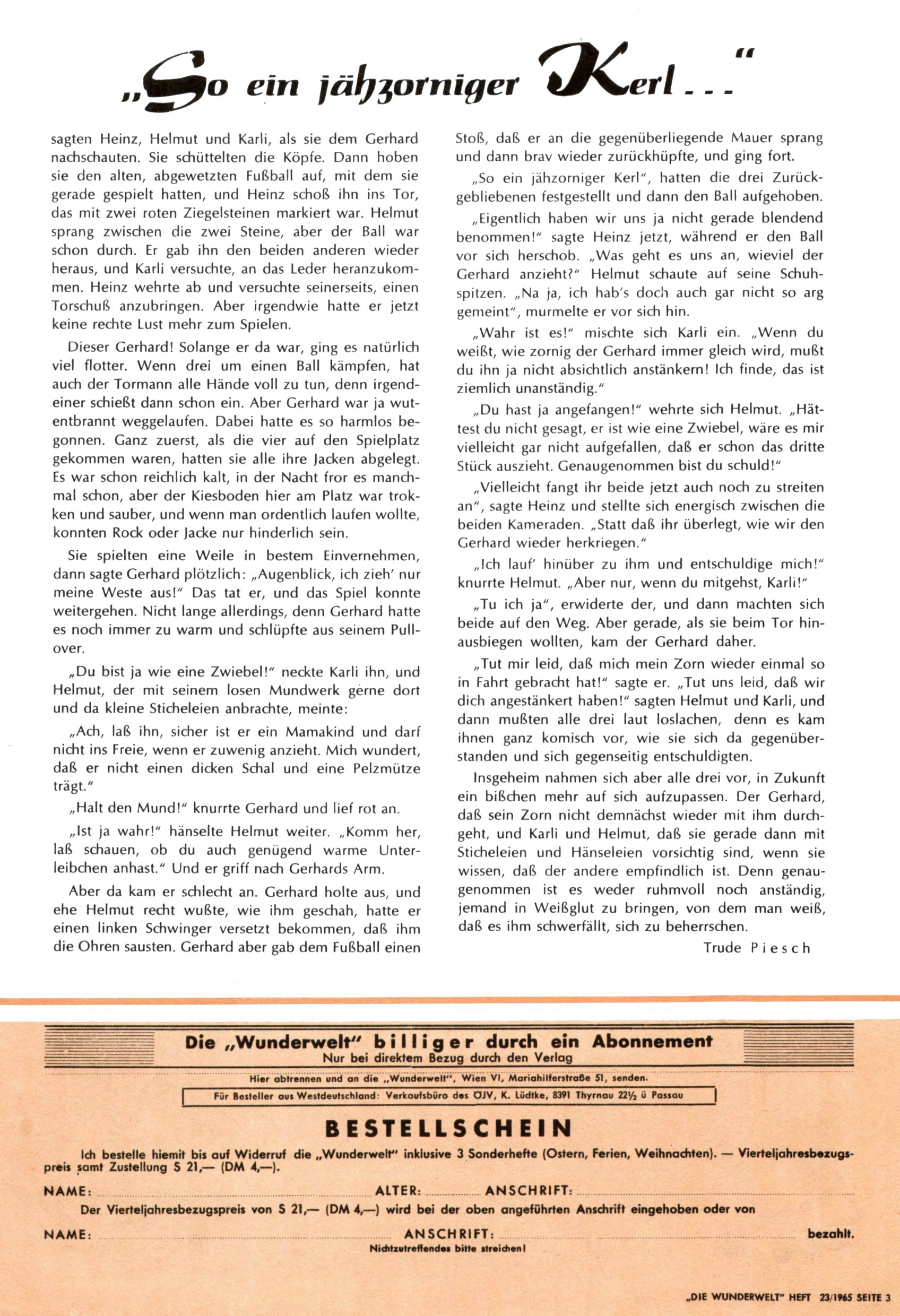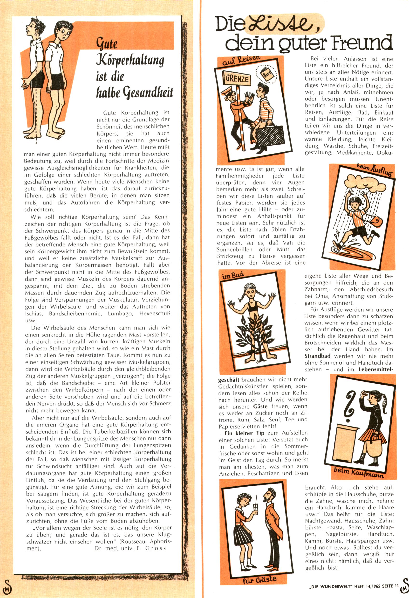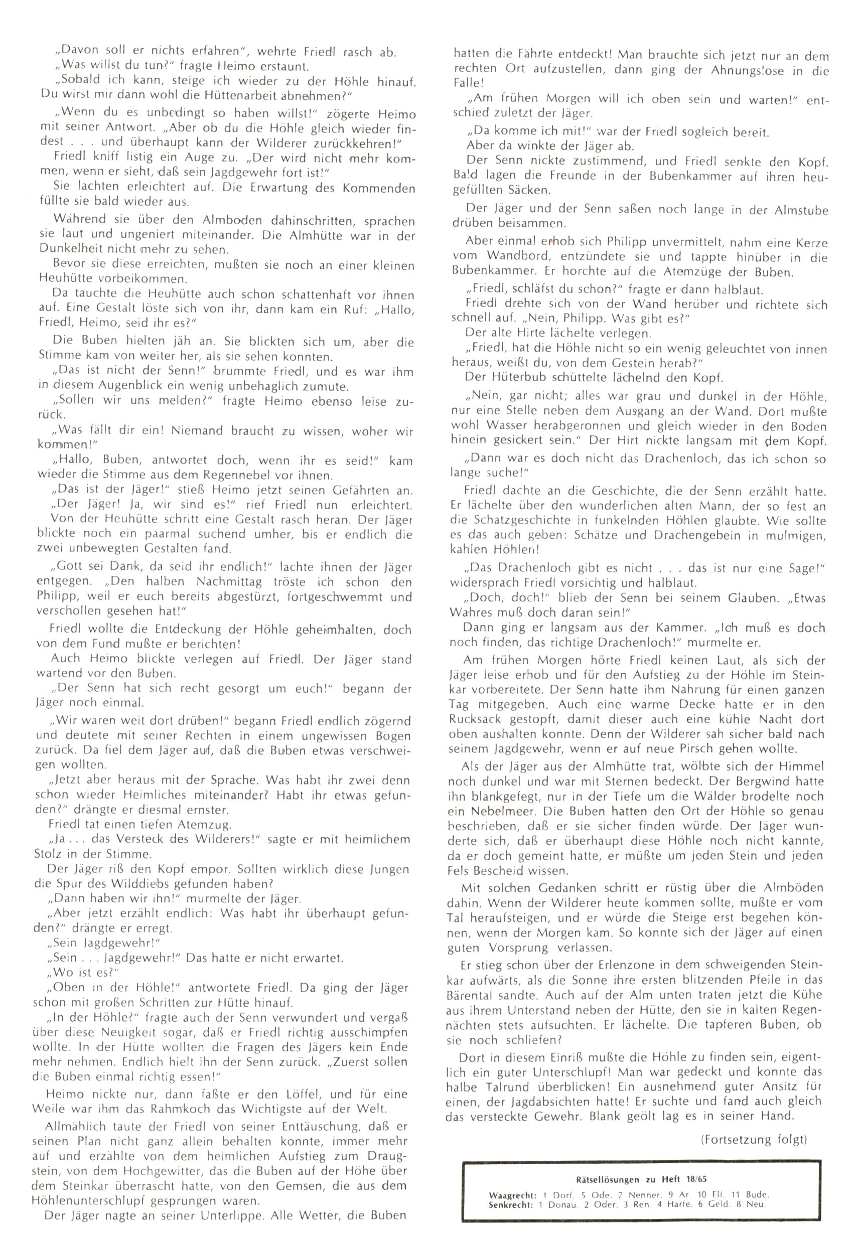 1965 - Die Zeichen der Zeit ignorieren In den Sonderheften hatte man längst umgestellt. In den Standardheften klammerte man sich mit Händen und Füßen an das Altbewährte. Ein einziges Mal bekam Gudrun Groh-Götzinger 1965 die Chance, ihren modenernen Zeichenstil in einem Mittelmärchen umsetzen zu können. Teja Aicher setzte seine Nachbildungen historischer Gebäude fort und startete eine neue Serie über Bauernhöfe in Österreich. Neben seinen beiden Comicserien Zwerg Bumsti und Kri, der Zauberlehrling gestaltete er nach wie vor die Technikseite. Zusammen mit Rosl Warzilek, die nach 5 Jahren Pause erstmals wieder regelmäßig Titelseiten entwerfen durfte, war er für mehr als 50 Prozenz des Heftinhalts verantwortlich. Monica Skidelsky hatte sich ganz auf die Bastelarbeiten für Mädchen verlagert. Daneben waren nach wie vor Lisbeth Hölzl und Gudrun Groh-Götzinger im Einsatz. |