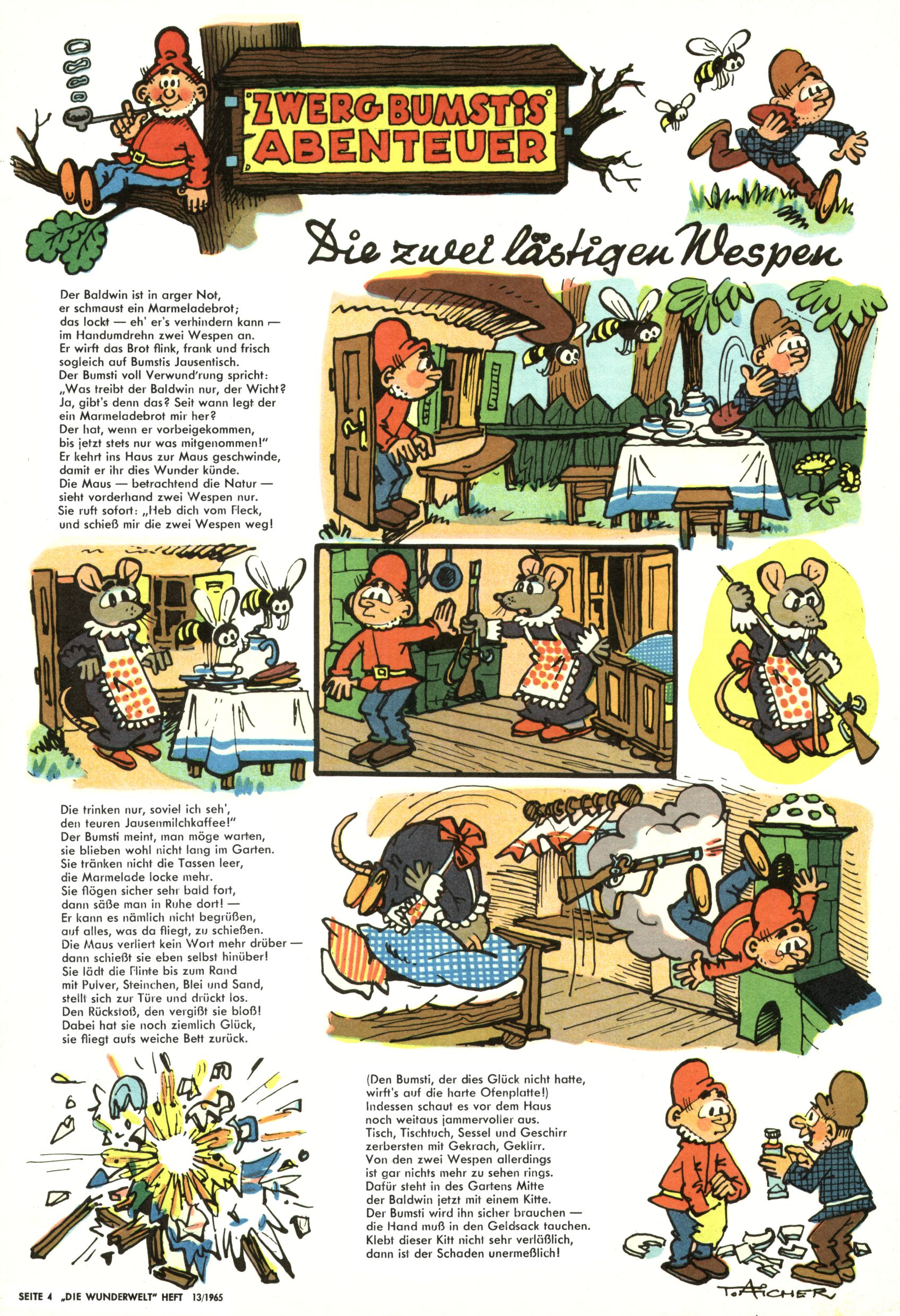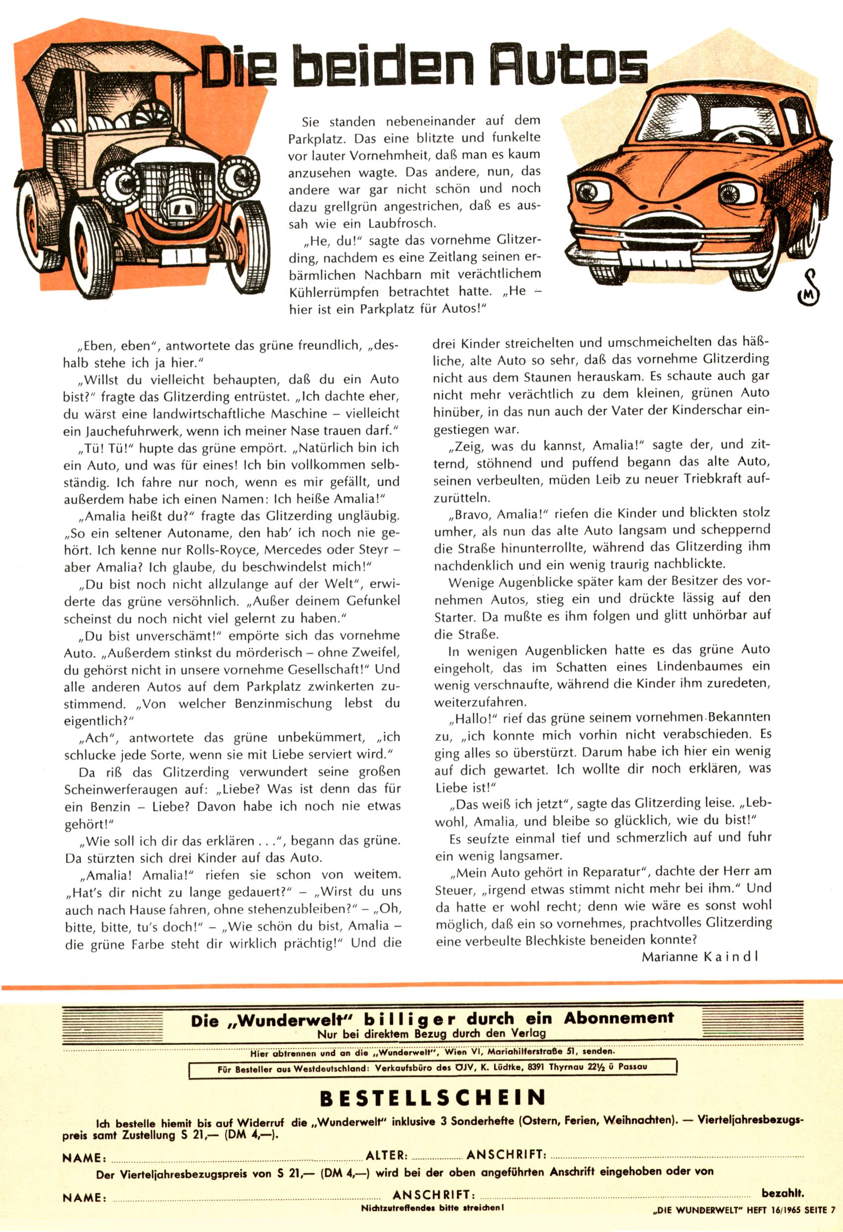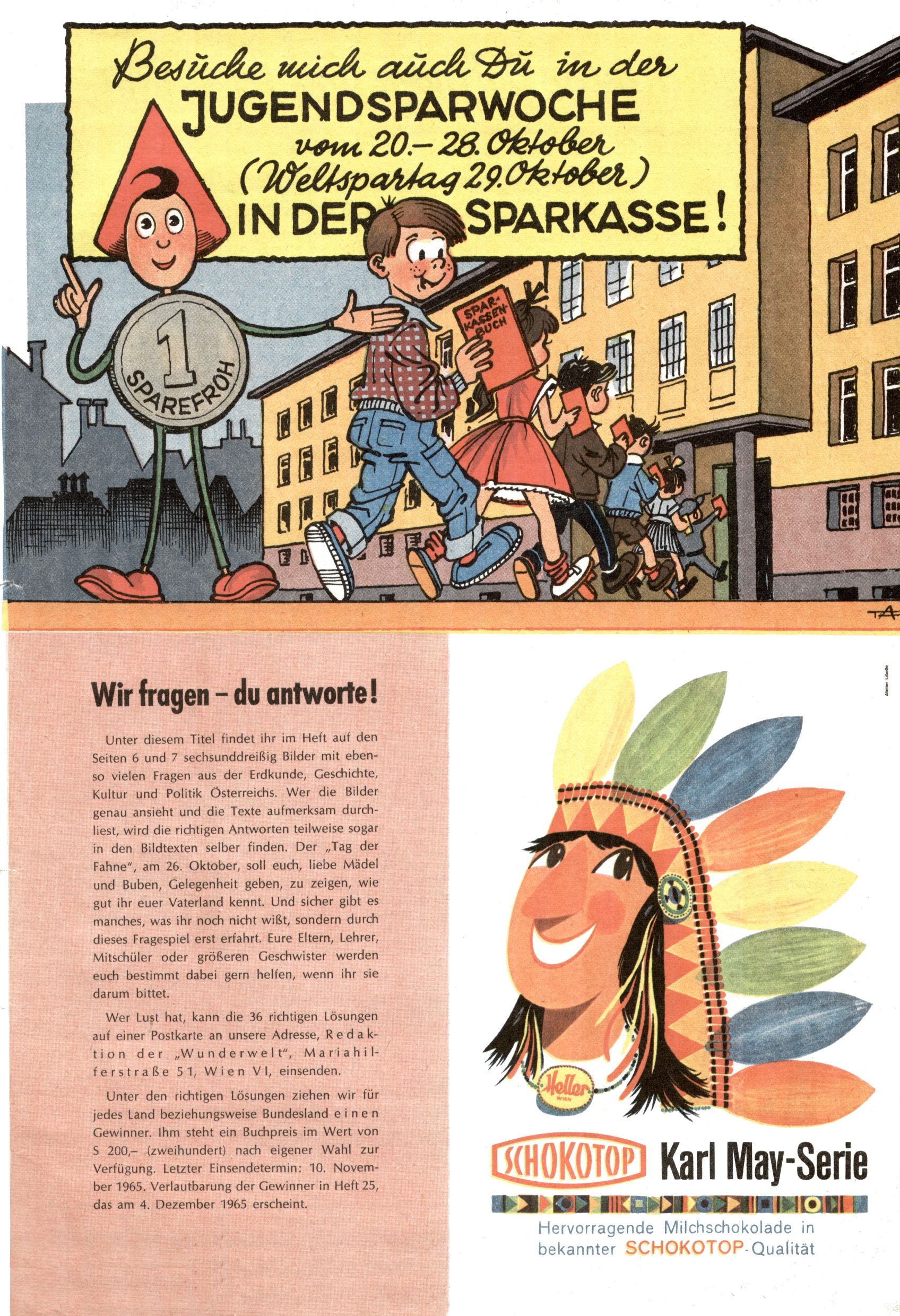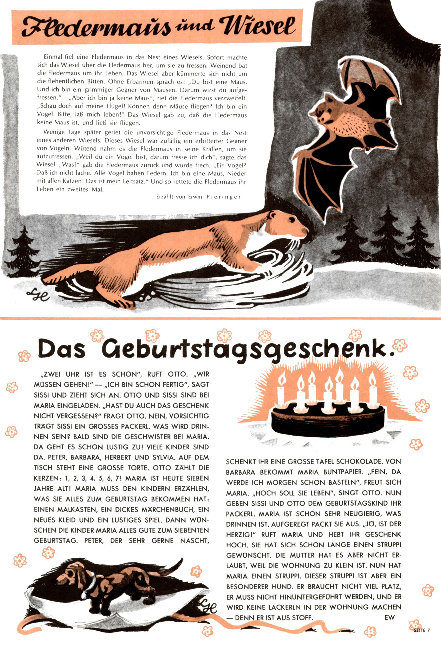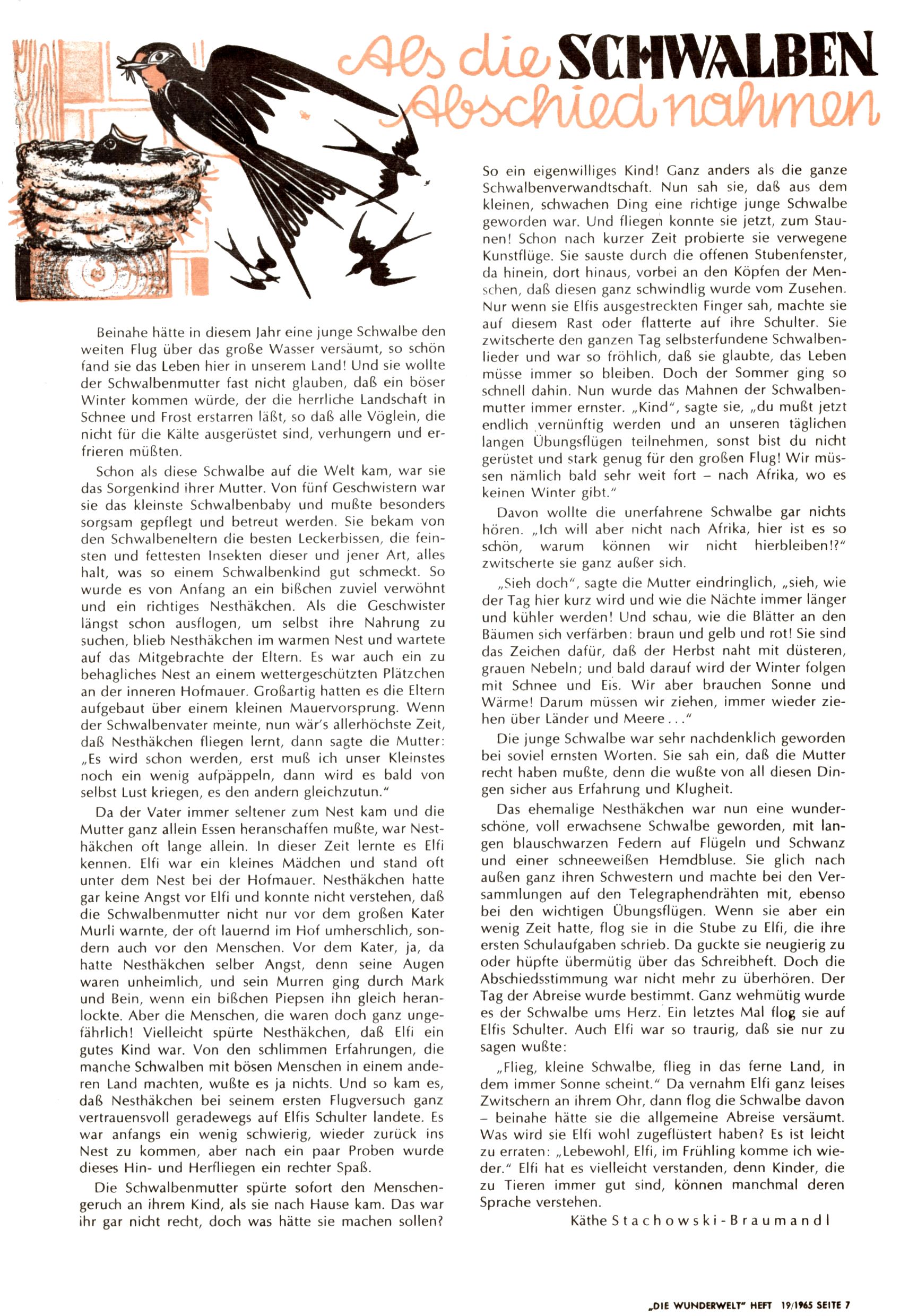 1965 - Die Zeichen der Zeit ignorieren In den Sonderheften hatte man längst umgestellt. In den Standardheften klammerte man sich mit Händen und Füßen an das Altbewährte. Ein einziges Mal bekam Gudrun Groh-Götzinger 1965 die Chance, ihren modenernen Zeichenstil in einem Mittelmärchen umsetzen zu können. Teja Aicher setzte seine Nachbildungen historischer Gebäude fort und startete eine neue Serie über Bauernhöfe in Österreich. Neben seinen beiden Comicserien Zwerg Bumsti und Kri, der Zauberlehrling gestaltete er nach wie vor die Technikseite. Zusammen mit Rosl Warzilek, die nach 5 Jahren Pause erstmals wieder regelmäßig Titelseiten entwerfen durfte, war er für mehr als 50 Prozenz des Heftinhalts verantwortlich. Monica Skidelsky hatte sich ganz auf die Bastelarbeiten für Mädchen verlagert. Daneben waren nach wie vor Lisbeth Hölzl und Gudrun Groh-Götzinger im Einsatz. |