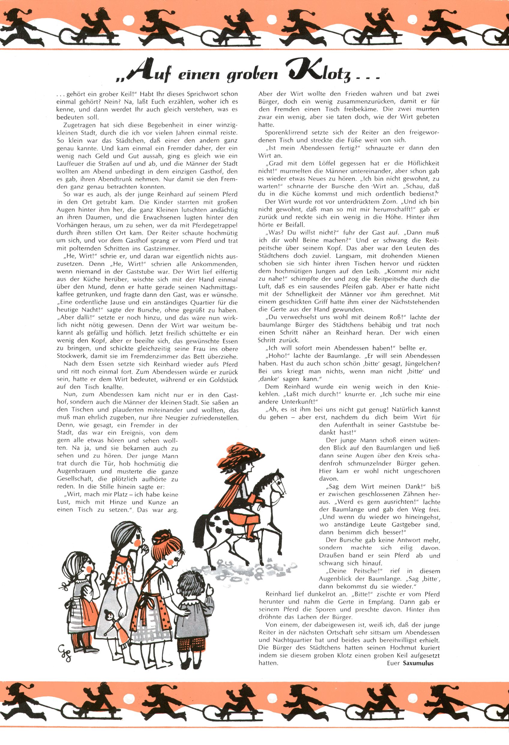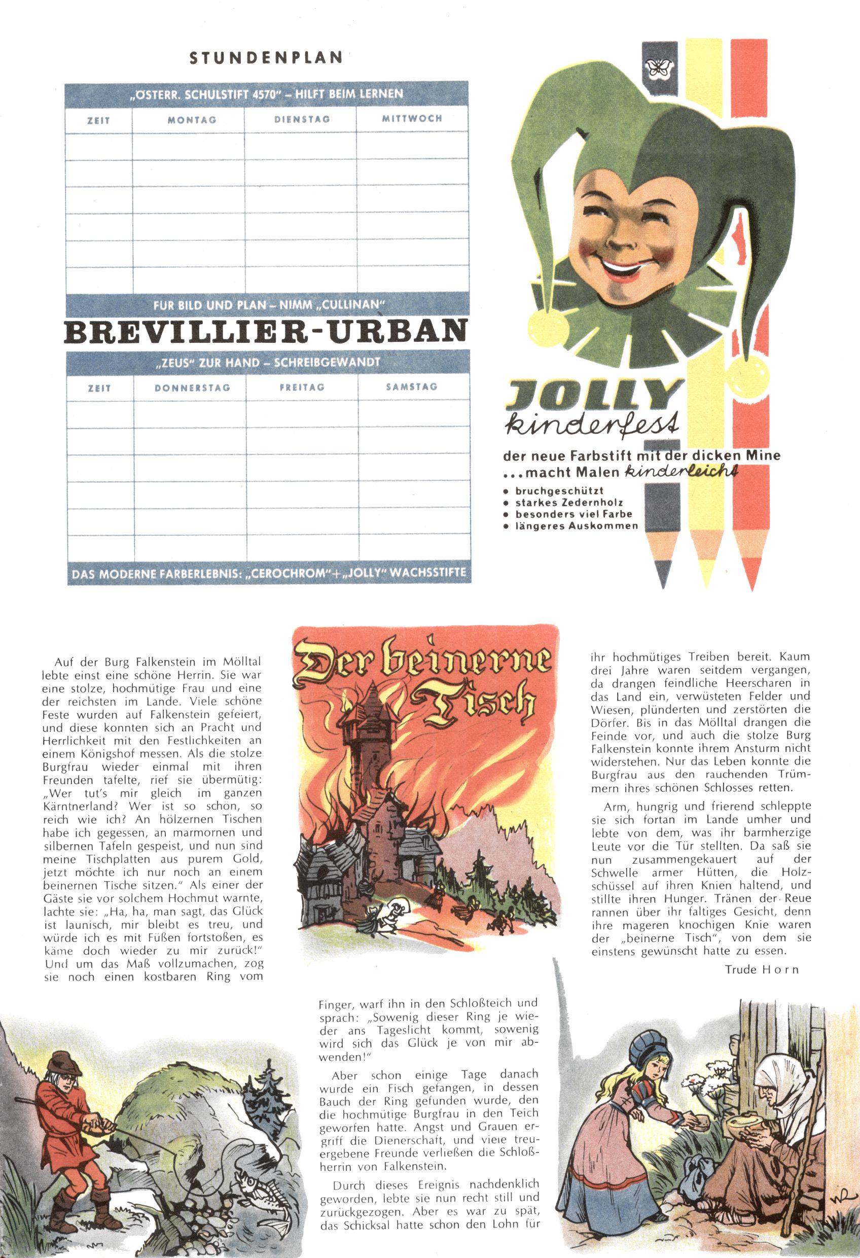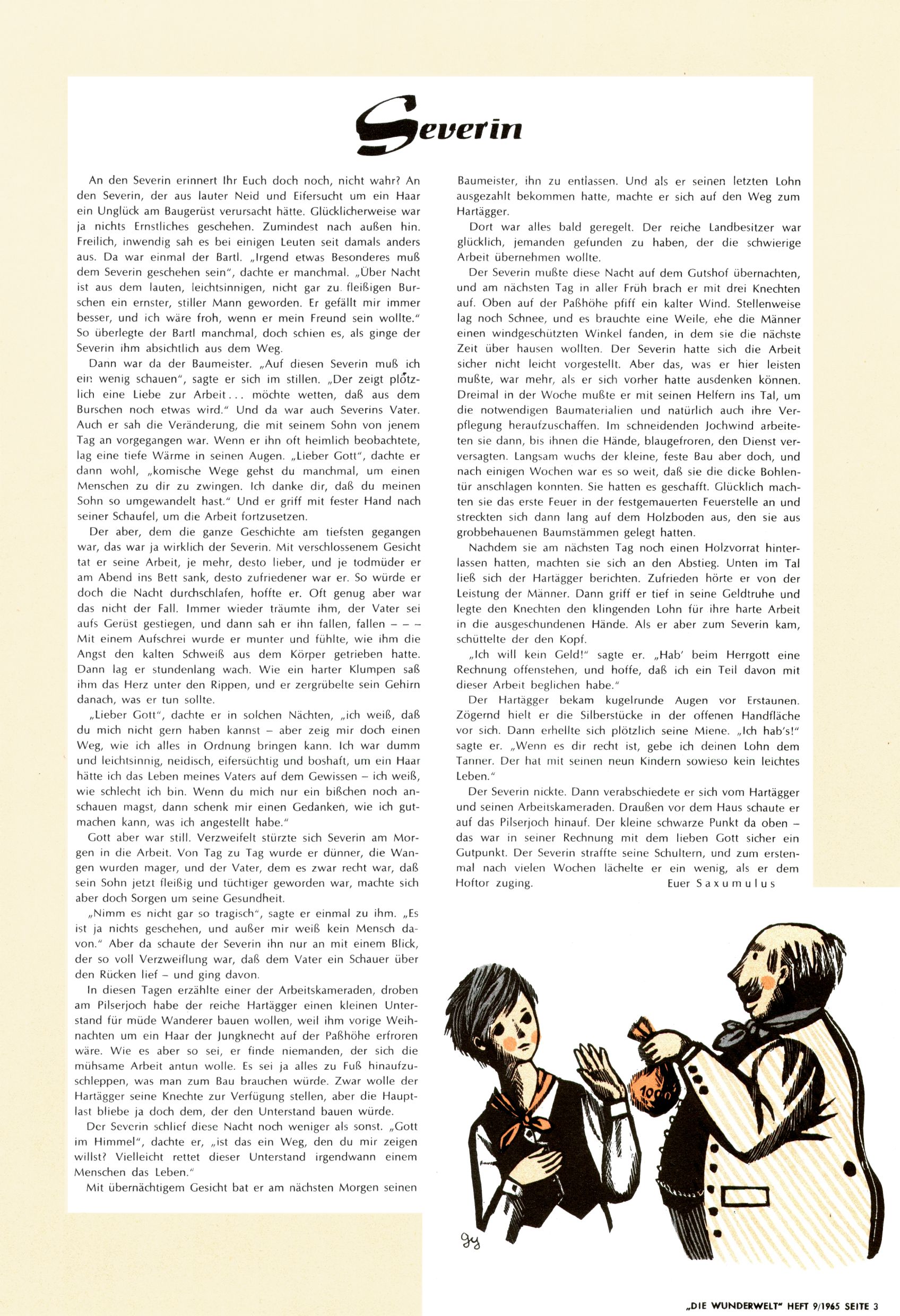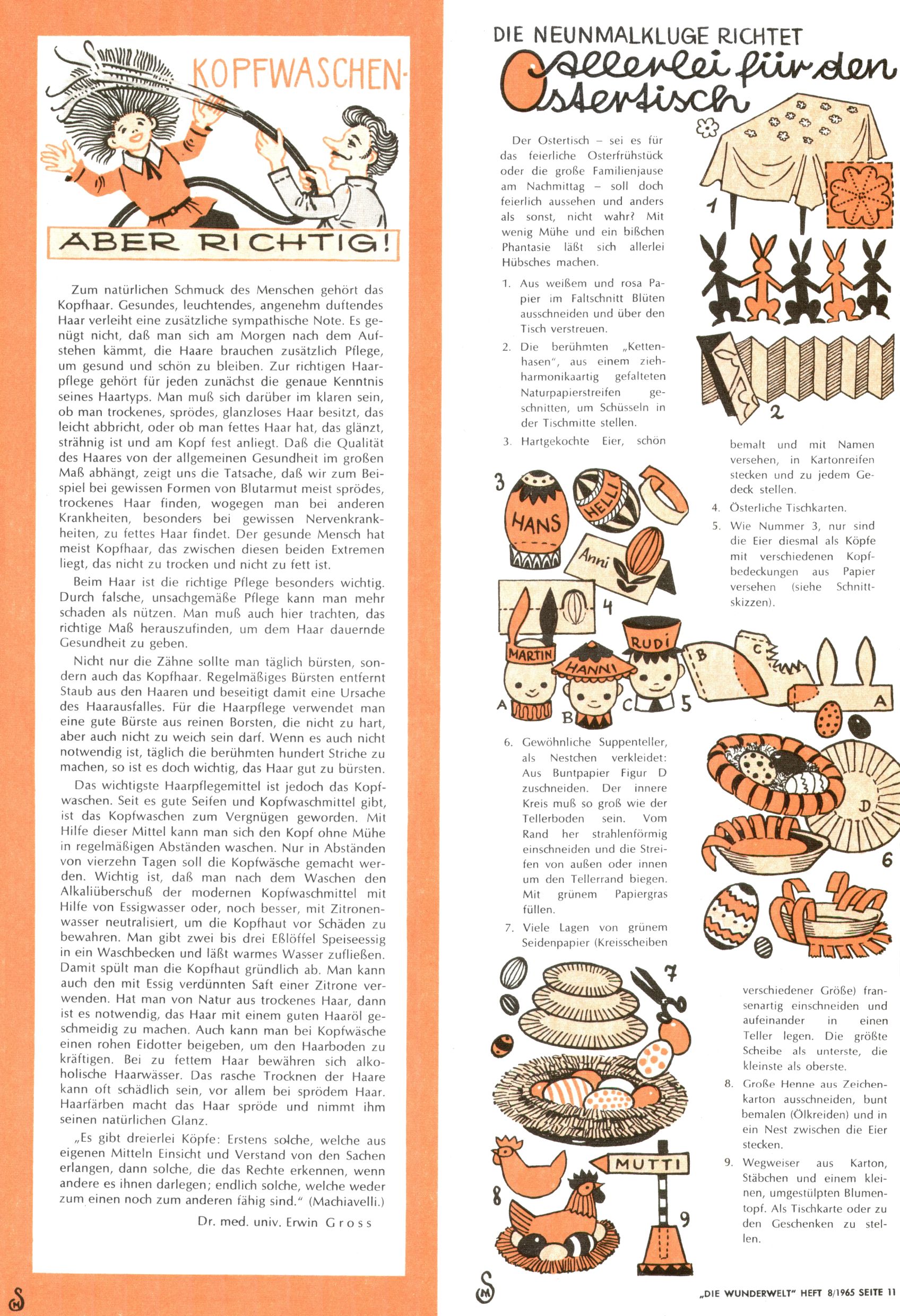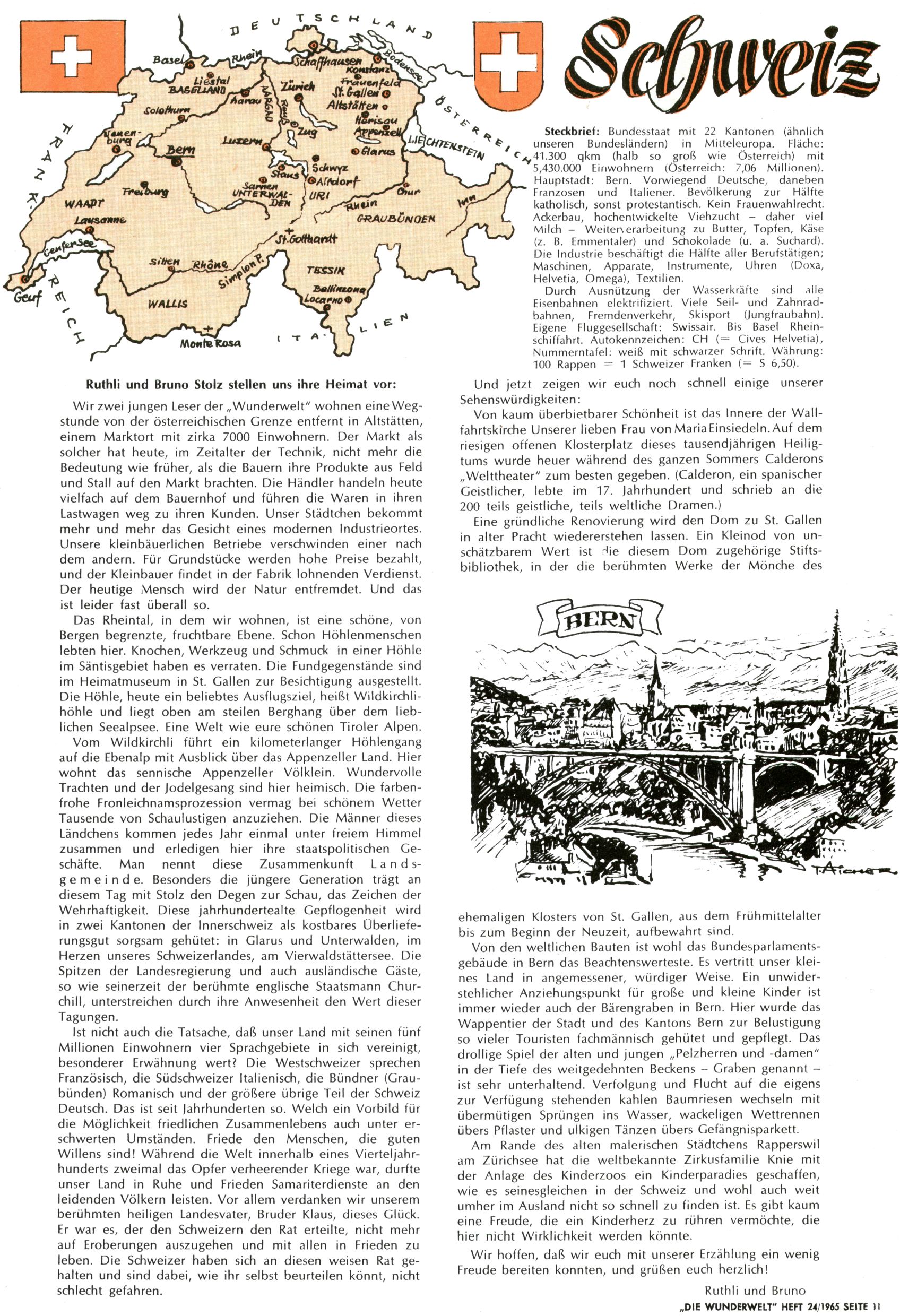 1965 - Die Zeichen der Zeit ignorieren In den Sonderheften hatte man längst umgestellt. In den Standardheften klammerte man sich mit Händen und Füßen an das Altbewährte. Ein einziges Mal bekam Gudrun Groh-Götzinger 1965 die Chance, ihren modenernen Zeichenstil in einem Mittelmärchen umsetzen zu können. Teja Aicher setzte seine Nachbildungen historischer Gebäude fort und startete eine neue Serie über Bauernhöfe in Österreich. Neben seinen beiden Comicserien Zwerg Bumsti und Kri, der Zauberlehrling gestaltete er nach wie vor die Technikseite. Zusammen mit Rosl Warzilek, die nach 5 Jahren Pause erstmals wieder regelmäßig Titelseiten entwerfen durfte, war er für mehr als 50 Prozenz des Heftinhalts verantwortlich. Monica Skidelsky hatte sich ganz auf die Bastelarbeiten für Mädchen verlagert. Daneben waren nach wie vor Lisbeth Hölzl und Gudrun Groh-Götzinger im Einsatz. |