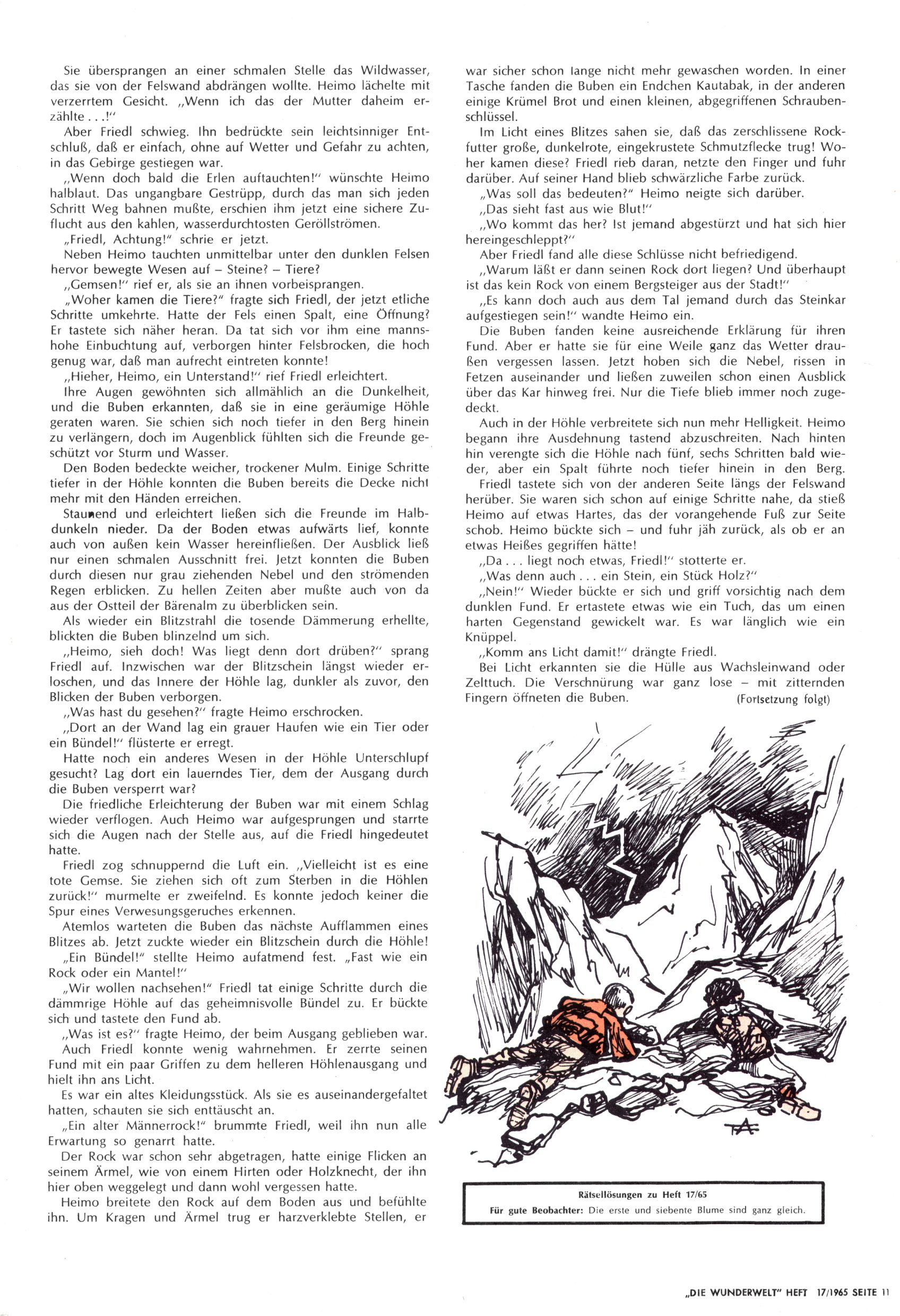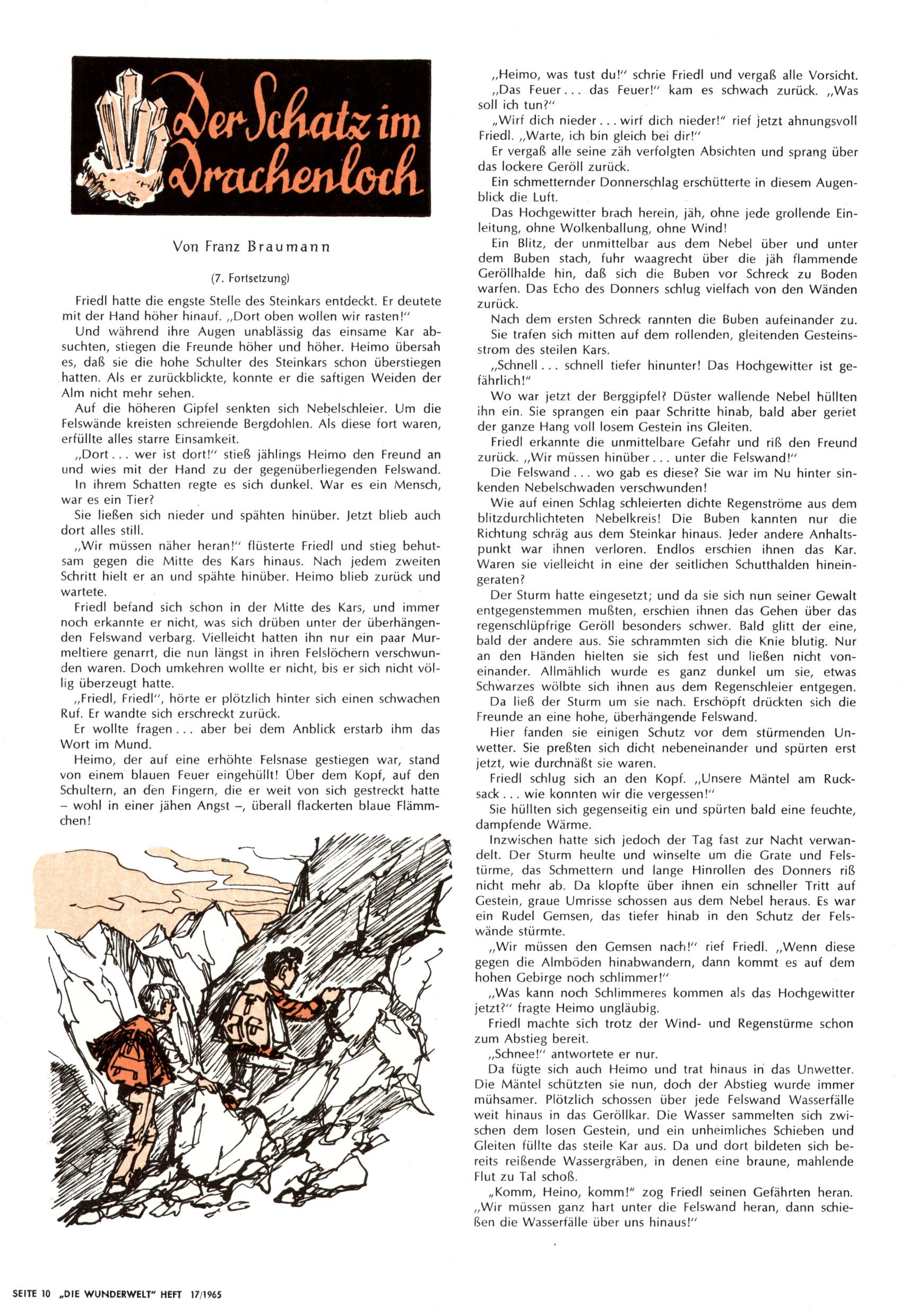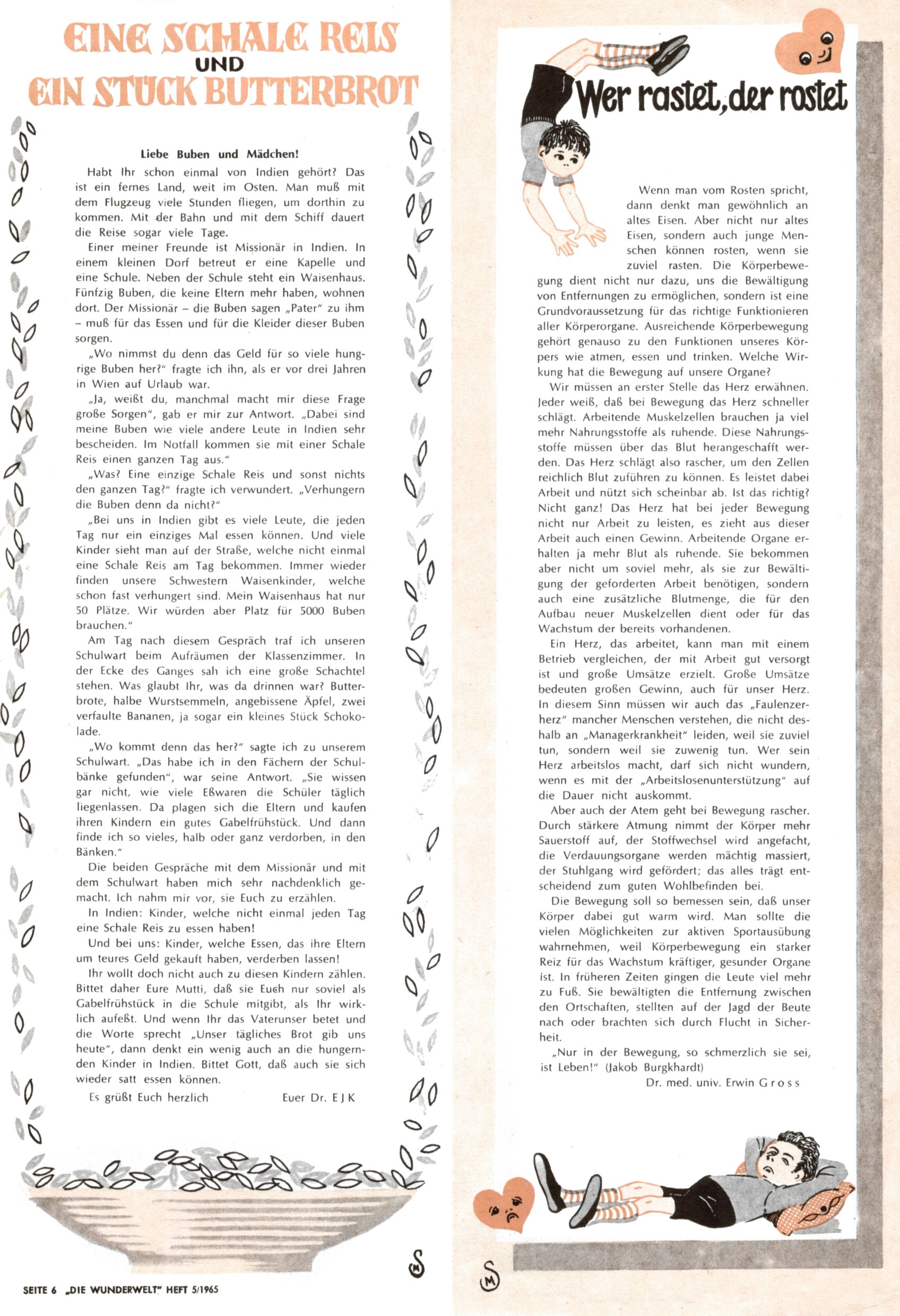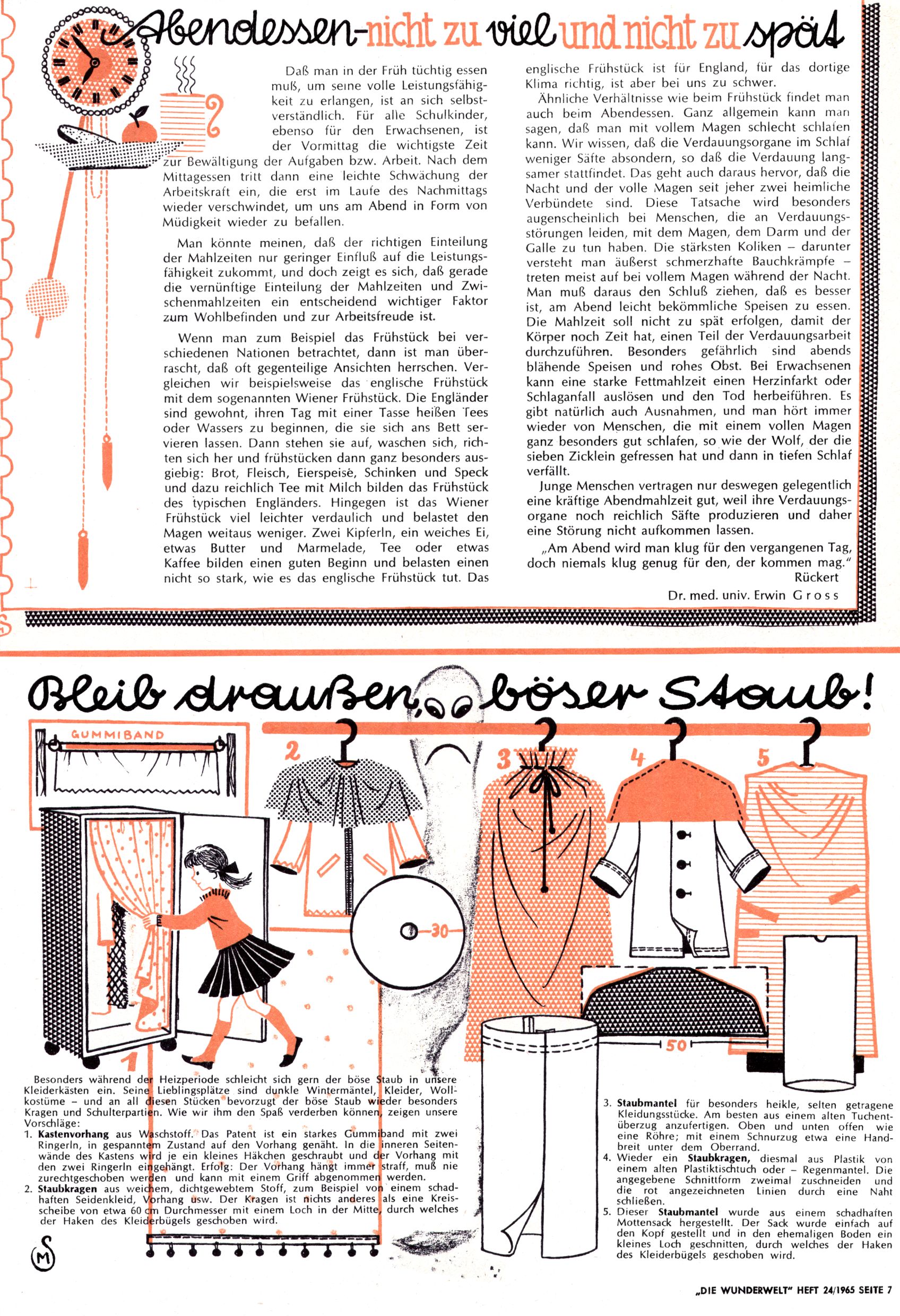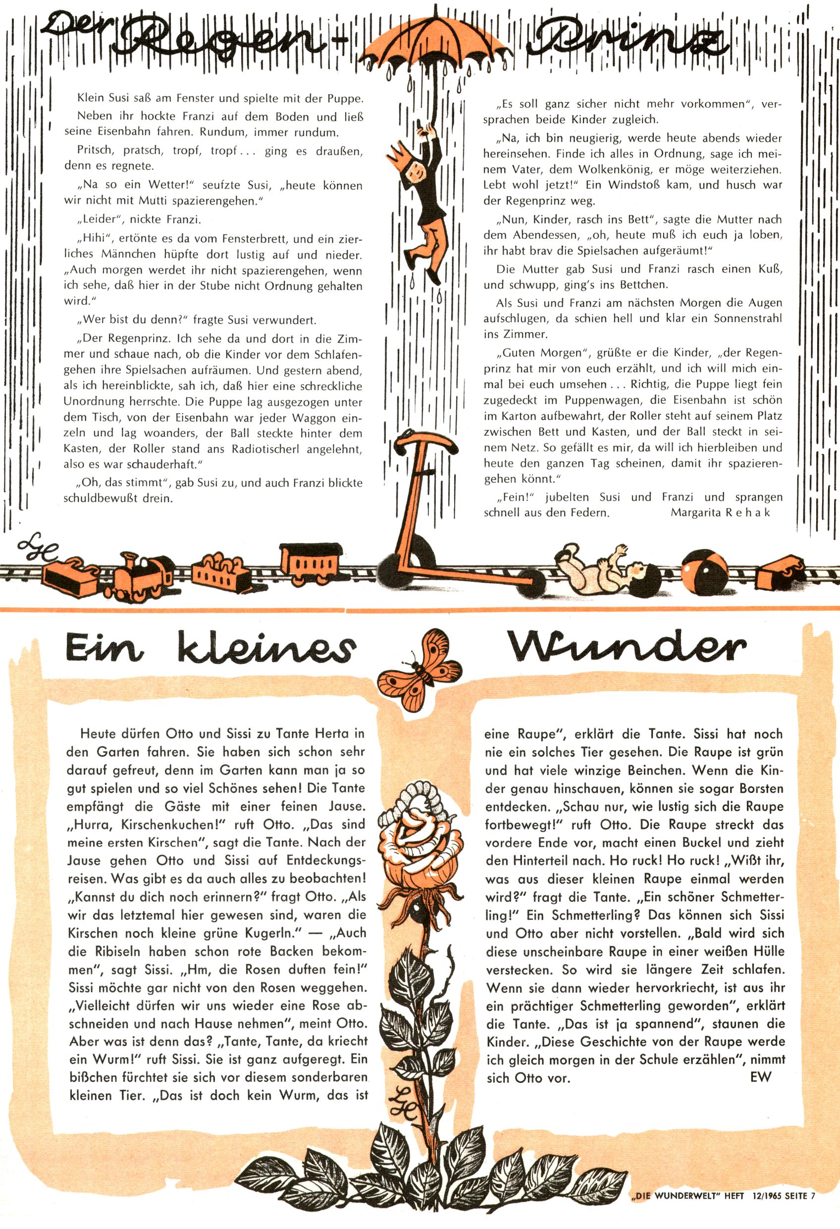 1965 - Die Zeichen der Zeit ignorieren In den Sonderheften hatte man längst umgestellt. In den Standardheften klammerte man sich mit Händen und Füßen an das Altbewährte. Ein einziges Mal bekam Gudrun Groh-Götzinger 1965 die Chance, ihren modenernen Zeichenstil in einem Mittelmärchen umsetzen zu können. Teja Aicher setzte seine Nachbildungen historischer Gebäude fort und startete eine neue Serie über Bauernhöfe in Österreich. Neben seinen beiden Comicserien Zwerg Bumsti und Kri, der Zauberlehrling gestaltete er nach wie vor die Technikseite. Zusammen mit Rosl Warzilek, die nach 5 Jahren Pause erstmals wieder regelmäßig Titelseiten entwerfen durfte, war er für mehr als 50 Prozenz des Heftinhalts verantwortlich. Monica Skidelsky hatte sich ganz auf die Bastelarbeiten für Mädchen verlagert. Daneben waren nach wie vor Lisbeth Hölzl und Gudrun Groh-Götzinger im Einsatz. |