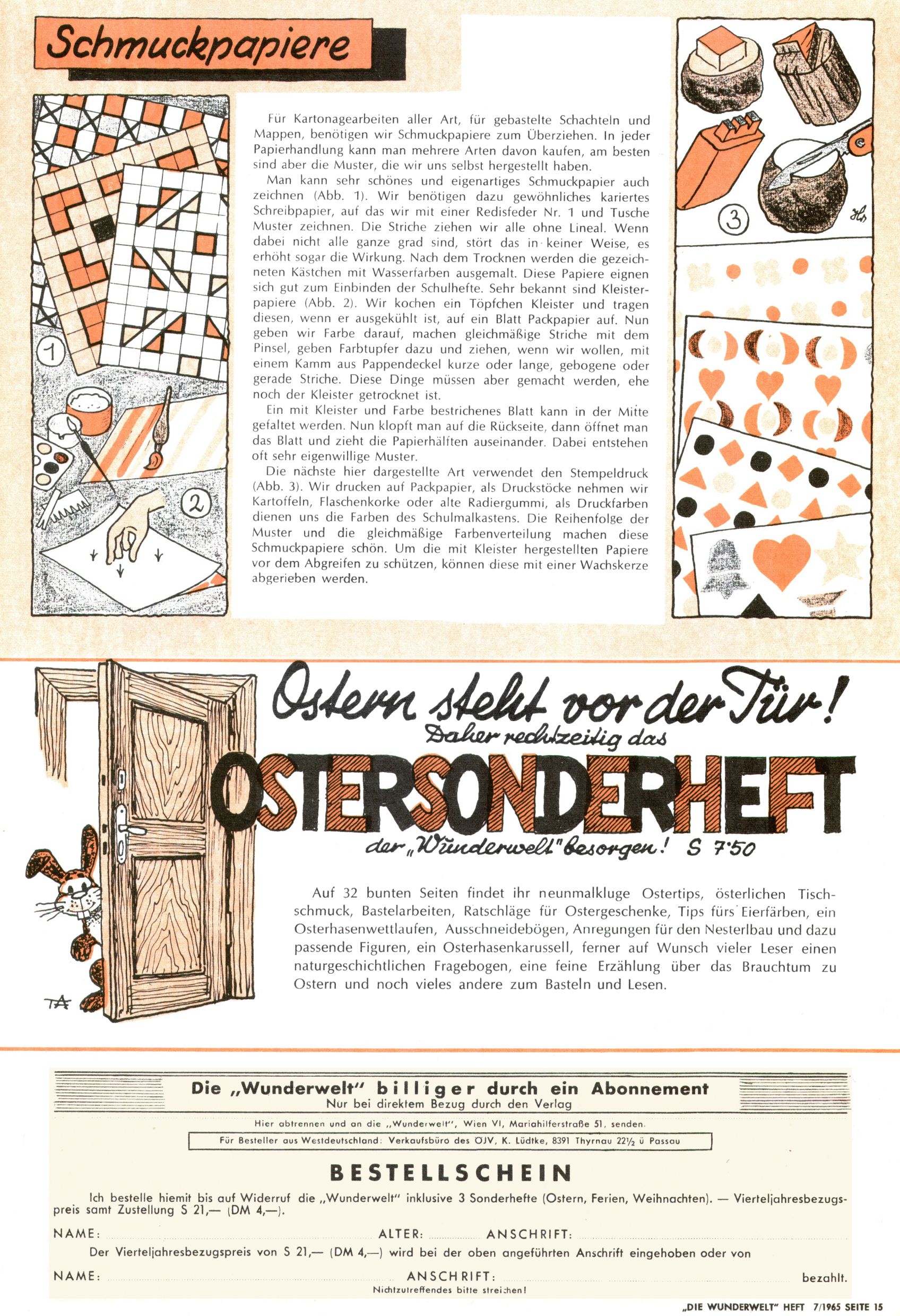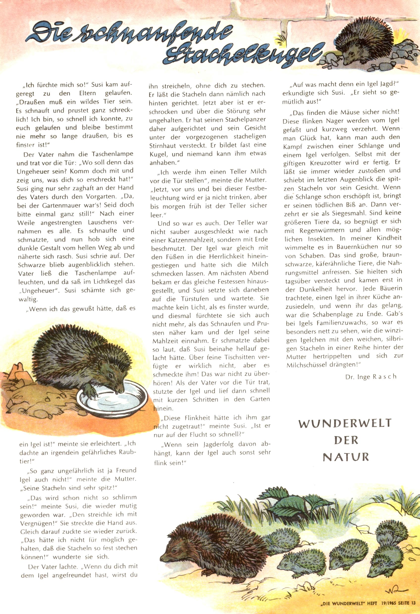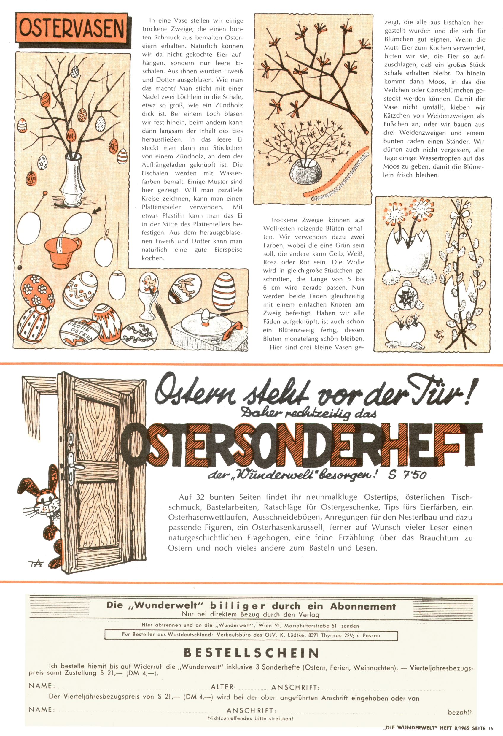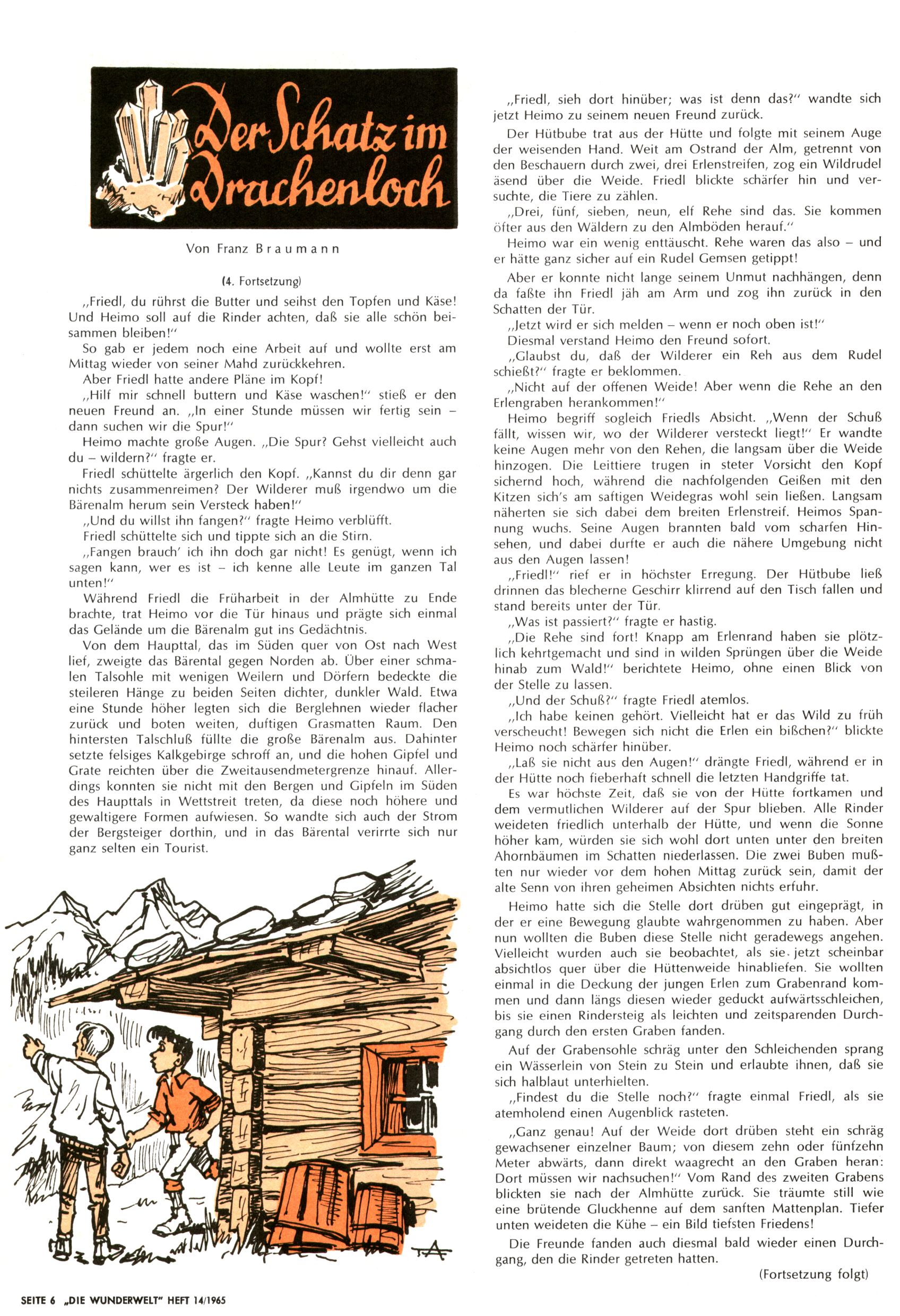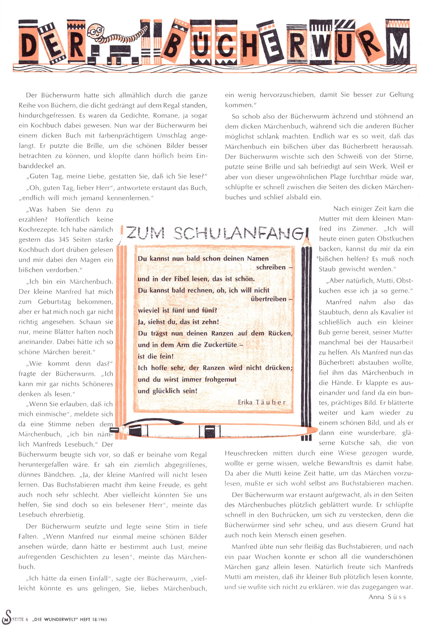 1965 - Die Zeichen der Zeit ignorieren In den Sonderheften hatte man längst umgestellt. In den Standardheften klammerte man sich mit Händen und Füßen an das Altbewährte. Ein einziges Mal bekam Gudrun Groh-Götzinger 1965 die Chance, ihren modenernen Zeichenstil in einem Mittelmärchen umsetzen zu können. Teja Aicher setzte seine Nachbildungen historischer Gebäude fort und startete eine neue Serie über Bauernhöfe in Österreich. Neben seinen beiden Comicserien Zwerg Bumsti und Kri, der Zauberlehrling gestaltete er nach wie vor die Technikseite. Zusammen mit Rosl Warzilek, die nach 5 Jahren Pause erstmals wieder regelmäßig Titelseiten entwerfen durfte, war er für mehr als 50 Prozenz des Heftinhalts verantwortlich. Monica Skidelsky hatte sich ganz auf die Bastelarbeiten für Mädchen verlagert. Daneben waren nach wie vor Lisbeth Hölzl und Gudrun Groh-Götzinger im Einsatz. |